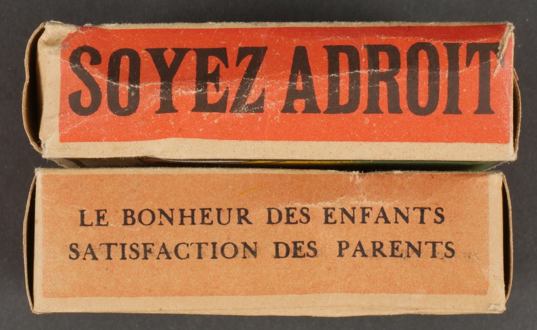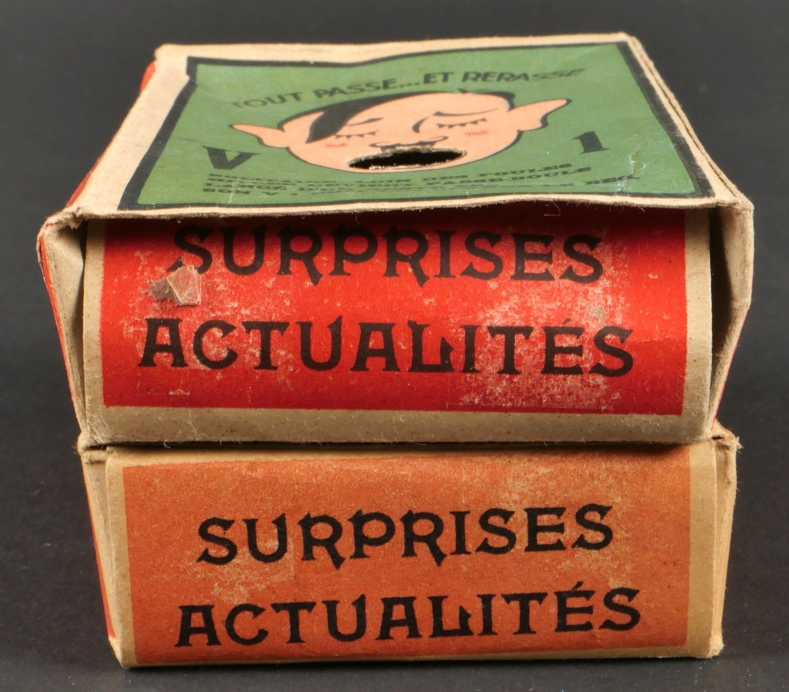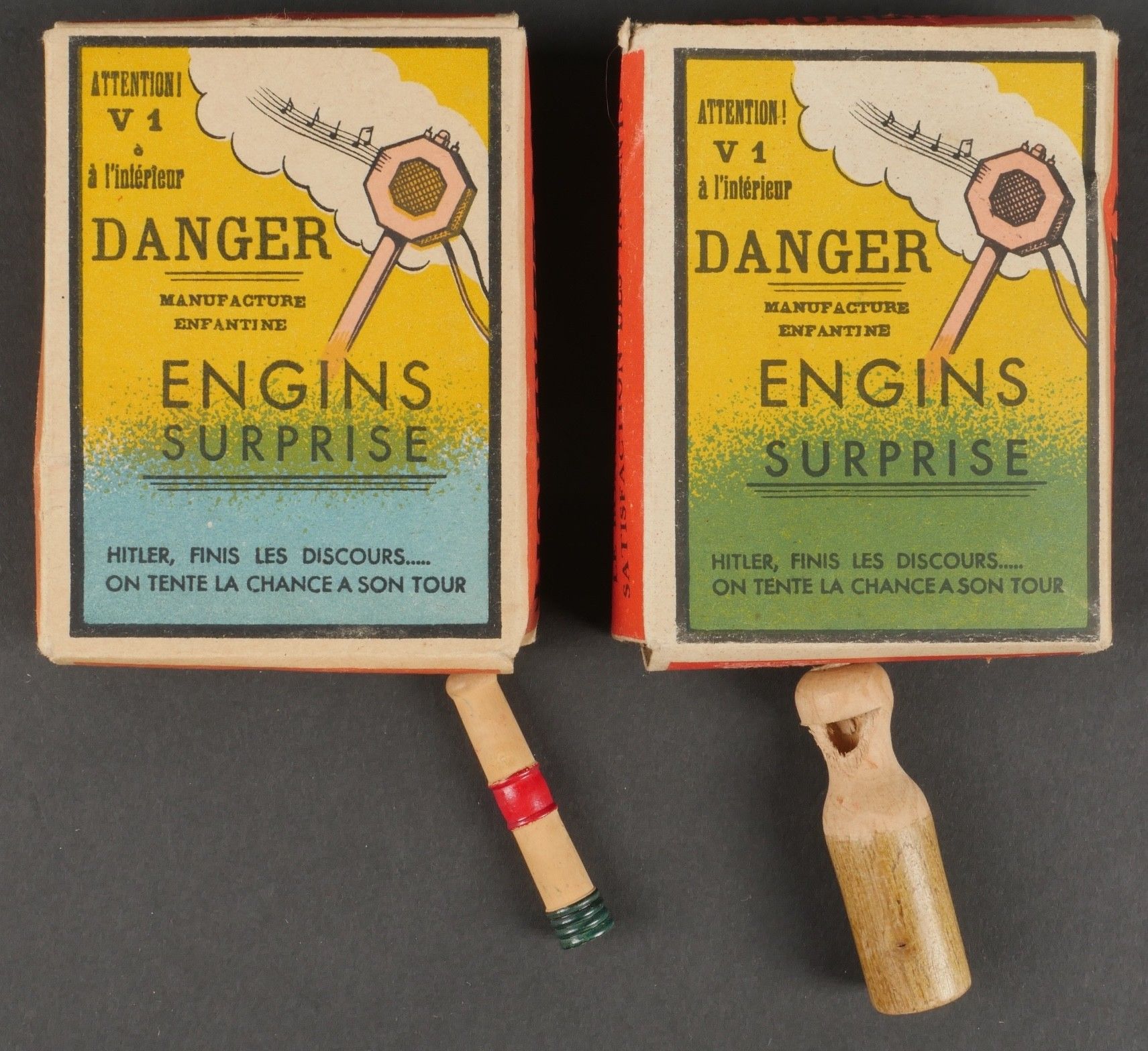 Satirical games. Two games consisting of a cardboard box showing a portrait of the German Chancellor with a hole where the mouth should be, into which a wooden missile should be thrown. Only one box has one. Satirical games. Two cardboard box games featuring the portrait of the German Chancellor with a hole for the mouth to launch a wooden missile only one box retains its projectile.