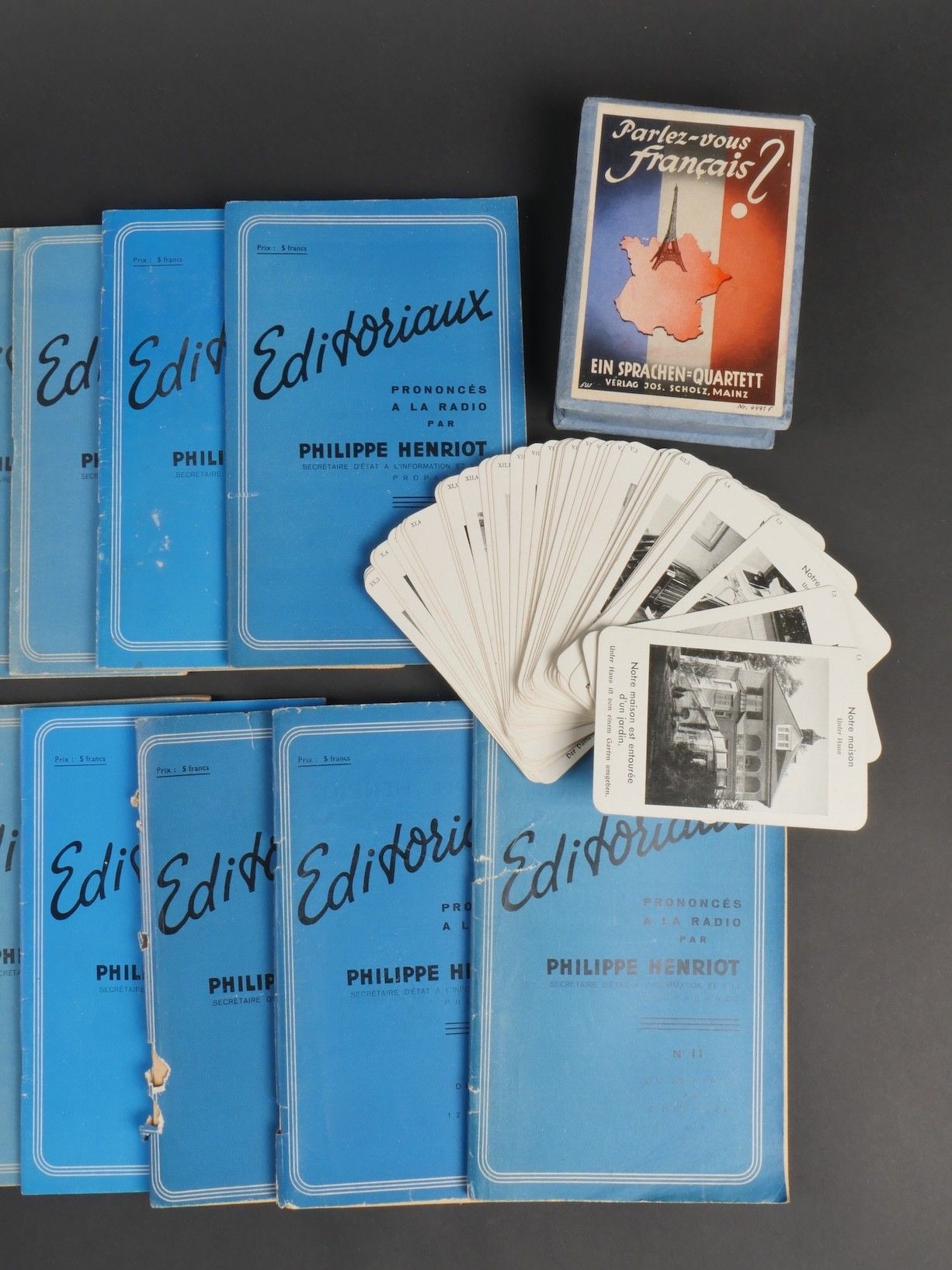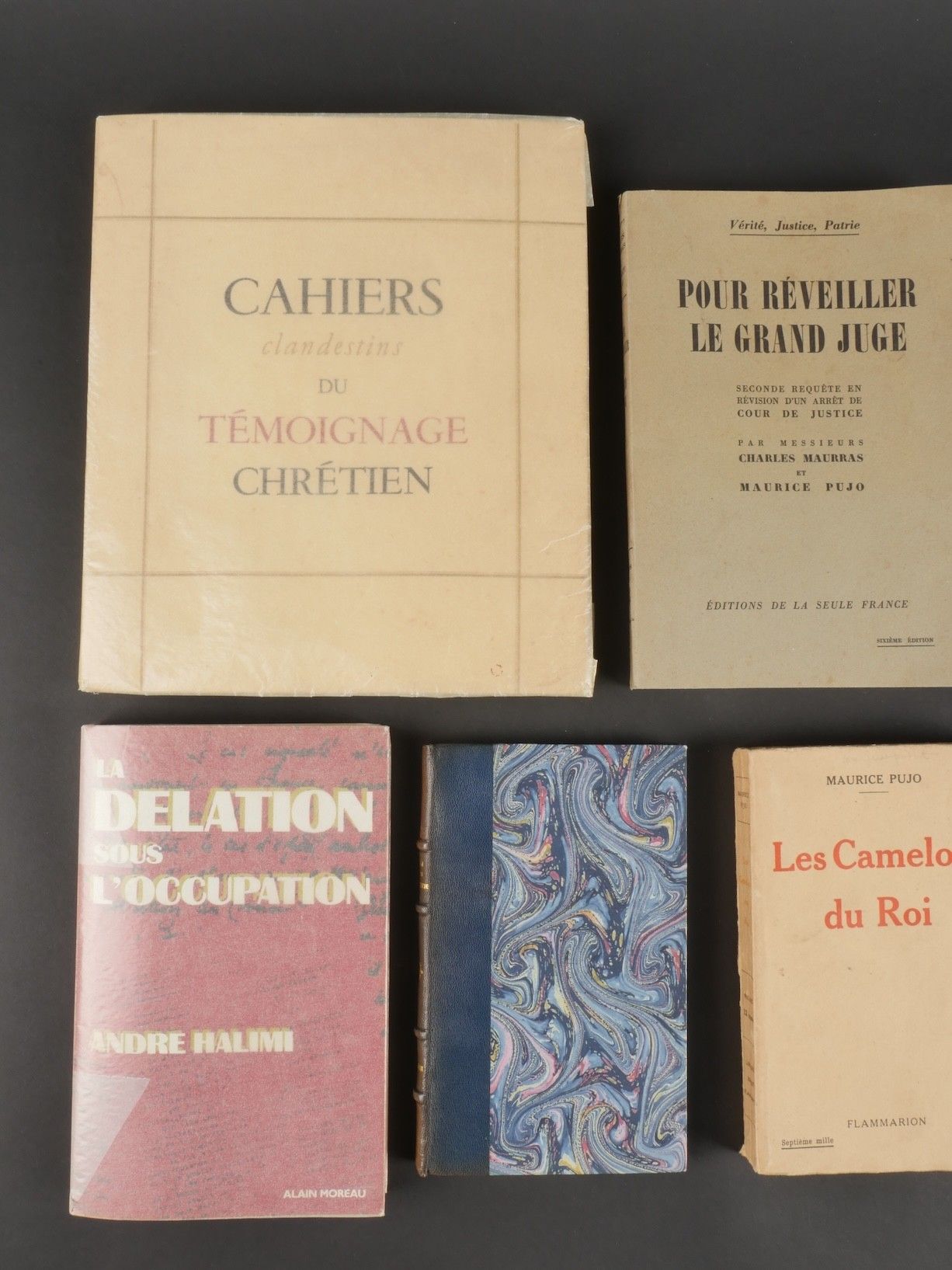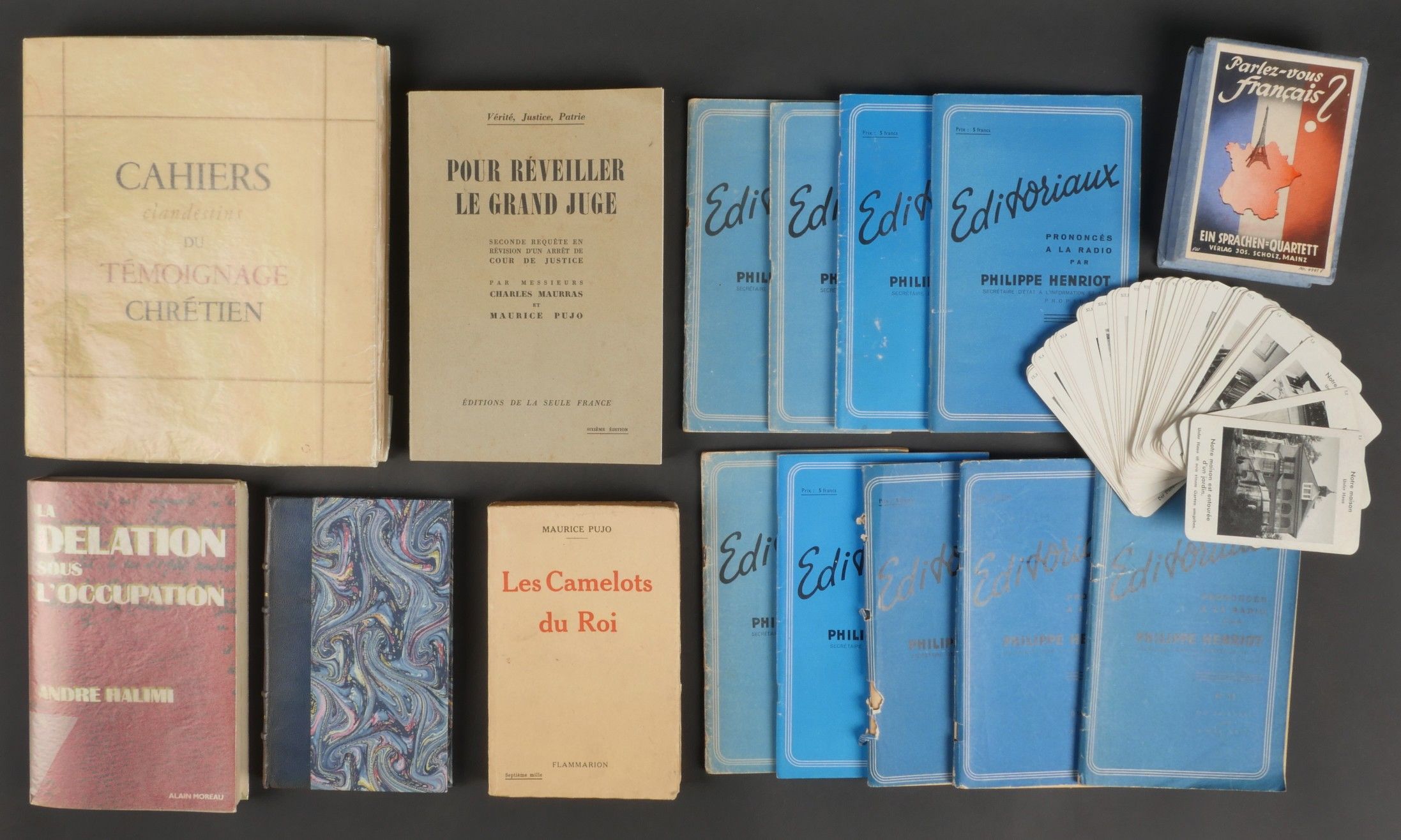 Armistice documents. Including a lexicon of cards entitled Parlez vous français? and a set of editorials by Philippe Henriot, numbers 1, 2, 4, 5, 6, 7, 8 and 11. A book entitled Les camelots du rois by Maurice Pujo. A book Pour réveiller le grand juge by Maurras and Pujo. A book Le Maréchal et son peuple from the Philippe Barcelere library. A book Cahiers clandestins du témoignage chrétien. Armistice documents. Including a card lexicon titled Parlezvous français ?, Philippe Henriot editorials nos 1, 2, 4-8, 11, the books Les Camelots du Roi by Maurice Pujo, Pour réveiller le Grand Juge by Maurras and Pujo, Le Maréchal et son peuple Philippe Barcelère Library, and Cahiers clandestins du témoignage chrétien.