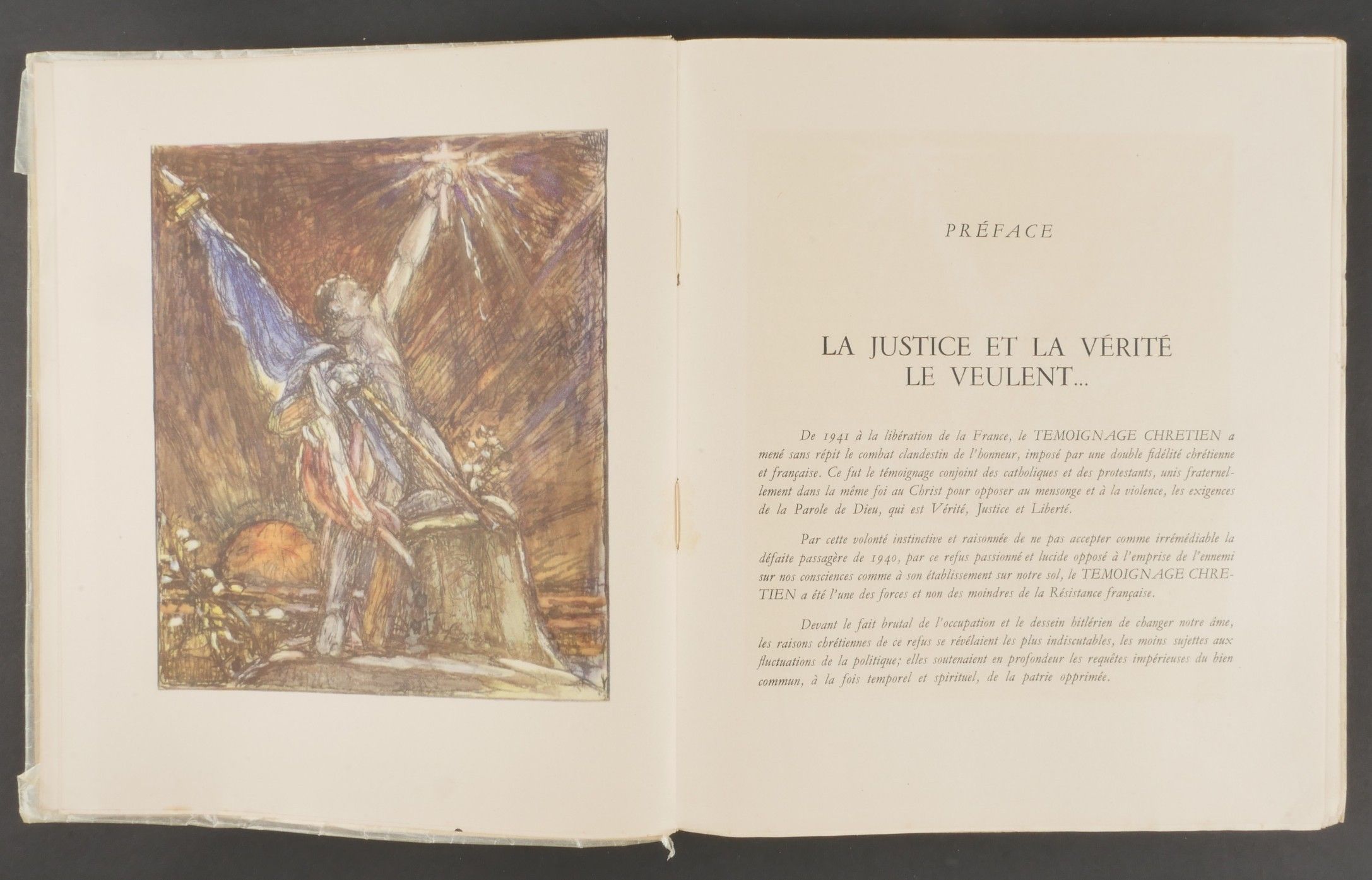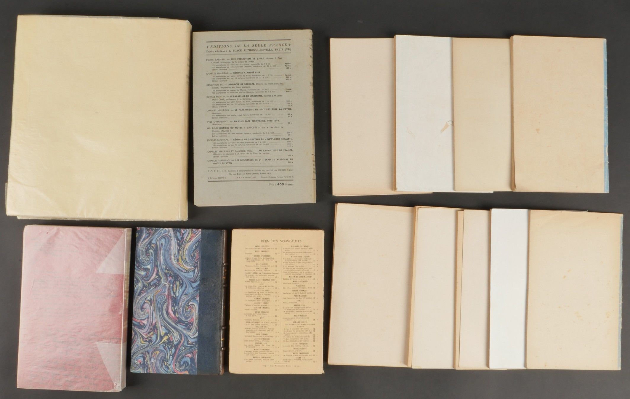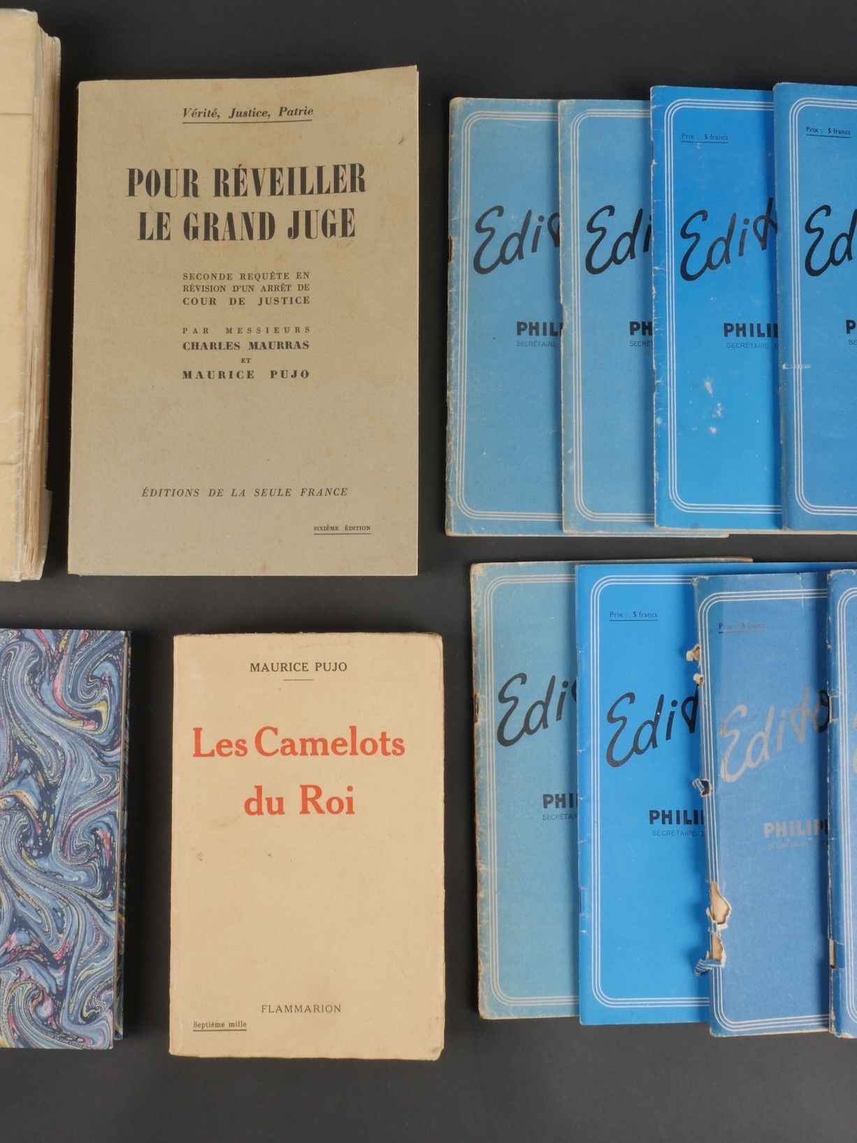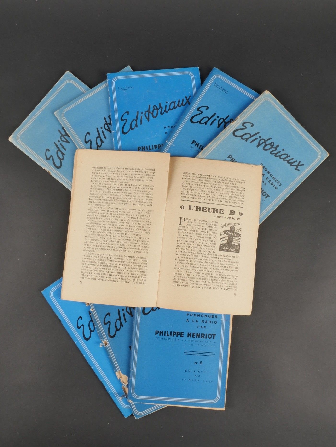 Armistice documents. Including a lexicon of cards entitled Parlez vous français? and a set of editorials by Philippe Henriot, numbers 1, 2, 4, 5, 6, 7, 8 and 11. A book entitled Les camelots du rois by Maurice Pujo. A book Pour réveiller le grand juge by Maurras and Pujo. A book Le Maréchal et son peuple from the Philippe Barcelere library. A book Cahiers clandestins du témoignage chrétien. Armistice documents. Including a card lexicon titled Parlezvous français ?, Philippe Henriot editorials nos 1, 2, 4-8, 11, the books Les Camelots du Roi by Maurice Pujo, Pour réveiller le Grand Juge by Maurras and Pujo, Le Maréchal et son peuple Philippe Barcelère Library, and Cahiers clandestins du témoignage chrétien.