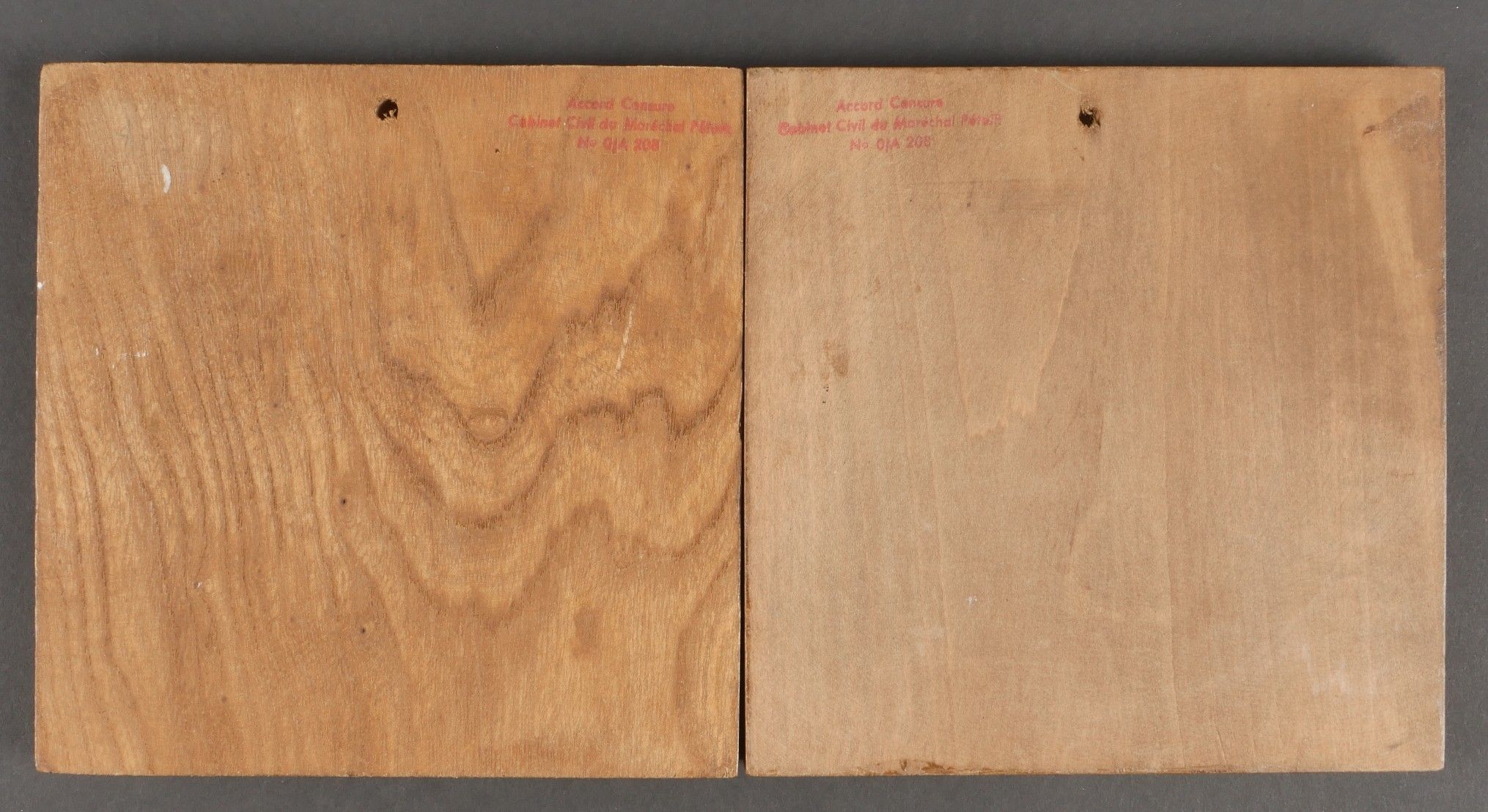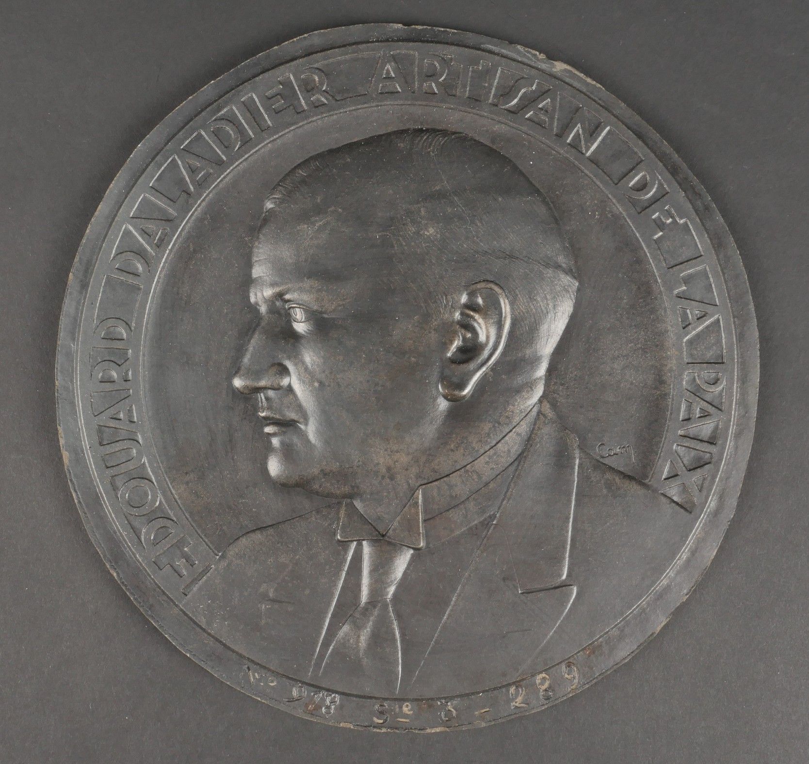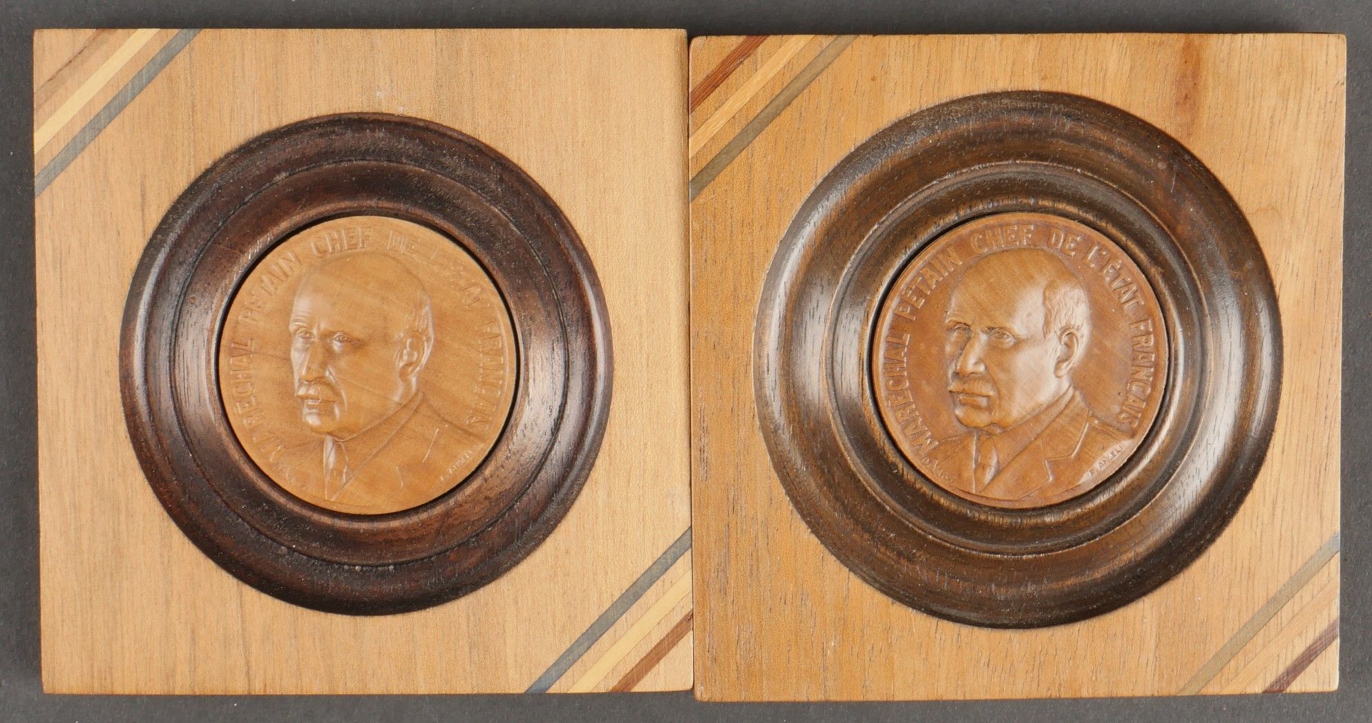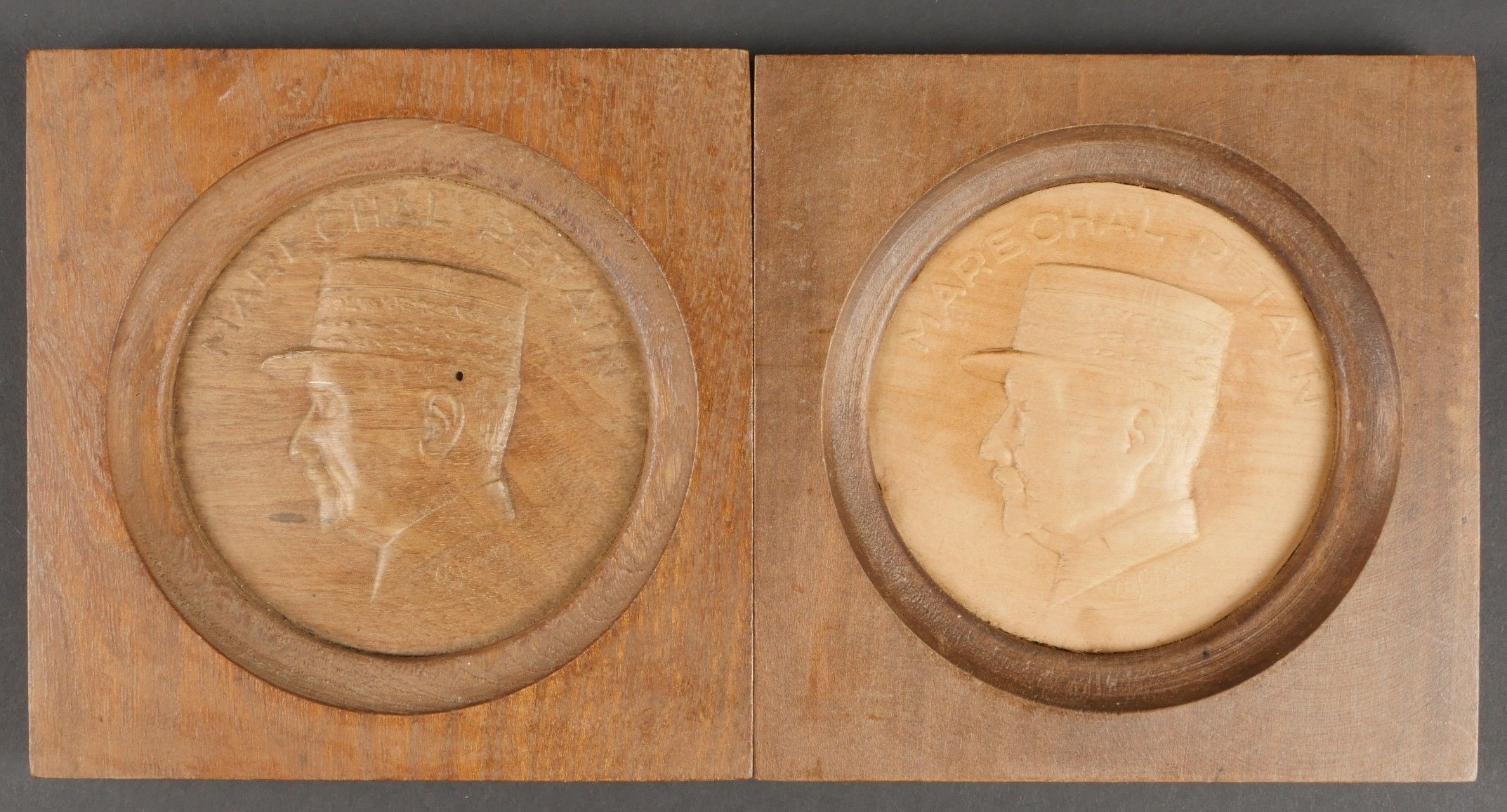 Set of medallions. Comprising two wooden medallions depicting the portrait of the Marshal, size 15x15cm. Two wooden medallions with a portrait of the Marshal bareheaded, marked Maréchal Pétain head of the French State, size 9x9cm. A cast iron wall plaque depicting Edouard Daladier, diameter 20.5cm. An enamelled plaque of the Secours National correspondent is also included, size 25x20cm. Set of medallions. Two wooden medallions with the Marshal's portrait 15×15 cm two with bareheaded portrait marked Maréchal Pétain Chef de l'État Français 9×9 cm a castiron plaque depicting Édouard Daladier diam. 20.5 cm and an enamel plaque of a Secours National correspondent 25×20 cm.