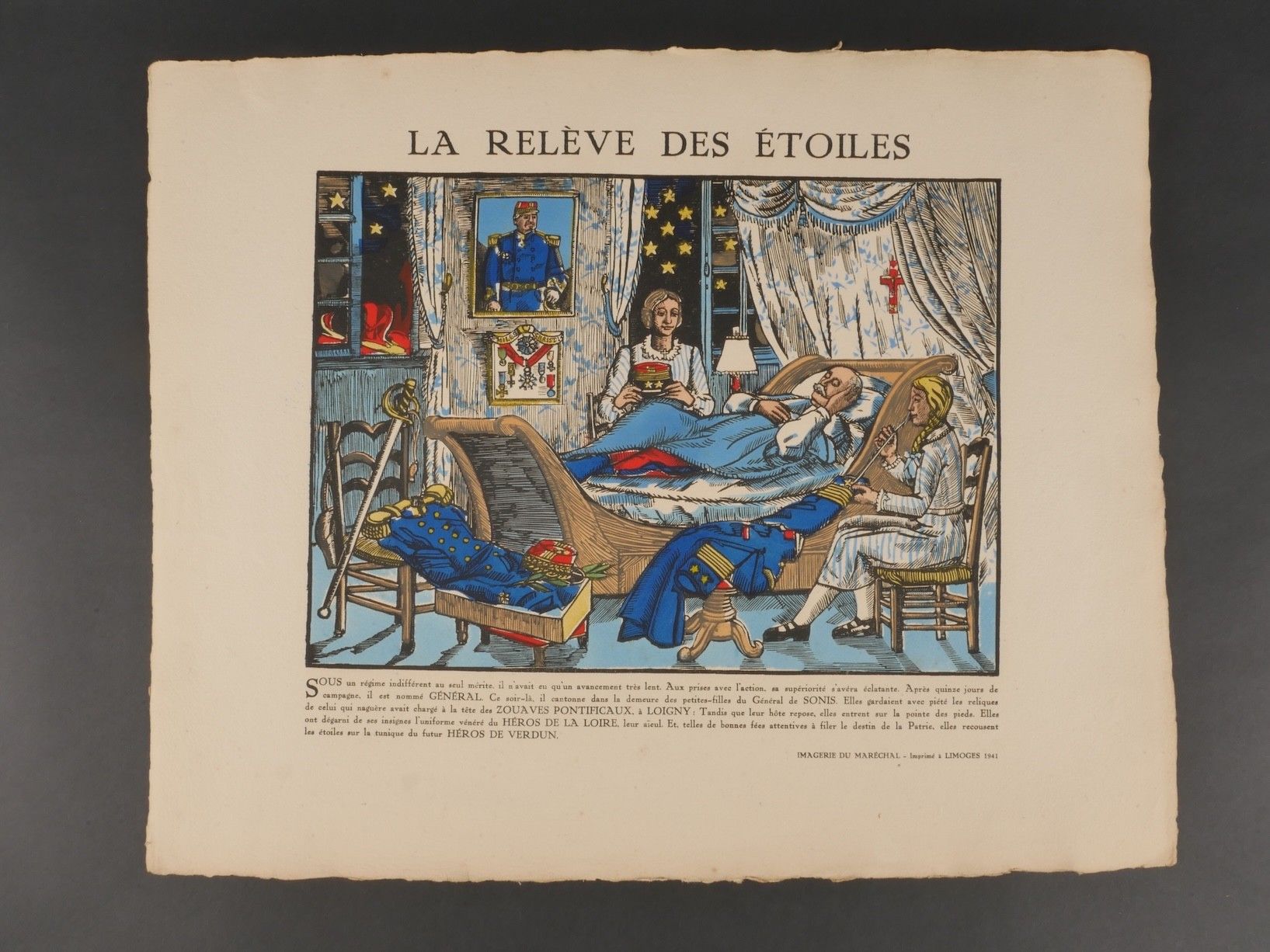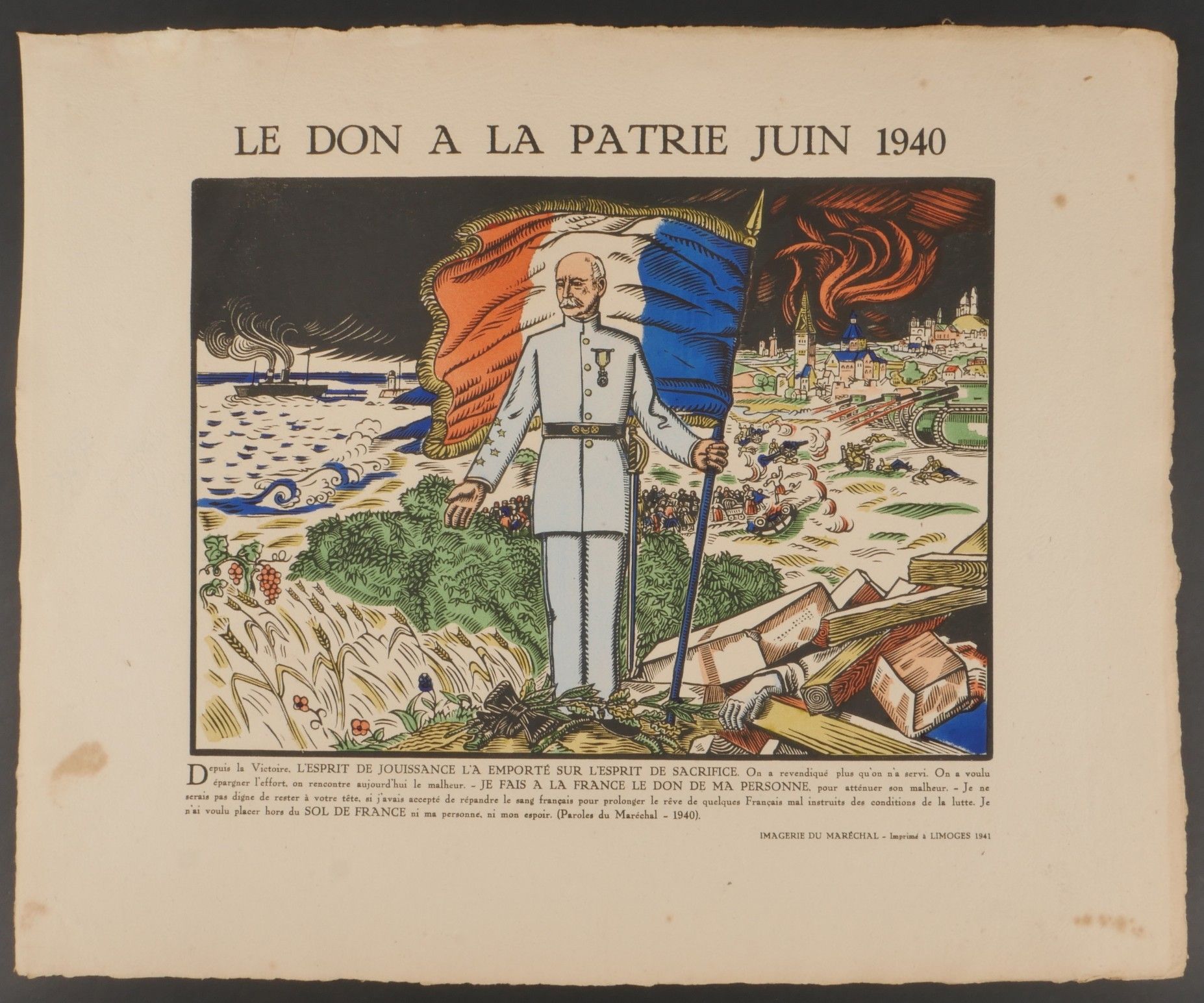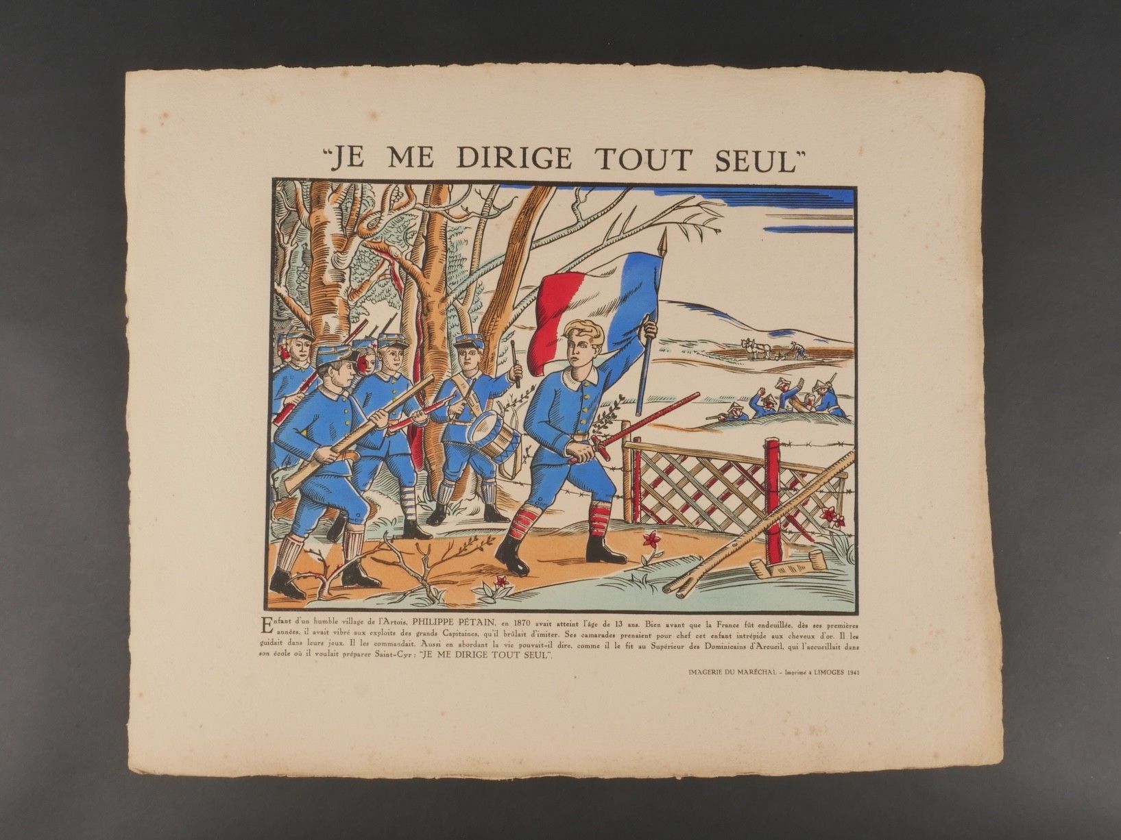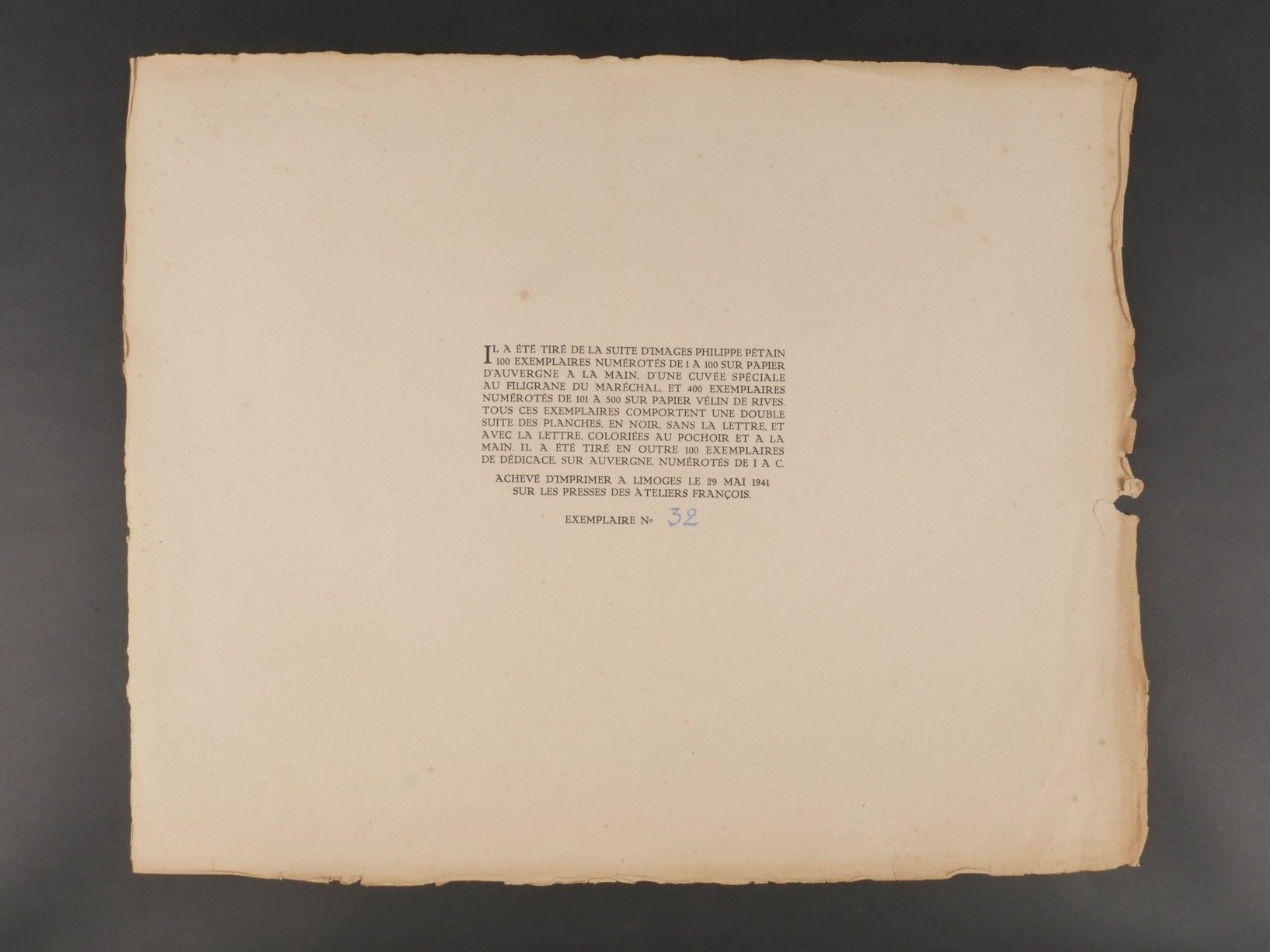DescriptionImagerie du Maréchal. Hardback cover bearing the effigy of the Marshal, numbered 32, printed in Limoges on 29 May 1941 on the presses of the François workshops. Comprising three trial proofs on paper and its 12 original plates. There are also six black and white plates printed in Strasbourg in February and April 1940, one of which is colourised. Marshal imagery. Cardboard folder printed in Limoges 29 May 1941, Ateliers François numbered 32, containing three proof prints and 12 original plates plus six blackandwhite plates printed in Strasbourg February-April 1940, one handcolored.