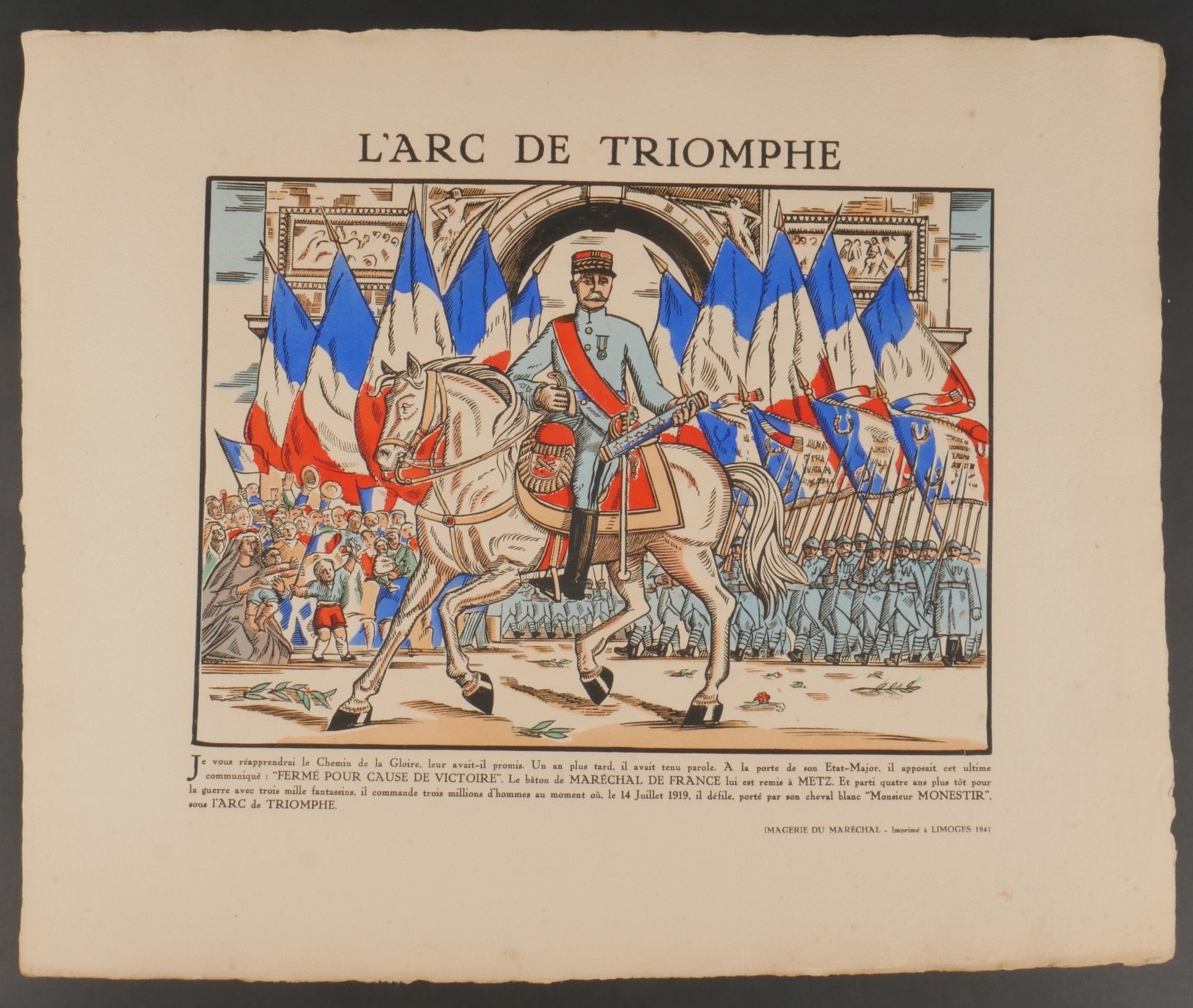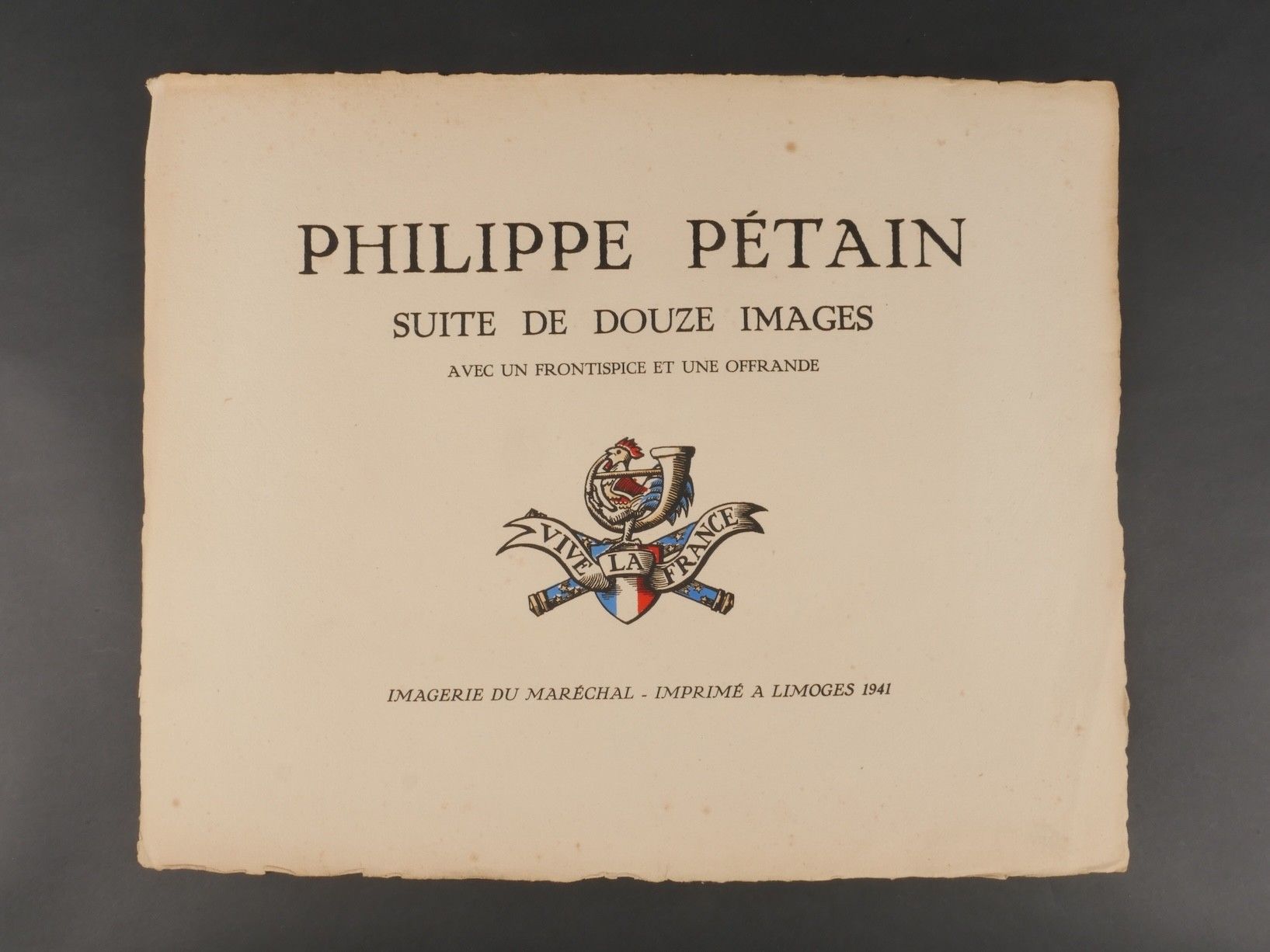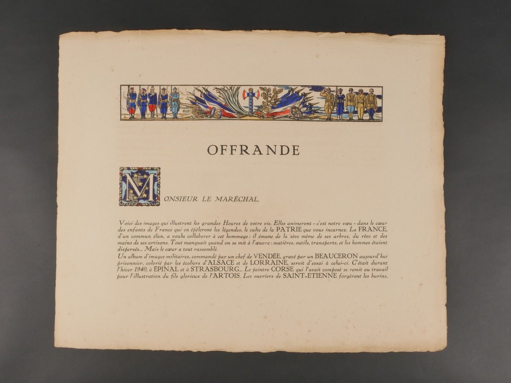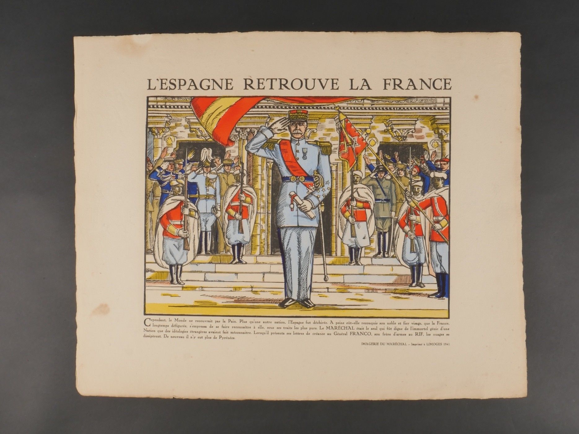 DescriptionImagerie du Maréchal. Hardback cover bearing the effigy of the Marshal, numbered 32, printed in Limoges on 29 May 1941 on the presses of the François workshops. Comprising three trial proofs on paper and its 12 original plates. There are also six black and white plates printed in Strasbourg in February and April 1940, one of which is colourised. Marshal imagery. Cardboard folder printed in Limoges 29 May 1941, Ateliers François numbered 32, containing three proof prints and 12 original plates plus six blackandwhite plates printed in Strasbourg February-April 1940, one handcolored.