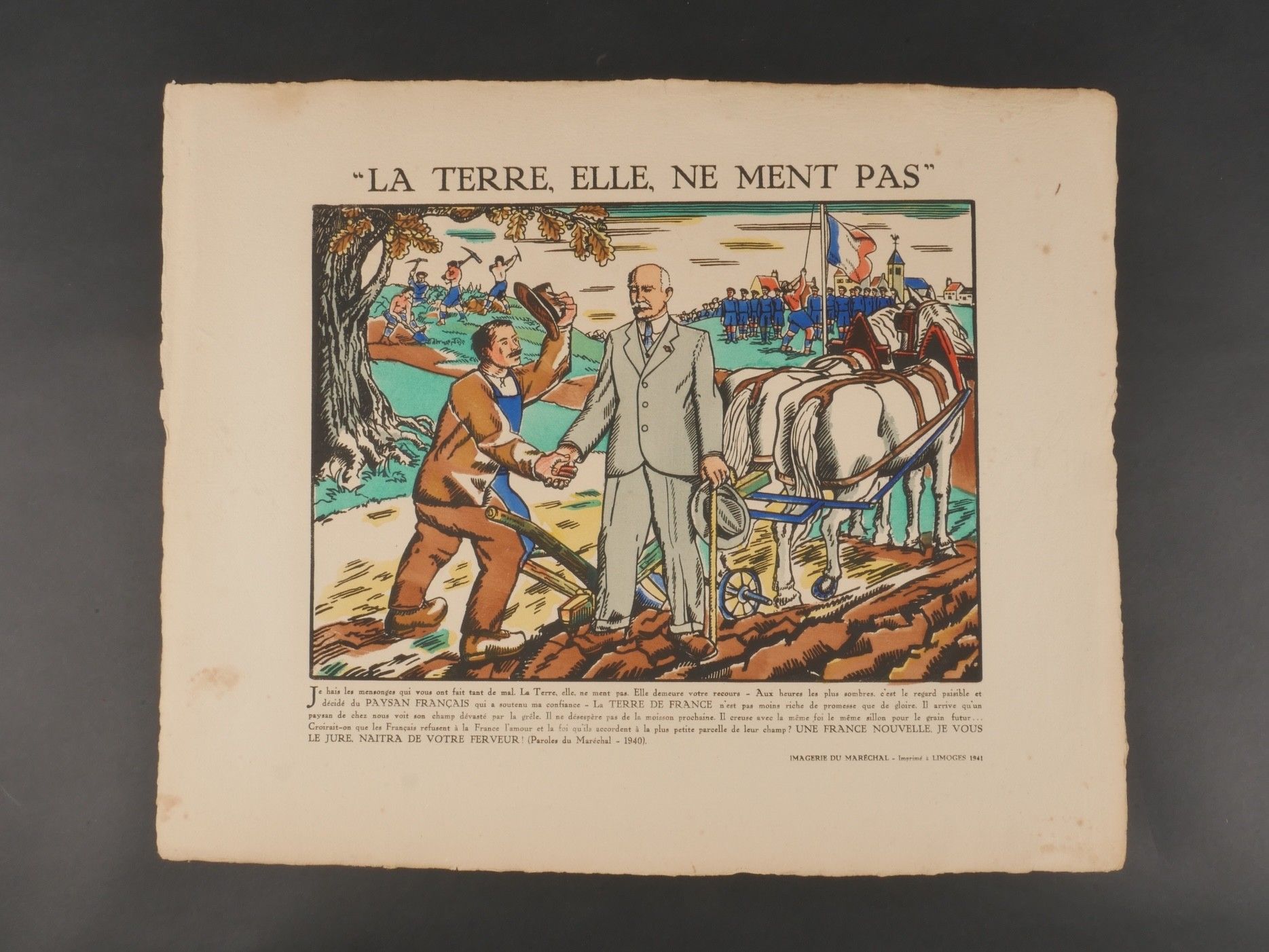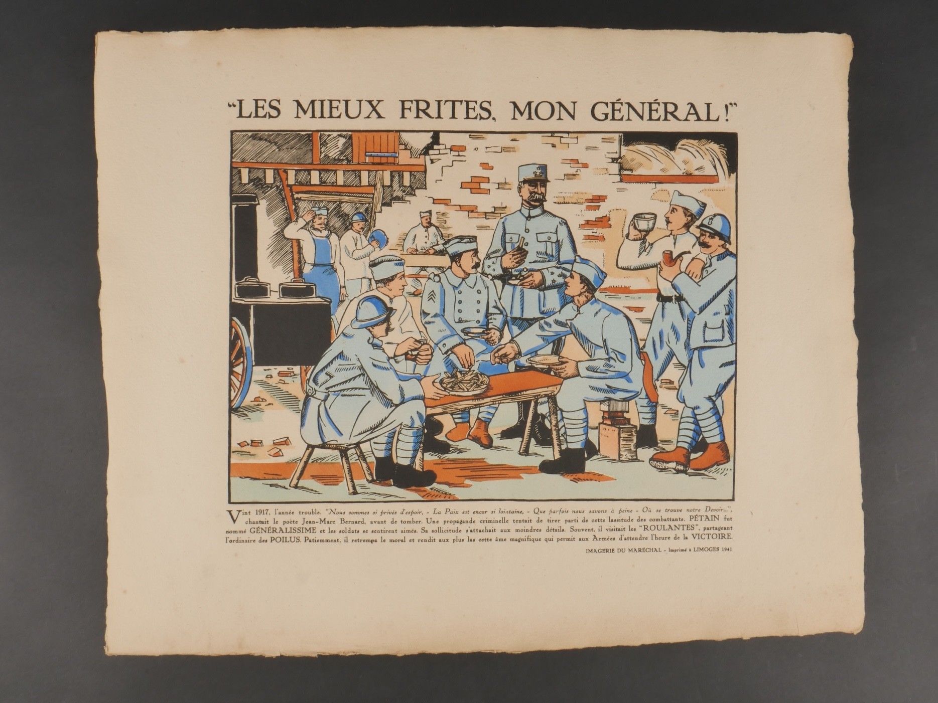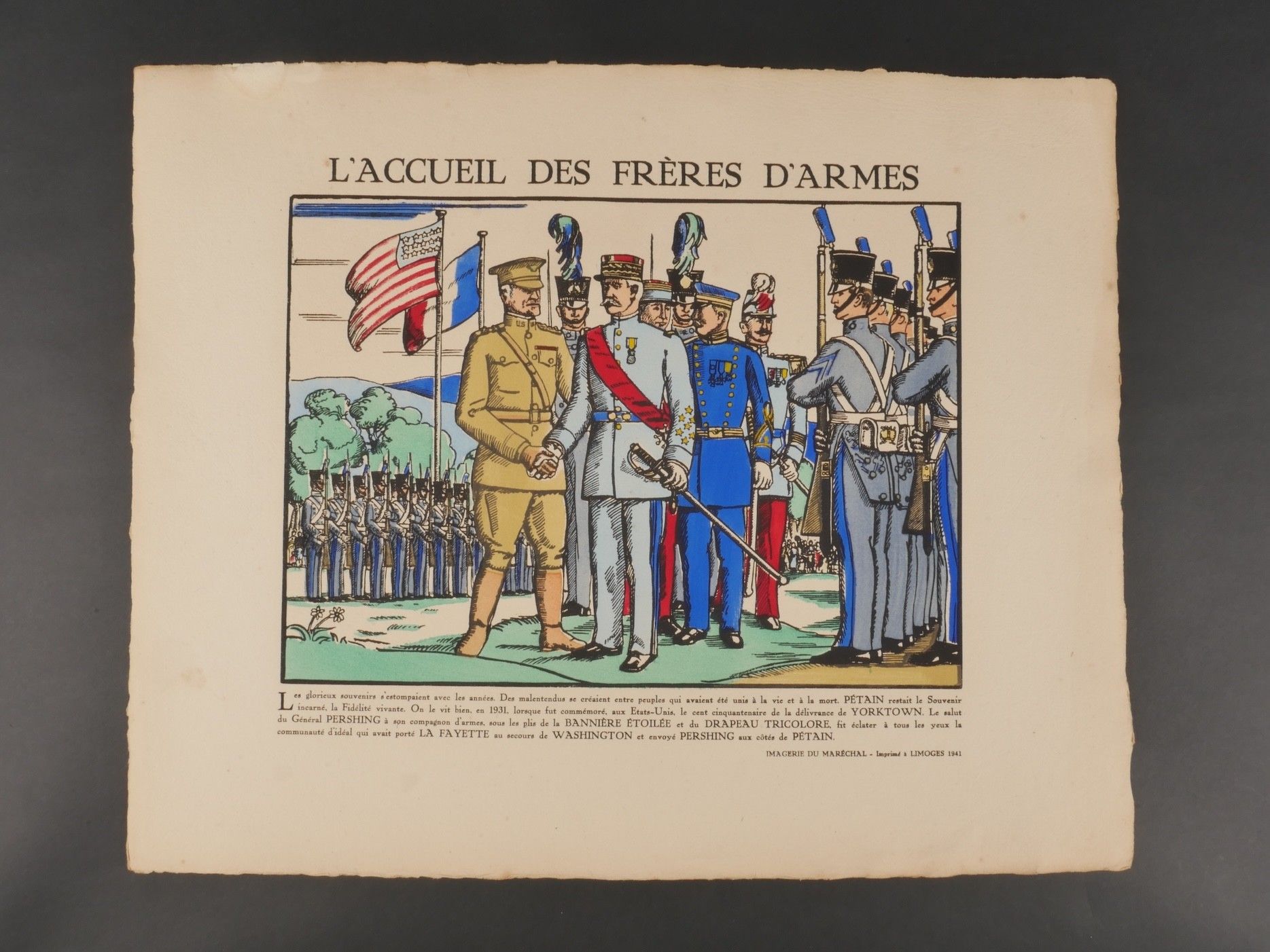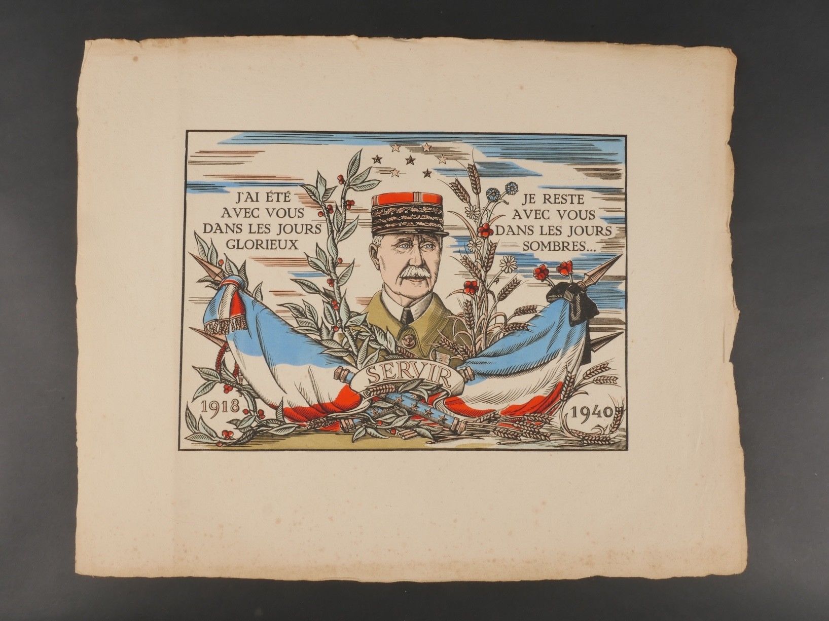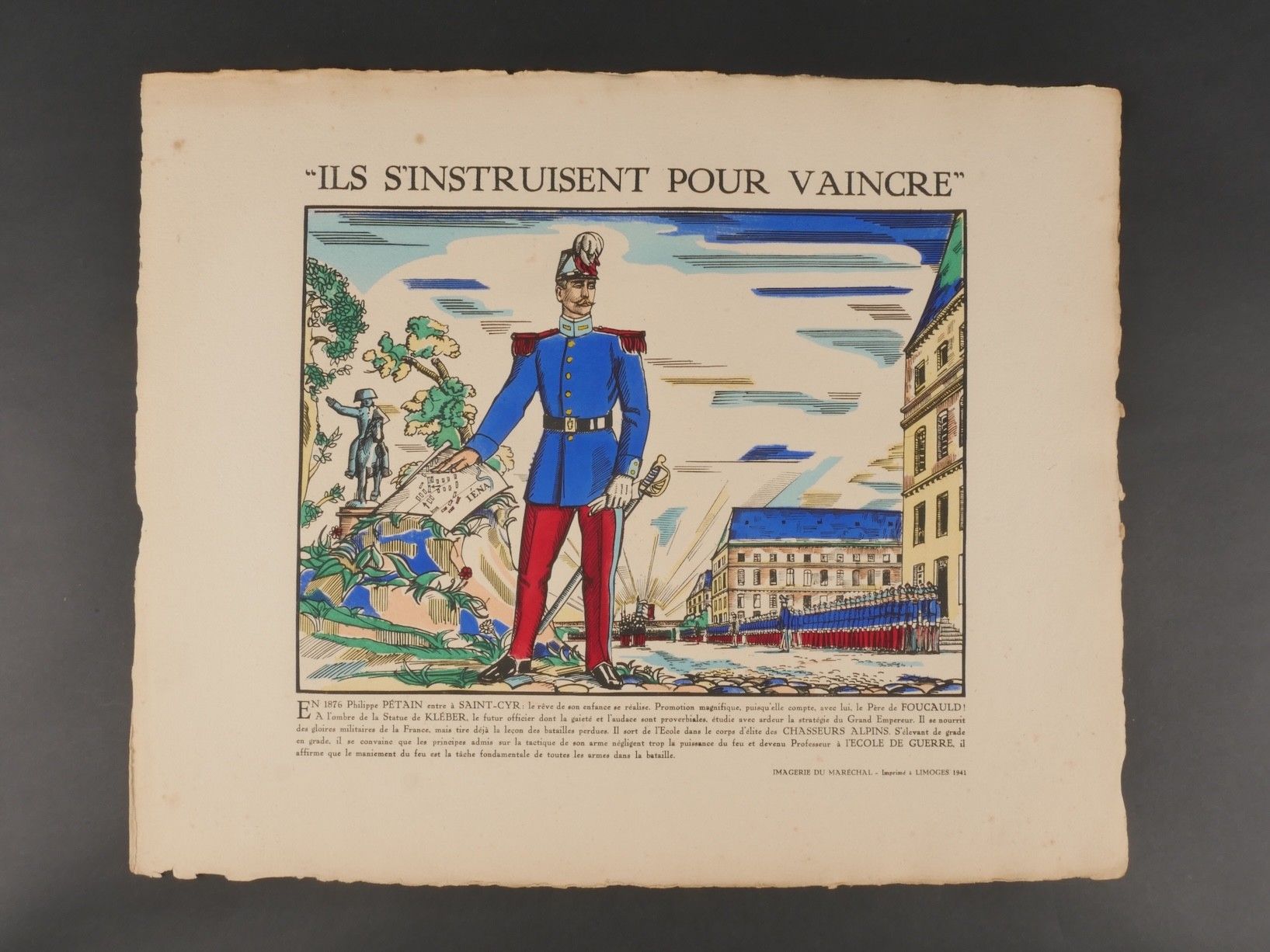 DescriptionImagerie du Maréchal. Hardback cover bearing the effigy of the Marshal, numbered 32, printed in Limoges on 29 May 1941 on the presses of the François workshops. Comprising three trial proofs on paper and its 12 original plates. There are also six black and white plates printed in Strasbourg in February and April 1940, one of which is colourised. Marshal imagery. Cardboard folder printed in Limoges 29 May 1941, Ateliers François numbered 32, containing three proof prints and 12 original plates plus six blackandwhite plates printed in Strasbourg February-April 1940, one handcolored.
