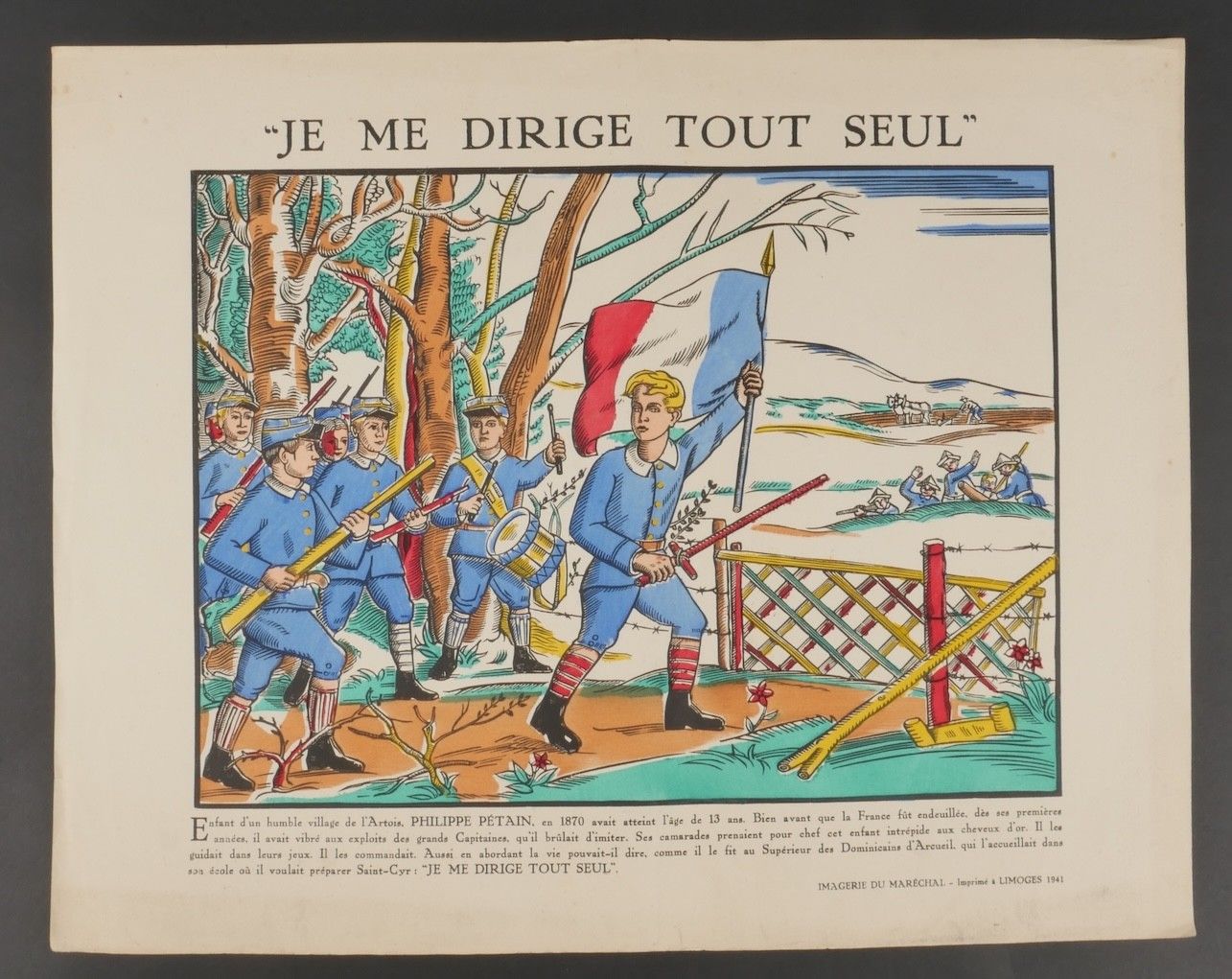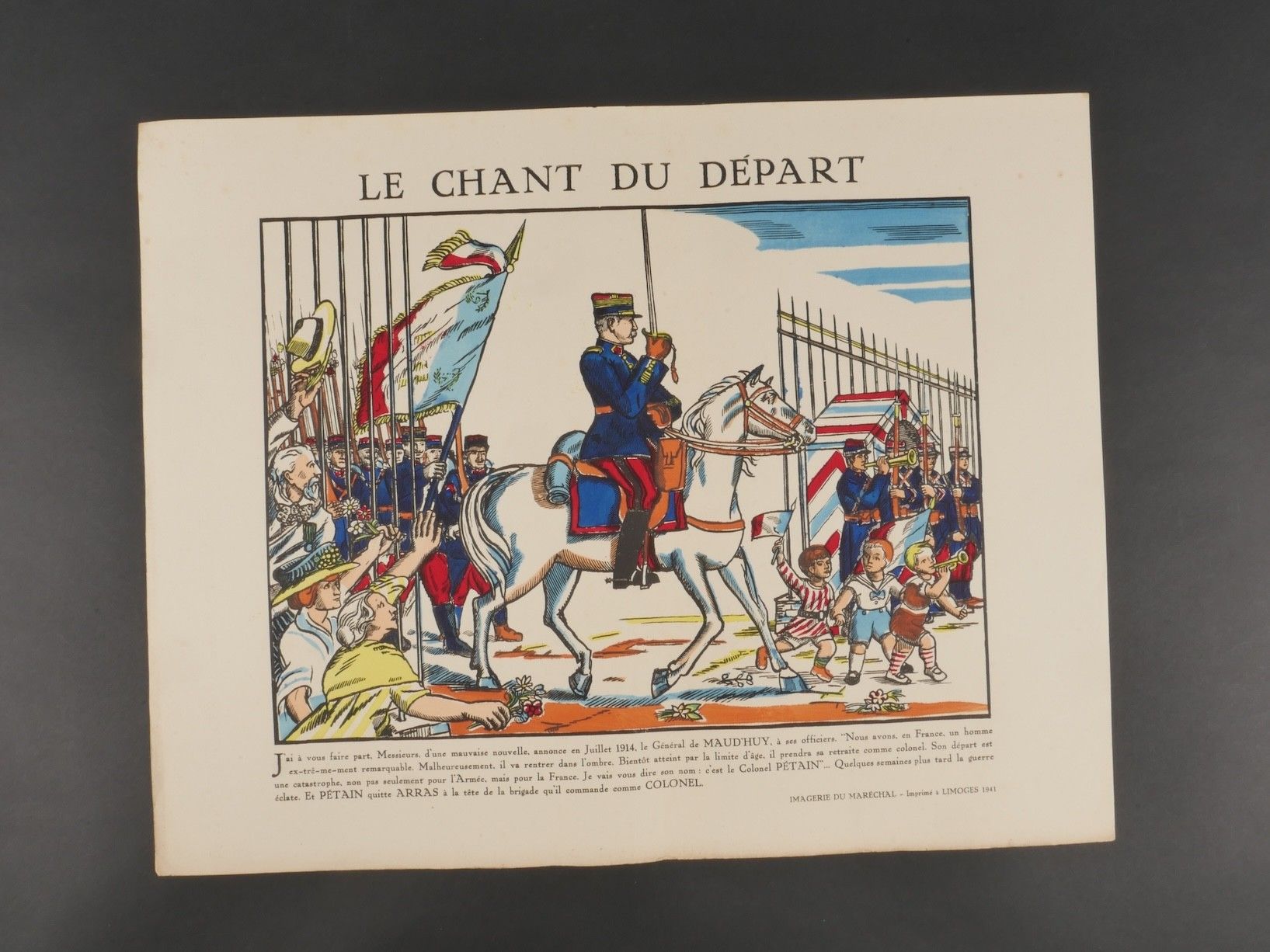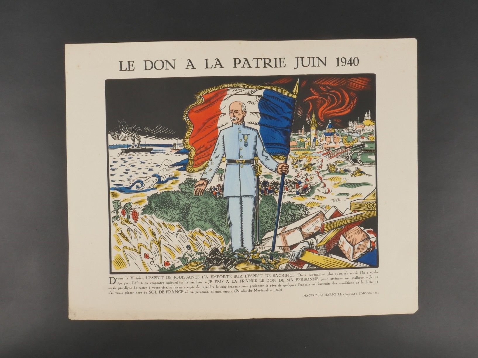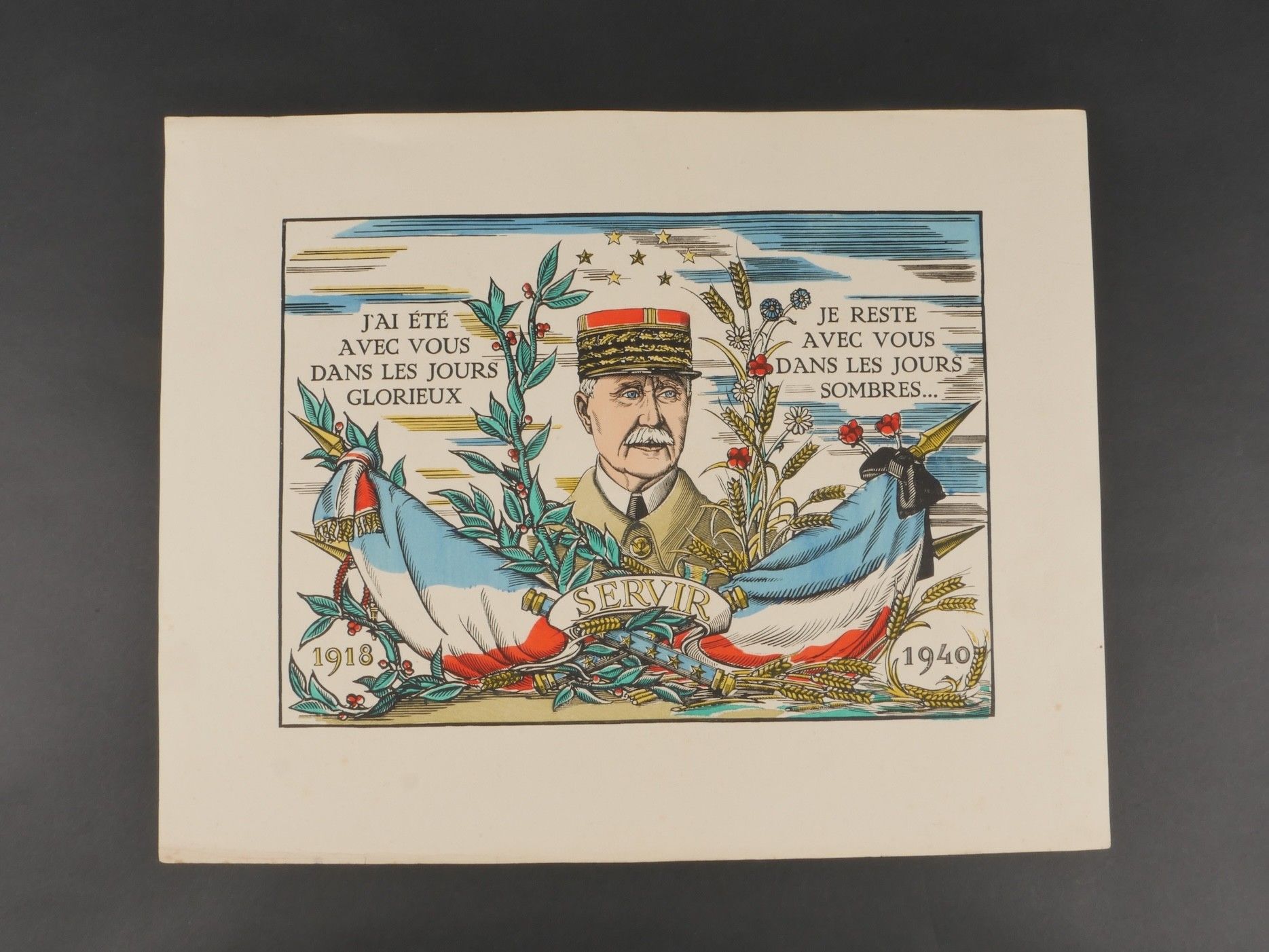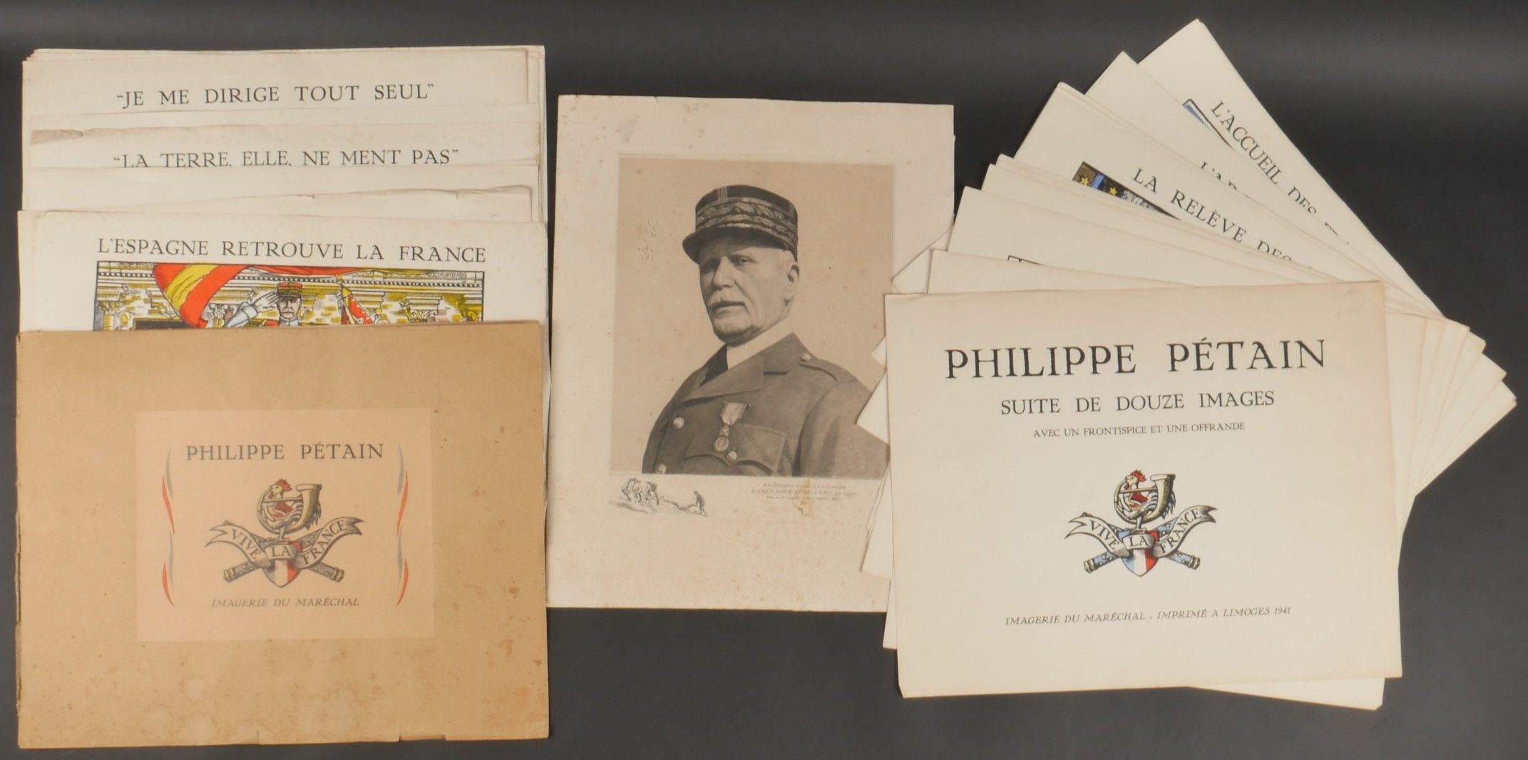 Imagerie du Maréchal. Unnumbered model comprising 15 printed and coloured plates in the effigy of the Marshal, Limoges 1941. There are fifteen additional plates and a portrait of the Marshal to the delegation of the town of Saint Thibault des Vignes for prisoners and their families. A drawing of a prisoner dated 1915. Marshal imagery. Unnumbered model including 15 coloured plates with Pétain's effigy Limoges 1941, 15 additional plates, a portrait presented to SaintThibaultdesVignes commune for prisoners and families, and a 1915 prisoner's drawing.
