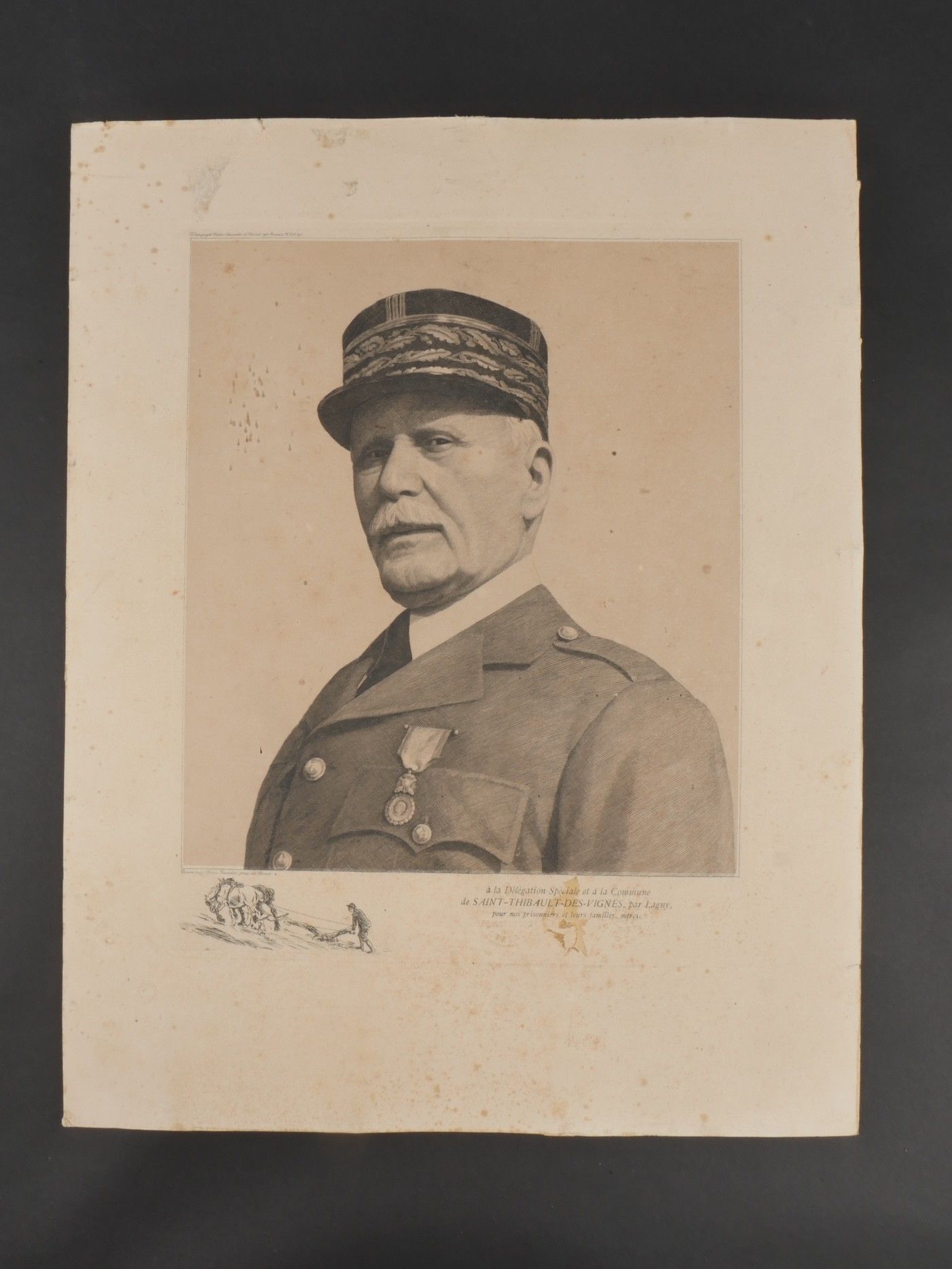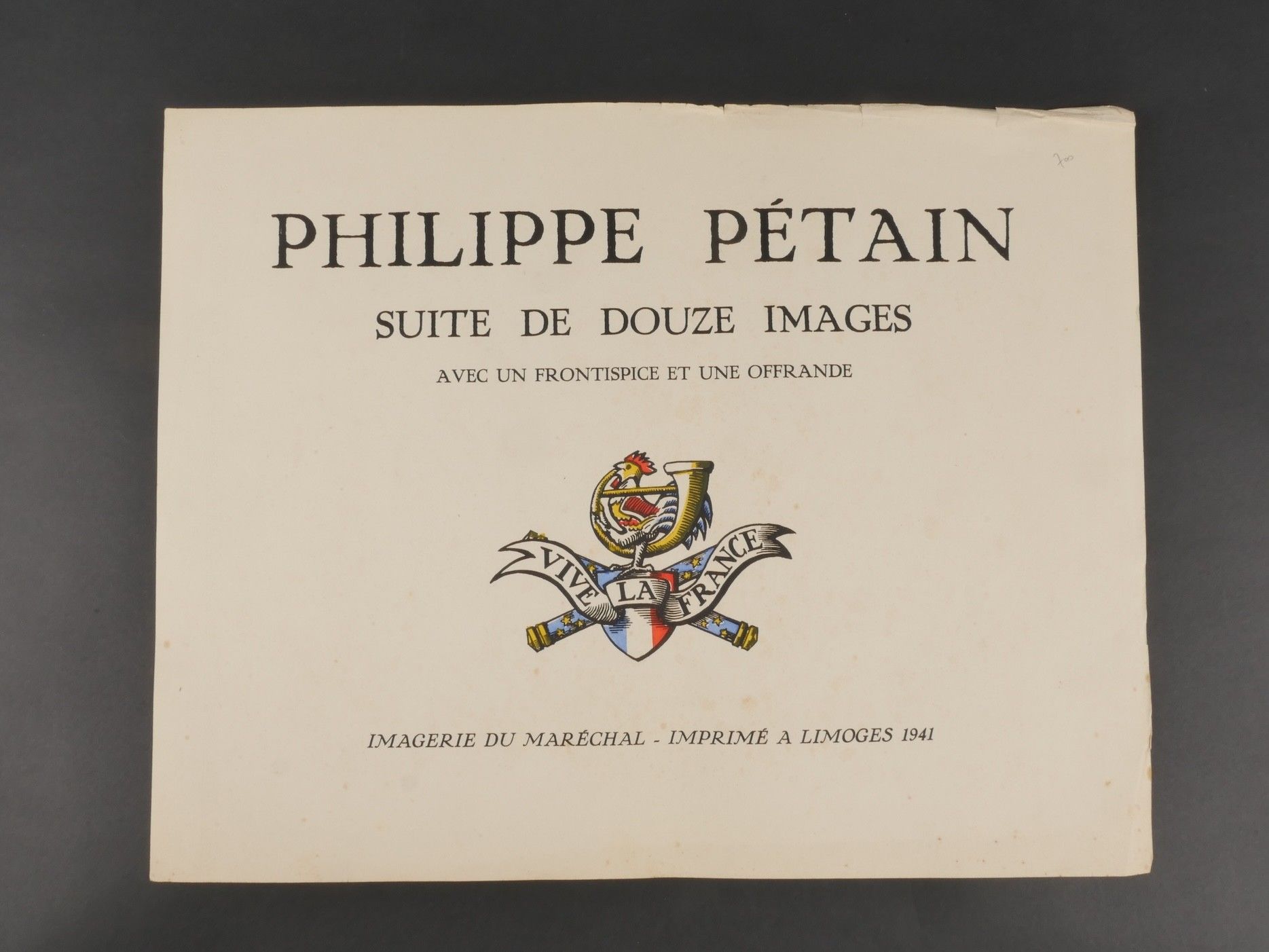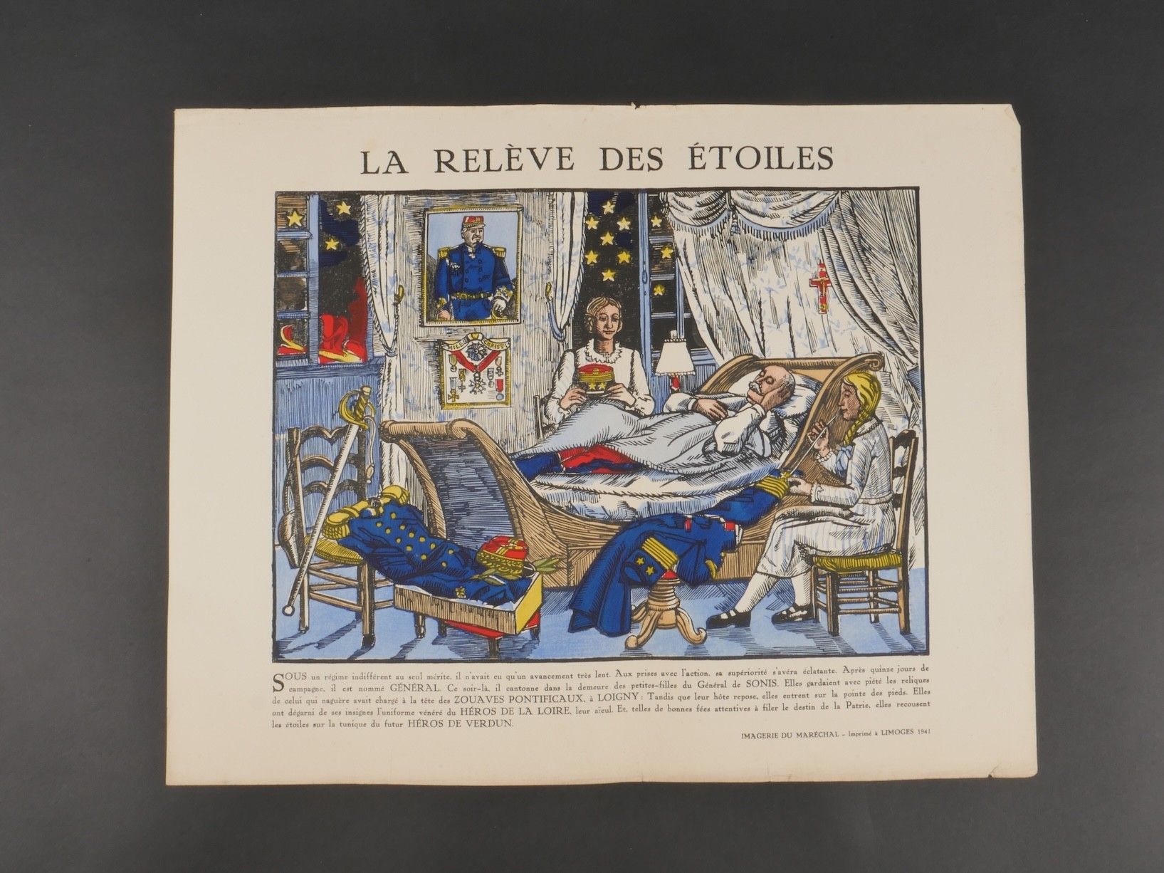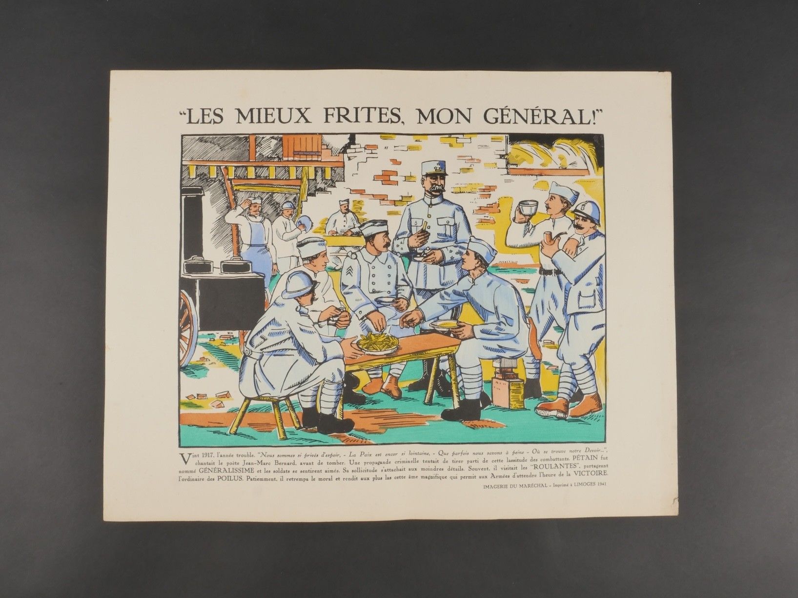 Imagerie du Maréchal. Unnumbered model comprising 15 printed and coloured plates in the effigy of the Marshal, Limoges 1941. There are fifteen additional plates and a portrait of the Marshal to the delegation of the town of Saint Thibault des Vignes for prisoners and their families. A drawing of a prisoner dated 1915. Marshal imagery. Unnumbered model including 15 coloured plates with Pétain's effigy Limoges 1941, 15 additional plates, a portrait presented to SaintThibaultdesVignes commune for prisoners and families, and a 1915 prisoner's drawing.