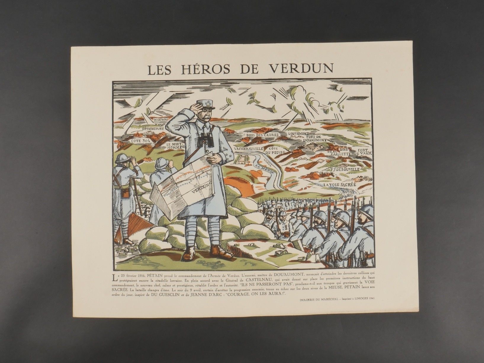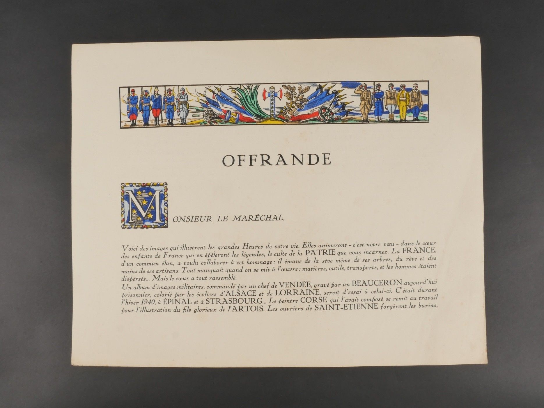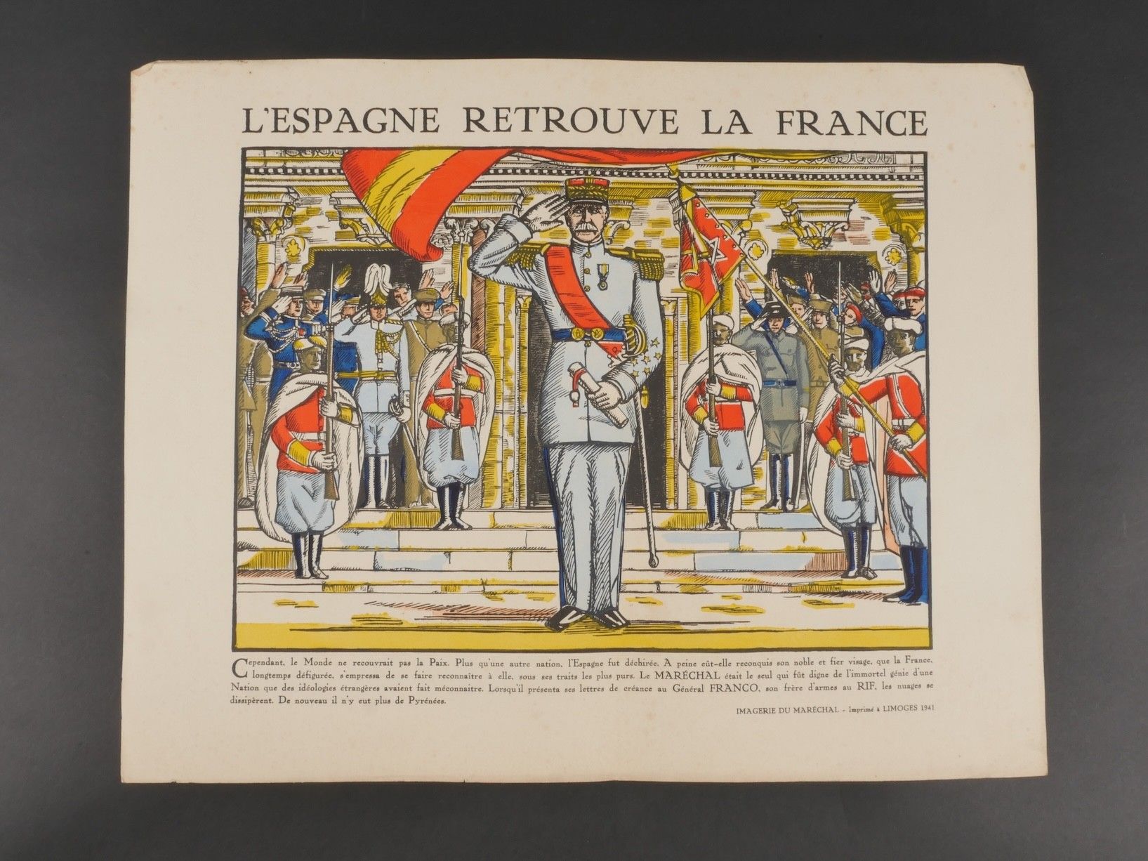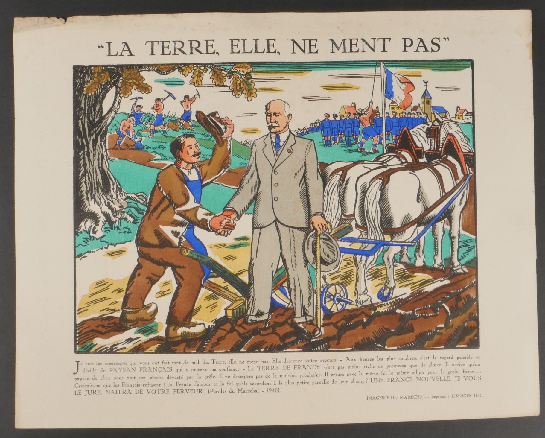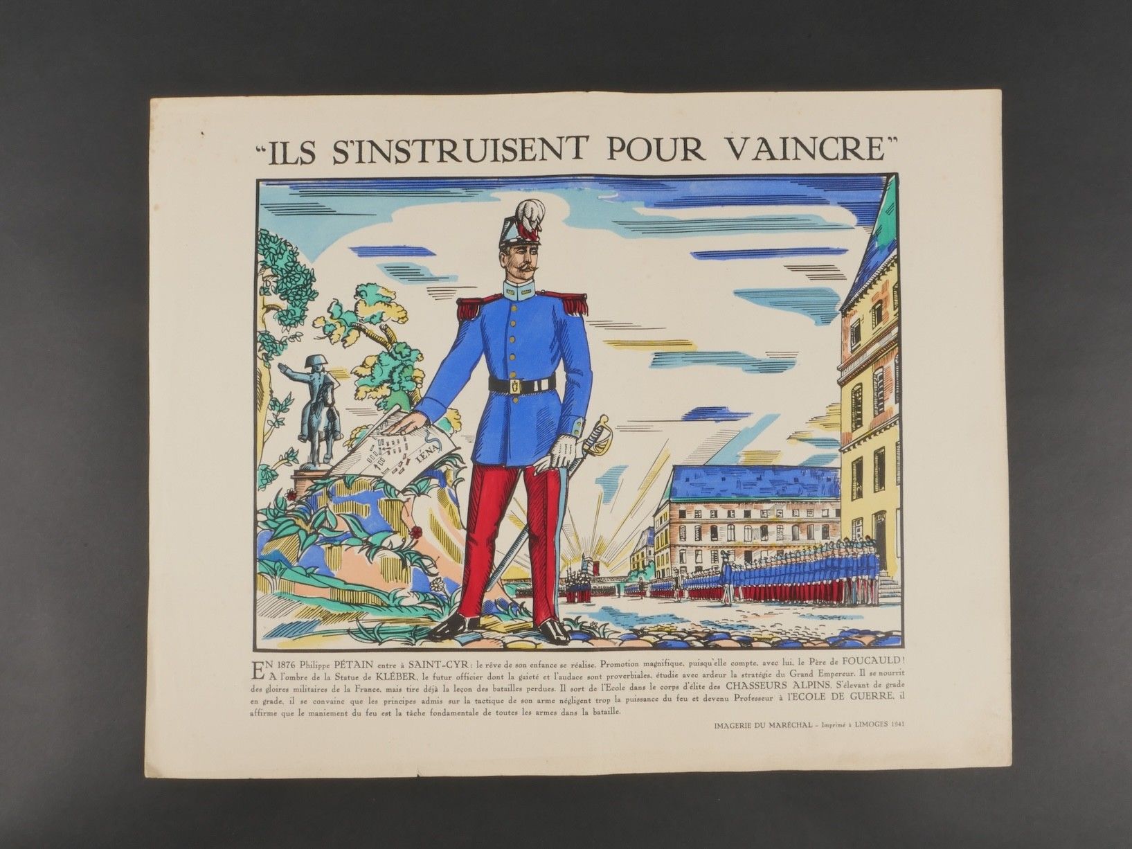 Imagerie du Maréchal. Unnumbered model comprising 15 printed and coloured plates in the effigy of the Marshal, Limoges 1941. There are fifteen additional plates and a portrait of the Marshal to the delegation of the town of Saint Thibault des Vignes for prisoners and their families. A drawing of a prisoner dated 1915. Marshal imagery. Unnumbered model including 15 coloured plates with Pétain's effigy Limoges 1941, 15 additional plates, a portrait presented to SaintThibaultdesVignes commune for prisoners and families, and a 1915 prisoner's drawing.