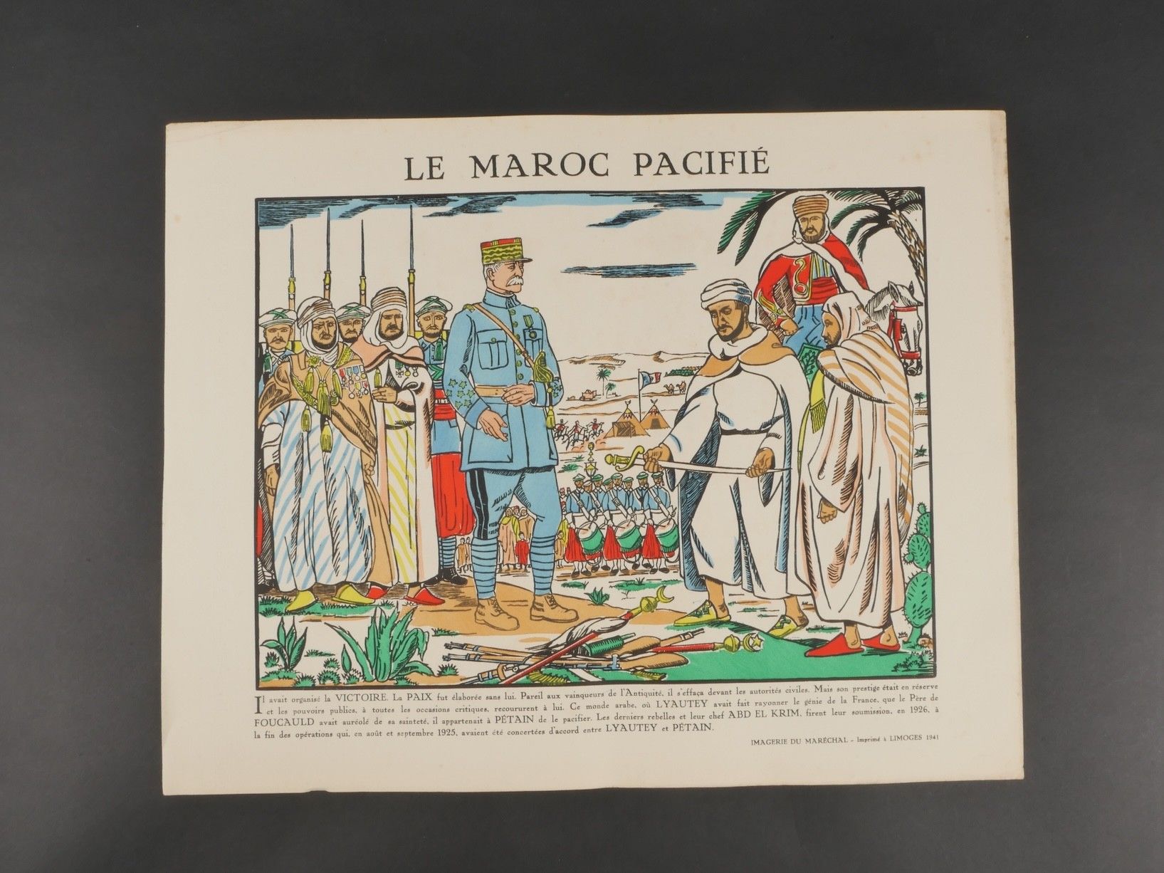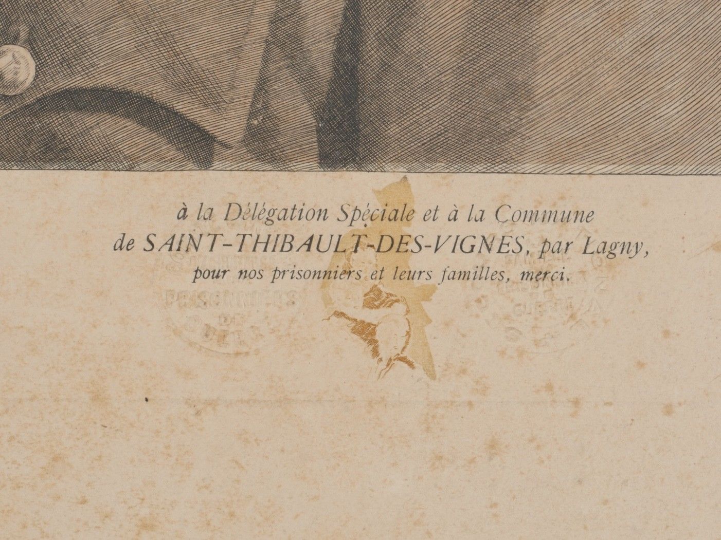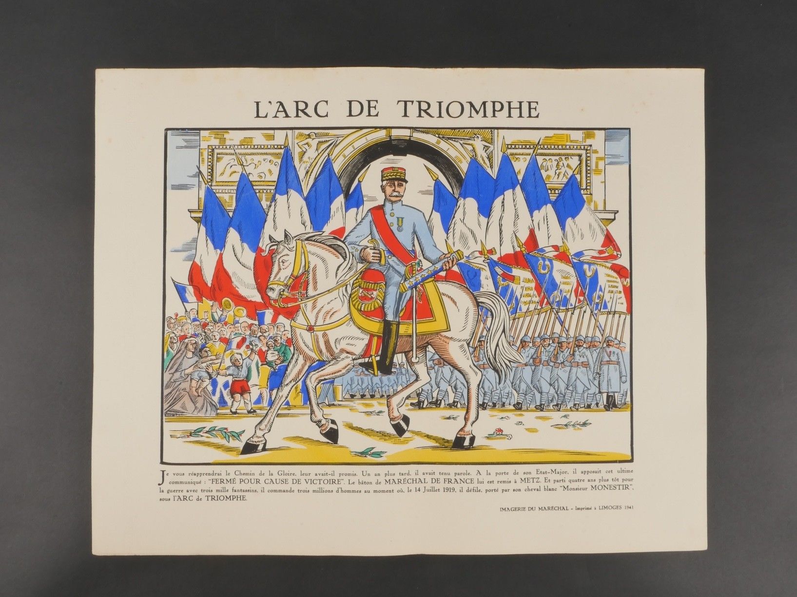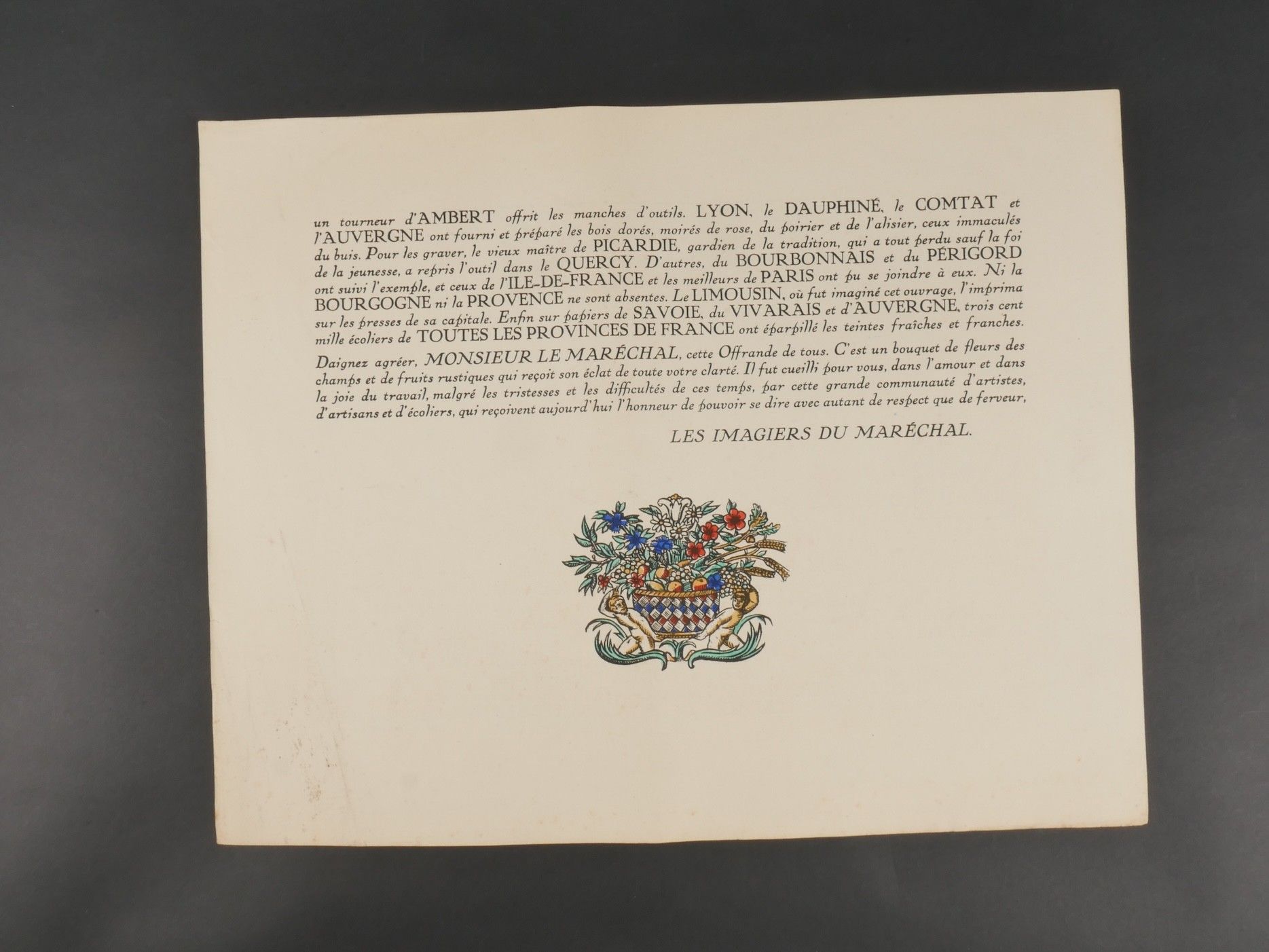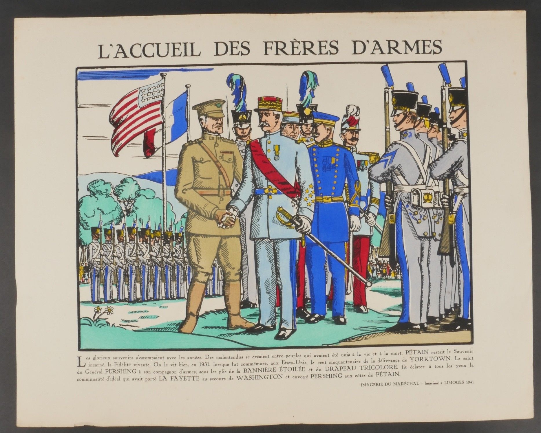 Imagerie du Maréchal. Unnumbered model comprising 15 printed and coloured plates in the effigy of the Marshal, Limoges 1941. There are fifteen additional plates and a portrait of the Marshal to the delegation of the town of Saint Thibault des Vignes for prisoners and their families. A drawing of a prisoner dated 1915. Marshal imagery. Unnumbered model including 15 coloured plates with Pétain's effigy Limoges 1941, 15 additional plates, a portrait presented to SaintThibaultdesVignes commune for prisoners and families, and a 1915 prisoner's drawing.