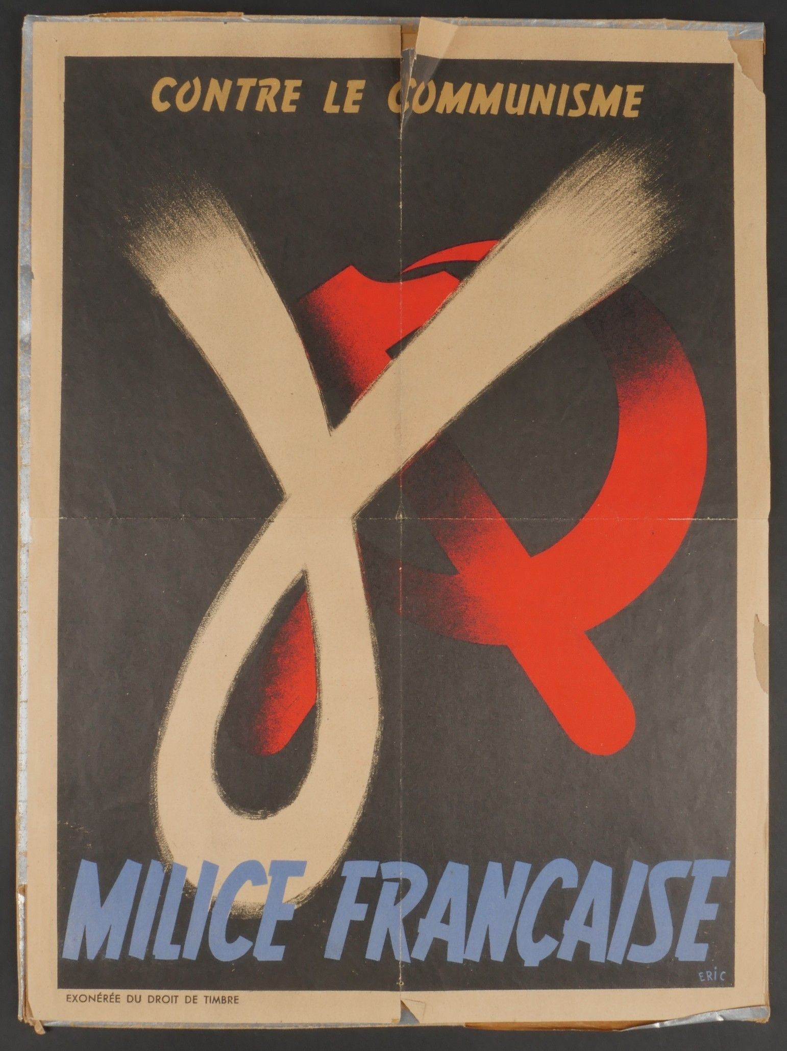 Militia poster. Tricolour poster entitled Milice française contre le communisme, by Eric. Mention exempt from stamp duty, poster folded in four with several small tears. Size 29x39.5cm. Milice poster. Tricolor poster titled Milice Française contre le Communisme by Eric, taxexempt, folded in four with several small tears 29×39.5 cm.