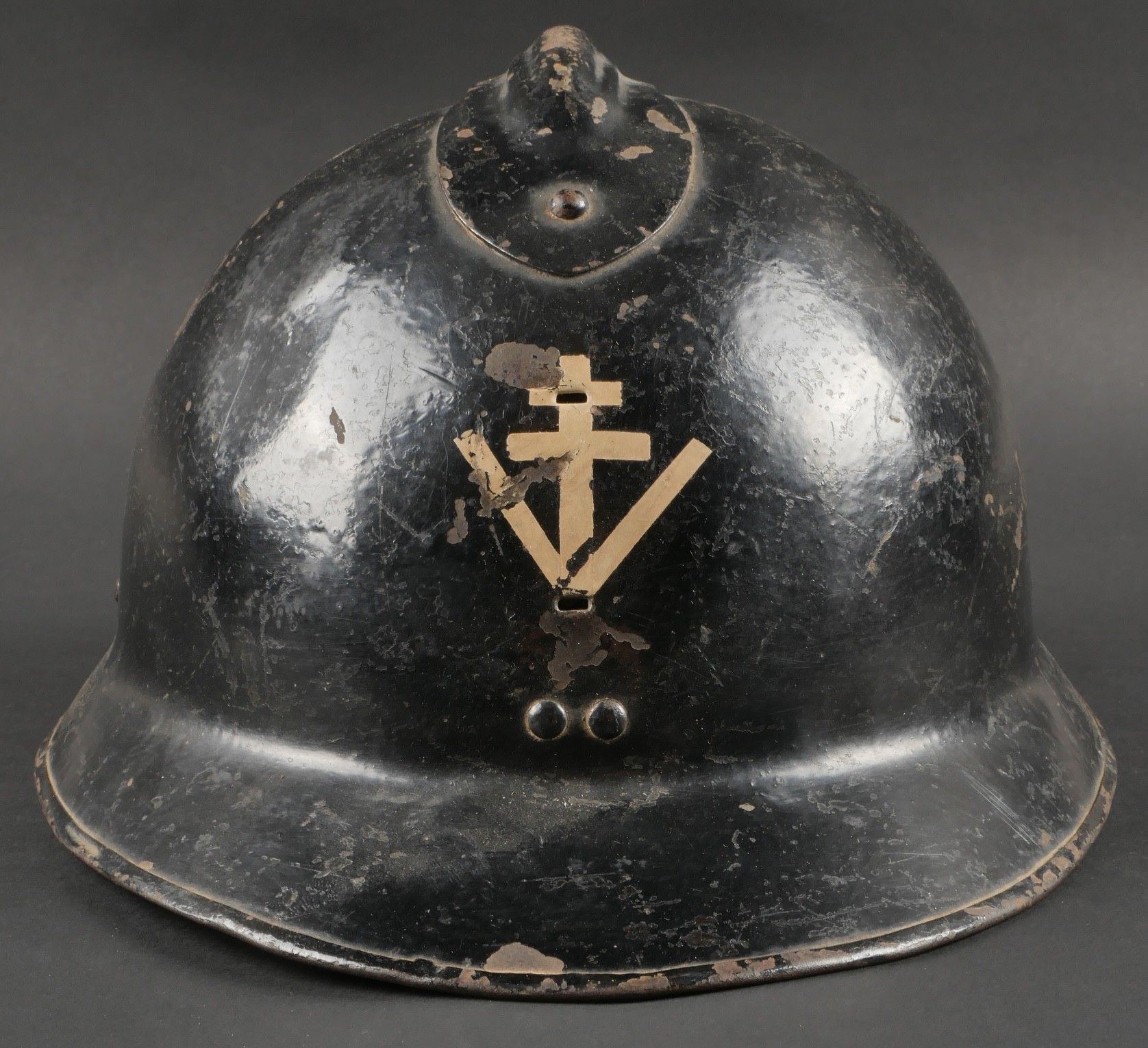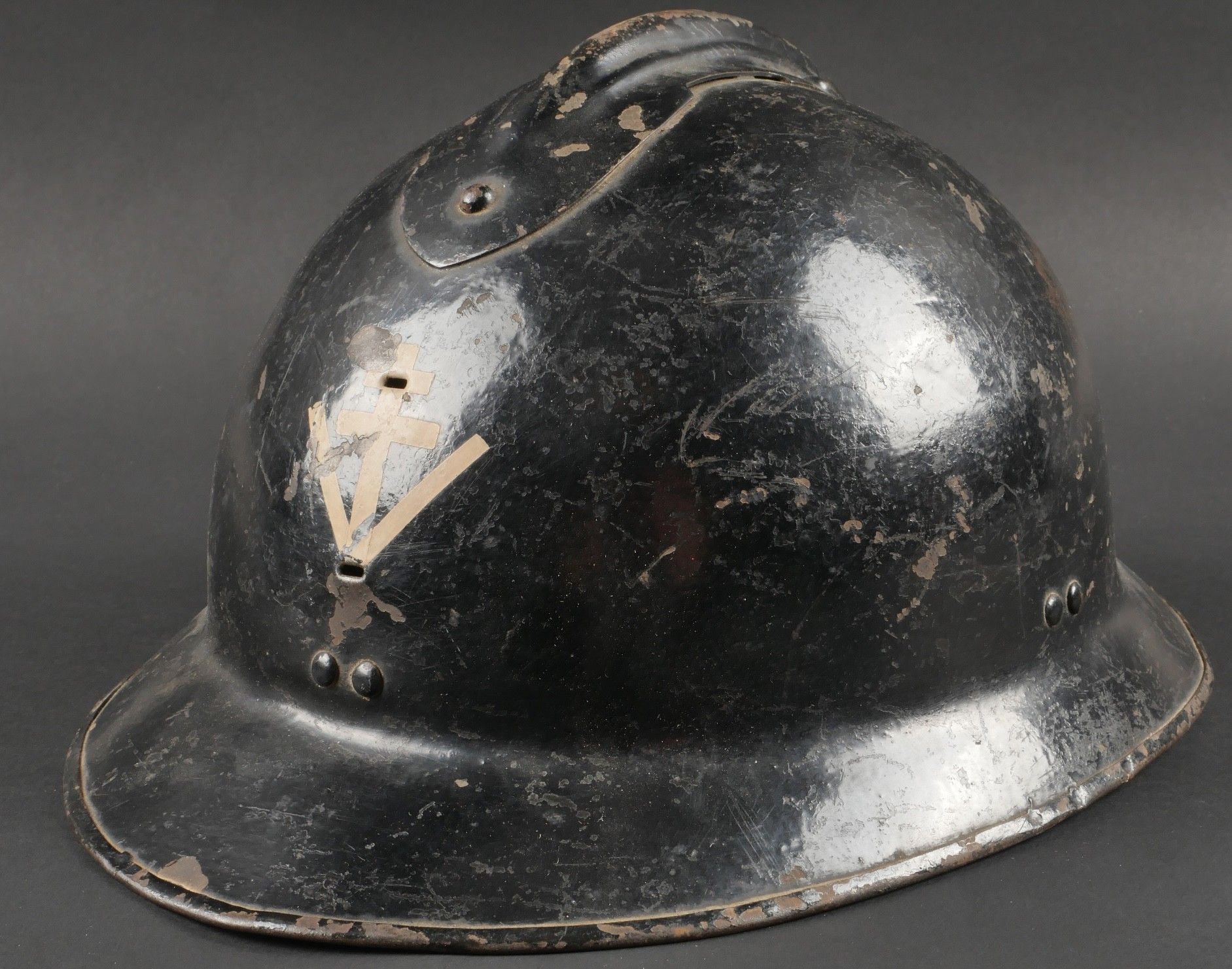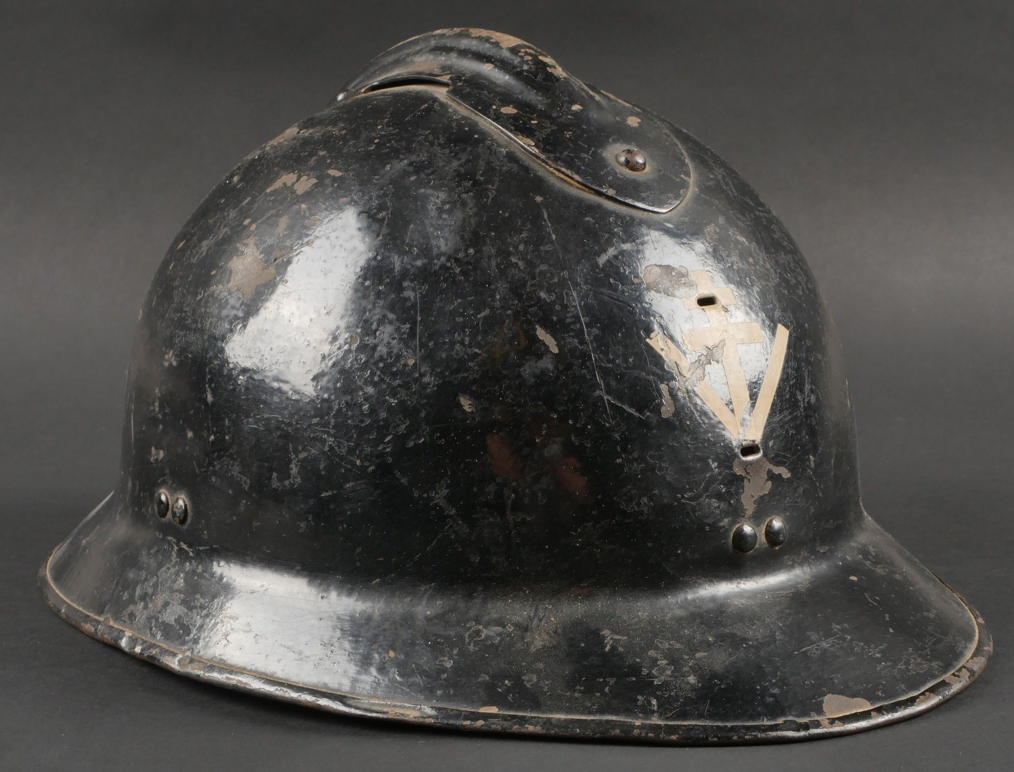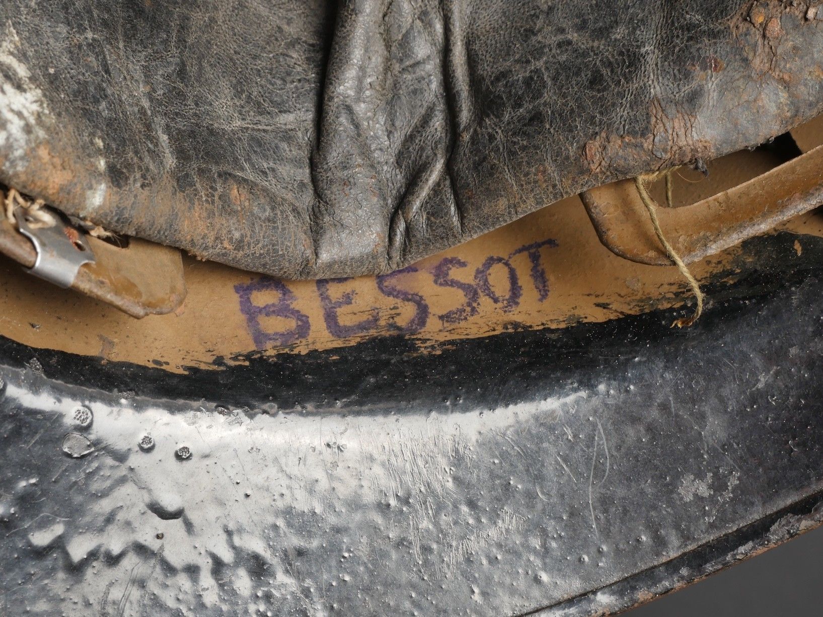 FFI helmet. 1926 Adrian helmet, factory issued in khaki paint and repainted black on liberation, FFI insignia painted black on front of helmet. Leather cap with six wolf's teeth, one of which is damaged and now has only six staples, size C stamp on the bottom of the bomb and the manufacturer Mamou in Marseille. Leather chinstrap present. The resistance fighter wrote his name inside, Bessot. FFI helmet. Model 1926 Adrian helmet factory painted khaki and repainted black at liberation, FFI badge painted in black on the front. Leather liner with six tongues, one damaged, retaining only six clips, size stamp C at the crown and maker Mamou Marseille. Leather chinstrap present. The resister wrote his name inside Bessot.