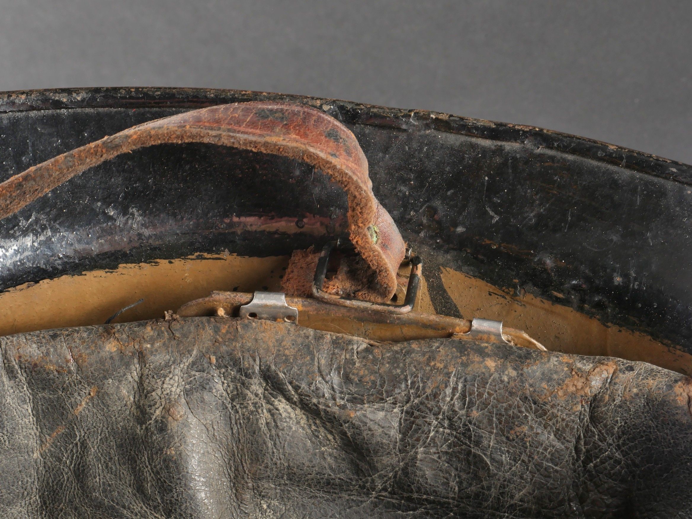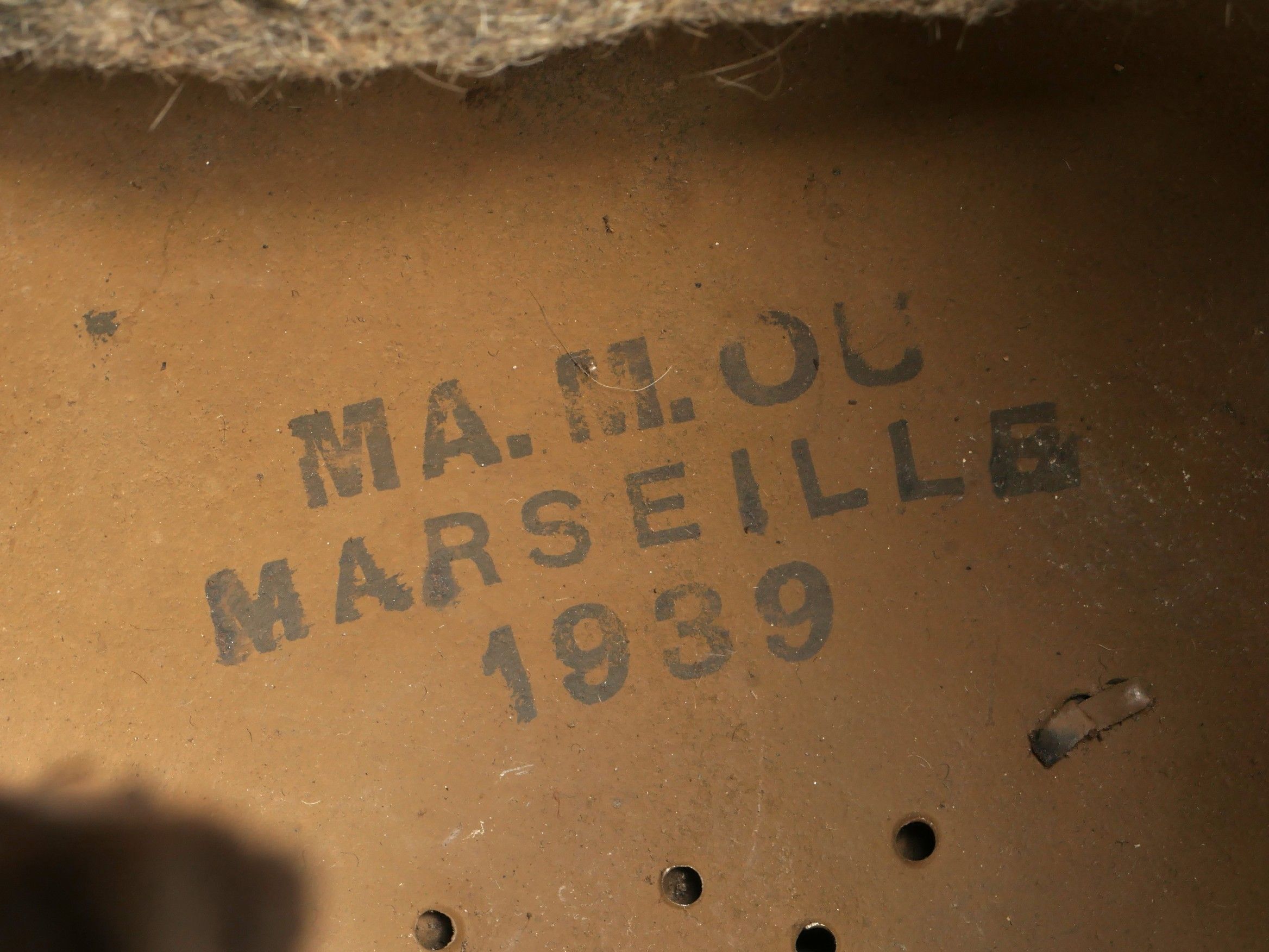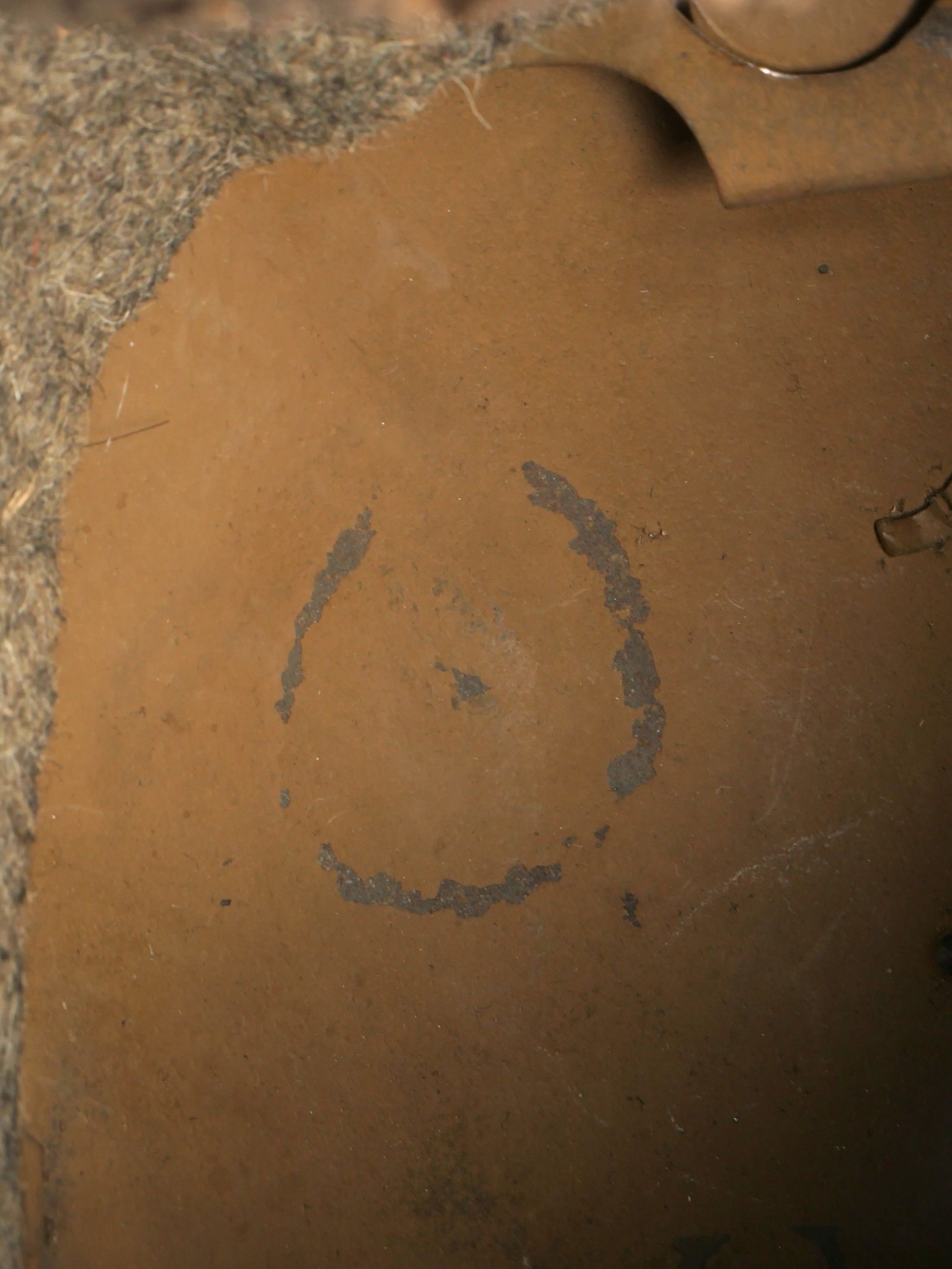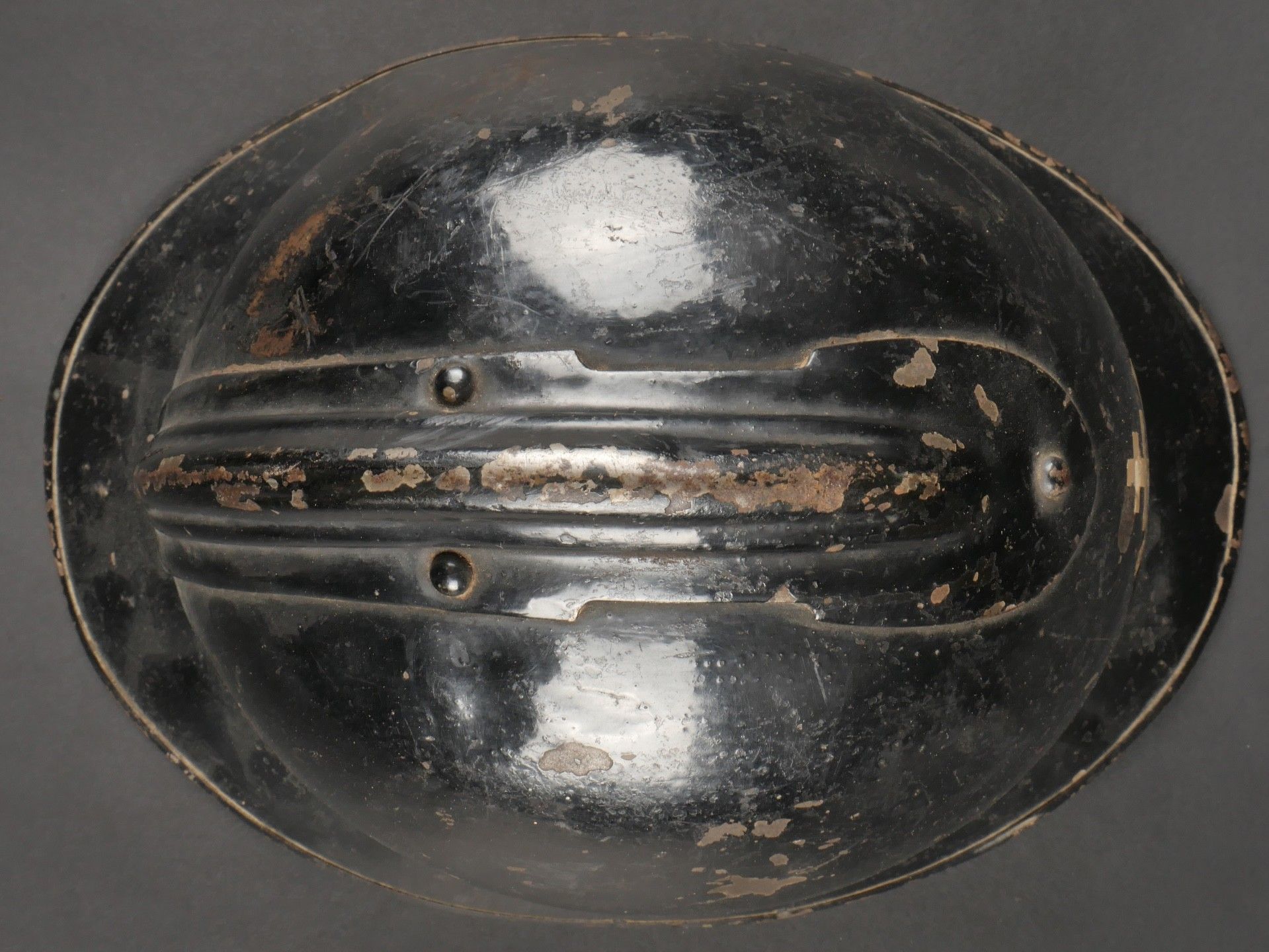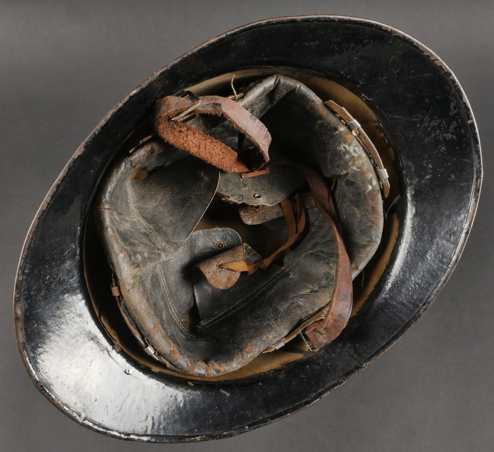 FFI helmet. 1926 Adrian helmet, factory issued in khaki paint and repainted black on liberation, FFI insignia painted black on front of helmet. Leather cap with six wolf's teeth, one of which is damaged and now has only six staples, size C stamp on the bottom of the bomb and the manufacturer Mamou in Marseille. Leather chinstrap present. The resistance fighter wrote his name inside, Bessot. FFI helmet. Model 1926 Adrian helmet factory painted khaki and repainted black at liberation, FFI badge painted in black on the front. Leather liner with six tongues, one damaged, retaining only six clips, size stamp C at the crown and maker Mamou Marseille. Leather chinstrap present. The resister wrote his name inside Bessot.