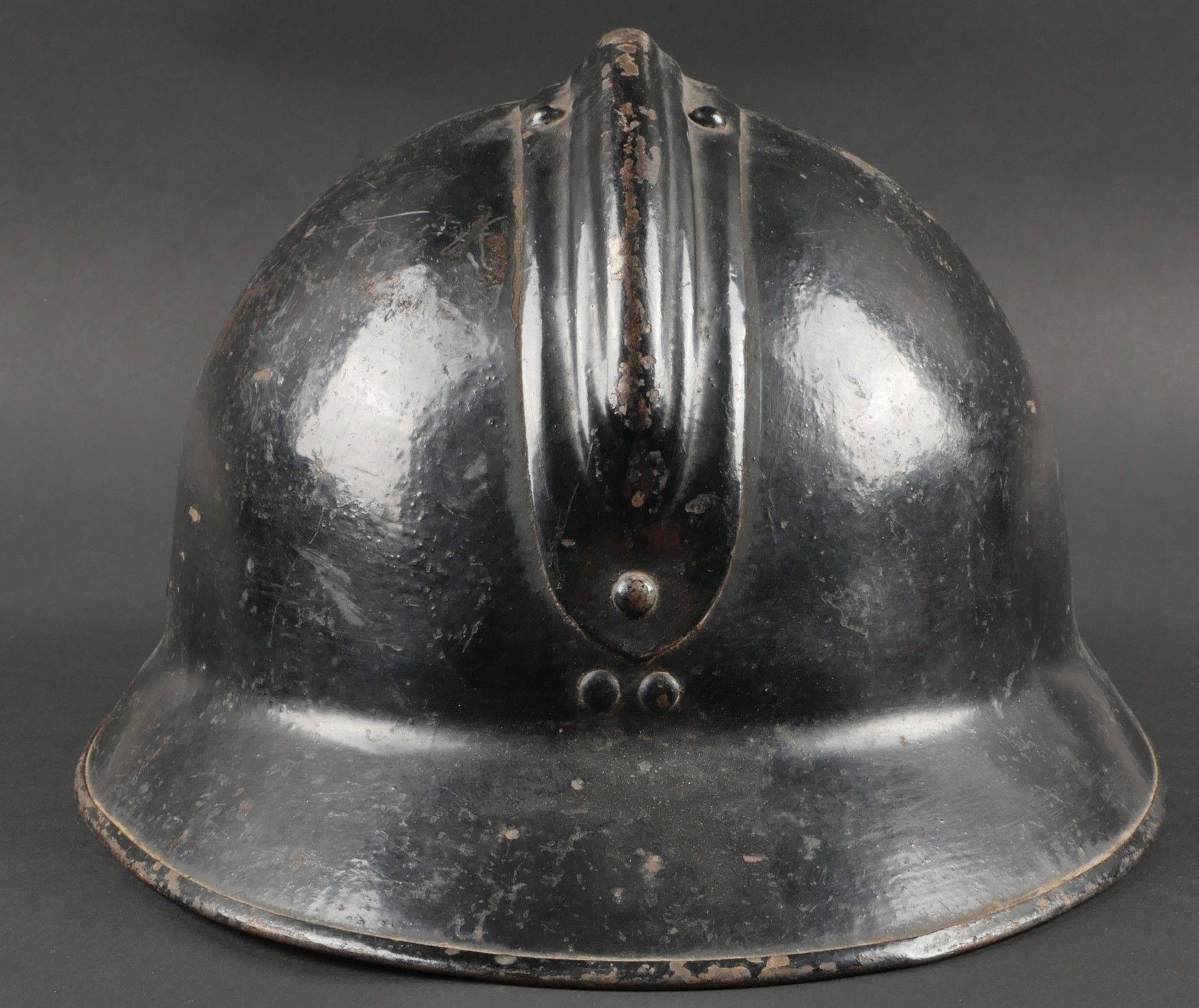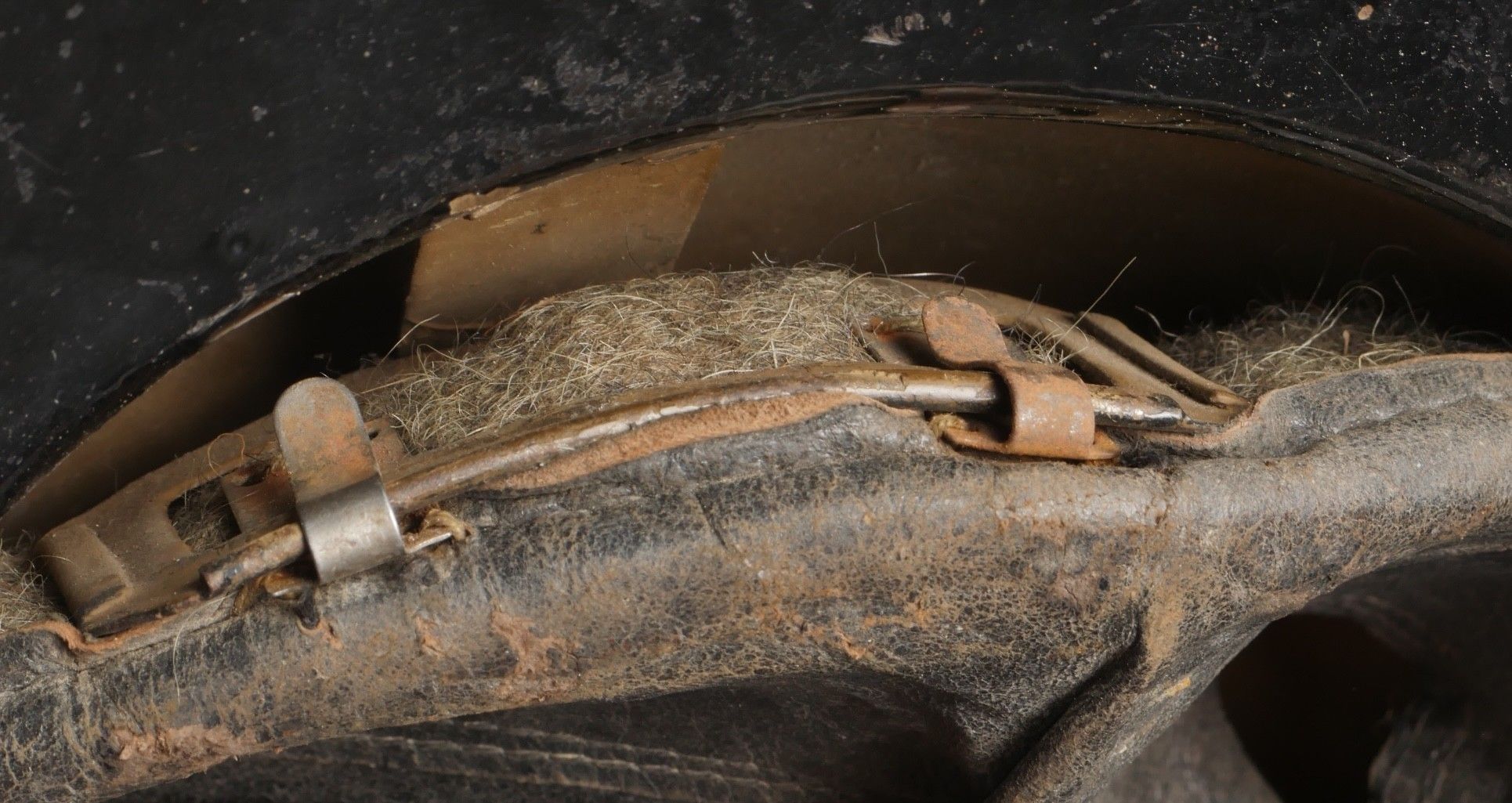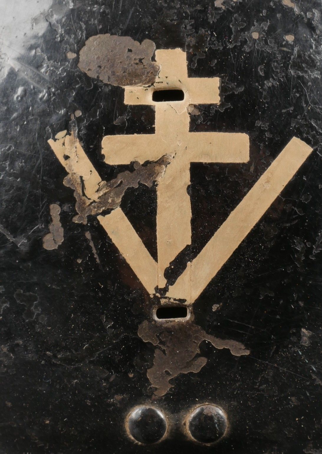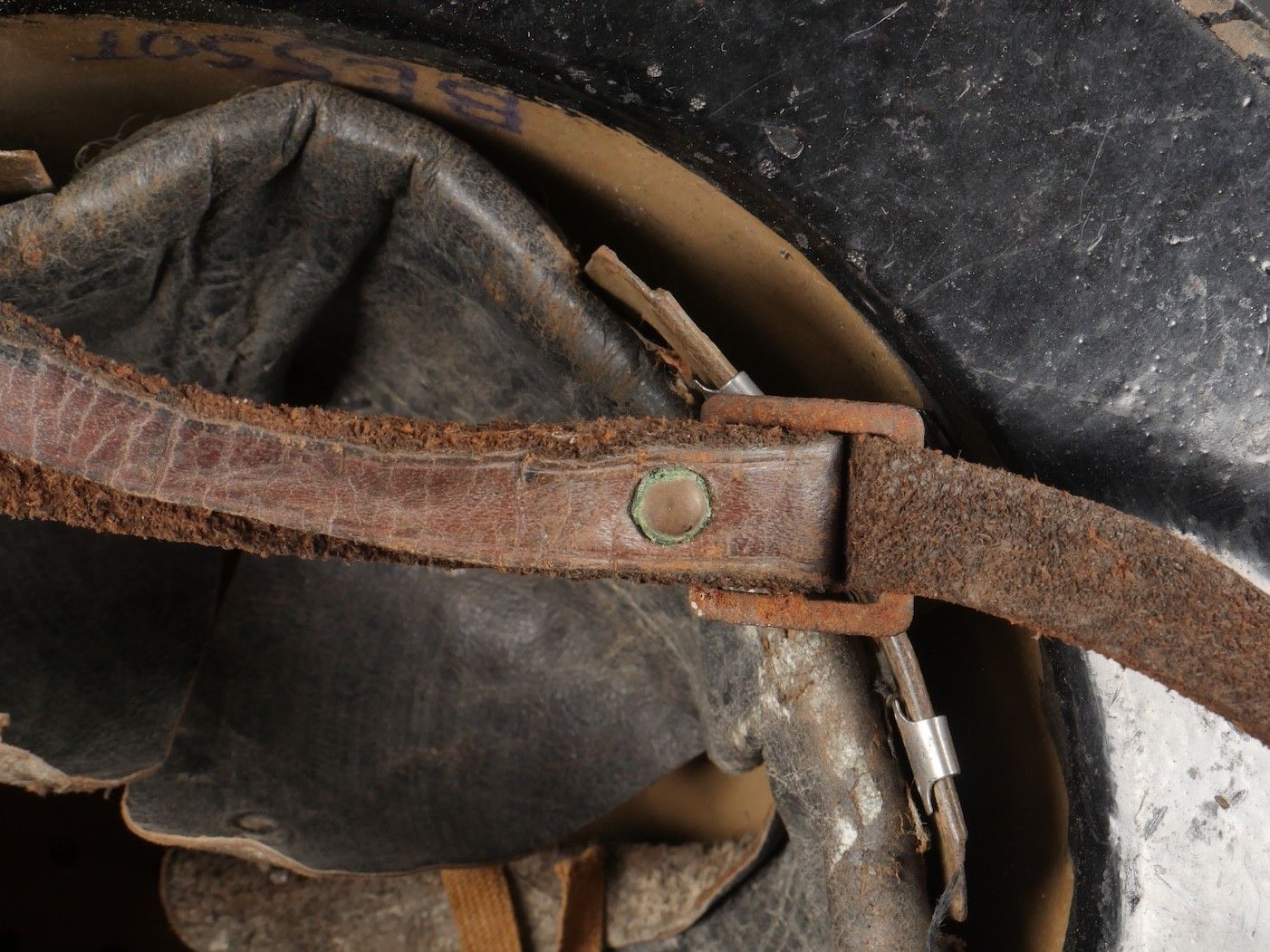 FFI helmet. 1926 Adrian helmet, factory issued in khaki paint and repainted black on liberation, FFI insignia painted black on front of helmet. Leather cap with six wolf's teeth, one of which is damaged and now has only six staples, size C stamp on the bottom of the bomb and the manufacturer Mamou in Marseille. Leather chinstrap present. The resistance fighter wrote his name inside, Bessot. FFI helmet. Model 1926 Adrian helmet factory painted khaki and repainted black at liberation, FFI badge painted in black on the front. Leather liner with six tongues, one damaged, retaining only six clips, size stamp C at the crown and maker Mamou Marseille. Leather chinstrap present. The resister wrote his name inside Bessot.