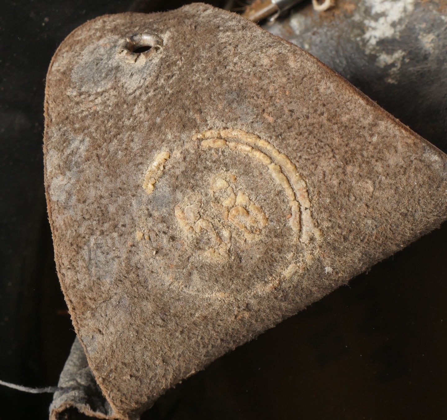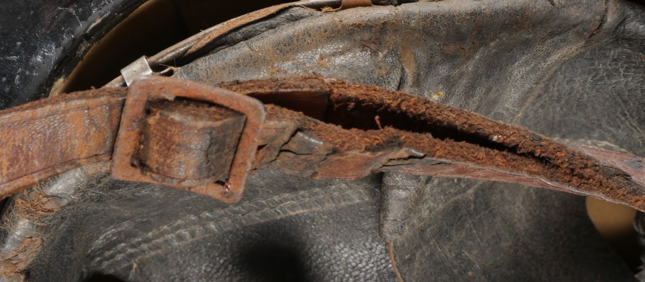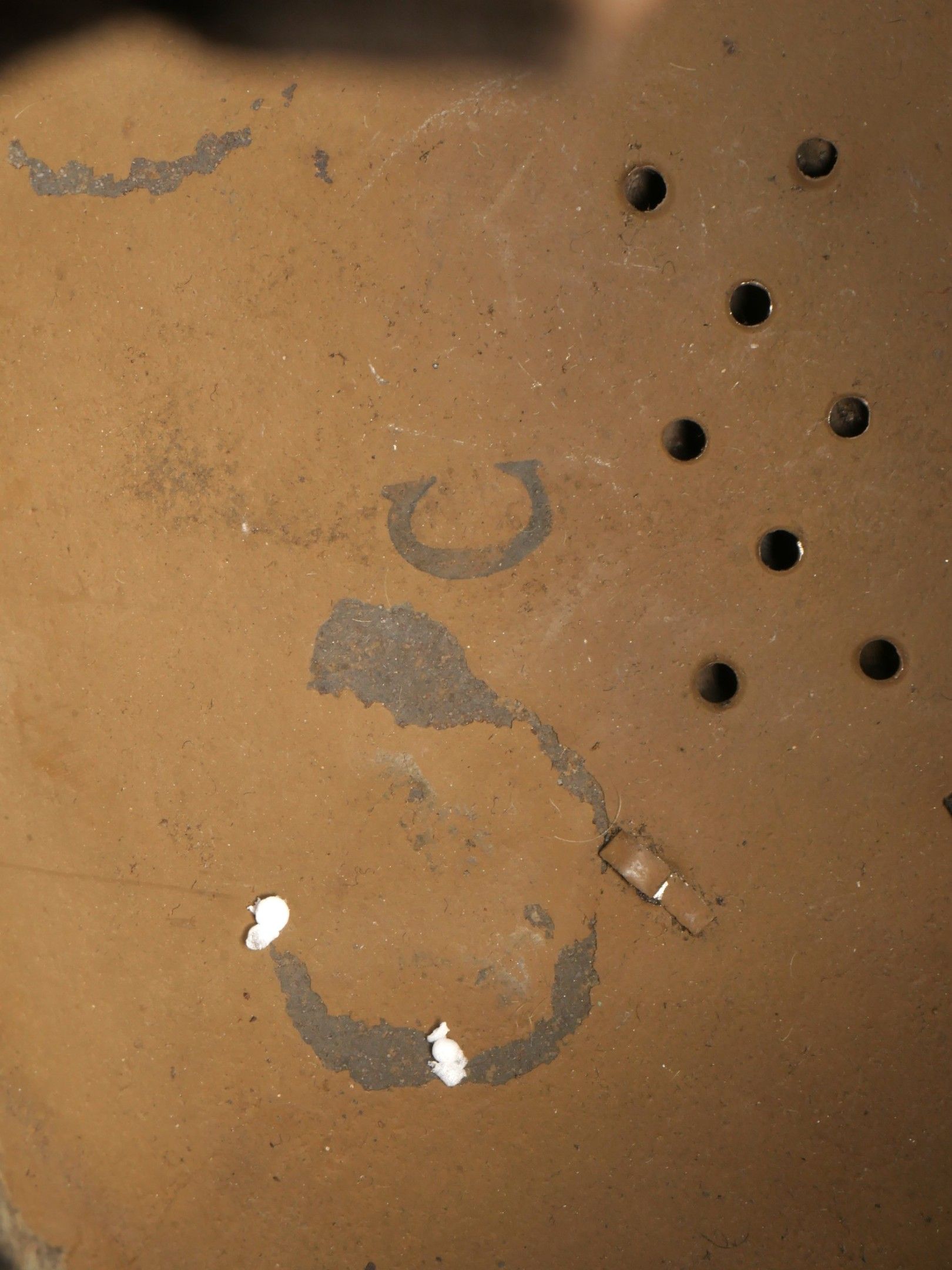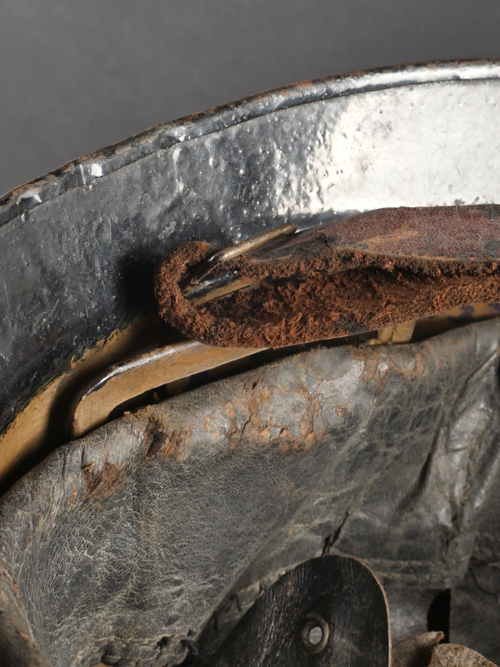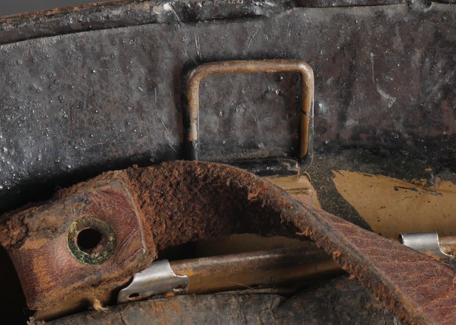 FFI helmet. 1926 Adrian helmet, factory issued in khaki paint and repainted black on liberation, FFI insignia painted black on front of helmet. Leather cap with six wolf's teeth, one of which is damaged and now has only six staples, size C stamp on the bottom of the bomb and the manufacturer Mamou in Marseille. Leather chinstrap present. The resistance fighter wrote his name inside, Bessot. FFI helmet. Model 1926 Adrian helmet factory painted khaki and repainted black at liberation, FFI badge painted in black on the front. Leather liner with six tongues, one damaged, retaining only six clips, size stamp C at the crown and maker Mamou Marseille. Leather chinstrap present. The resister wrote his name inside Bessot.