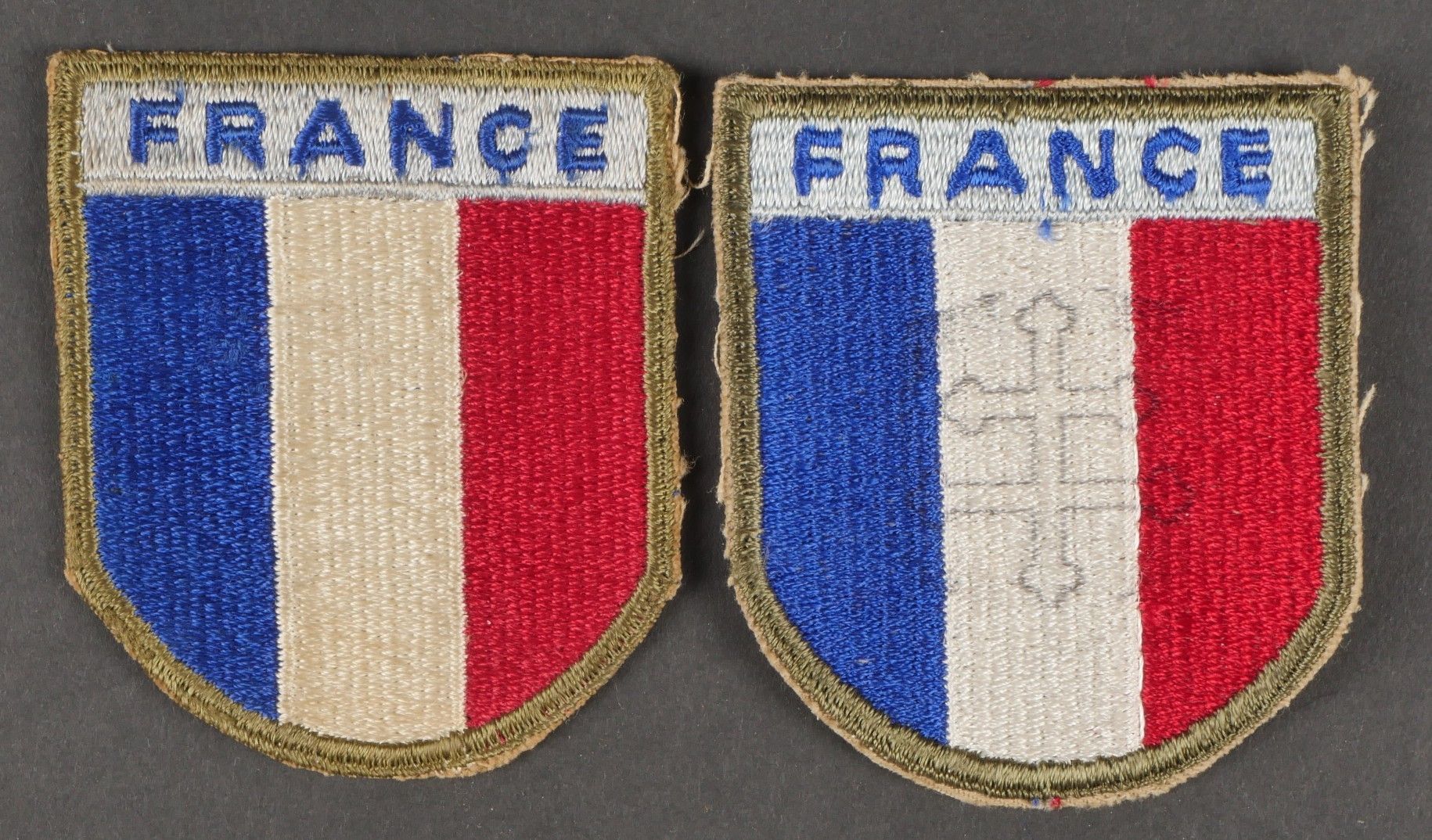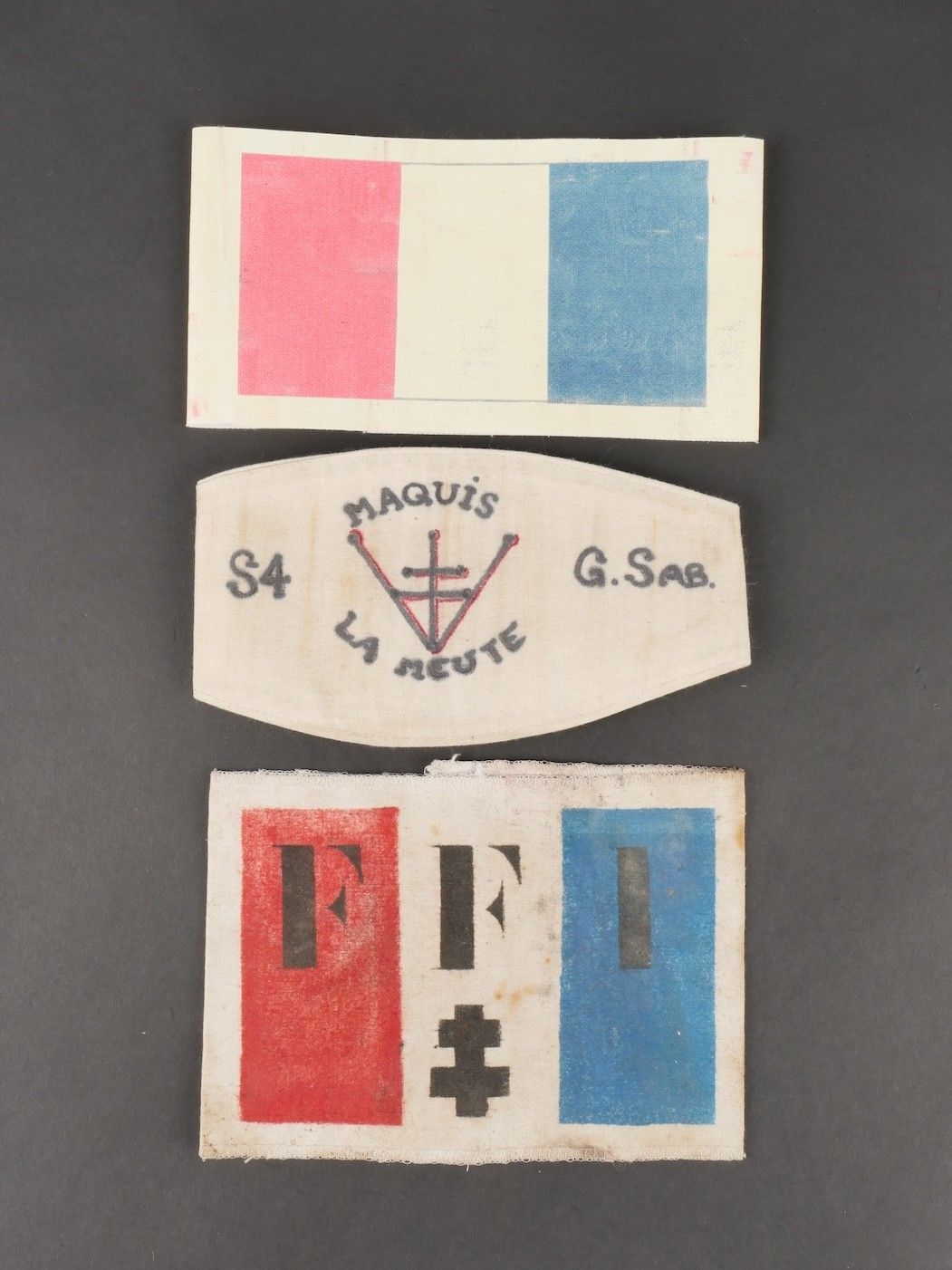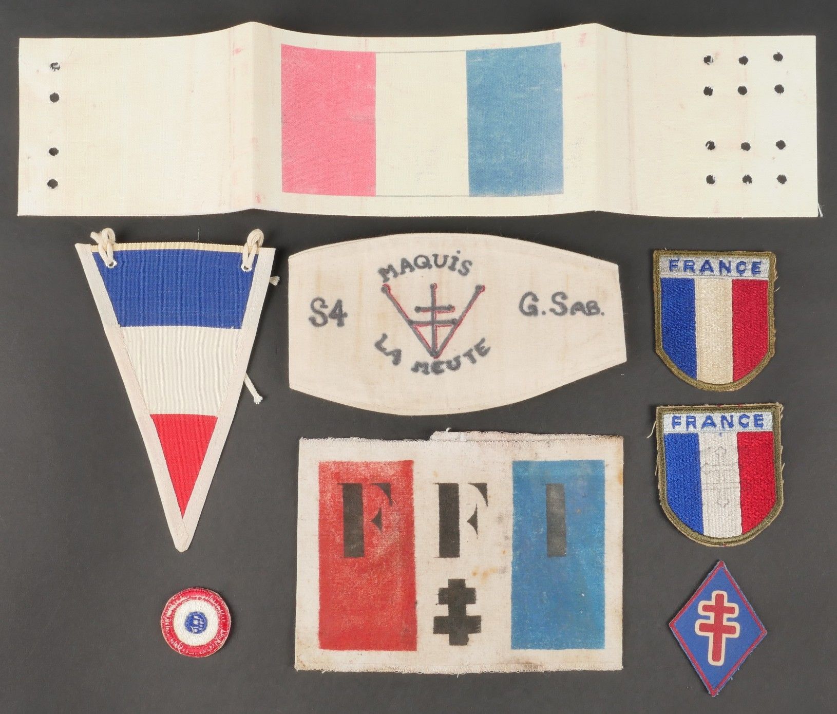 Lot of badges and armbands. Comprising two France badges, an American-made cockade, a later painted DFL badge, a tricolour liberation army pennant, a reproduction of an invasion armband with tricolour flag, a later tricolour FFI armband and a health service armband reused by an amicale du maquis de la Meute, section 4 G.Sab probably for a sabotage group, buckle missing. Lot of badges and armbands. Includes two France badges, American made cockade, a later DFL painted badge, a tricolor liberation pennant, a reproduction invasion armband with tricolor flag, a later tricolor FFI armband and a medical service armband reused by a Maquis veterans group of La Meute section 4 G Sab probably for a sabotage group, buckle missing.