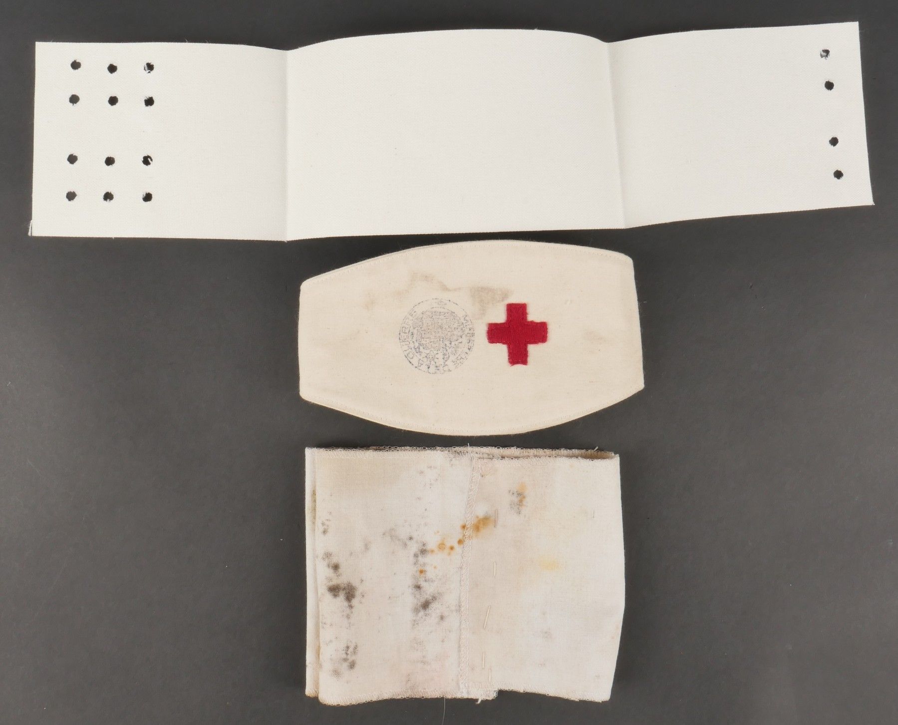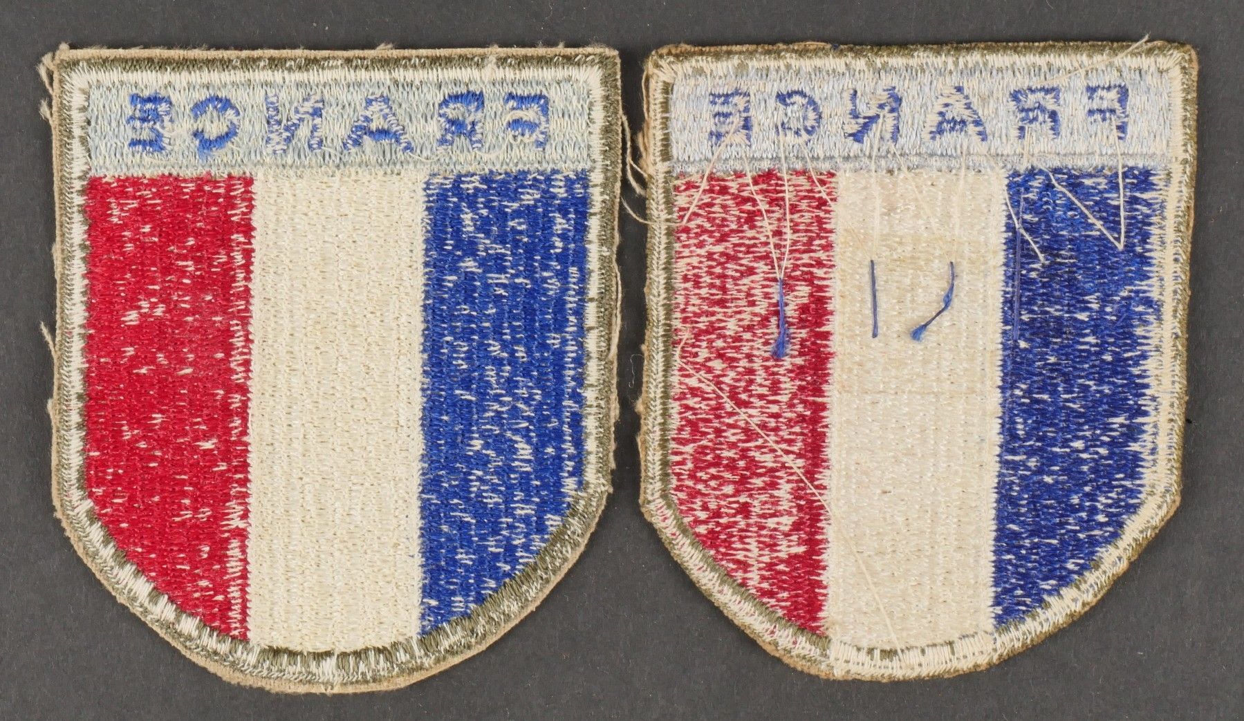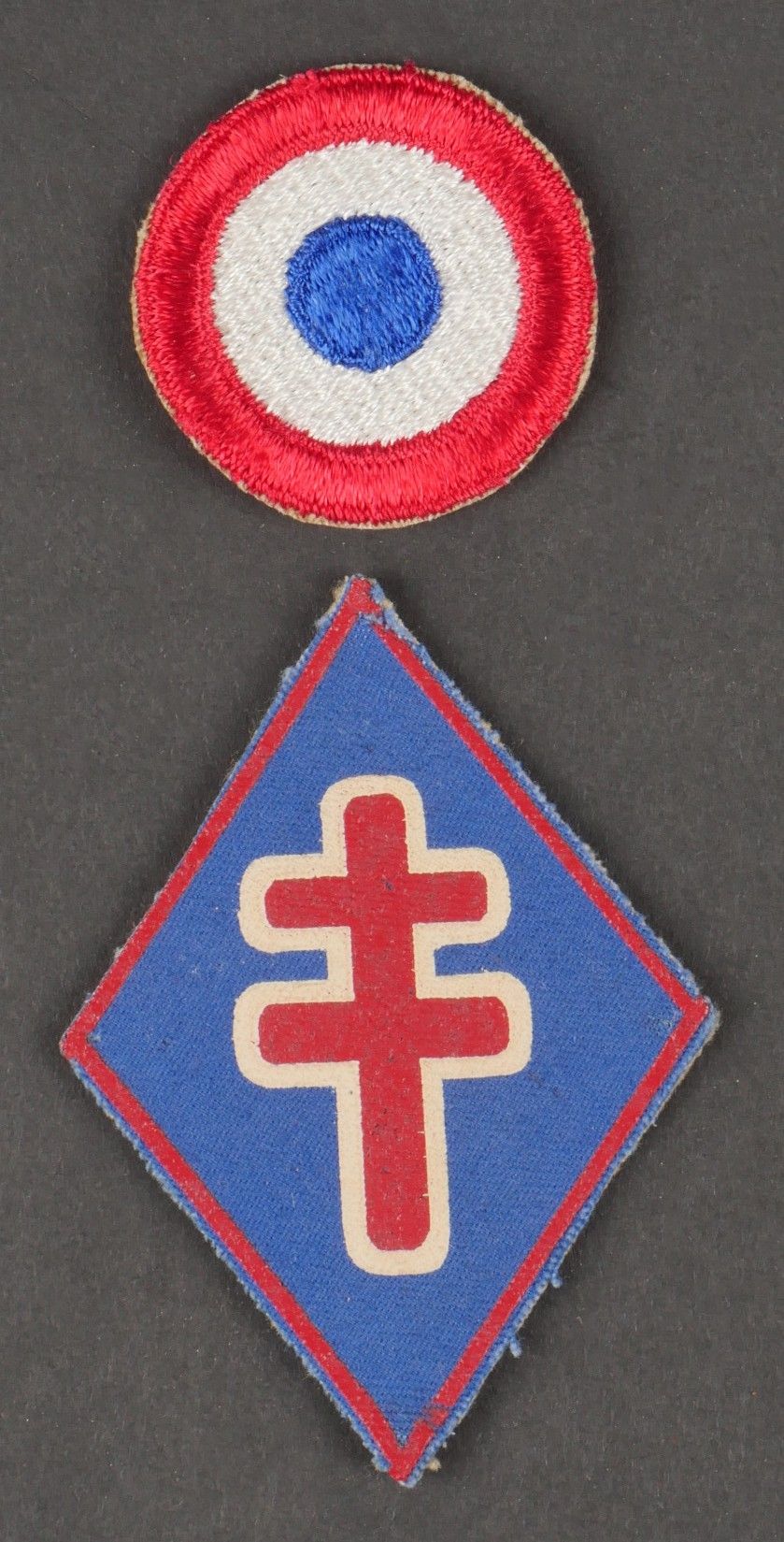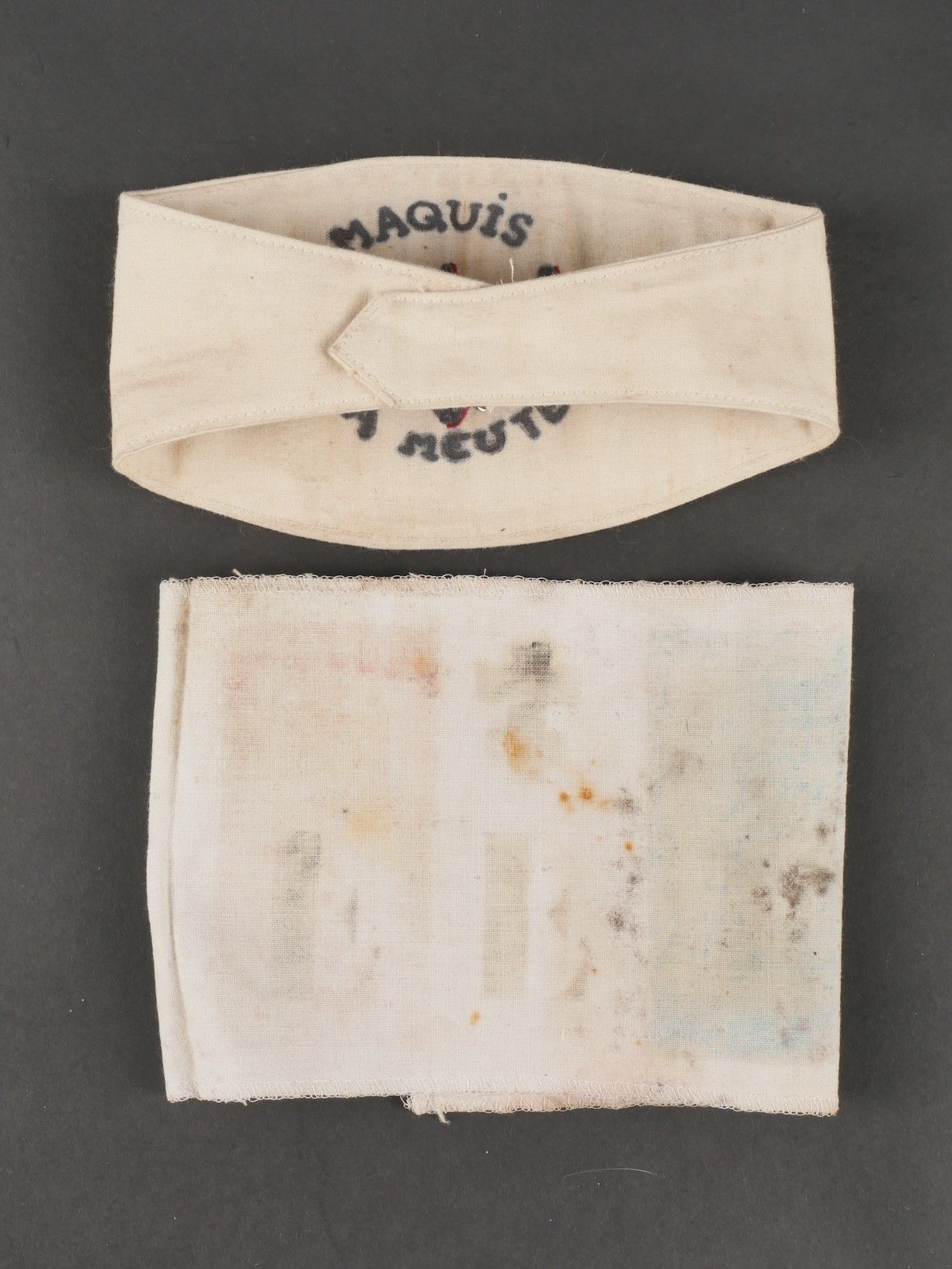 Lot of badges and armbands. Comprising two France badges, an American-made cockade, a later painted DFL badge, a tricolour liberation army pennant, a reproduction of an invasion armband with tricolour flag, a later tricolour FFI armband and a health service armband reused by an amicale du maquis de la Meute, section 4 G.Sab probably for a sabotage group, buckle missing. Lot of badges and armbands. Includes two France badges, American made cockade, a later DFL painted badge, a tricolor liberation pennant, a reproduction invasion armband with tricolor flag, a later tricolor FFI armband and a medical service armband reused by a Maquis veterans group of La Meute section 4 G Sab probably for a sabotage group, buckle missing.