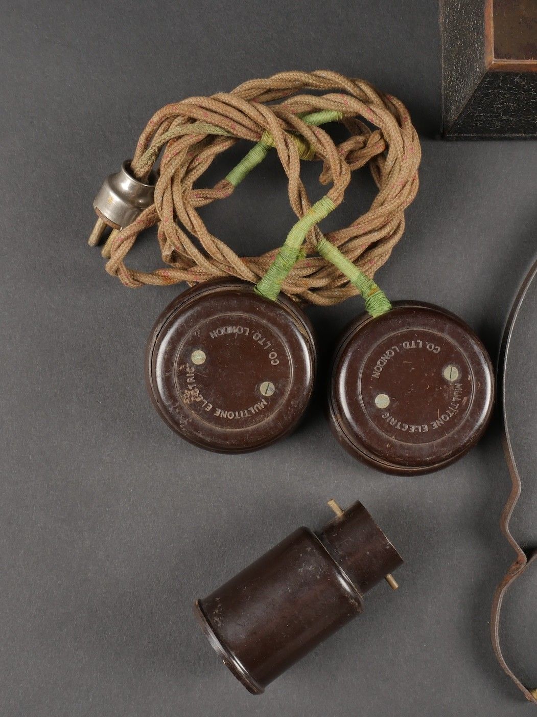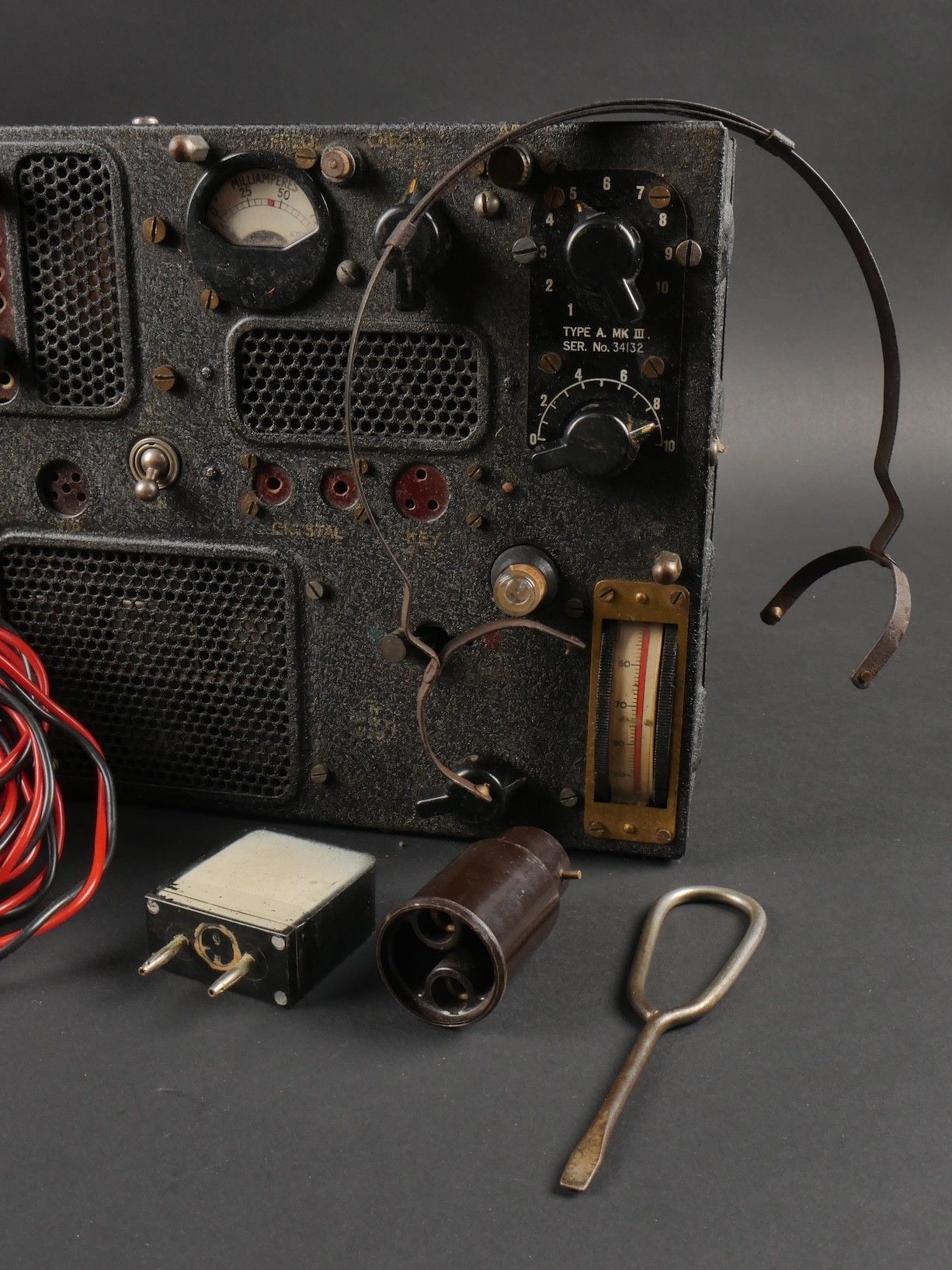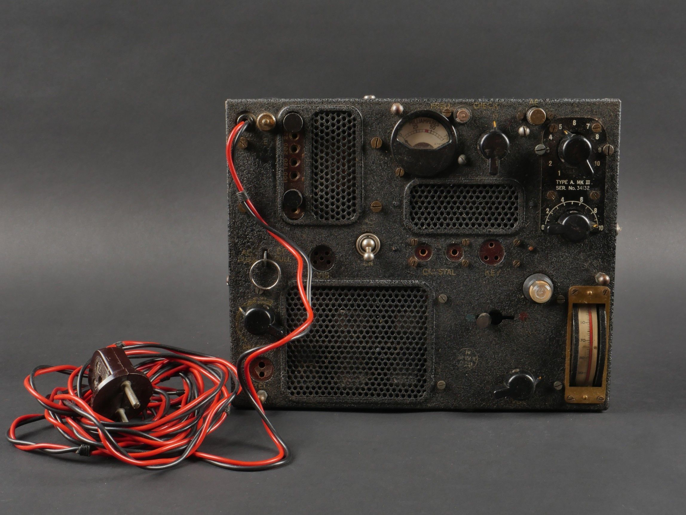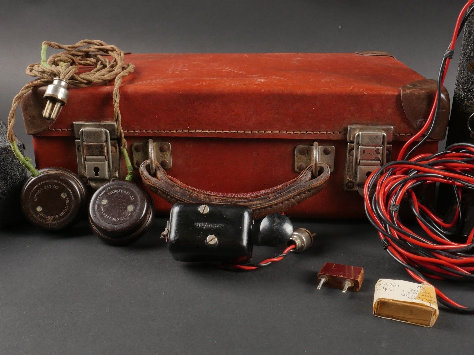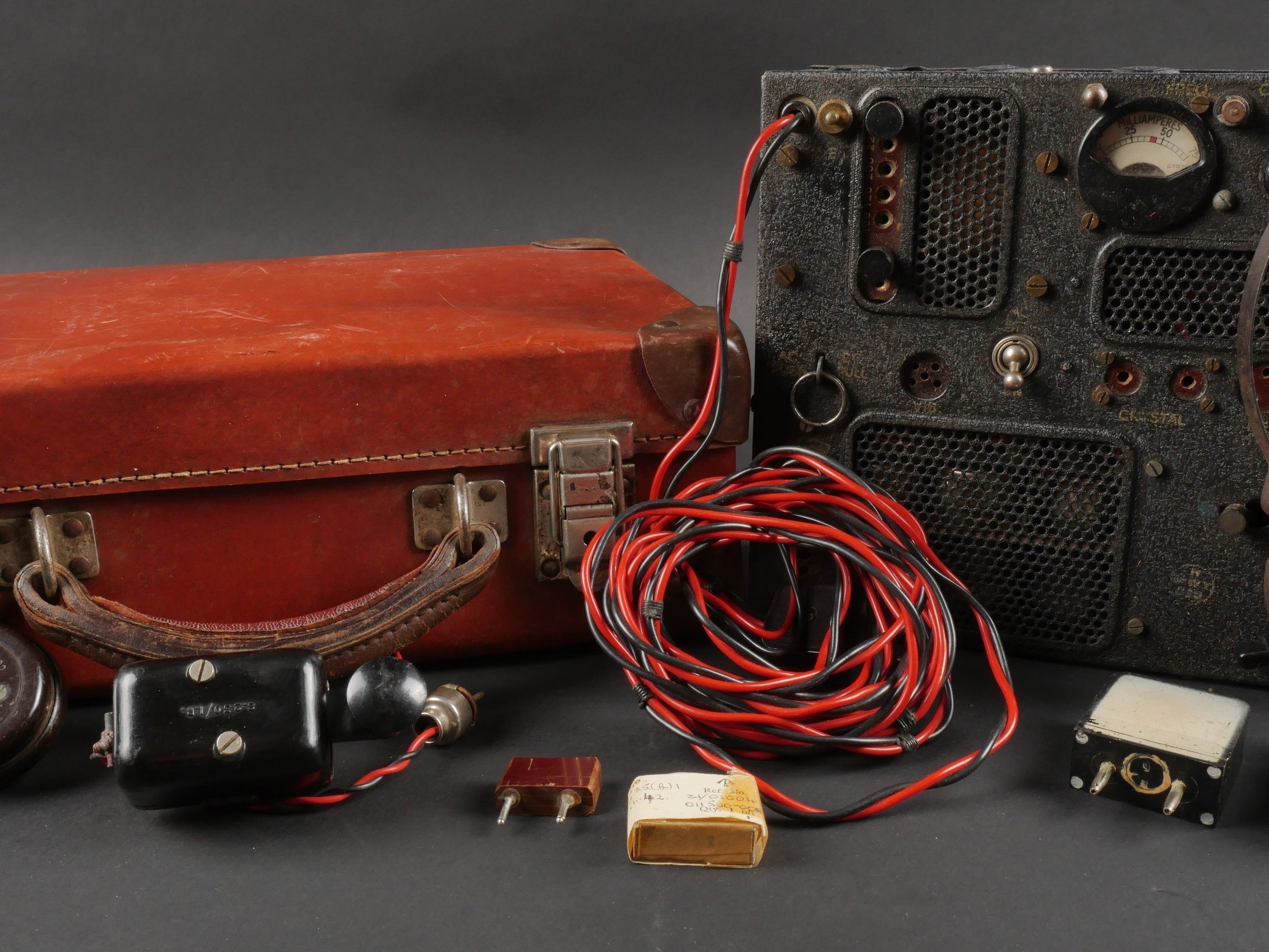 Type A MkIII radio case. The last of the Series 1 sets, it was also the first single-block version, designed in early 1944 by SOE, and was the most compact and lightest. The accessory box, marked Spares, contains a bayonet socket, a small screwdriver, a Morse code device marked S 230IR on the bakelite, a small chip on the plunger, a Marconi cardboard box, a quartz crystal plate dated 1945 and a plug. Earphones with their Electric London multitone plug, cloth covered wire with its removable headband. Factory painted set with brass plate marked Type A MkIII, series N 34132. Functional buttons, electrical socket present. Radio in its regulation felt-lined case. Radio case type A MkIII. Last model of the Series 1 sets and the first monobloc version designed in early 1944 by the SOE, the most compact and lightest. The accessory box marked Spares contains a bayonet thief socket, a small screwdriver, a Morse key with bakelite marking S 230IR with a small chip on the plunger, plug present, a small Marconi cardboard box, a quartz crystal plate dated 1945 and a plug. Headphones with Multitone Electric London plug, fabricsheathed lead and removable headband. Set in factory paint with brass plate marked Type A MkIII serial N 34132. Knobs functional, power plug present. Radio in its regulation case lined with felt.