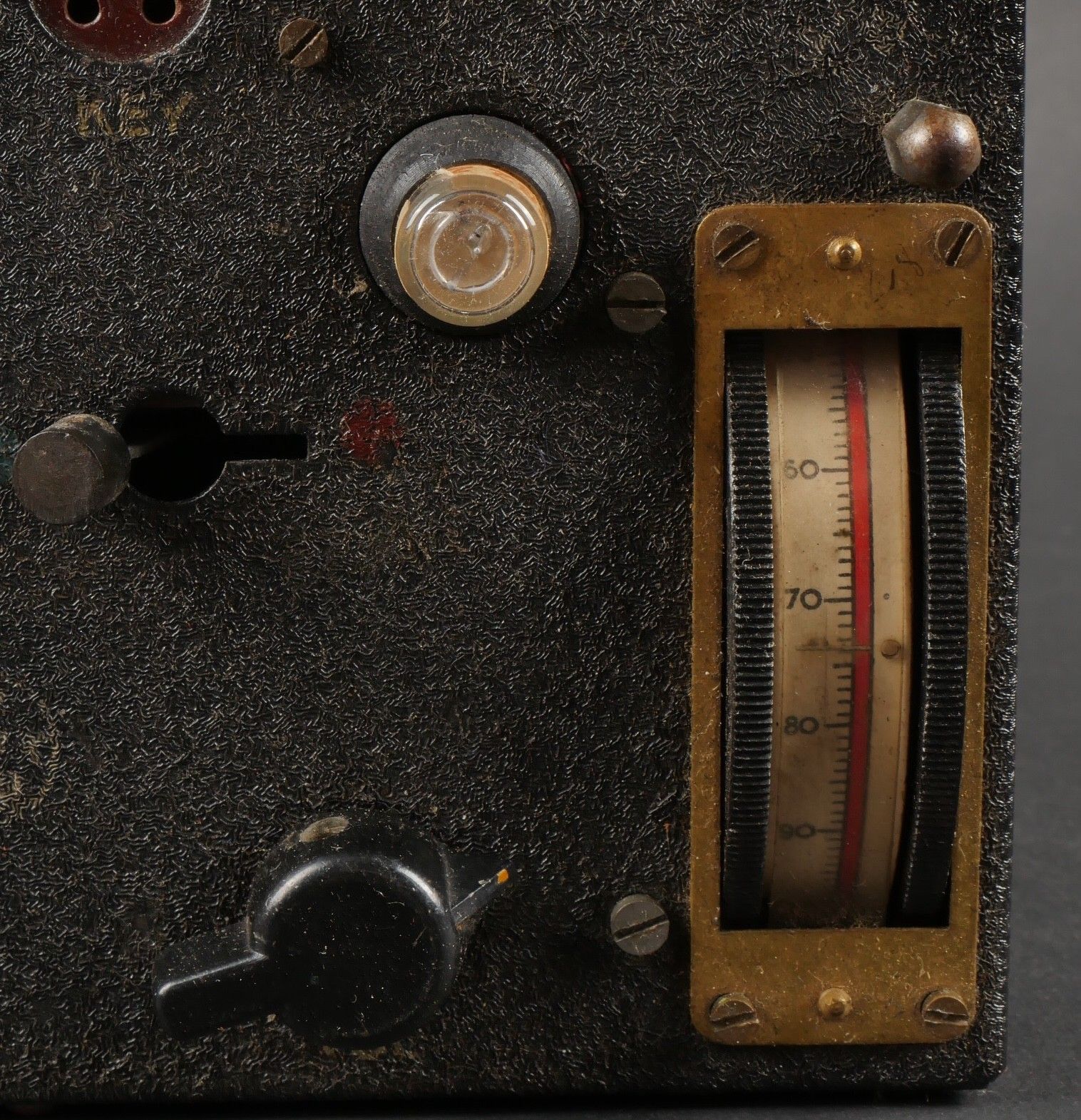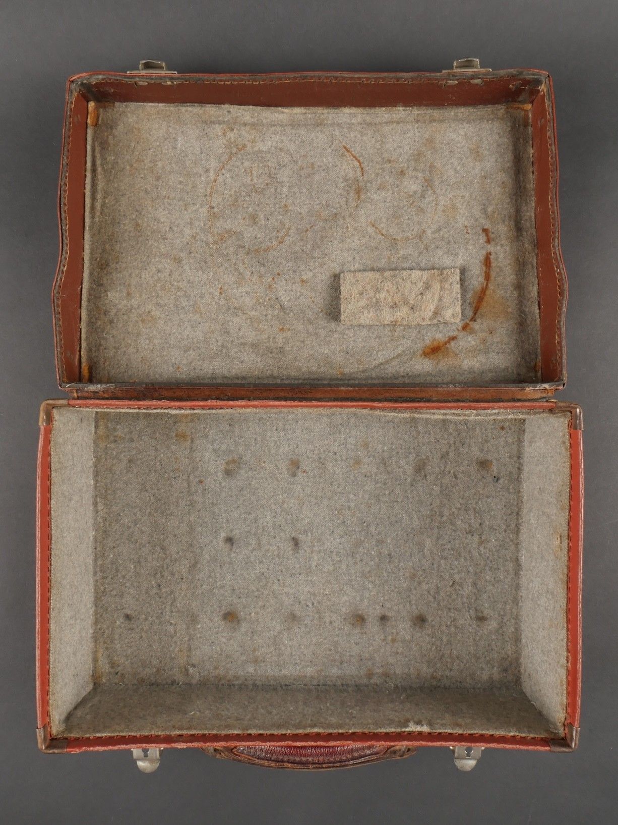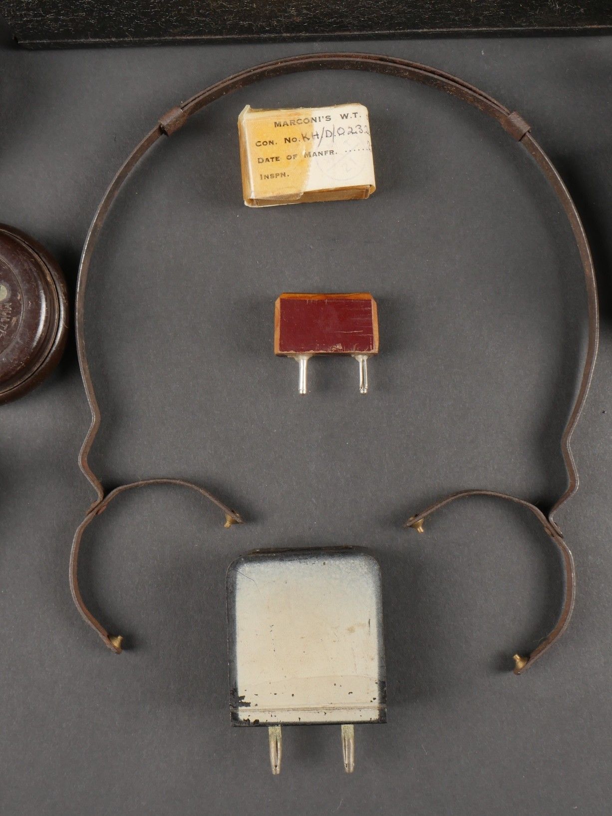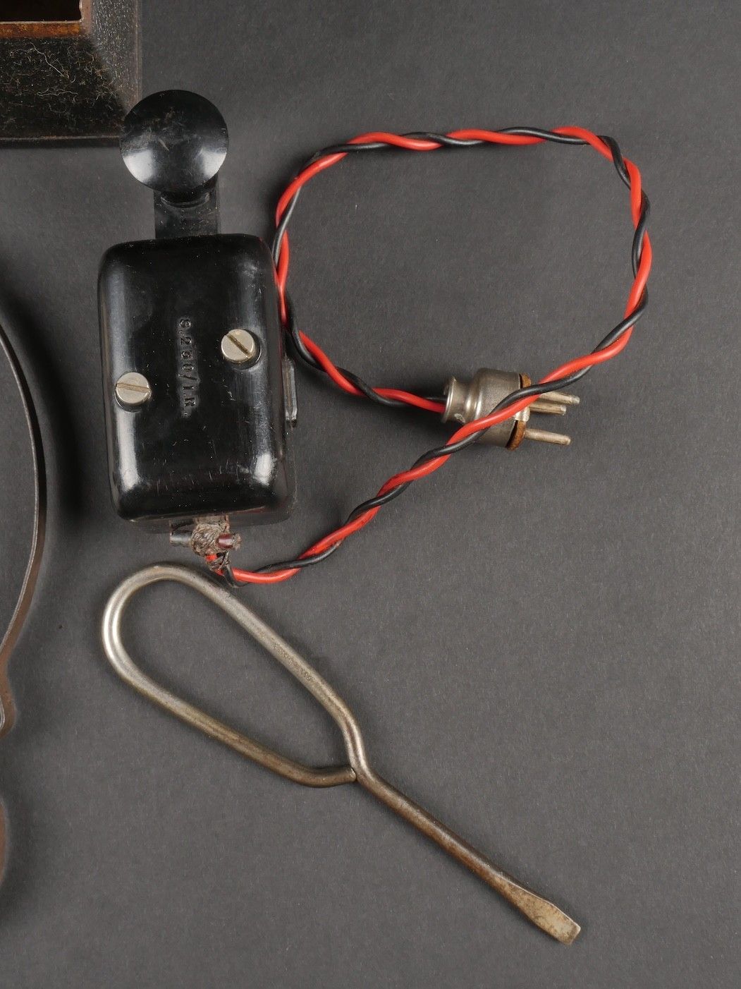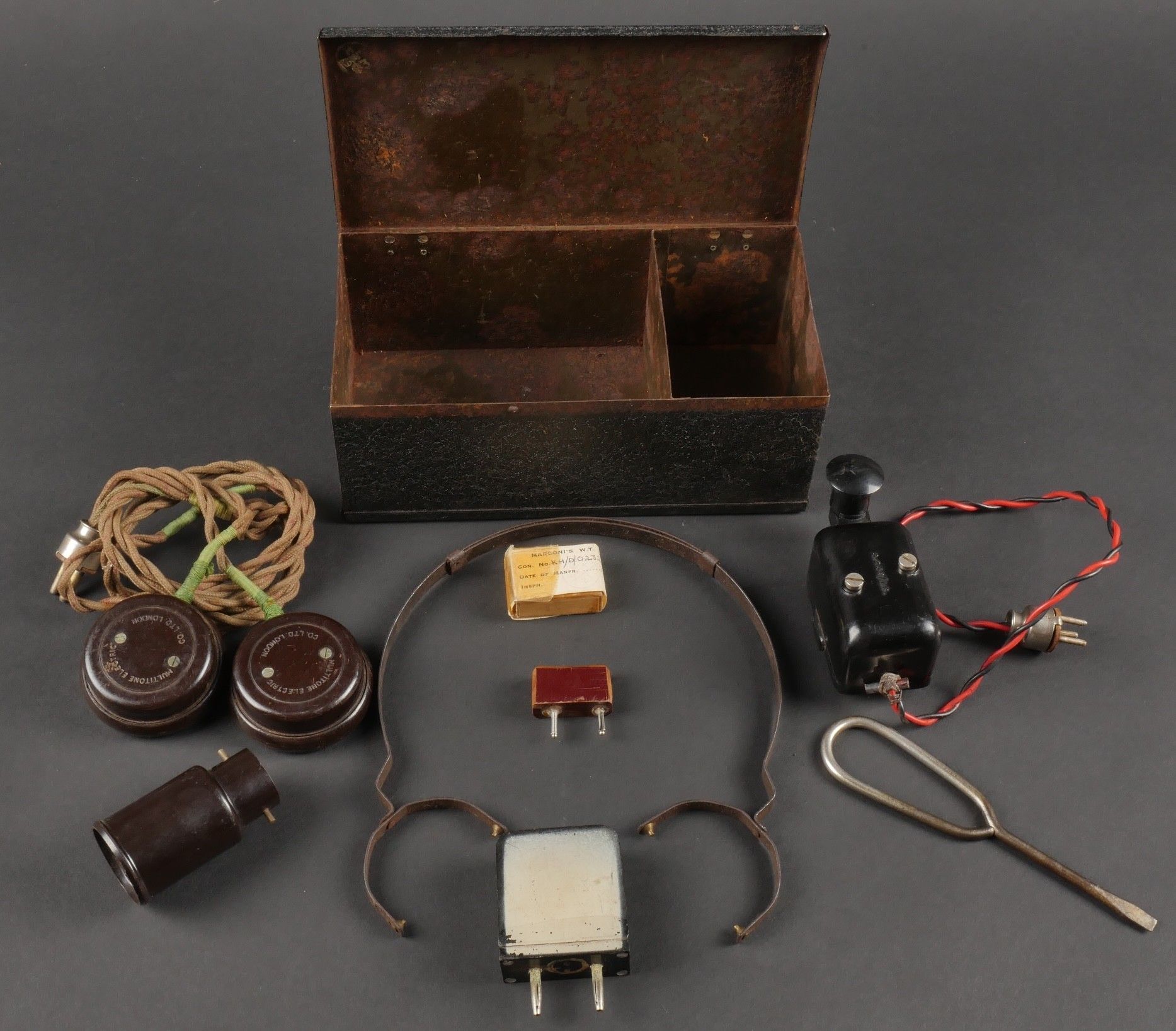 Type A MkIII radio case. The last of the Series 1 sets, it was also the first single-block version, designed in early 1944 by SOE, and was the most compact and lightest. The accessory box, marked Spares, contains a bayonet socket, a small screwdriver, a Morse code device marked S 230IR on the bakelite, a small chip on the plunger, a Marconi cardboard box, a quartz crystal plate dated 1945 and a plug. Earphones with their Electric London multitone plug, cloth covered wire with its removable headband. Factory painted set with brass plate marked Type A MkIII, series N 34132. Functional buttons, electrical socket present. Radio in its regulation felt-lined case. Radio case type A MkIII. Last model of the Series 1 sets and the first monobloc version designed in early 1944 by the SOE, the most compact and lightest. The accessory box marked Spares contains a bayonet thief socket, a small screwdriver, a Morse key with bakelite marking S 230IR with a small chip on the plunger, plug present, a small Marconi cardboard box, a quartz crystal plate dated 1945 and a plug. Headphones with Multitone Electric London plug, fabricsheathed lead and removable headband. Set in factory paint with brass plate marked Type A MkIII serial N 34132. Knobs functional, power plug present. Radio in its regulation case lined with felt.