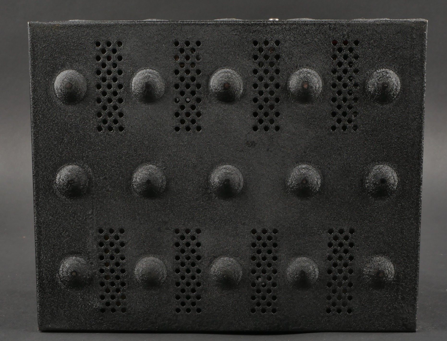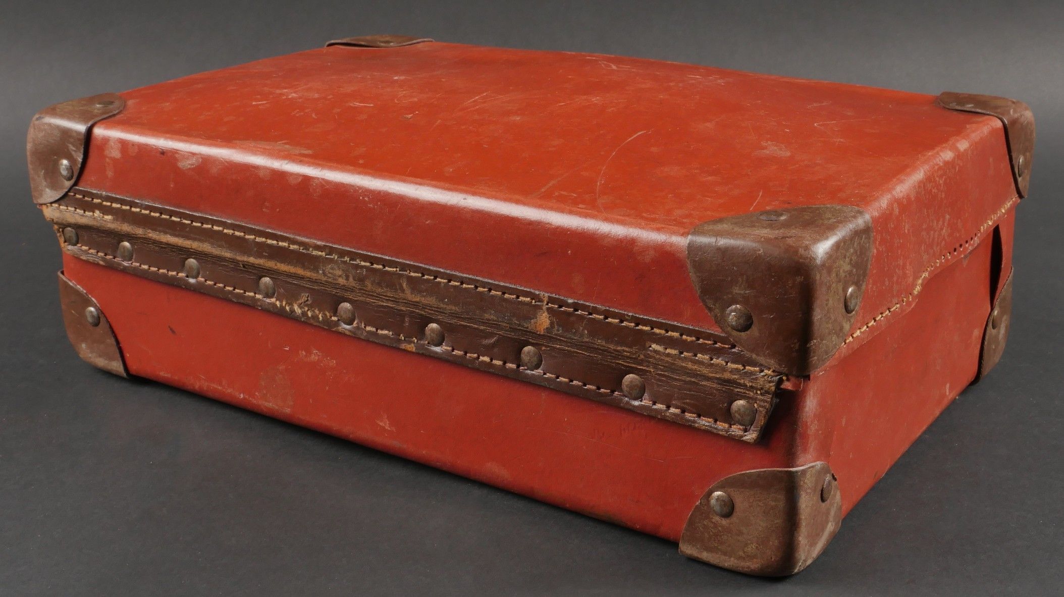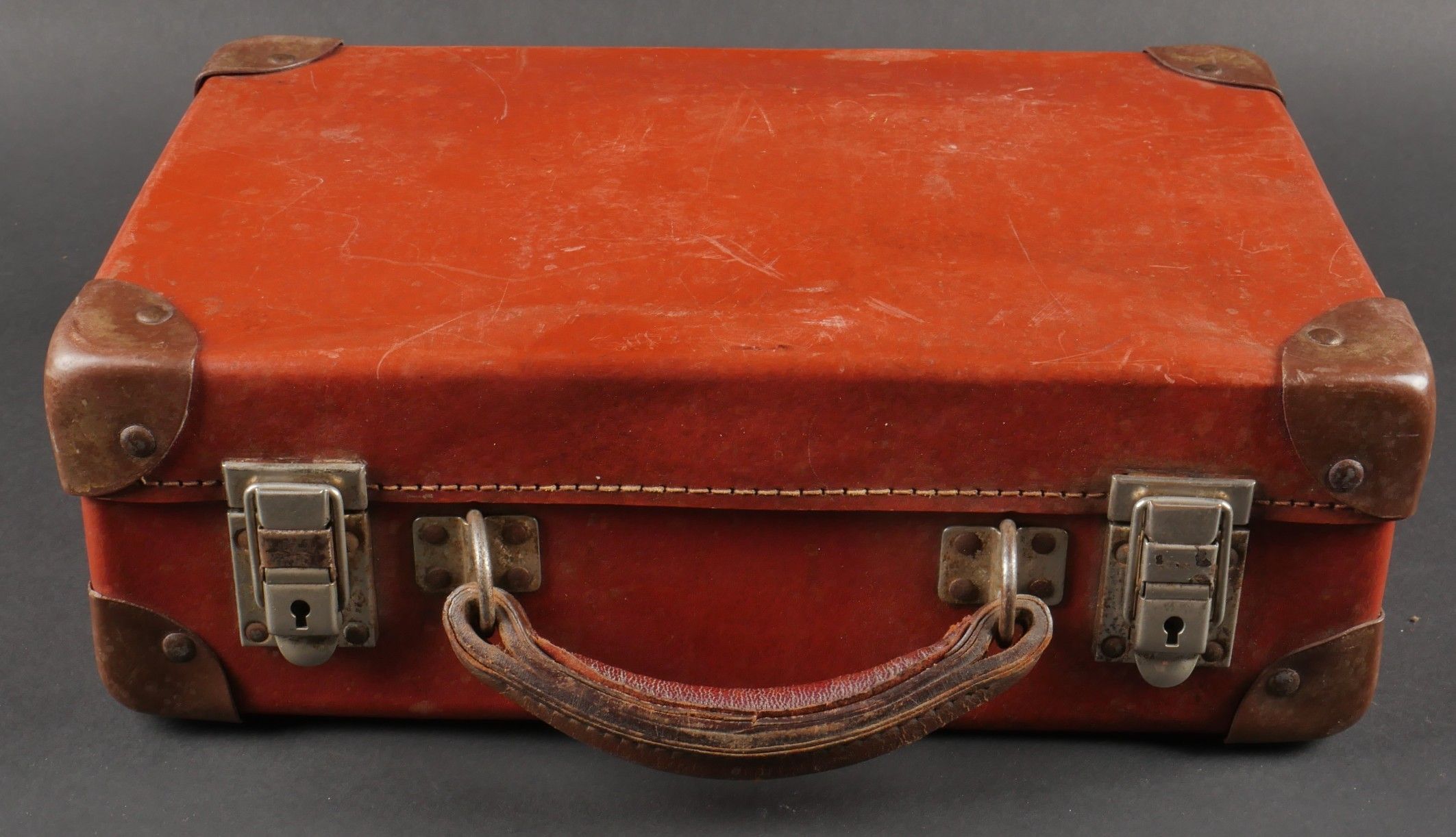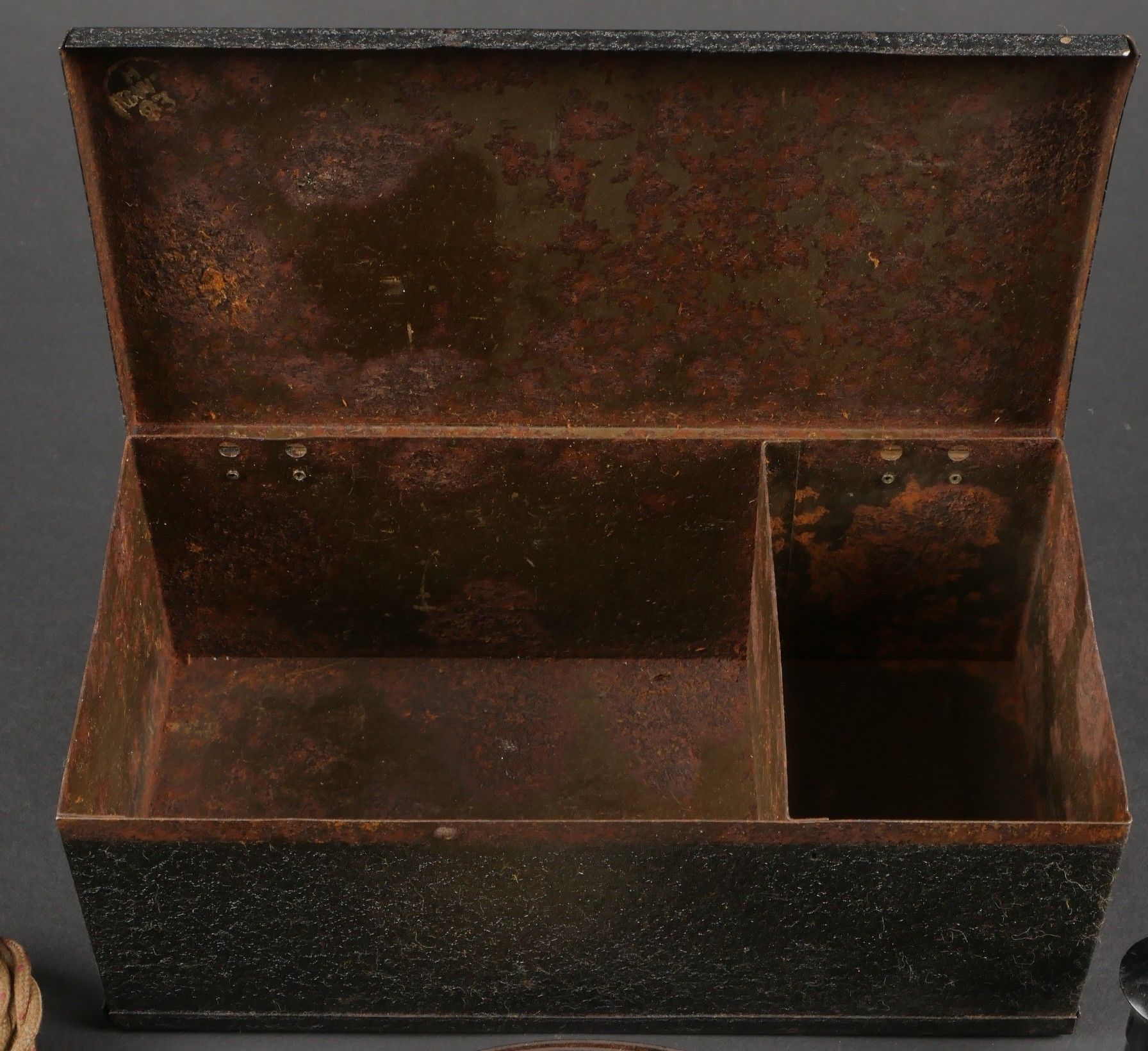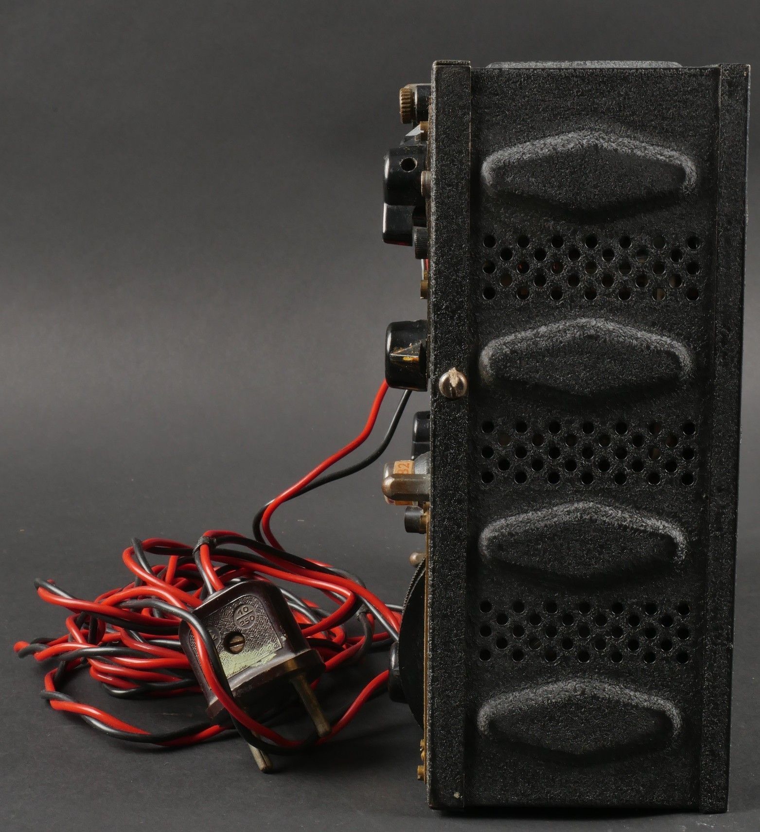Type A MkIII radio case. The last of the Series 1 sets, it was also the first single-block version, designed in early 1944 by SOE, and was the most compact and lightest. The accessory box, marked Spares, contains a bayonet socket, a small screwdriver, a Morse code device marked S 230IR on the bakelite, a small chip on the plunger, a Marconi cardboard box, a quartz crystal plate dated 1945 and a plug. Earphones with their Electric London multitone plug, cloth covered wire with its removable headband. Factory painted set with brass plate marked Type A MkIII, series N 34132. Functional buttons, electrical socket present. Radio in its regulation felt-lined case. Radio case type A MkIII. Last model of the Series 1 sets and the first monobloc version designed in early 1944 by the SOE, the most compact and lightest. The accessory box marked Spares contains a bayonet thief socket, a small screwdriver, a Morse key with bakelite marking S 230IR with a small chip on the plunger, plug present, a small Marconi cardboard box, a quartz crystal plate dated 1945 and a plug. Headphones with Multitone Electric London plug, fabricsheathed lead and removable headband. Set in factory paint with brass plate marked Type A MkIII serial N 34132. Knobs functional, power plug present. Radio in its regulation case lined with felt.