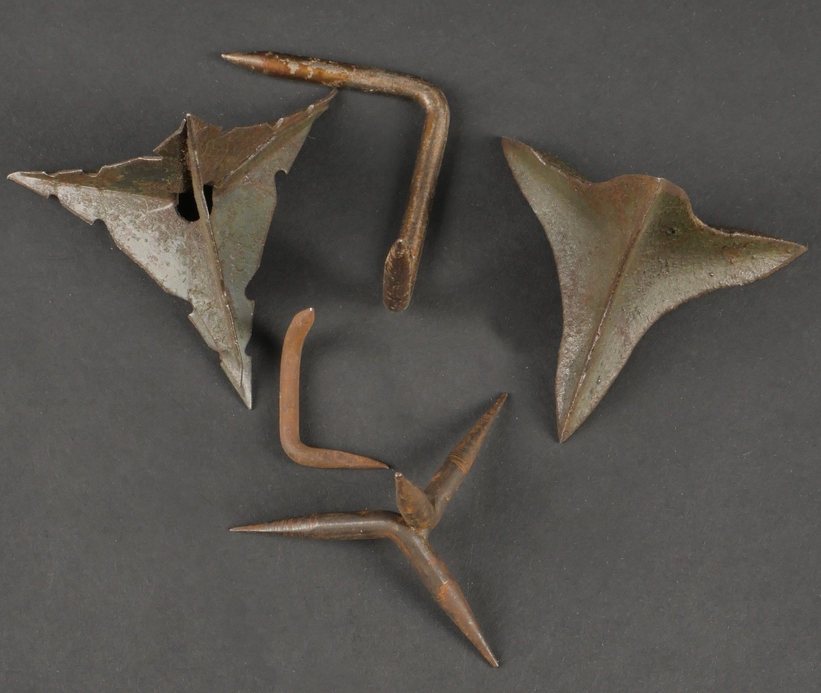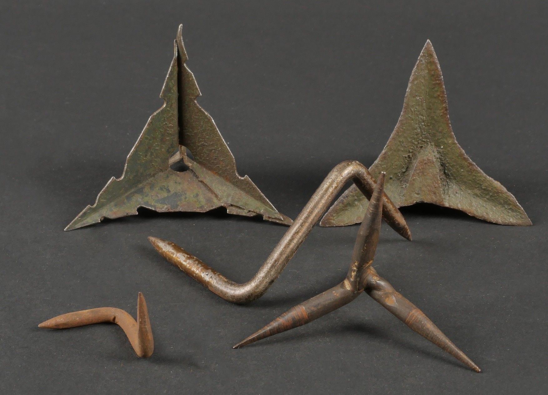 SOE tyre puncture. Comprising one American made Christmas tree tyre puncture, 67mm high. An American made tyre puncture in cast steel and painted in olive drap. A British-made four-point mechanical tyre puncture. Two simplified versions. SOE tire spikes. Includes a US made Christmas tree type tire spike height 67 mm. A US made cast steel spike painted olive drab. An English made mechanical four point spike. Two simplified versions.