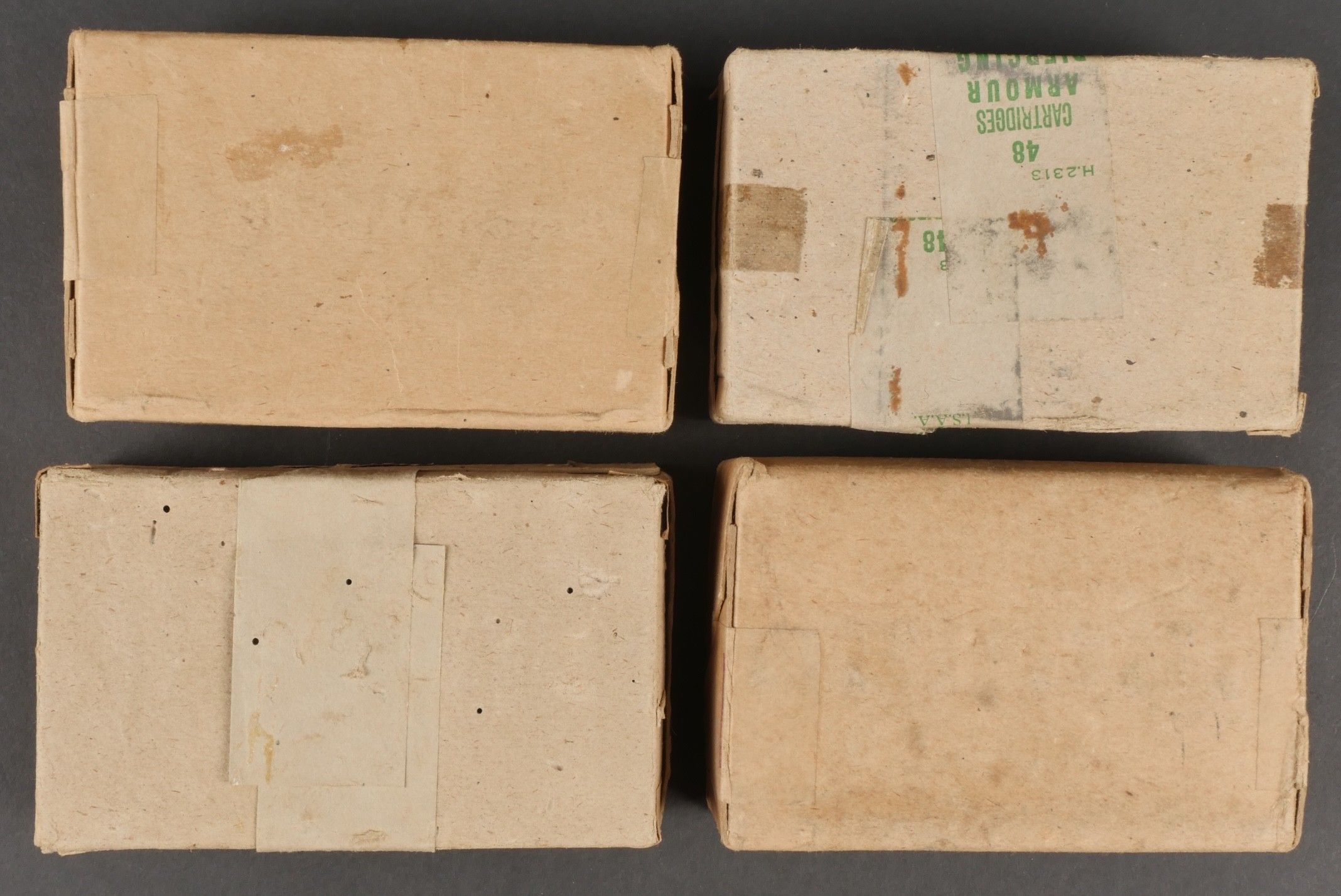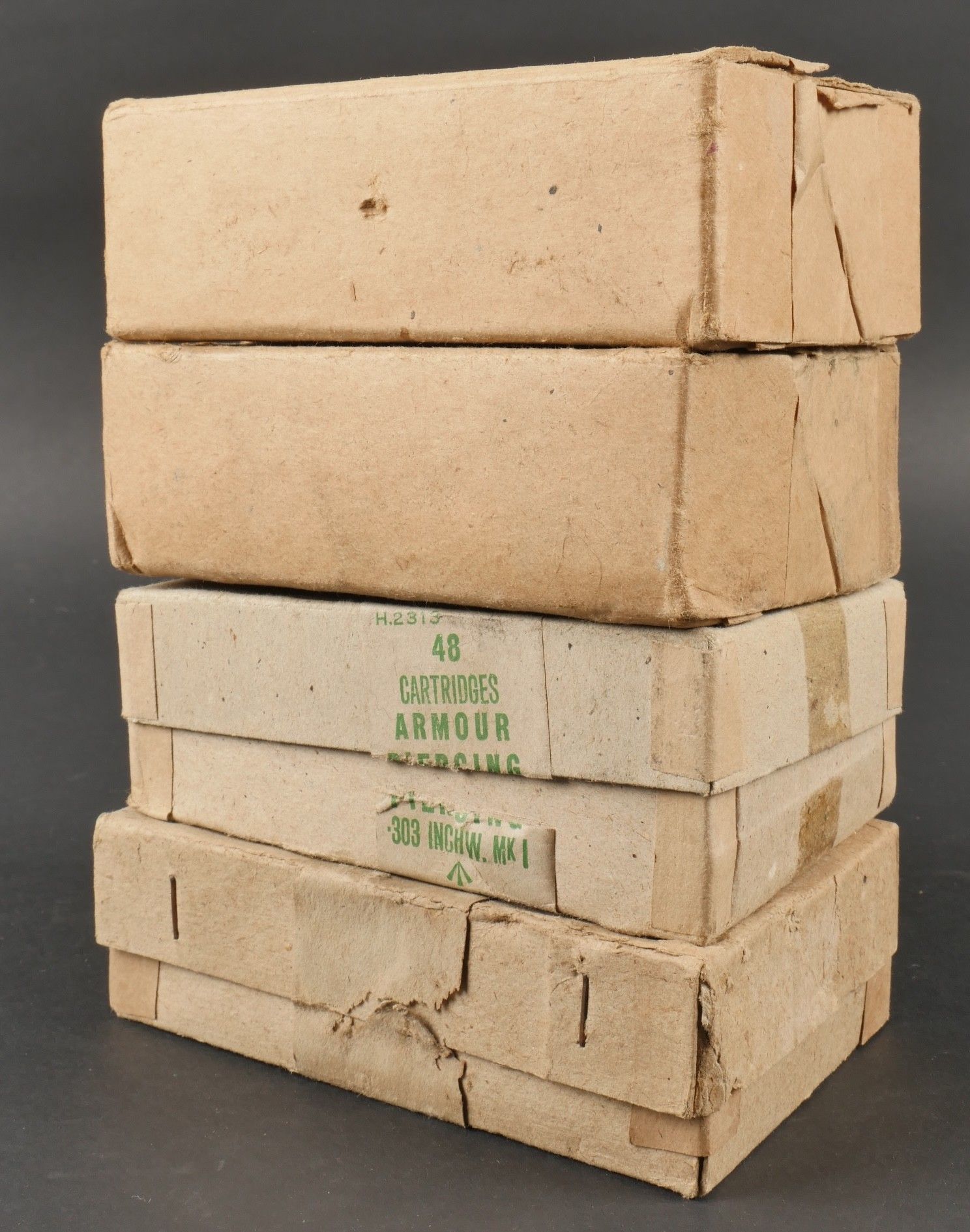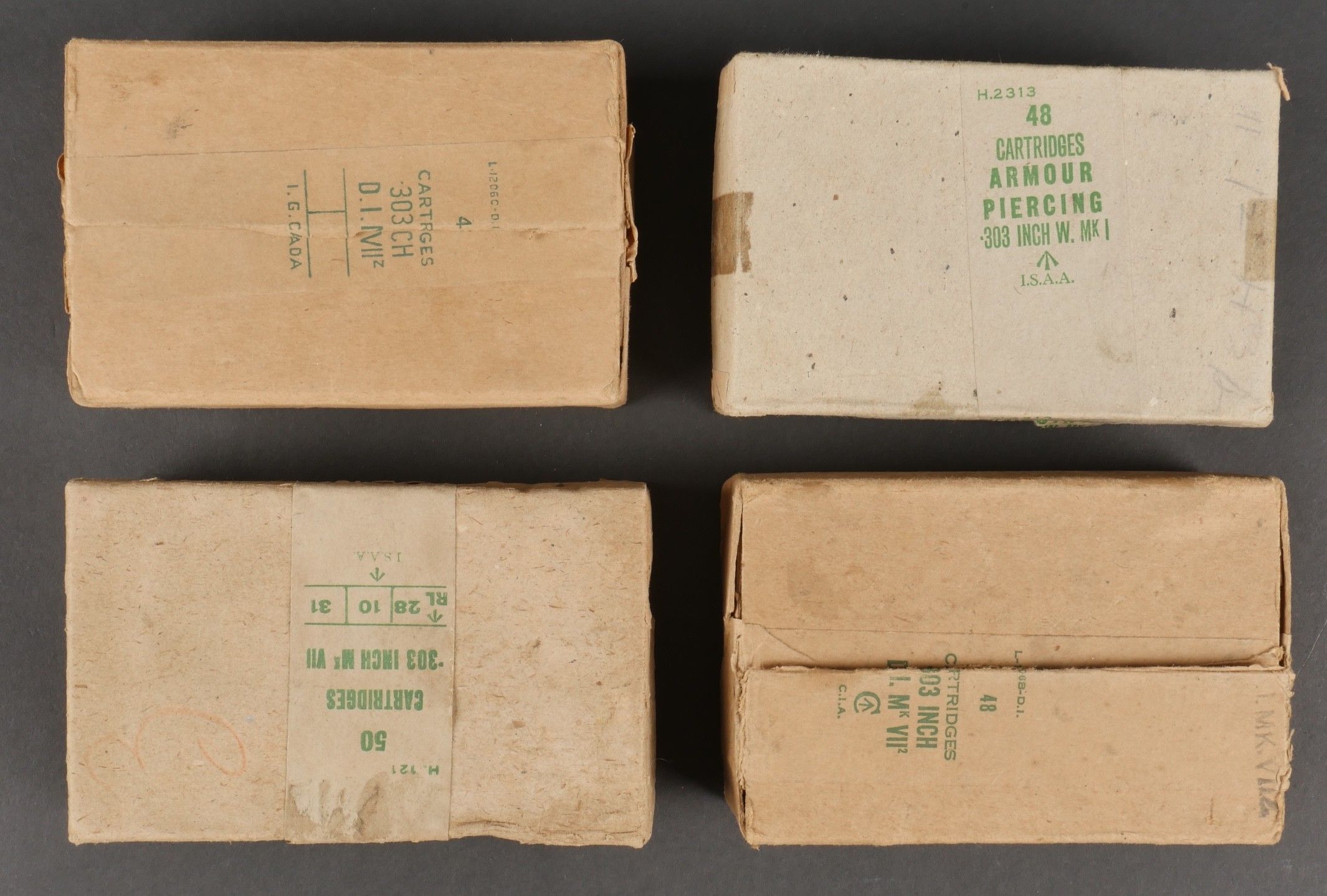 Empty parachute ammunition boxes. Comprising two boxes of Canadian 303's one of which still has its inner protective paper and stamped 1MK7. Two British made 303 boxes one for 48 rounds the other for 50 rounds, one still has its protective paper. Empty parachute drop ammunition boxes. Two Canadian 303 boxes one still with inner protective paper and ink stamp 1MK7. Two British 303 boxes one for 48 cartridges the other for 50 cartridges one still with protective sheets.