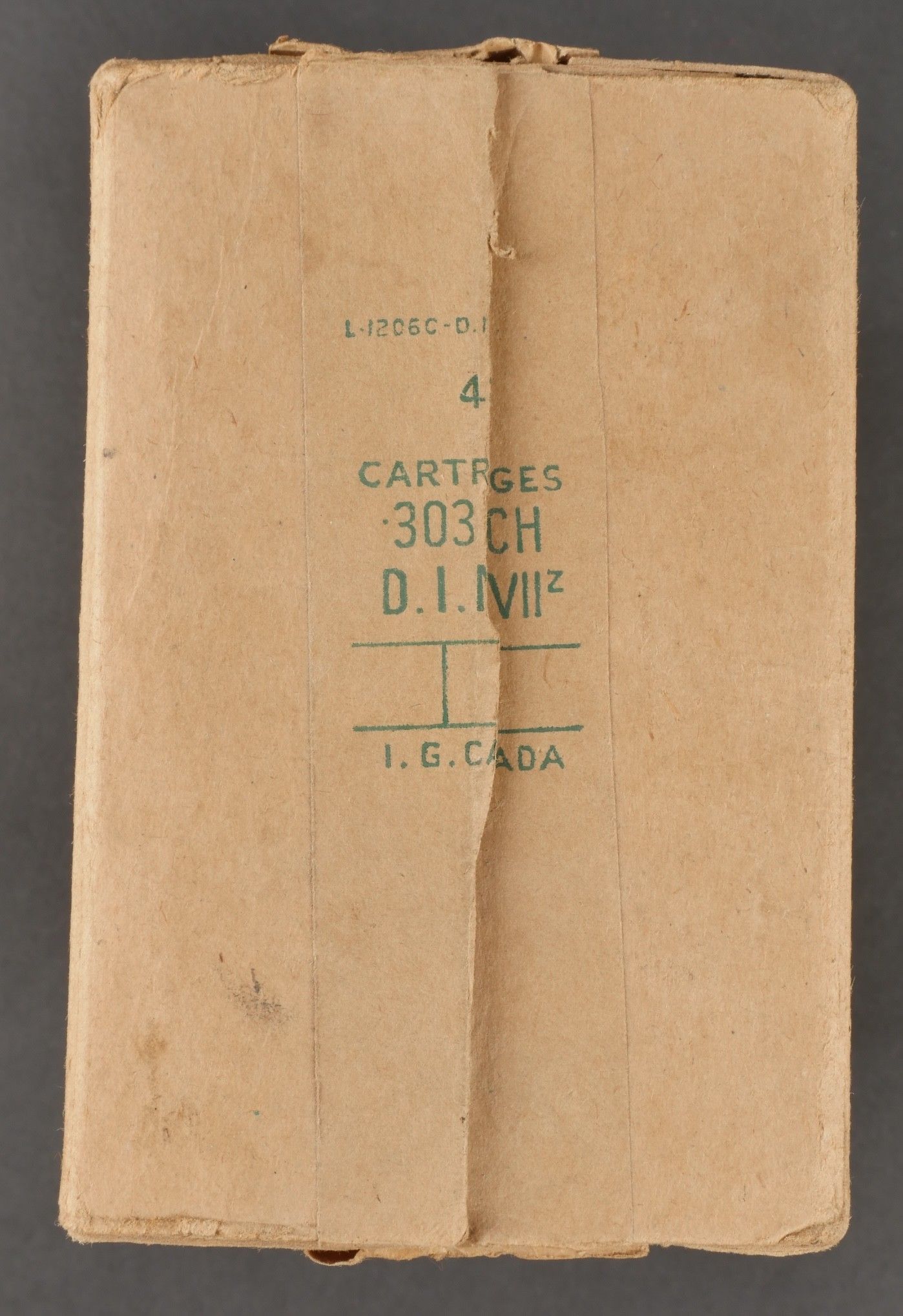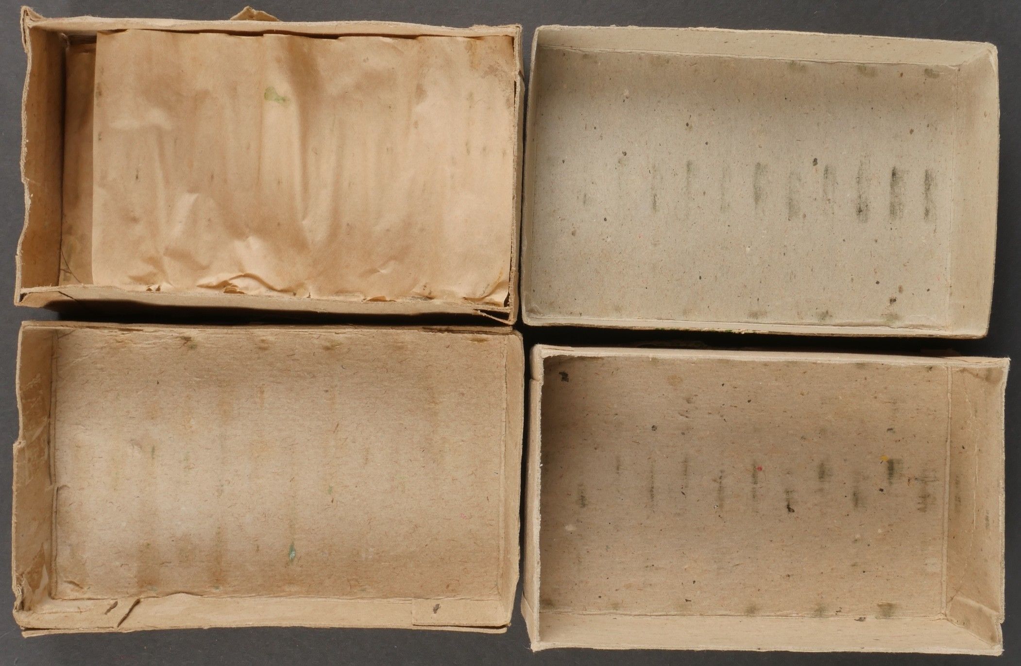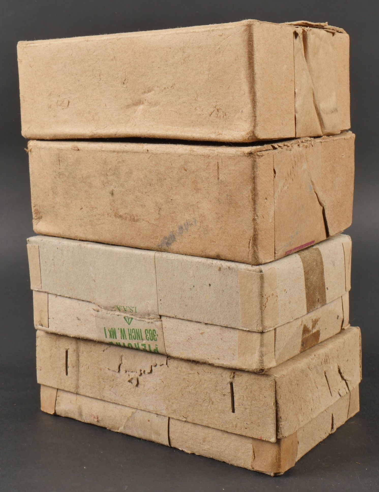 Empty parachute ammunition boxes. Comprising two boxes of Canadian 303's one of which still has its inner protective paper and stamped 1MK7. Two British made 303 boxes one for 48 rounds the other for 50 rounds, one still has its protective paper. Empty parachute drop ammunition boxes. Two Canadian 303 boxes one still with inner protective paper and ink stamp 1MK7. Two British 303 boxes one for 48 cartridges the other for 50 cartridges one still with protective sheets.