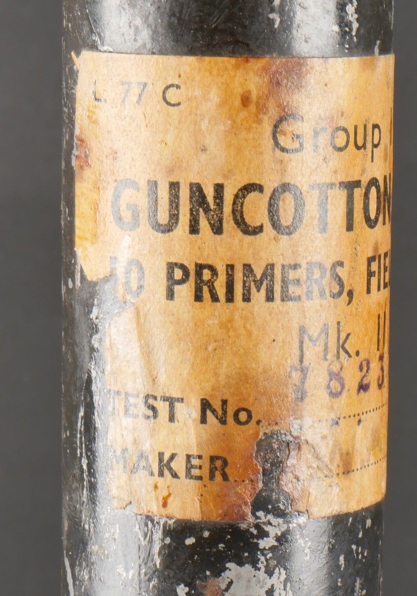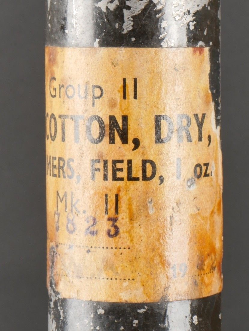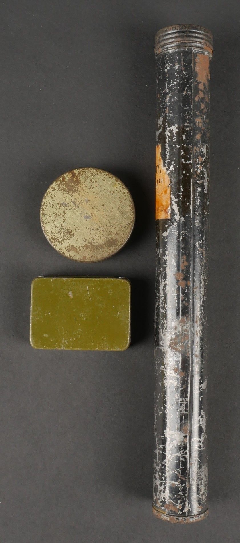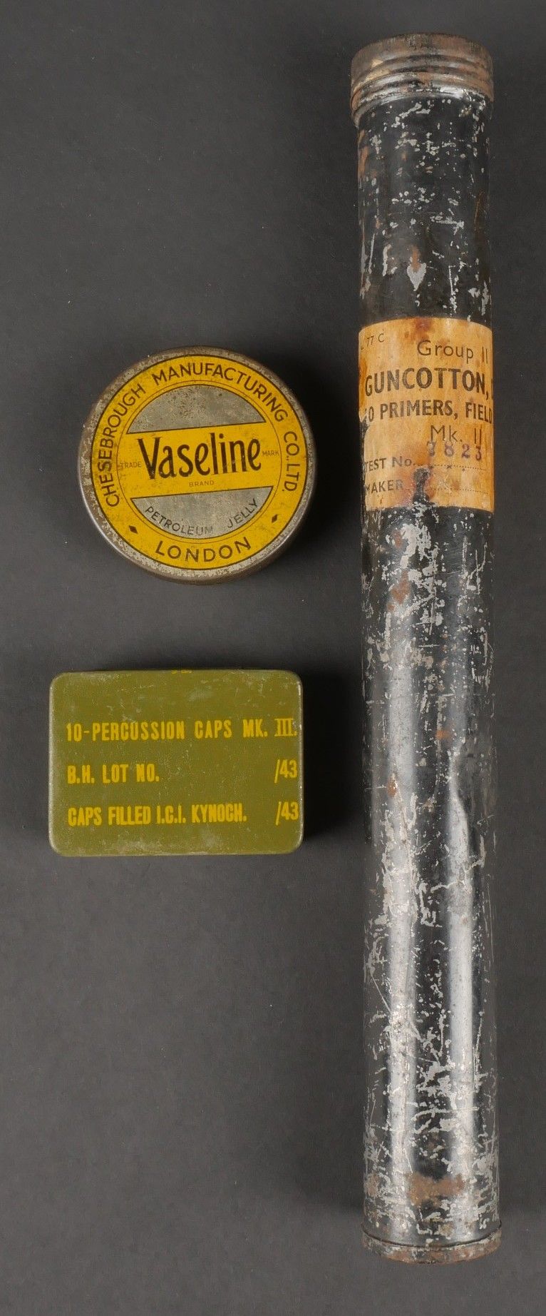 Primer charge tube. V1 tube in metal and original black paint, well marked on the bottom and with paper label reading Group 2 Guncotton Dry 10 Primers Field I oz, dated 1942. 10 MK3 percussion caps in metal box. Attached is a Vaseline box also parachuted to the Resistance. Tube for primary charge. Metal V1 tube in original black paint clearly marked on the base with paper label reading Group 2 Guncotton Dry 10 Primers Field 1 oz dated 1942. A metal box for 10 percussion caps MK3. Includes a small vaseline tin also parachuted to the Resistance.
