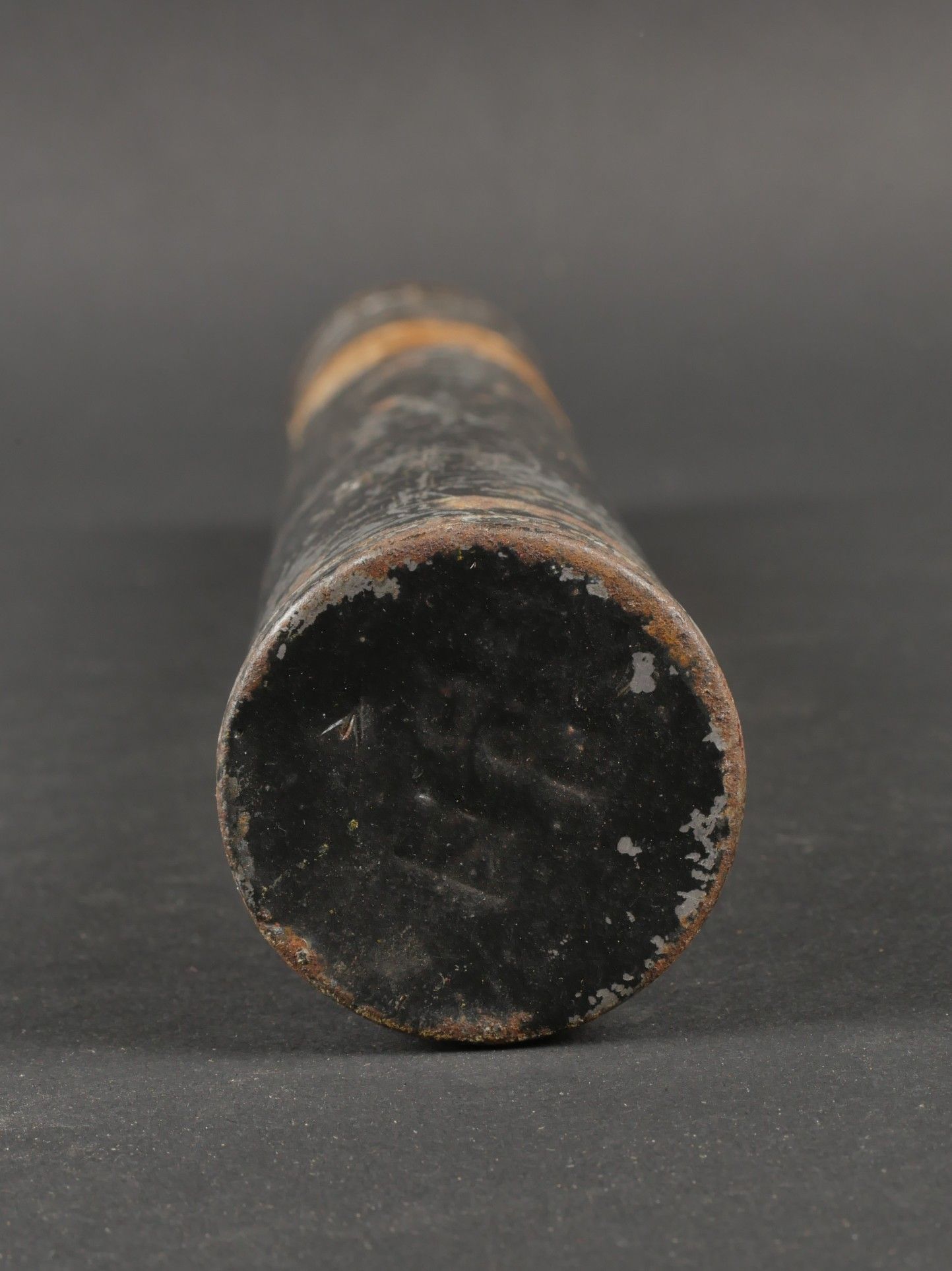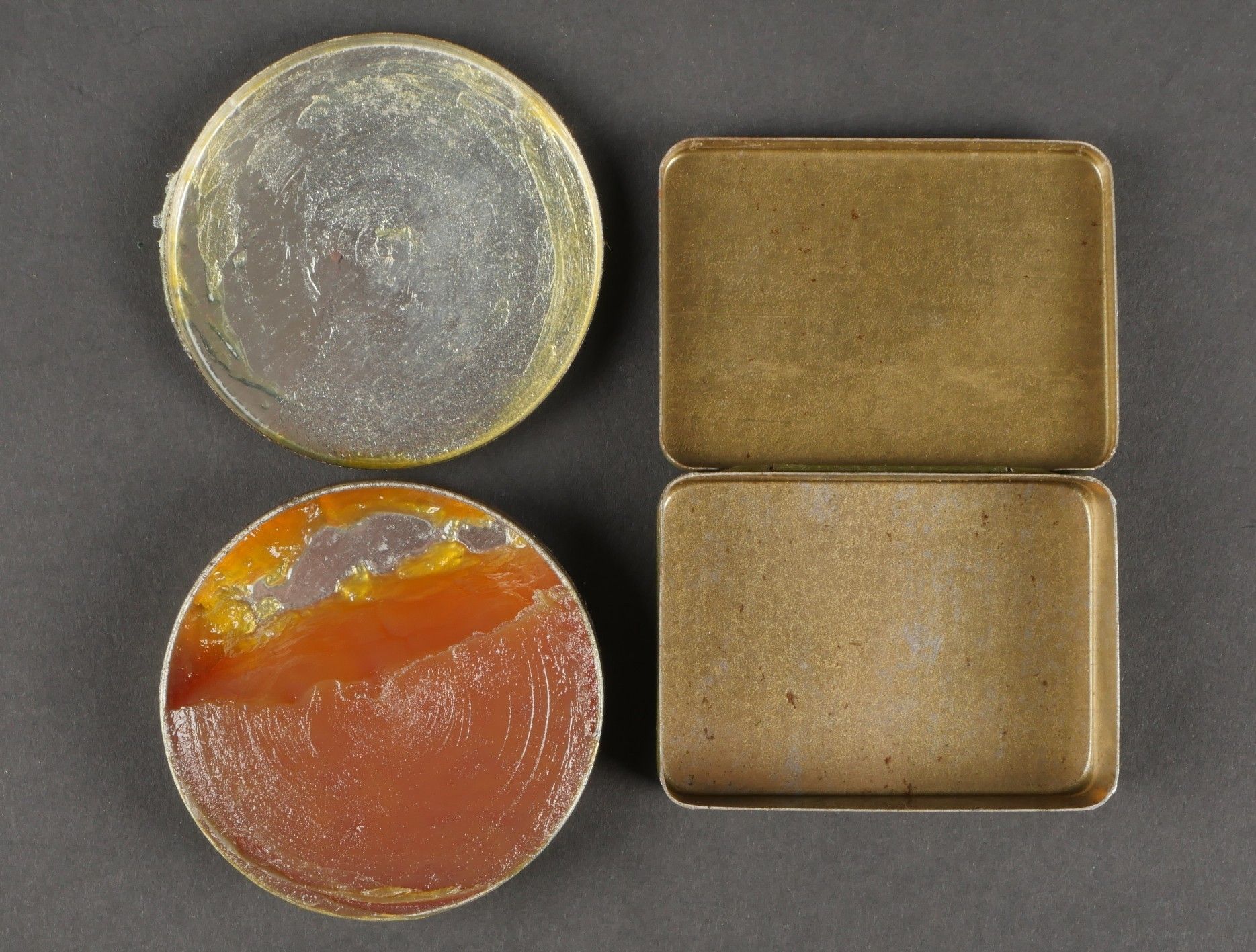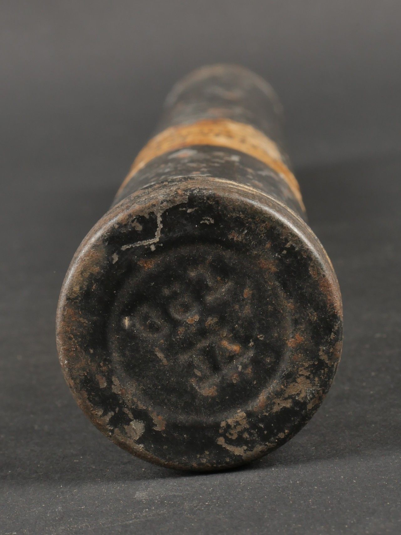 Primer charge tube. V1 tube in metal and original black paint, well marked on the bottom and with paper label reading Group 2 Guncotton Dry 10 Primers Field I oz, dated 1942. 10 MK3 percussion caps in metal box. Attached is a Vaseline box also parachuted to the Resistance. Tube for primary charge. Metal V1 tube in original black paint clearly marked on the base with paper label reading Group 2 Guncotton Dry 10 Primers Field 1 oz dated 1942. A metal box for 10 percussion caps MK3. Includes a small vaseline tin also parachuted to the Resistance.