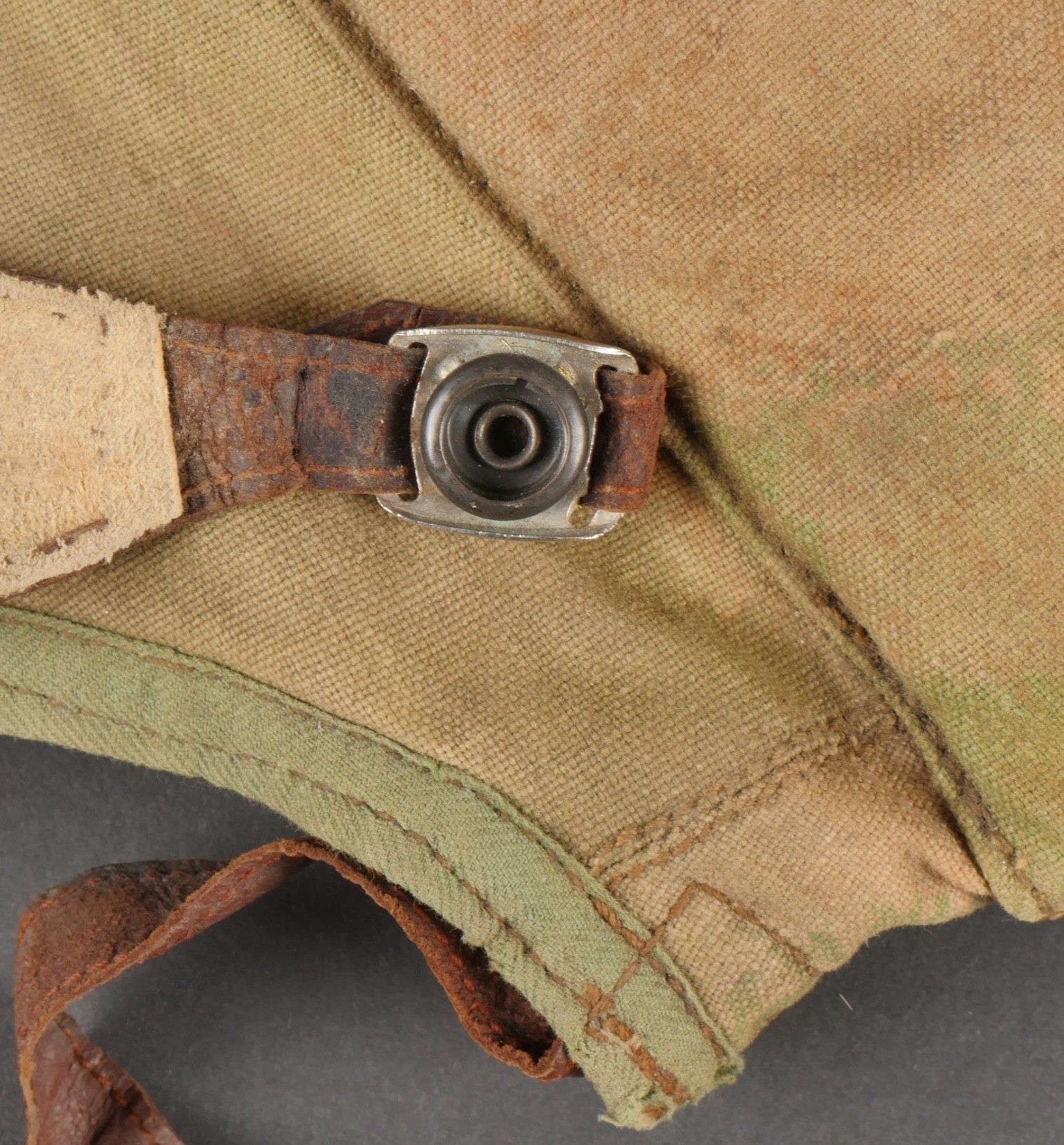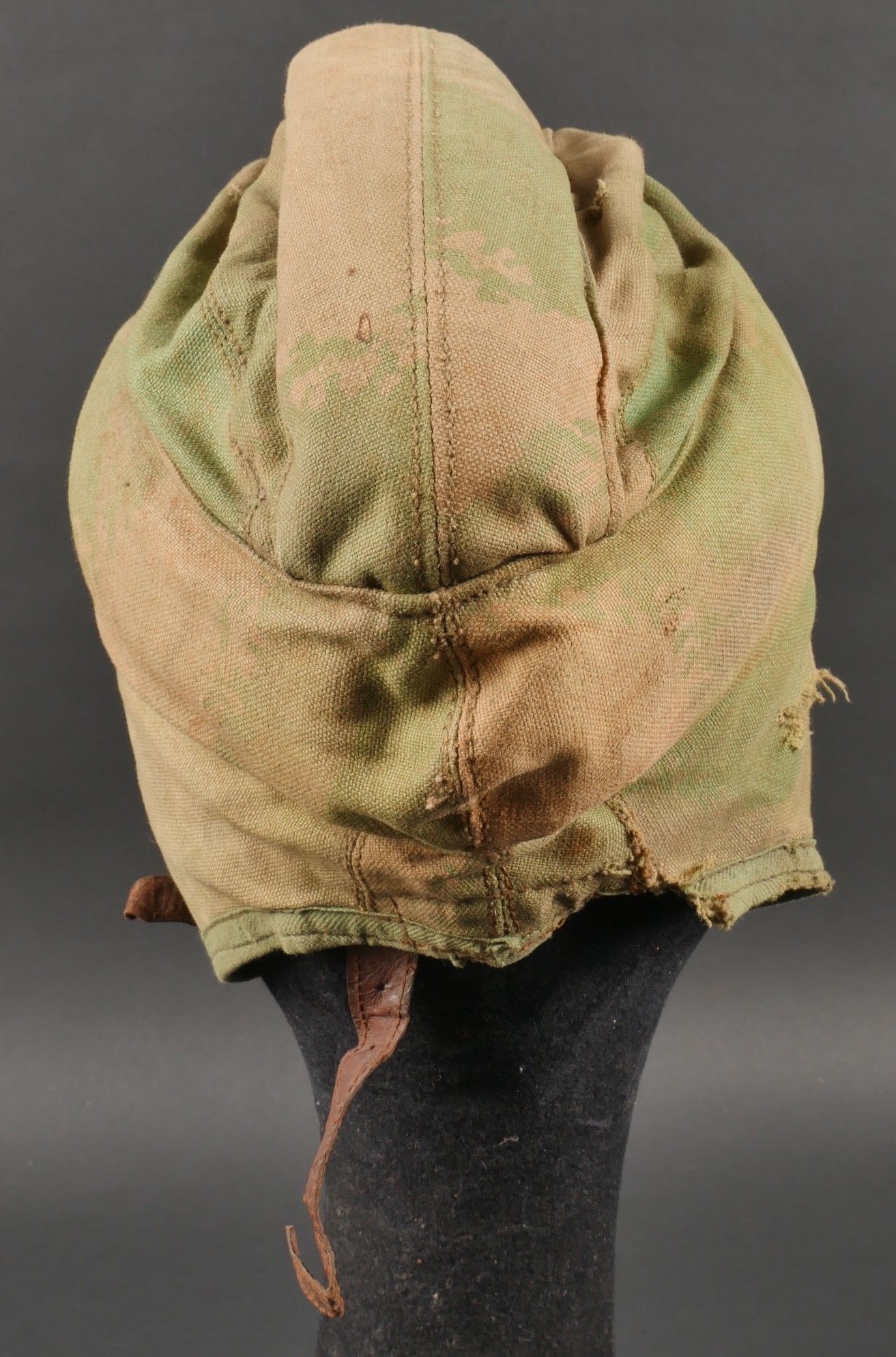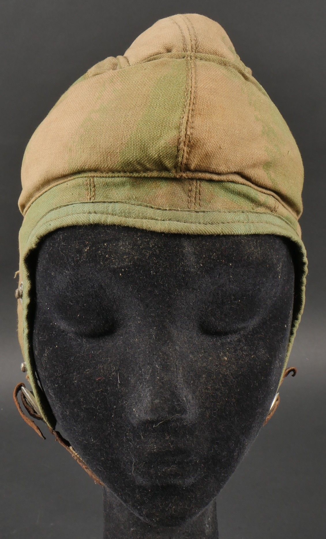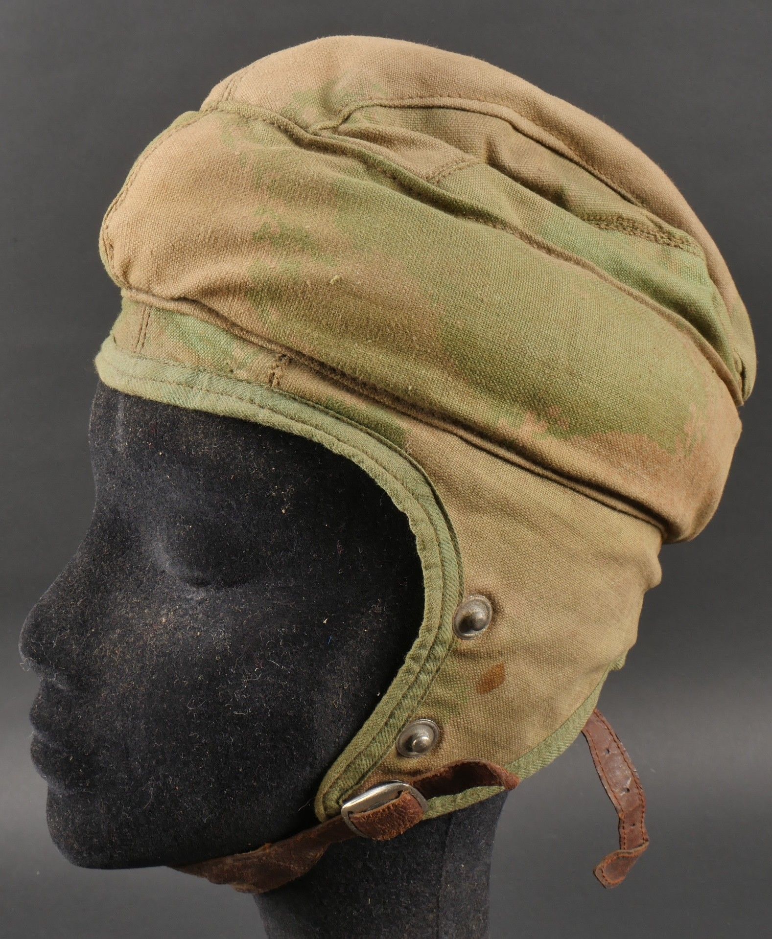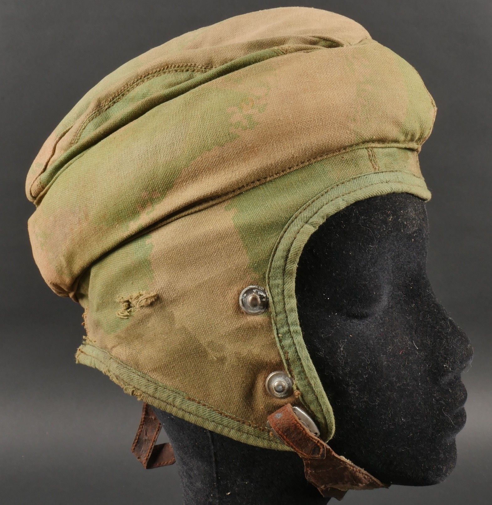 SOE jump helmet. Rare four-tone camouflage jump helmet in green, brown, ochre and black. Padded at the headband and on the top of the head, it still has its rare leather and chamois chin strap with its two adjustment snaps. At the back of the helmet is still the small leather strap that attaches to the suit. Note a small repair to the back of the helmet and to the lower flap, but the press studs are in good condition and functional. SOE jump helmet. Rare canvas jump helmet in fourtone camouflage green brown ochre black. Padded at the band and crown, retains its rare leather and chamois chinstrap with two adjustment snaps. The small rear leather strap to attach to the suit is present. Small repair at the back and on the lower flap, snaps in good condition and working.