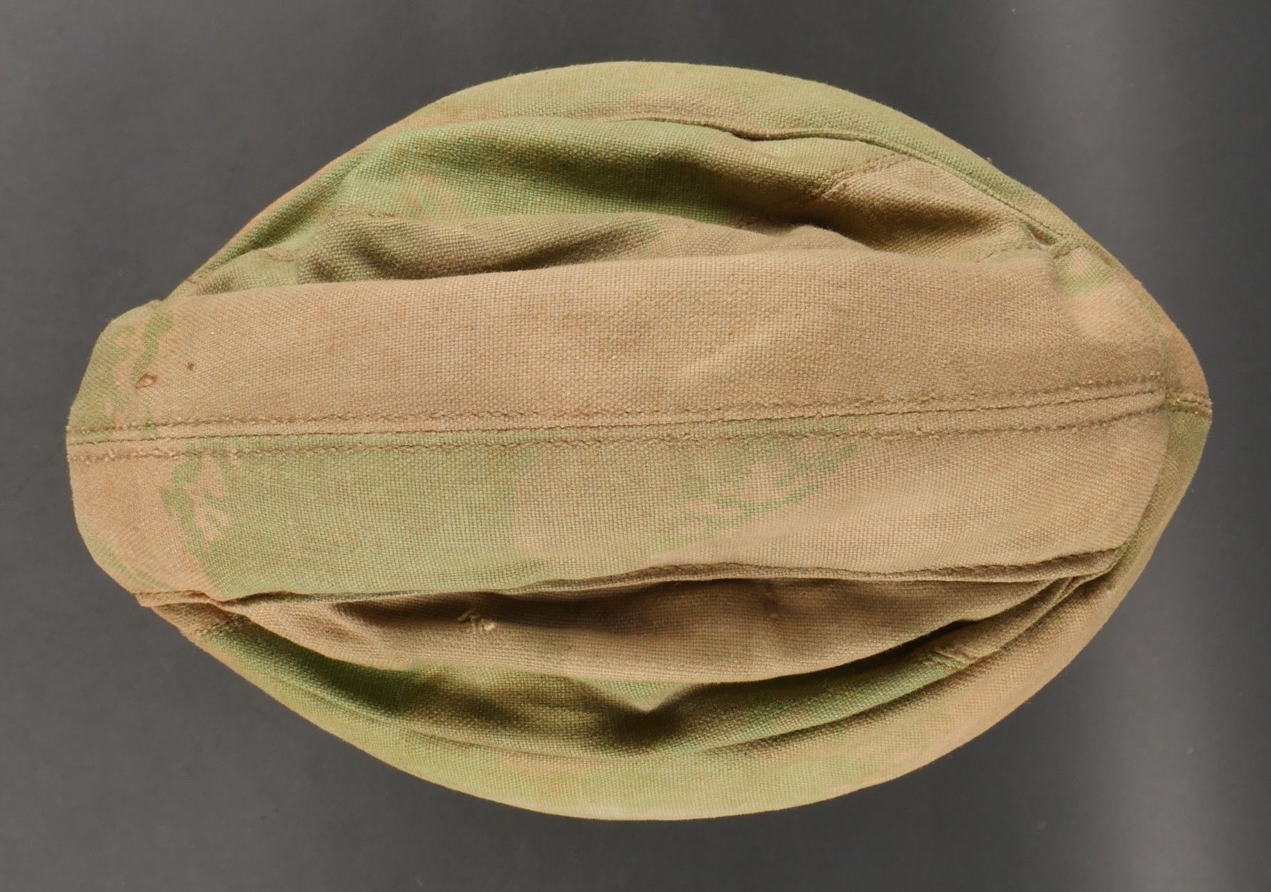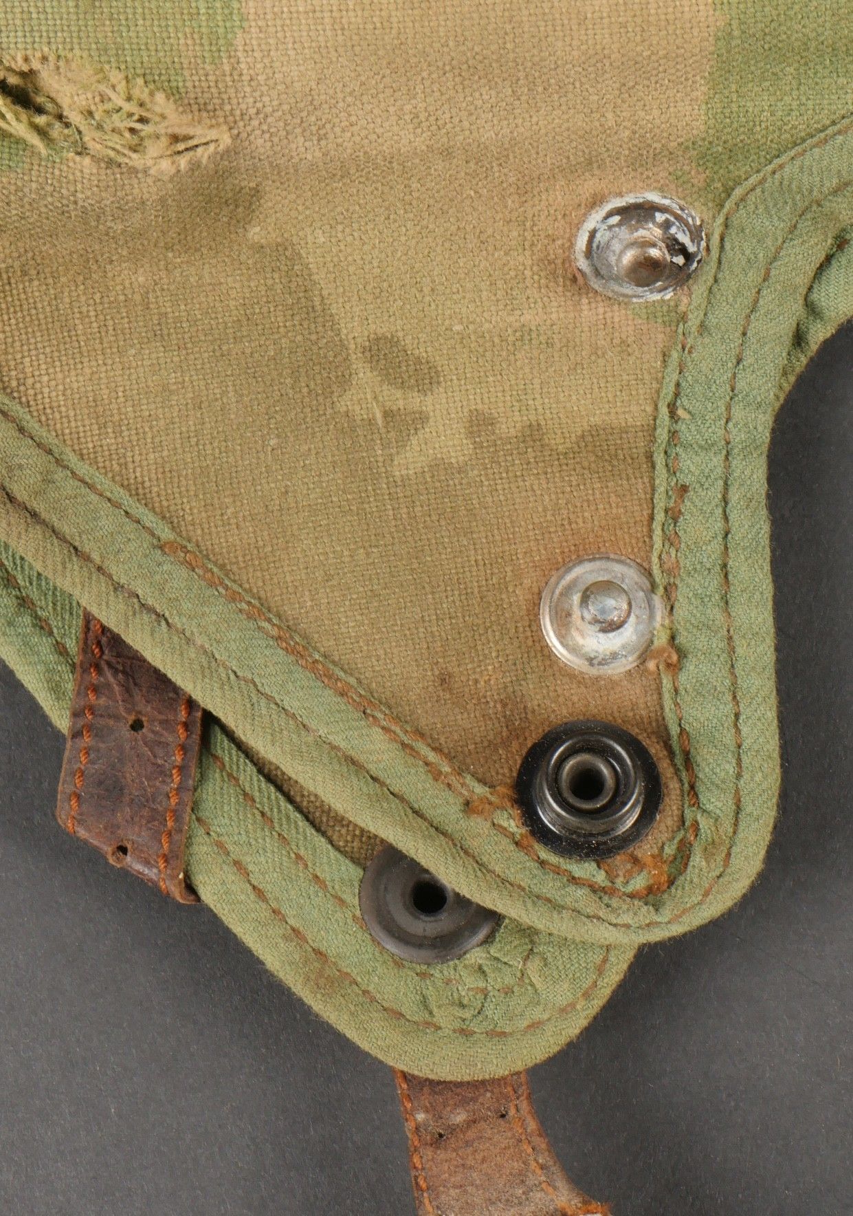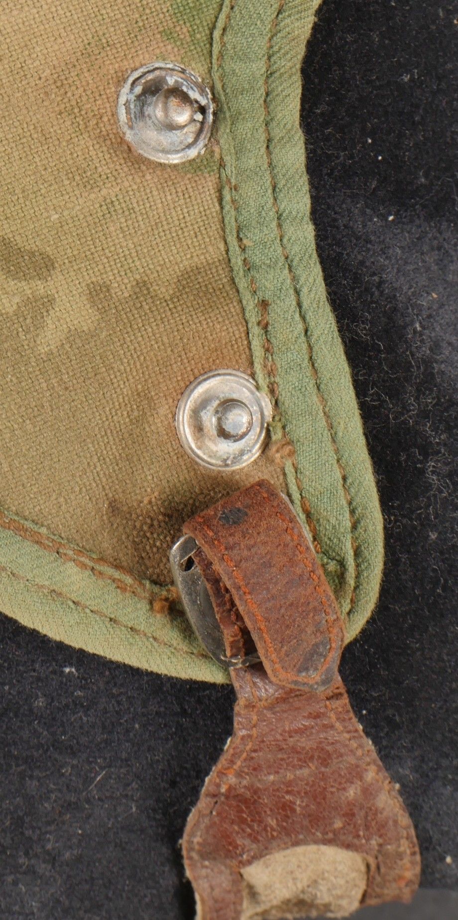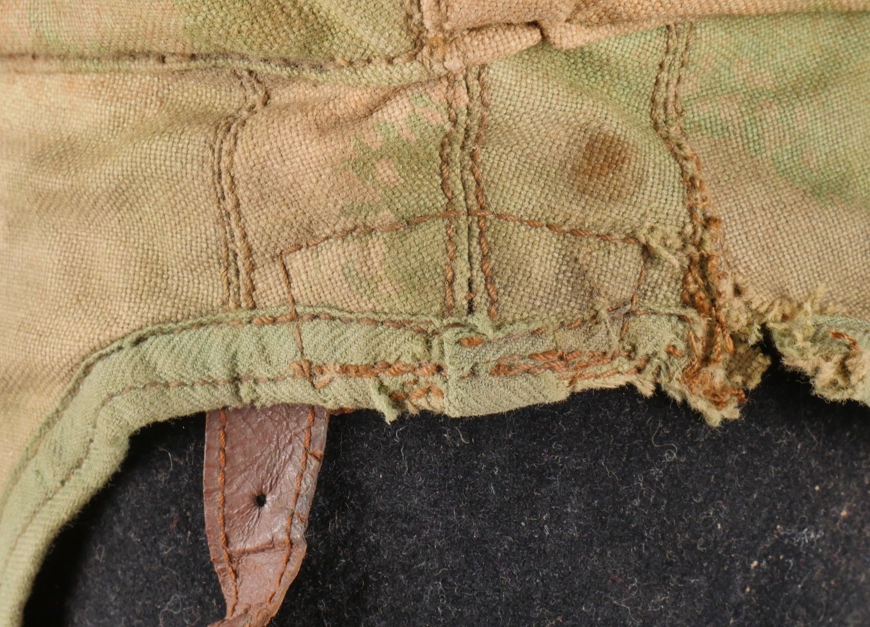 SOE jump helmet. Rare four-tone camouflage jump helmet in green, brown, ochre and black. Padded at the headband and on the top of the head, it still has its rare leather and chamois chin strap with its two adjustment snaps. At the back of the helmet is still the small leather strap that attaches to the suit. Note a small repair to the back of the helmet and to the lower flap, but the press studs are in good condition and functional. SOE jump helmet. Rare canvas jump helmet in fourtone camouflage green brown ochre black. Padded at the band and crown, retains its rare leather and chamois chinstrap with two adjustment snaps. The small rear leather strap to attach to the suit is present. Small repair at the back and on the lower flap, snaps in good condition and working.