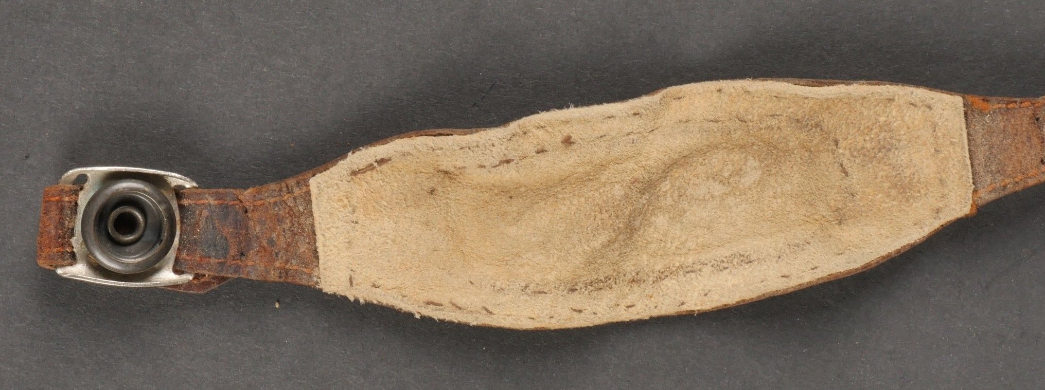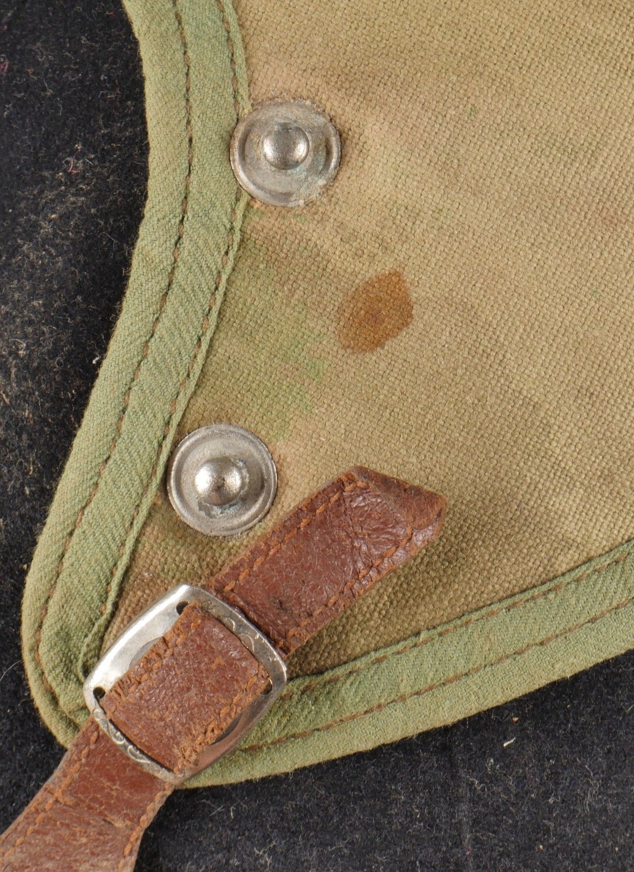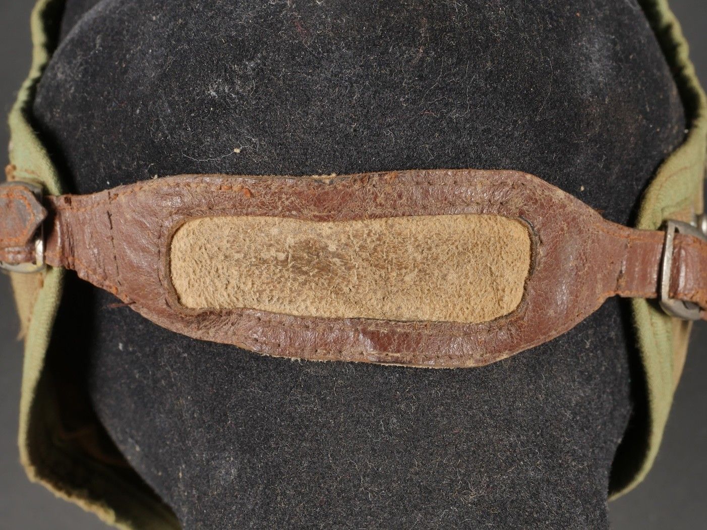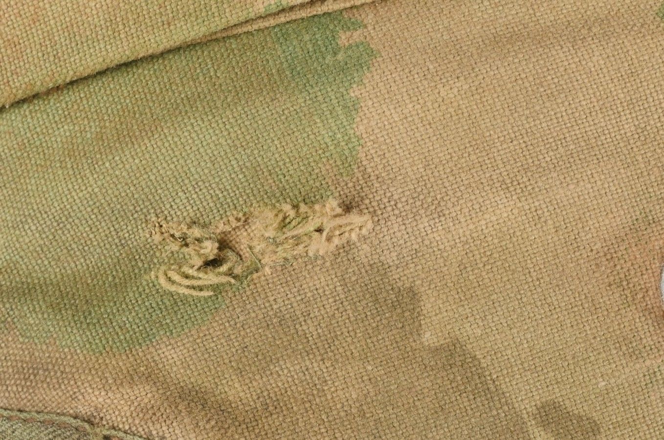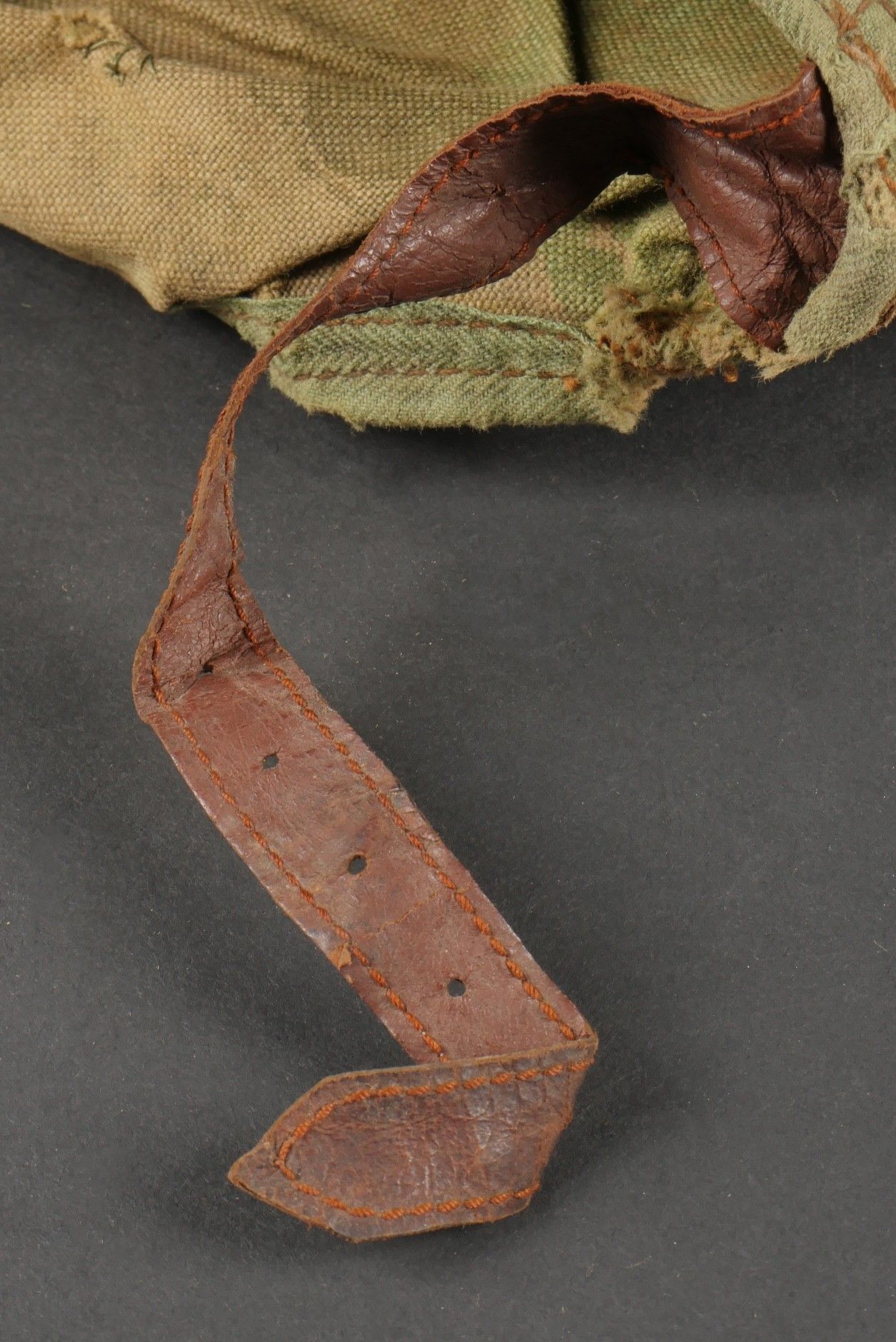 SOE jump helmet. Rare four-tone camouflage jump helmet in green, brown, ochre and black. Padded at the headband and on the top of the head, it still has its rare leather and chamois chin strap with its two adjustment snaps. At the back of the helmet is still the small leather strap that attaches to the suit. Note a small repair to the back of the helmet and to the lower flap, but the press studs are in good condition and functional. SOE jump helmet. Rare canvas jump helmet in fourtone camouflage green brown ochre black. Padded at the band and crown, retains its rare leather and chamois chinstrap with two adjustment snaps. The small rear leather strap to attach to the suit is present. Small repair at the back and on the lower flap, snaps in good condition and working.