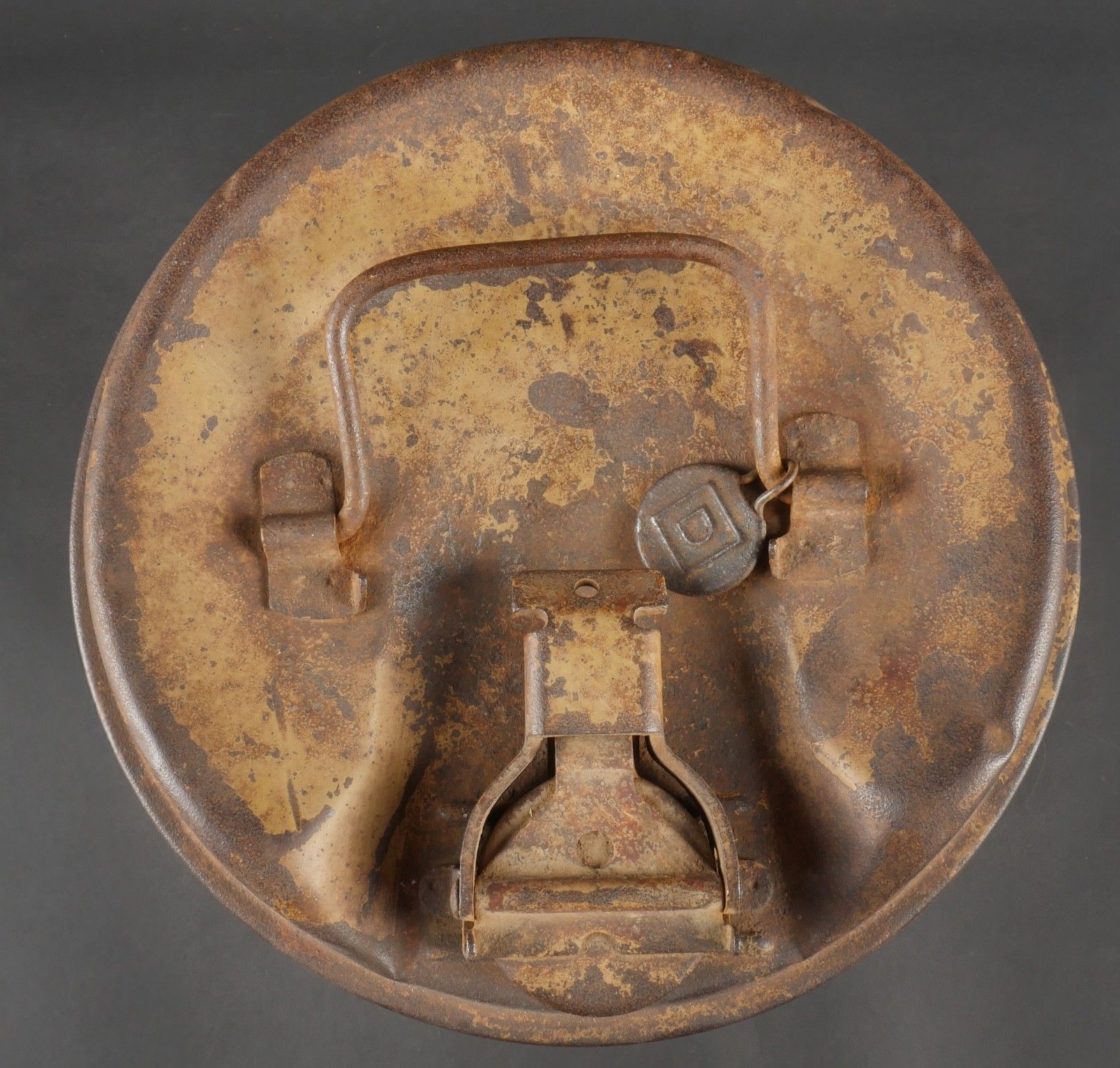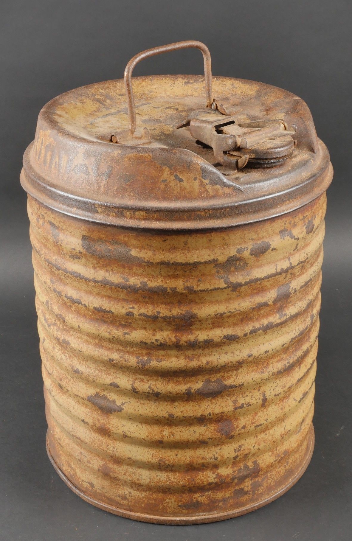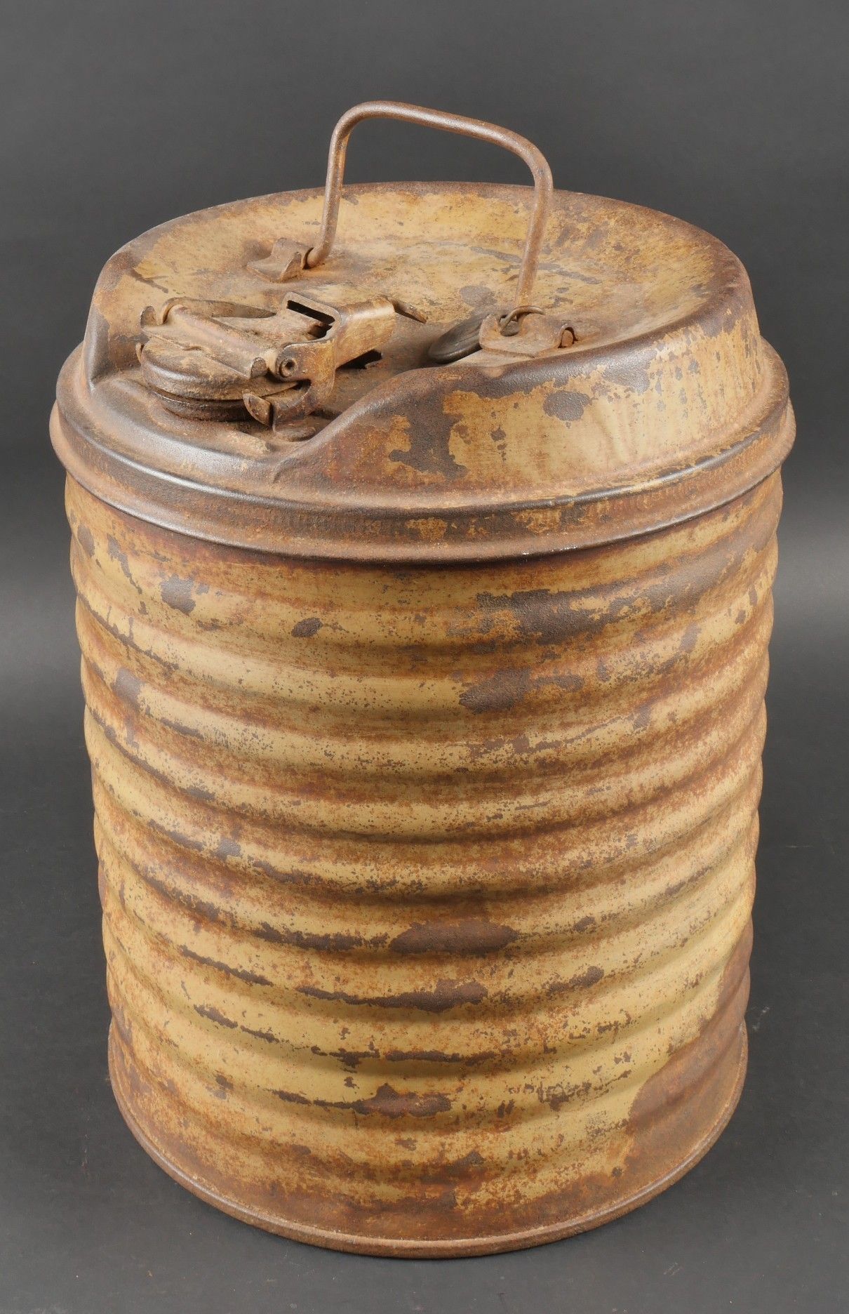 Jerrycan parachute. In original sand paint with functional handle, slightly dented. Dated 1943 on butt. Oxidation throughout. Parachutable jerrycan. Original sand paint with working handle slightly dented. Dated 1943 on the base. Oxidation overall.