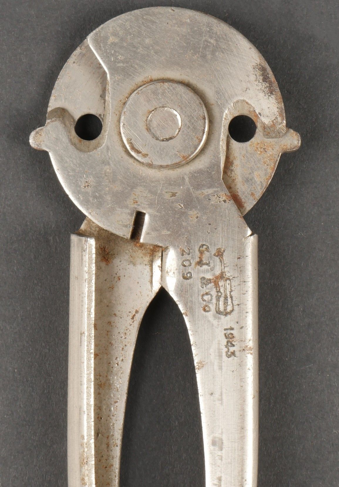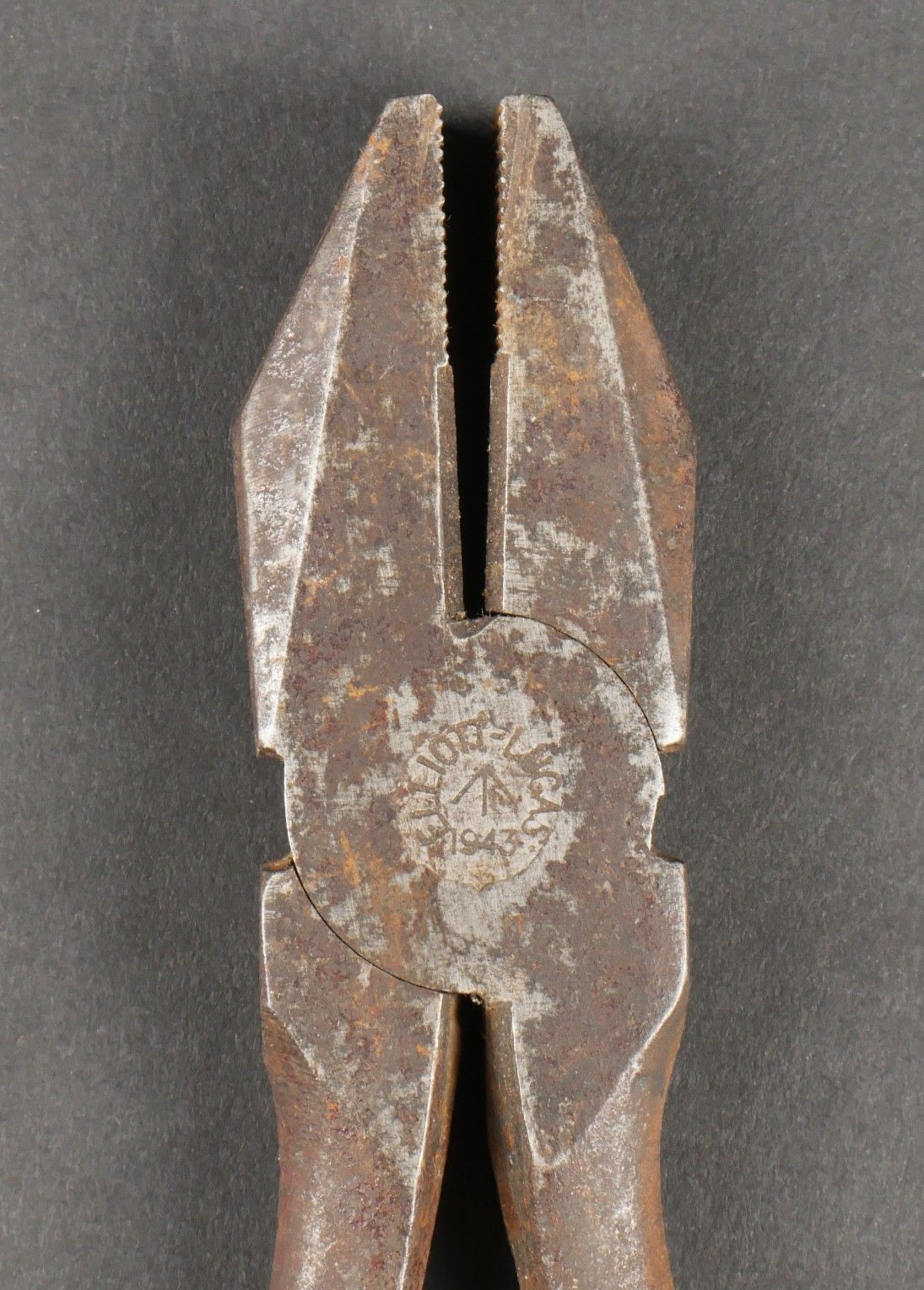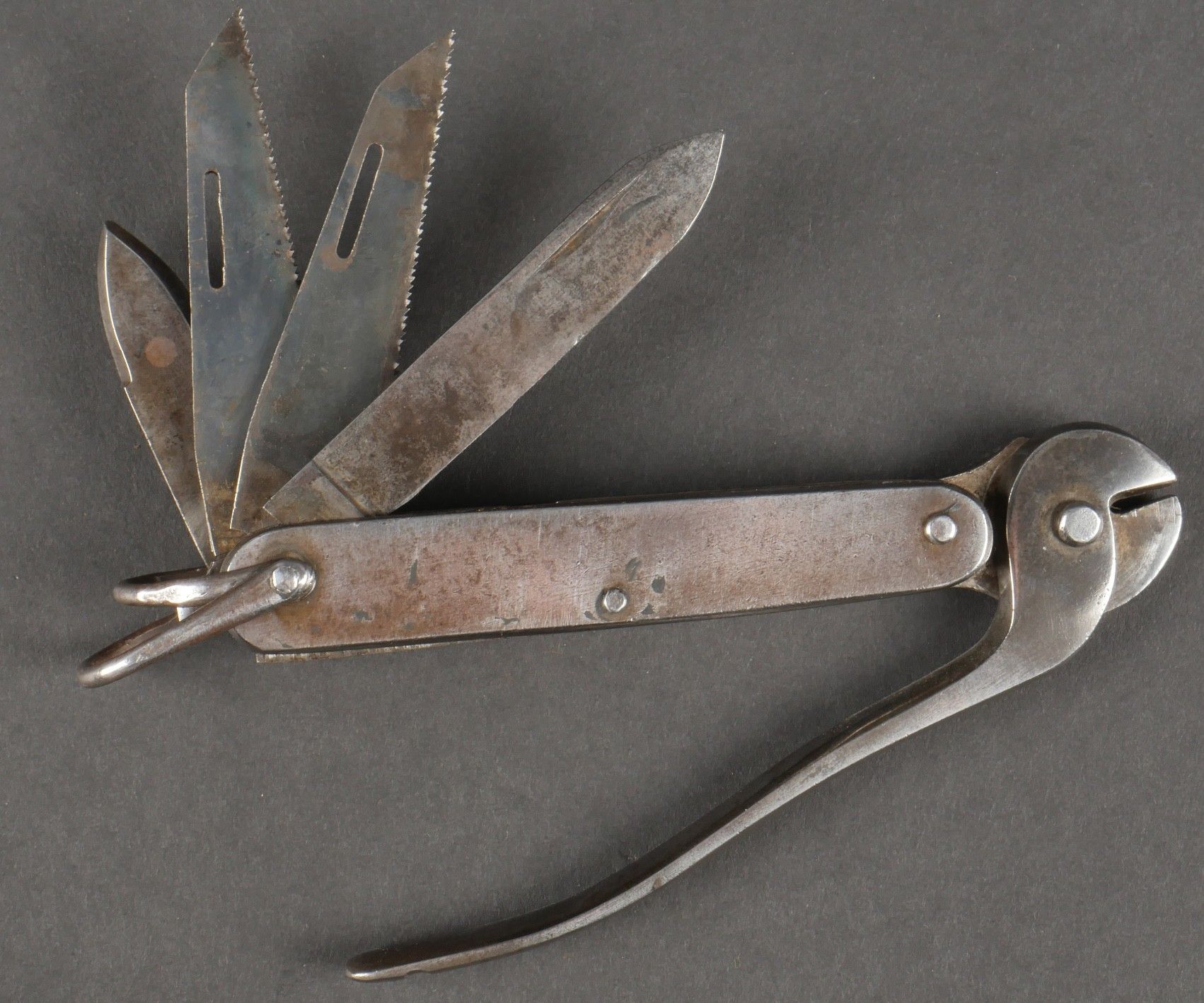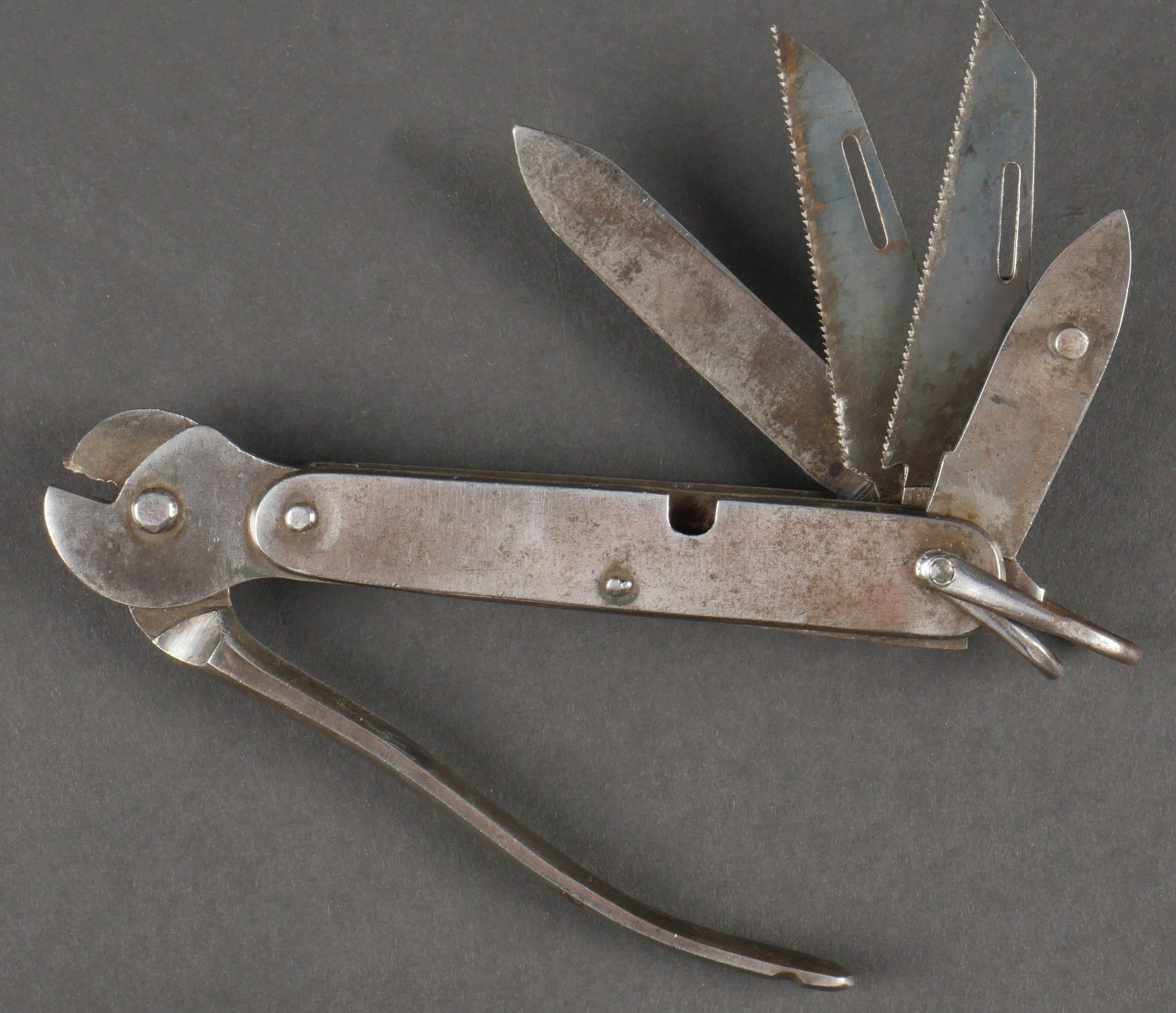 Set of parachuted tools. Comprising a special pair of pliers, violin marked and dated 1943. A pair of pliers for cutting detonating cord, intended for British engineers and later distributed to SOE, dated 1943. A multi-purpose knife with pliers, a damaged screwdriver, three saw blades, a knife blade, no markings present. Parachuted tool set. Includes a special pliers marked with violin logo and dated 1943. A pliers for cutting detonating cord for Royal Engineers then issued to SOE dated 1943. A multitool with pliers a damaged screwdriver three saw blades and a knife blade no markings.