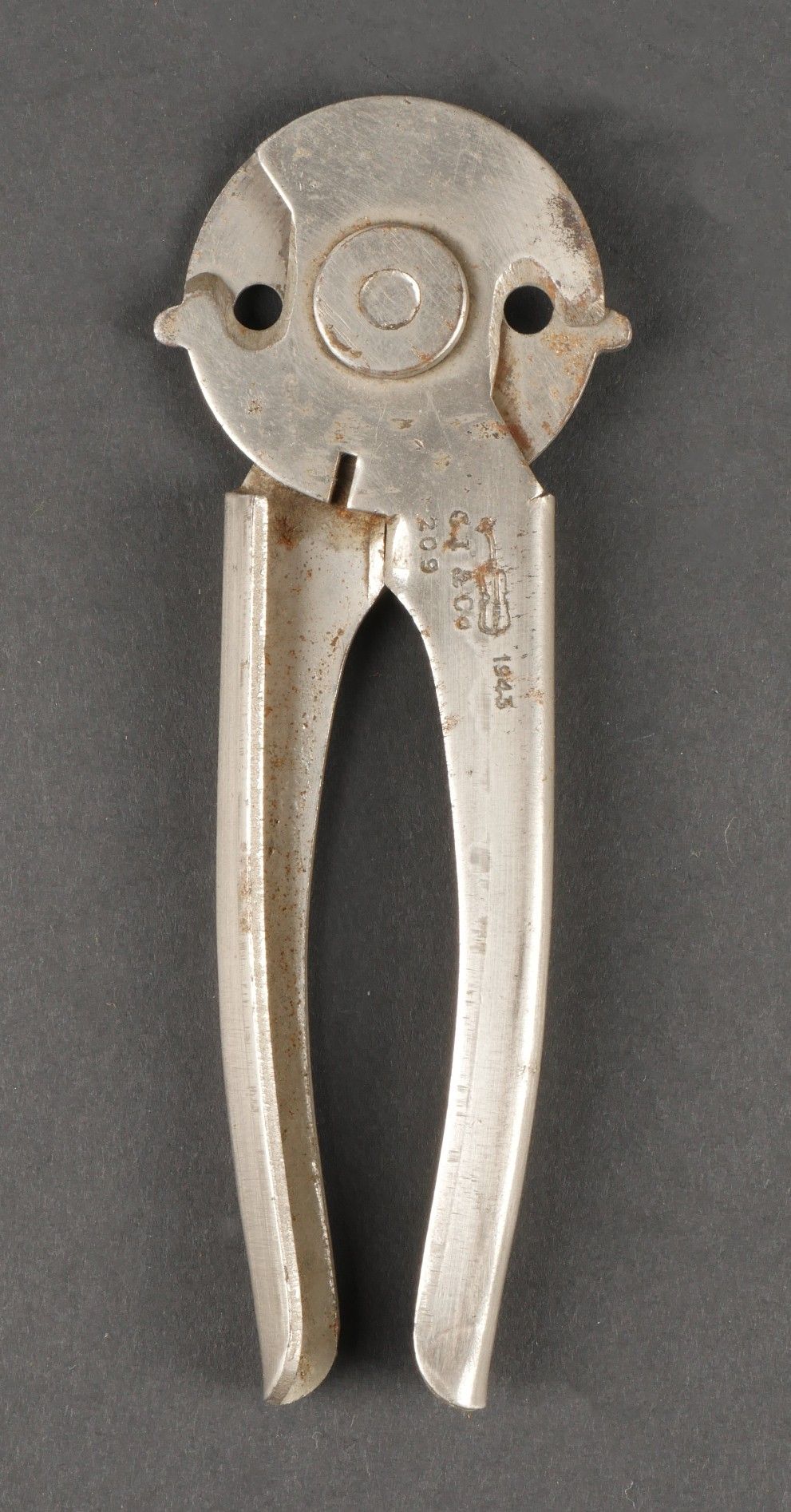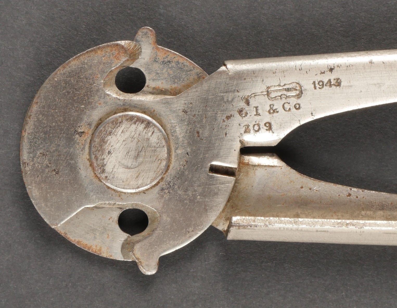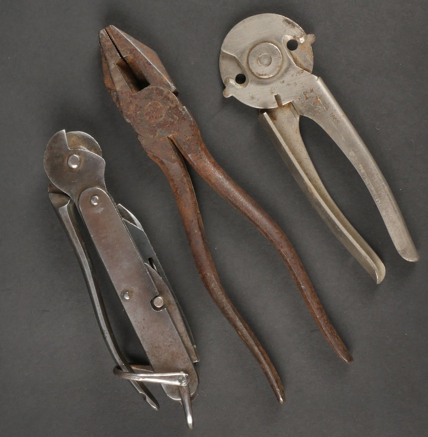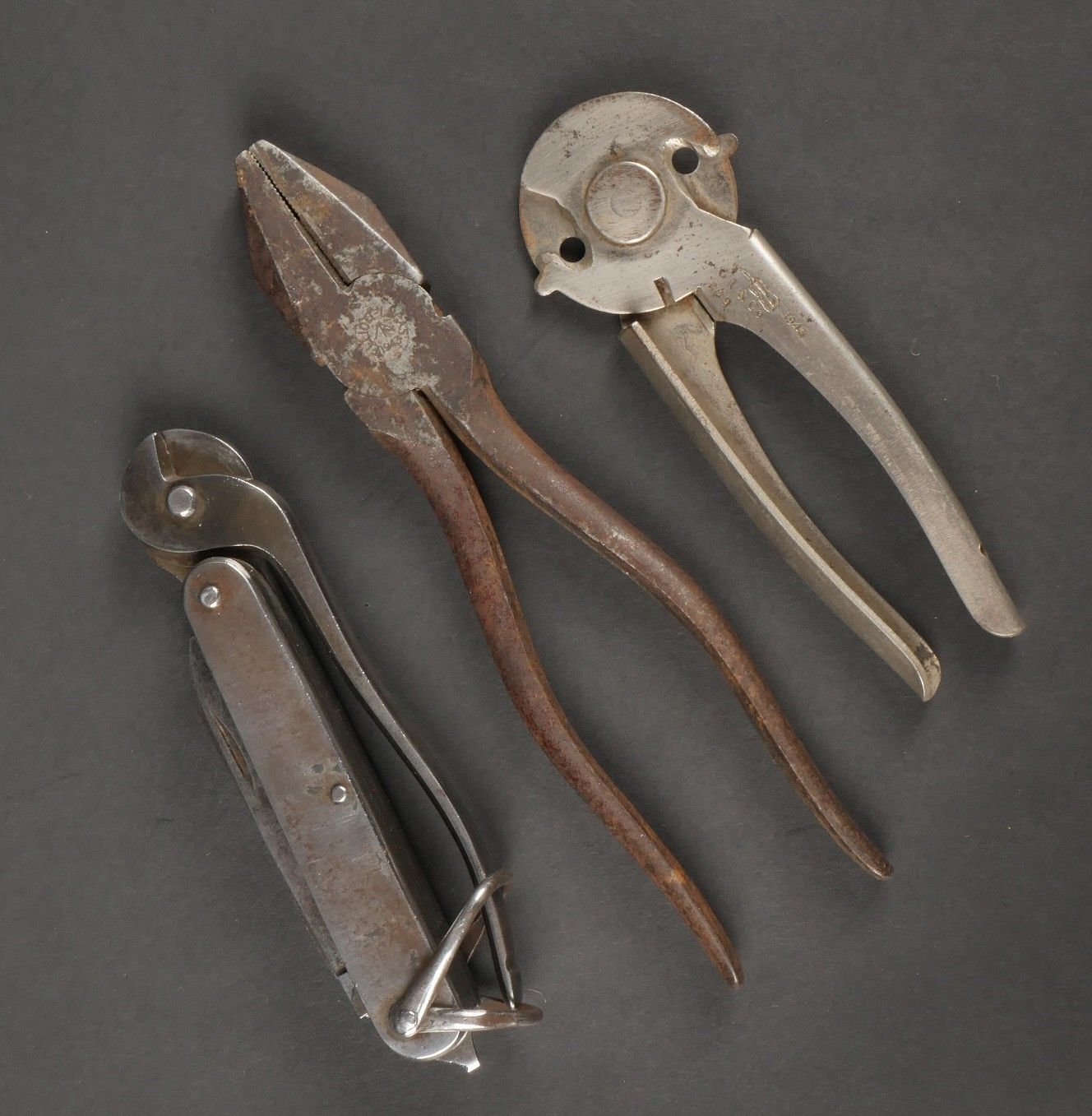Set of parachuted tools. Comprising a special pair of pliers, violin marked and dated 1943. A pair of pliers for cutting detonating cord, intended for British engineers and later distributed to SOE, dated 1943. A multi-purpose knife with pliers, a damaged screwdriver, three saw blades, a knife blade, no markings present. Parachuted tool set. Includes a special pliers marked with violin logo and dated 1943. A pliers for cutting detonating cord for Royal Engineers then issued to SOE dated 1943. A multitool with pliers a damaged screwdriver three saw blades and a knife blade no markings.