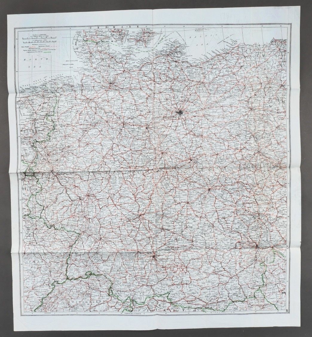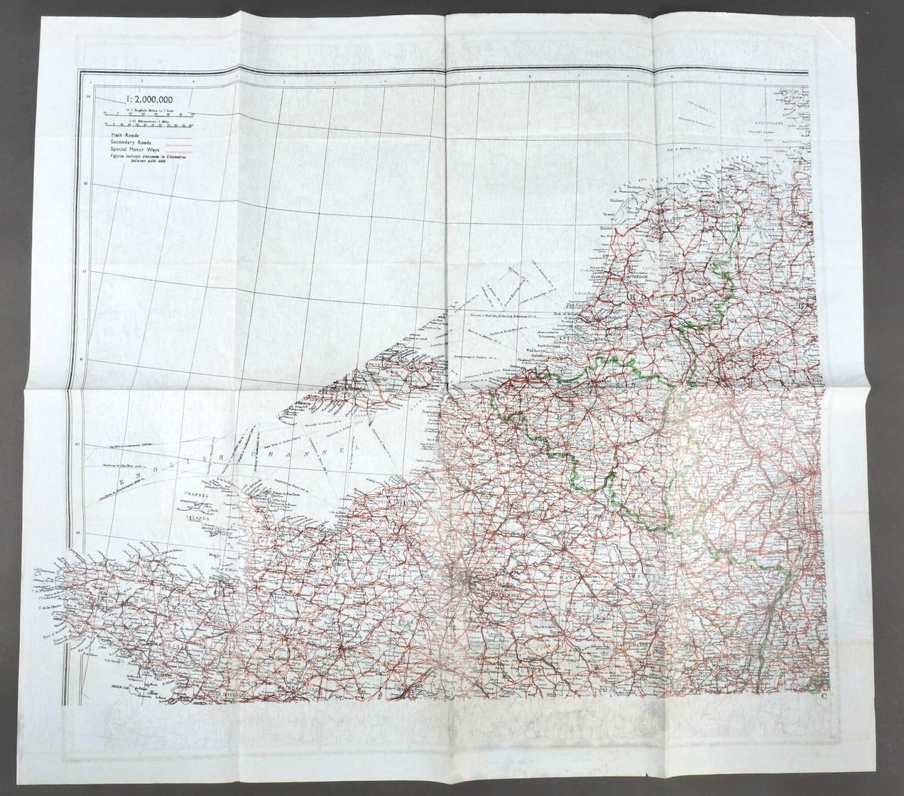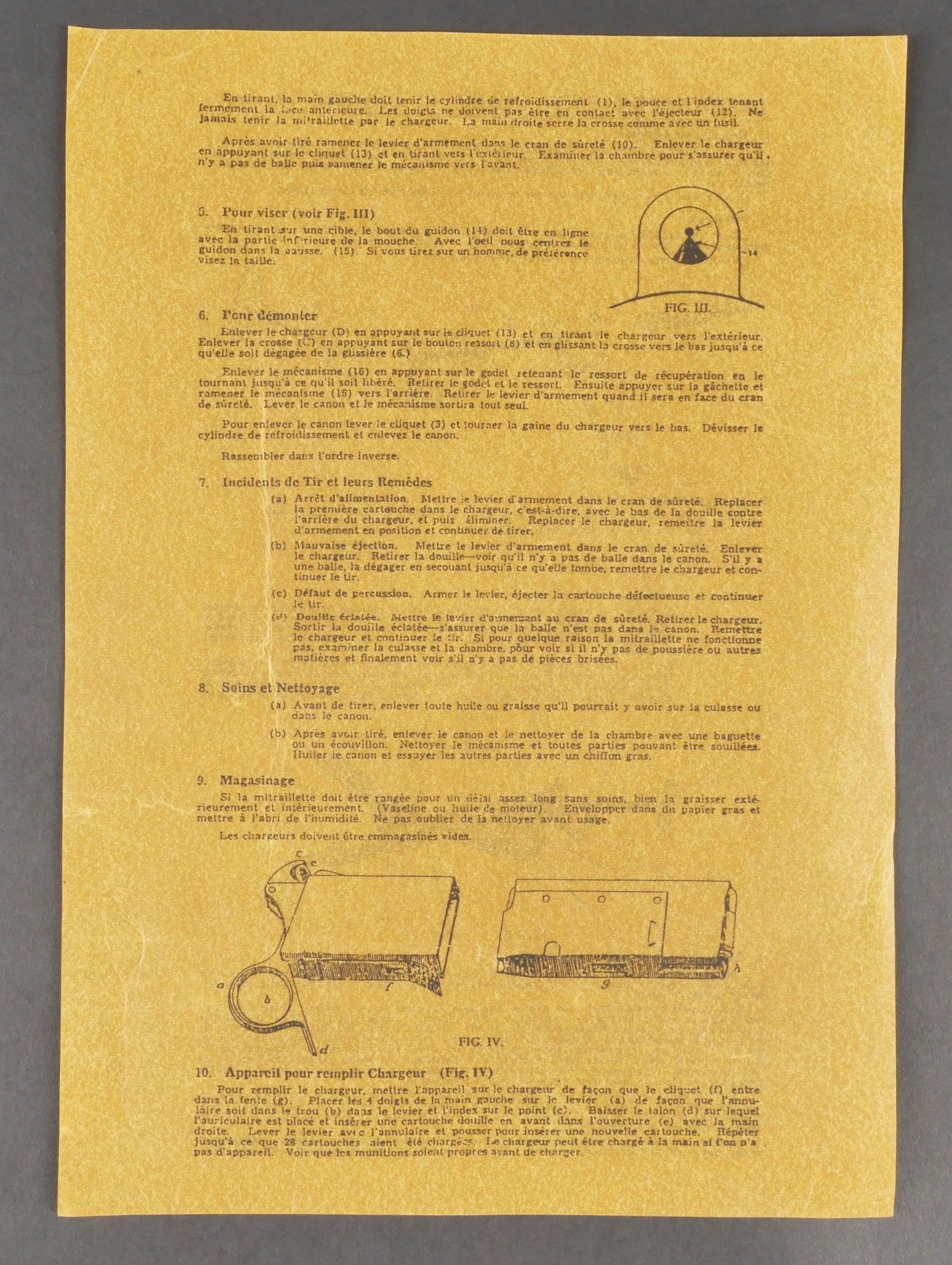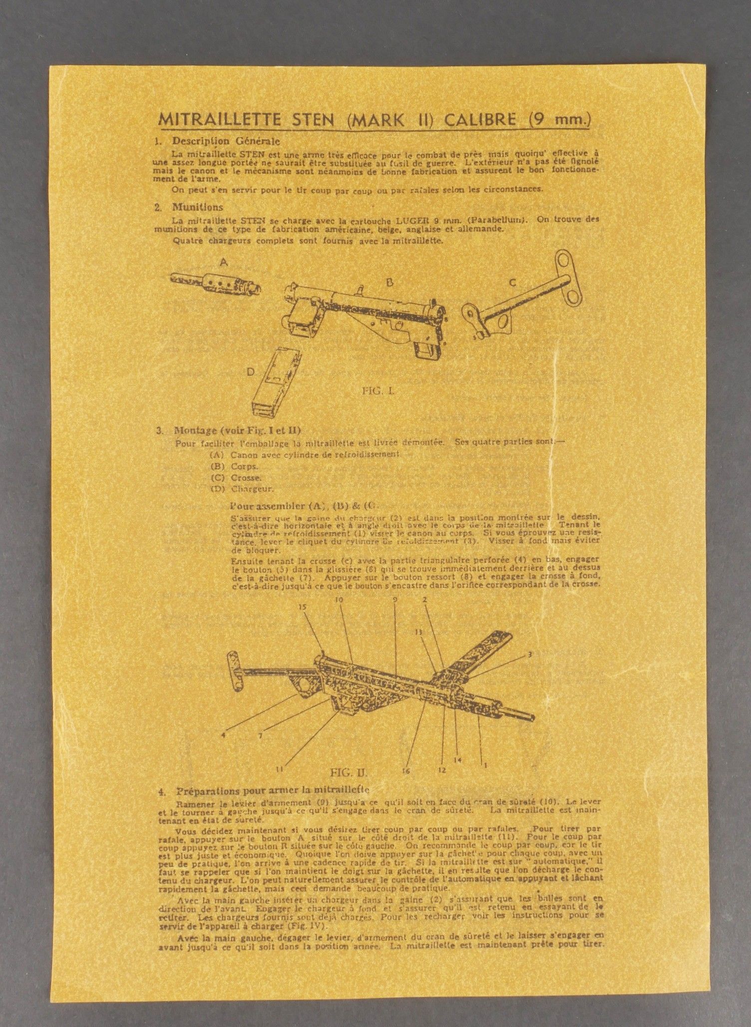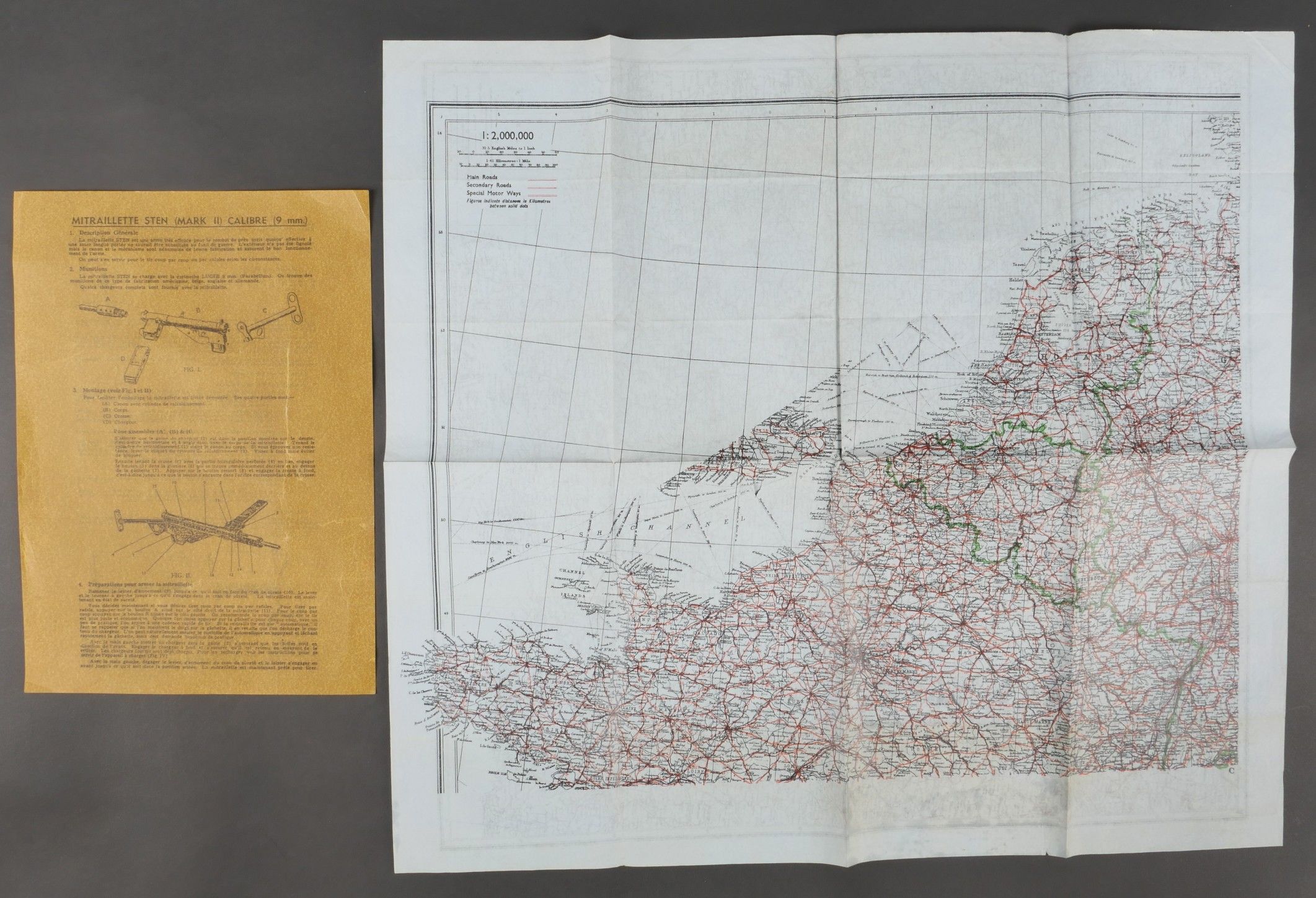 STEN parachuting manual. Notice in French on the handling and maintenance of the PM STEN, recto verso, parachuted to the resistance. Attached is a map printed on fine bluish paper, of English origin. Northern France and Belgium sector. STEN parachute drop manual. French manual on handling and maintenance of the STEN SMG printed on both sides parachuted to the Resistance. Includes a card printed on thin bluish paper of English origin. Northern France and Belgium sector.