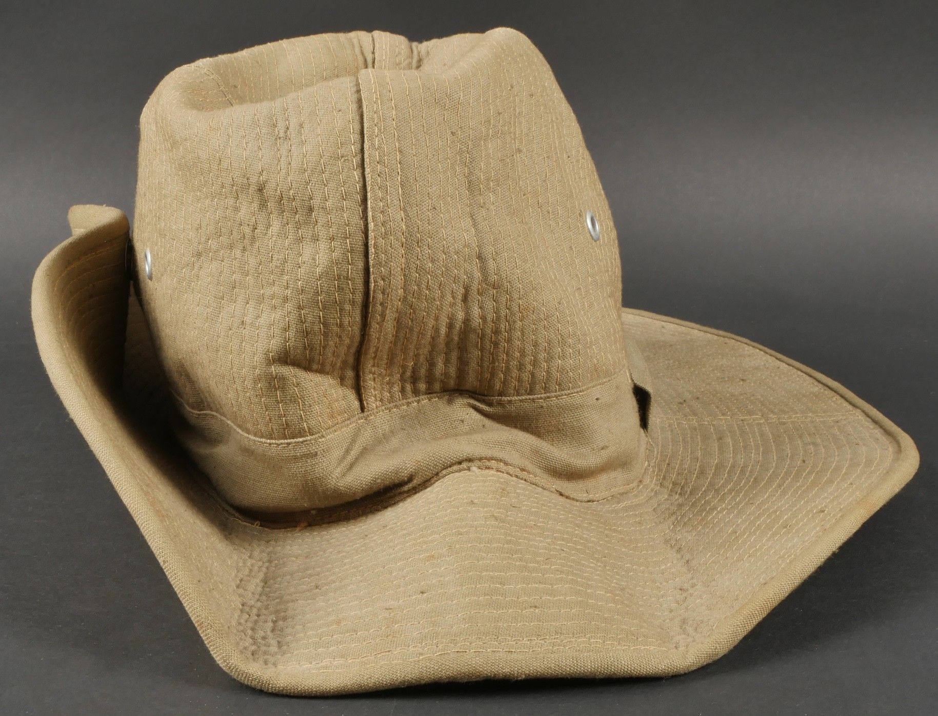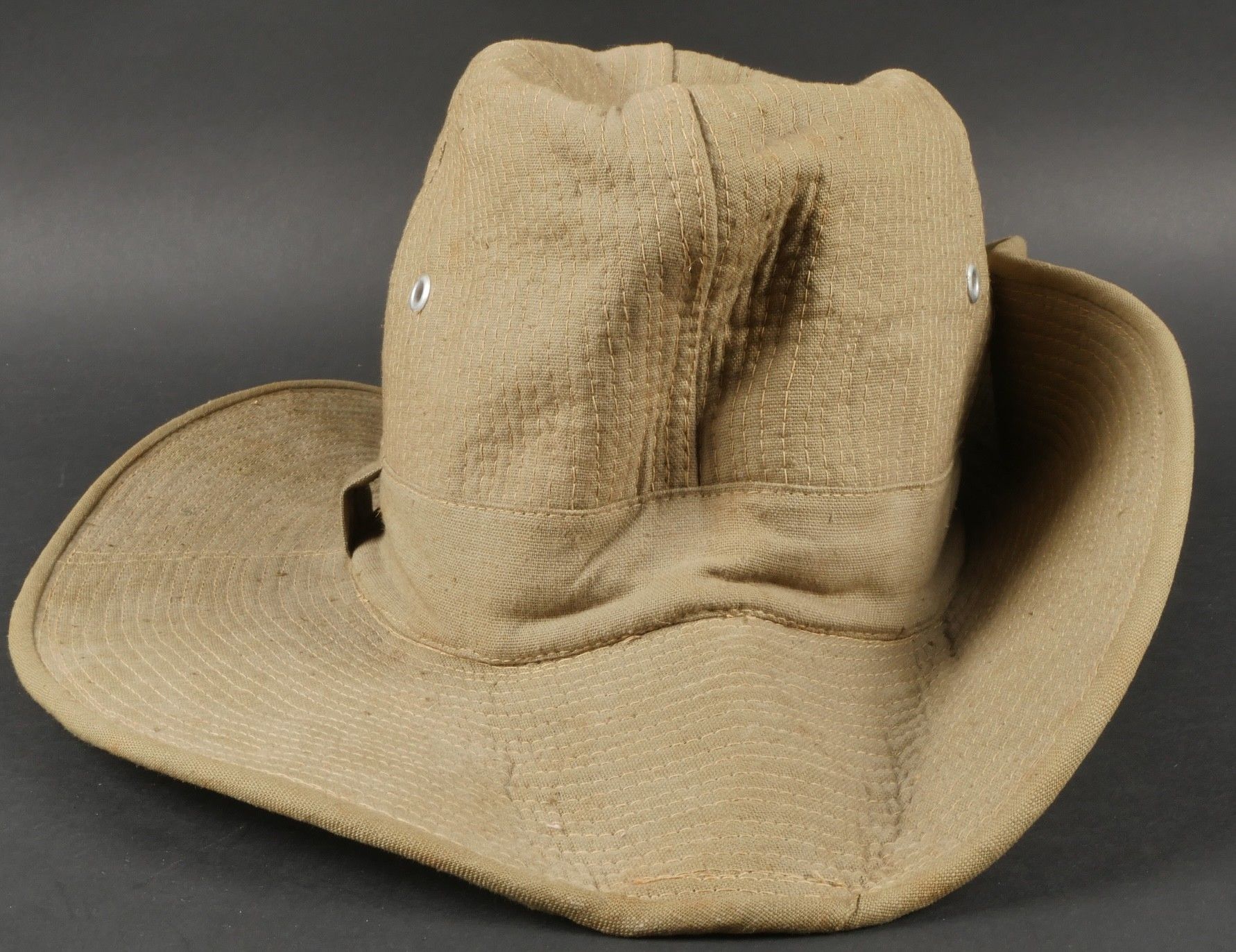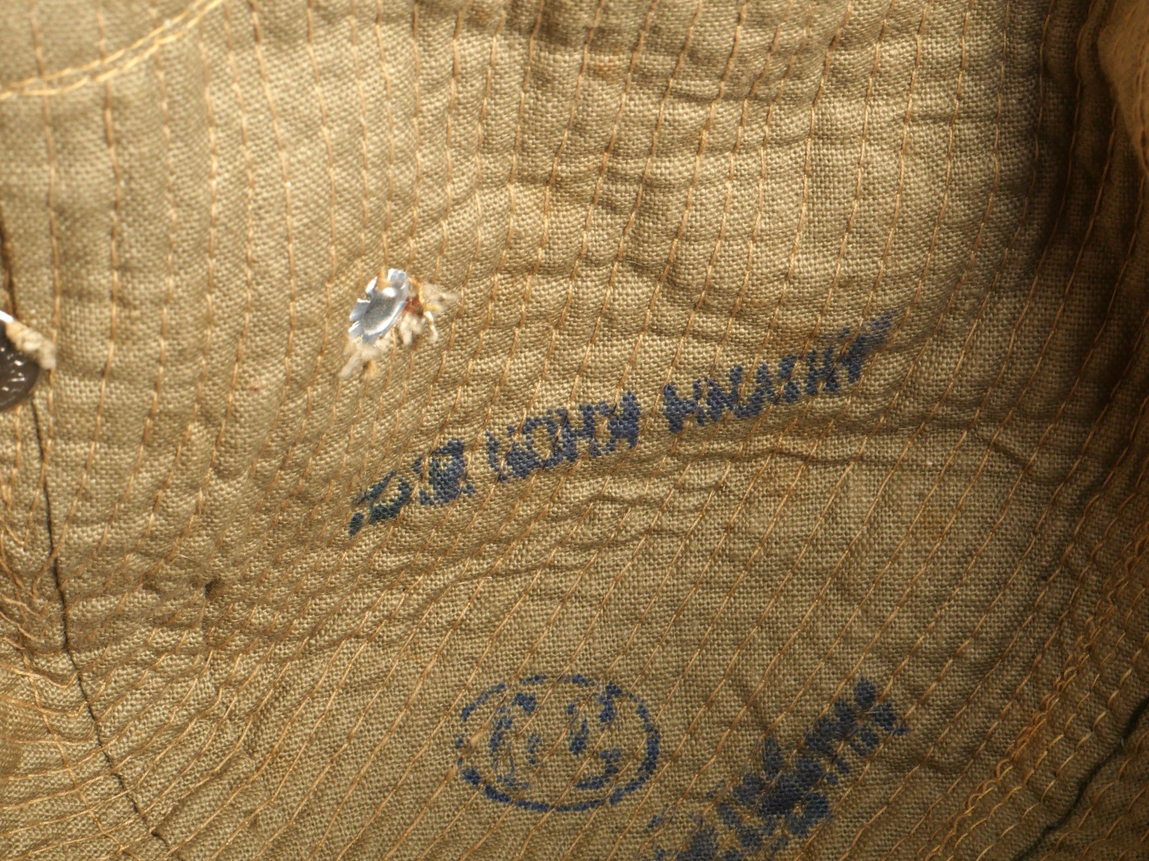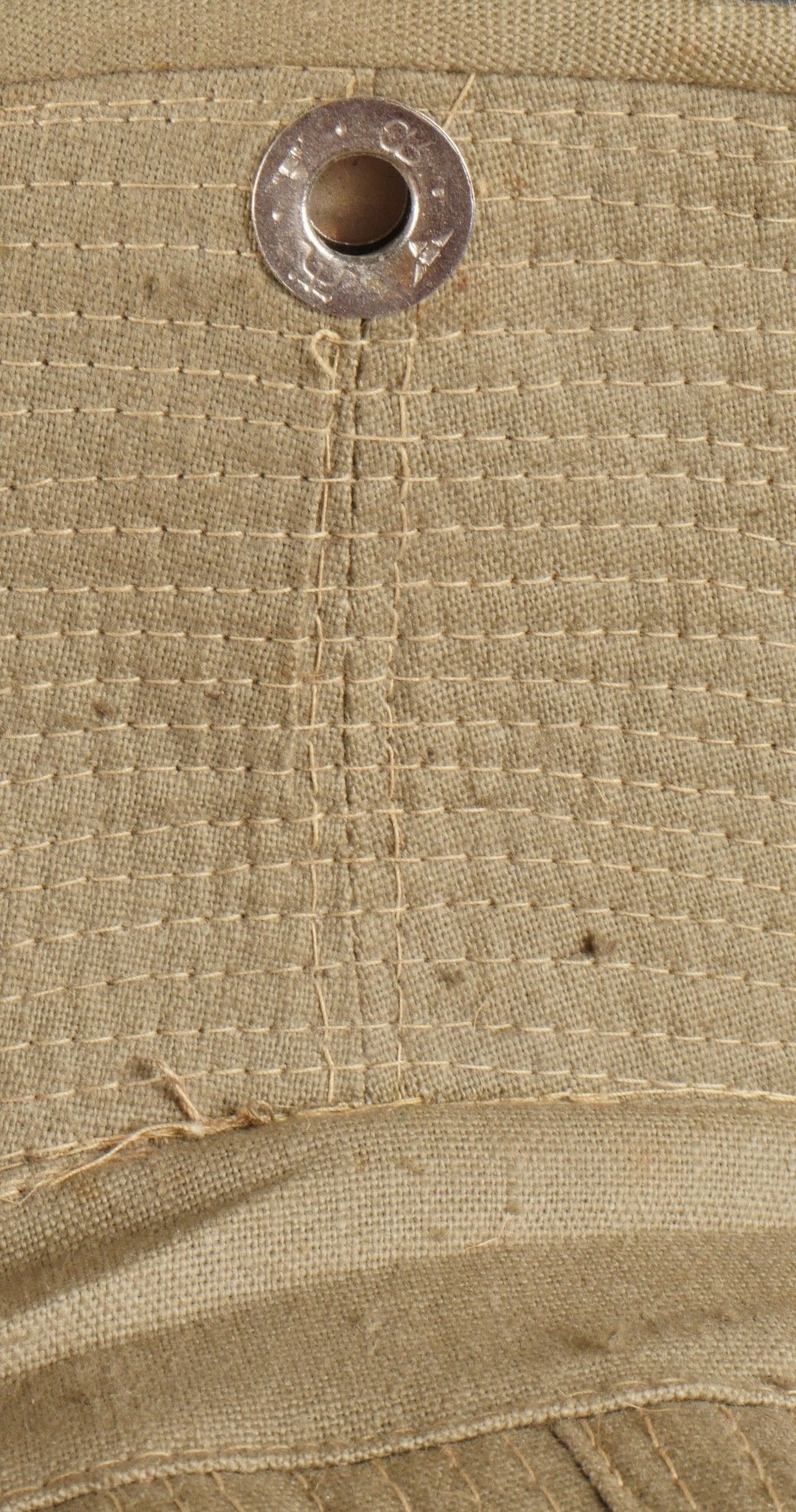 Regulation bush hat model 1949, made in the Far East. This hat has the particularity of being marked by the Indochinese manufacturer MINH KHOM, size 59. The large functional snap in good condition is typical of local Indochinese manufacture. Chinstrap present. Brand new from stock, never worn. Regulation 1949 bush hat made in the Far East. This hat bears an Indochinese maker mark MINH KHOM size 59. The large snap fastener functional and in good condition is characteristic of local Indochinese manufacture. Chinstrap present. Mint unissued stock never worn.