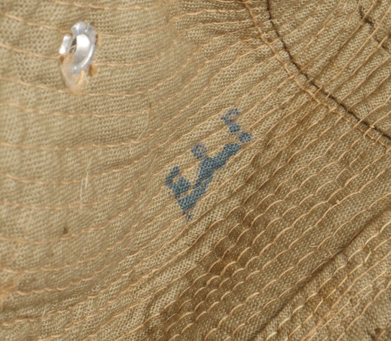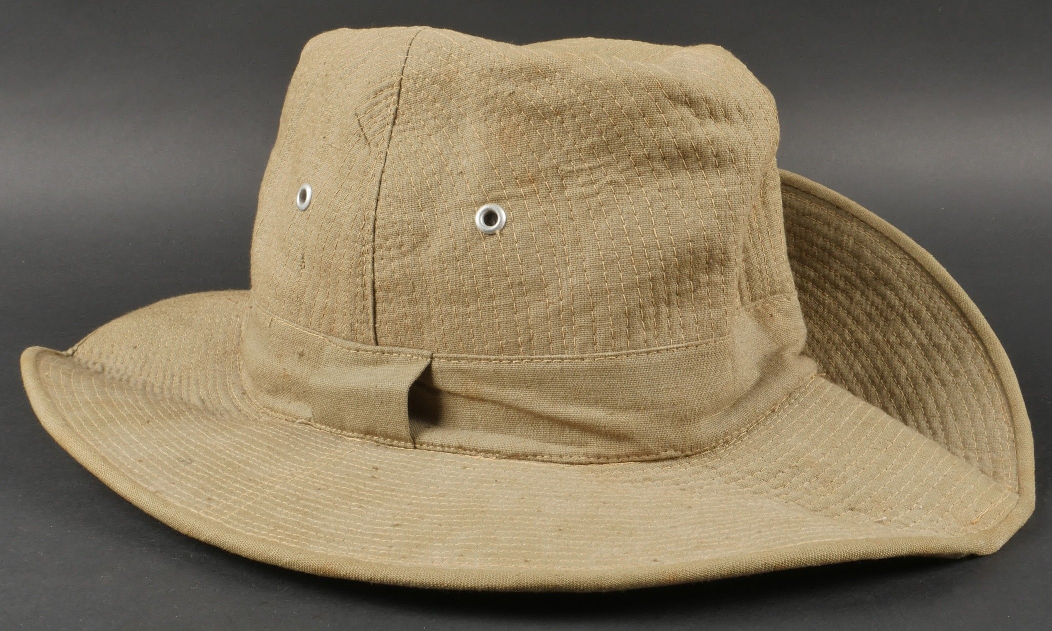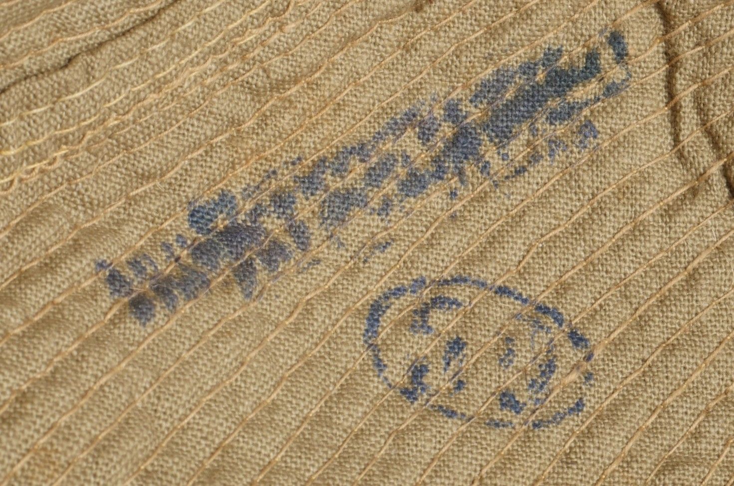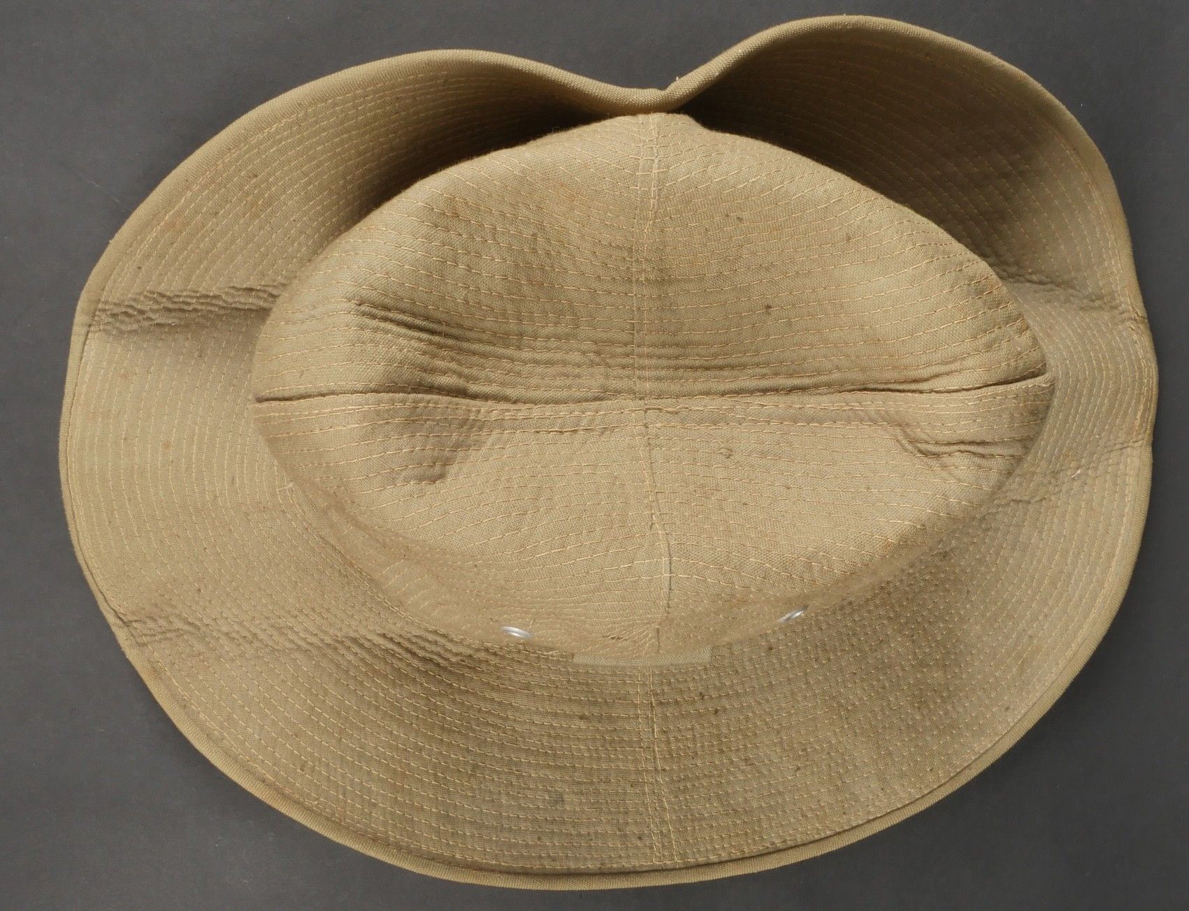 Regulation bush hat model 1949, made in the Far East. This hat has the particularity of being marked by the Indochinese manufacturer MINH KHOM, size 59. The large functional snap in good condition is typical of local Indochinese manufacture. Chinstrap present. Brand new from stock, never worn. Regulation 1949 bush hat made in the Far East. This hat bears an Indochinese maker mark MINH KHOM size 59. The large snap fastener functional and in good condition is characteristic of local Indochinese manufacture. Chinstrap present. Mint unissued stock never worn.