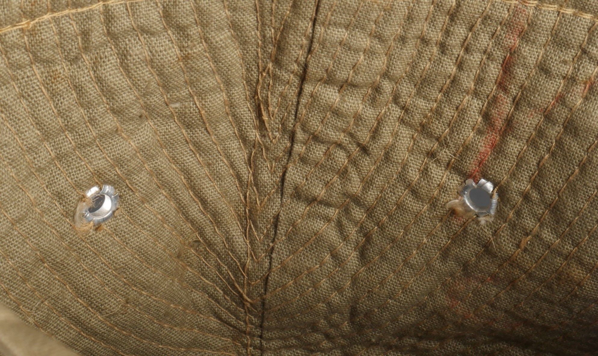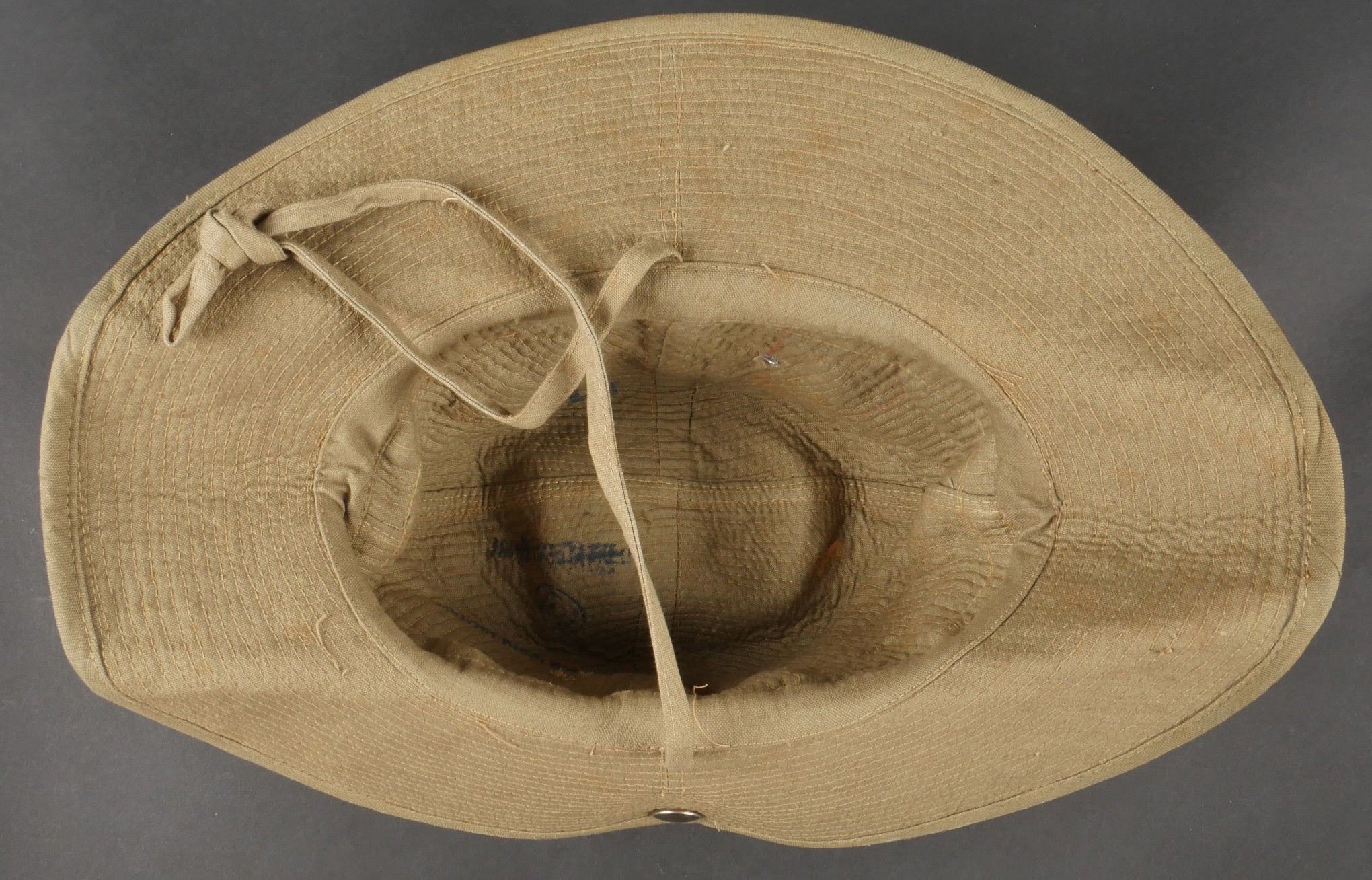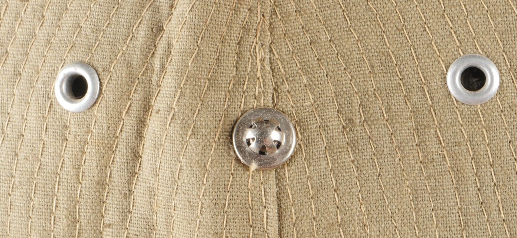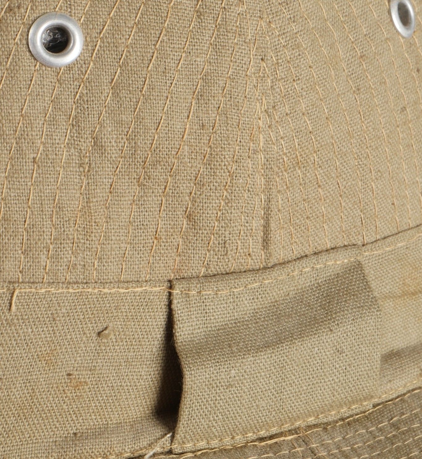 Regulation bush hat model 1949, made in the Far East. This hat has the particularity of being marked by the Indochinese manufacturer MINH KHOM, size 59. The large functional snap in good condition is typical of local Indochinese manufacture. Chinstrap present. Brand new from stock, never worn. Regulation 1949 bush hat made in the Far East. This hat bears an Indochinese maker mark MINH KHOM size 59. The large snap fastener functional and in good condition is characteristic of local Indochinese manufacture. Chinstrap present. Mint unissued stock never worn.
