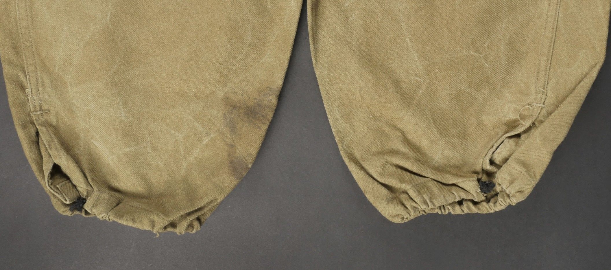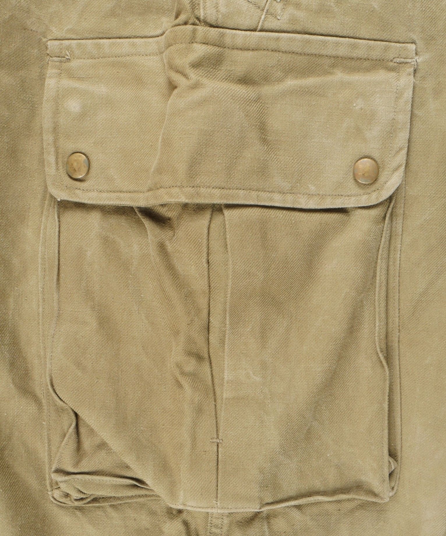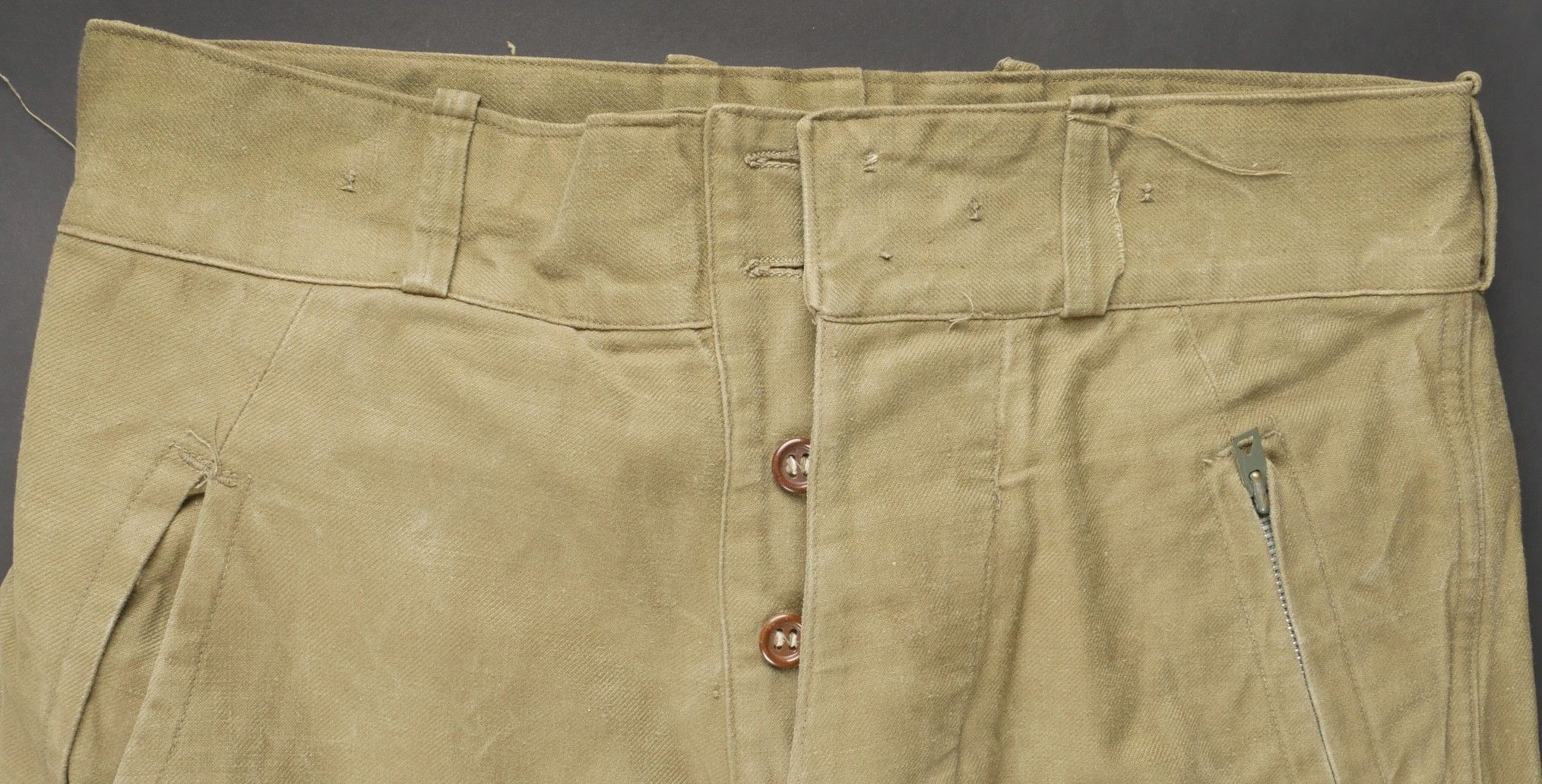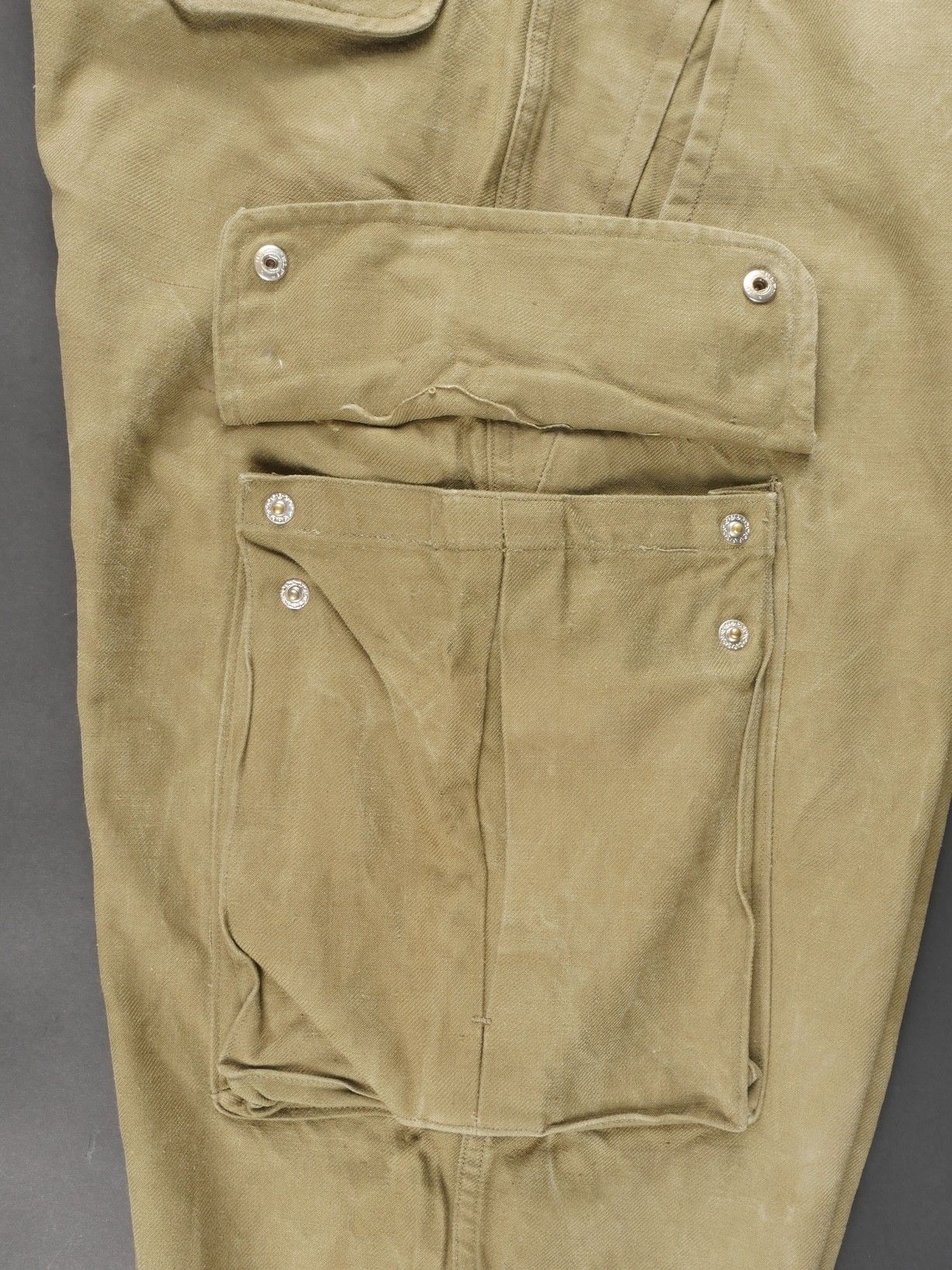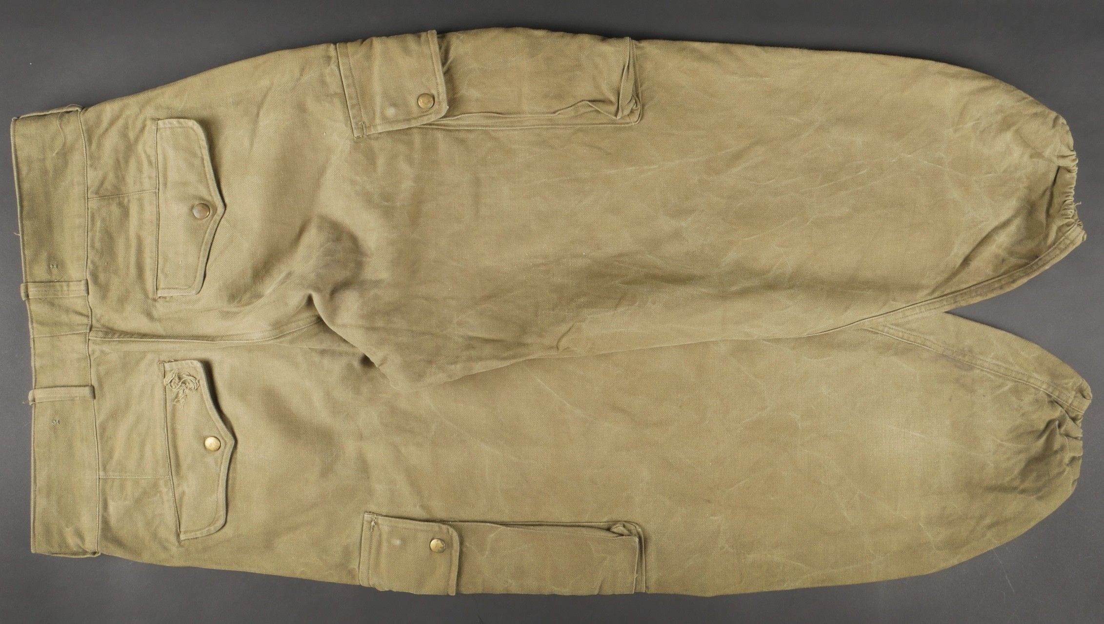 TAP 47 trousers made in khaki canvas, functional press studs on the small model, branded zip. Manufacturer's stamps and Army stamps present but illegible. One fly button missing and 2 sewn back. Legs tightened with elastic. One tear on back pocket flap. TAP 47 trousers in khaki canvas. Small model snaps functional. Eclair brand zipper. Maker stamps and Army marks present but illegible. One fly button missing and two re sewn. Ankles tightened with elastic. One snag on a rear pocket flap.