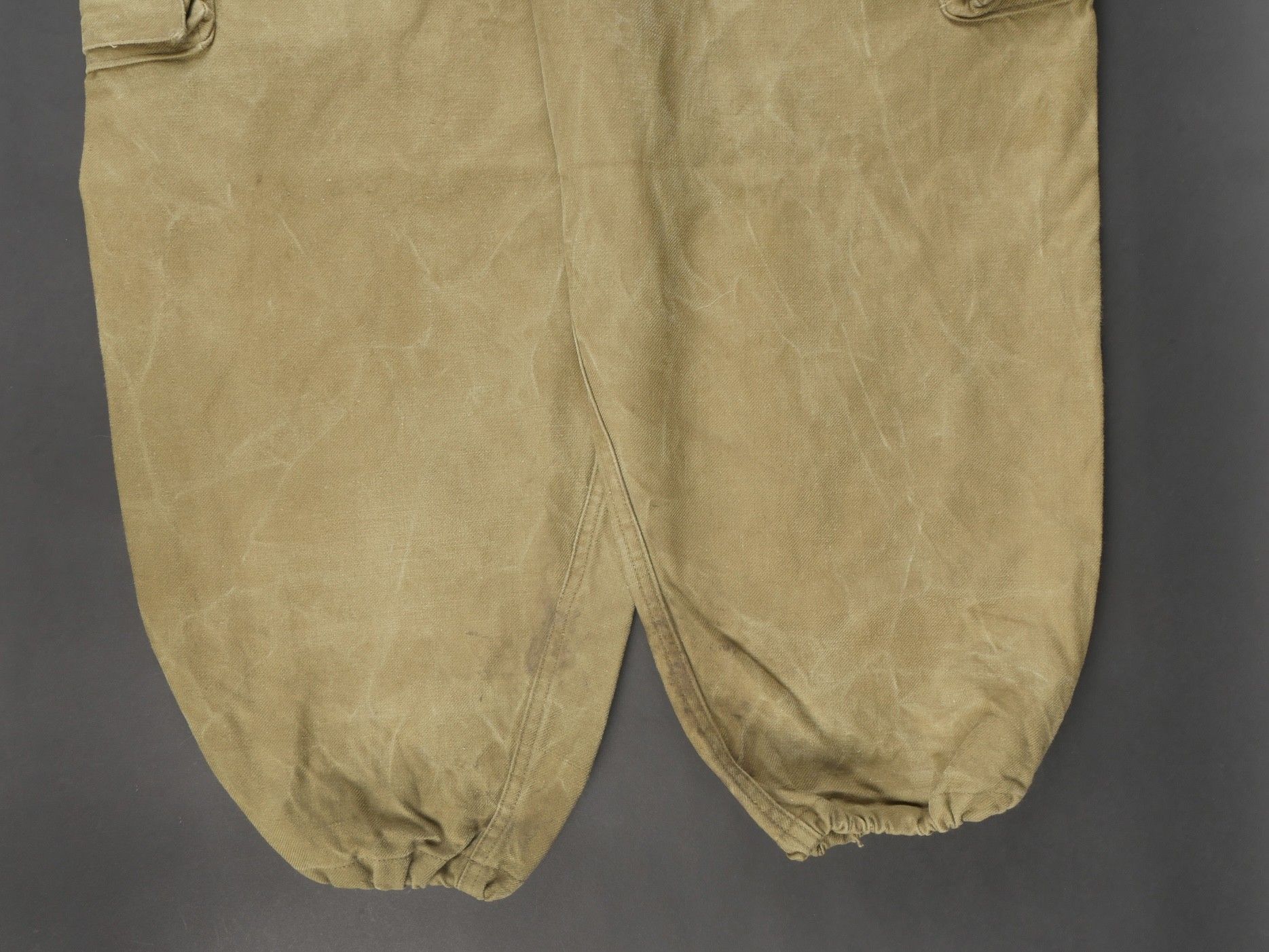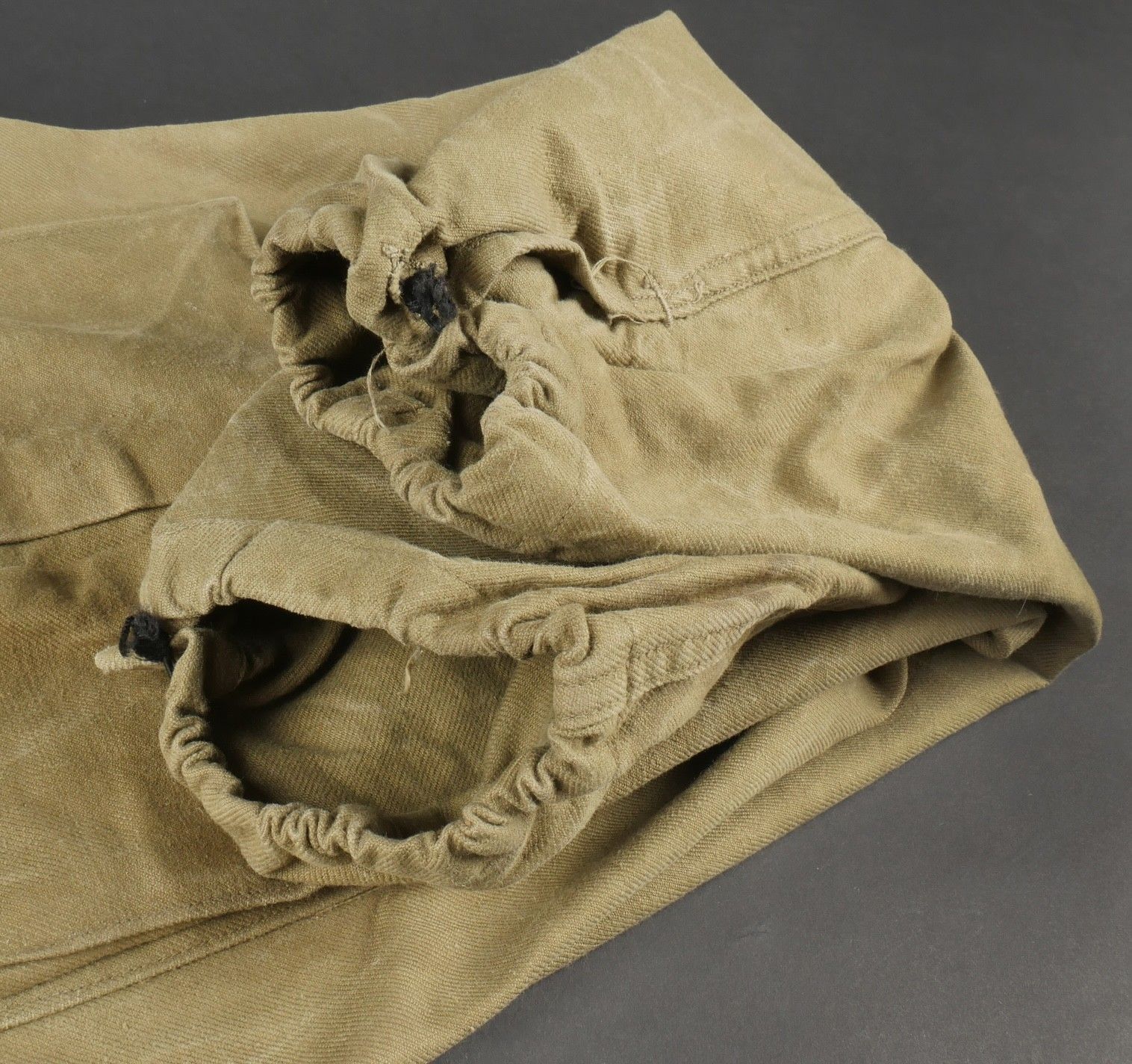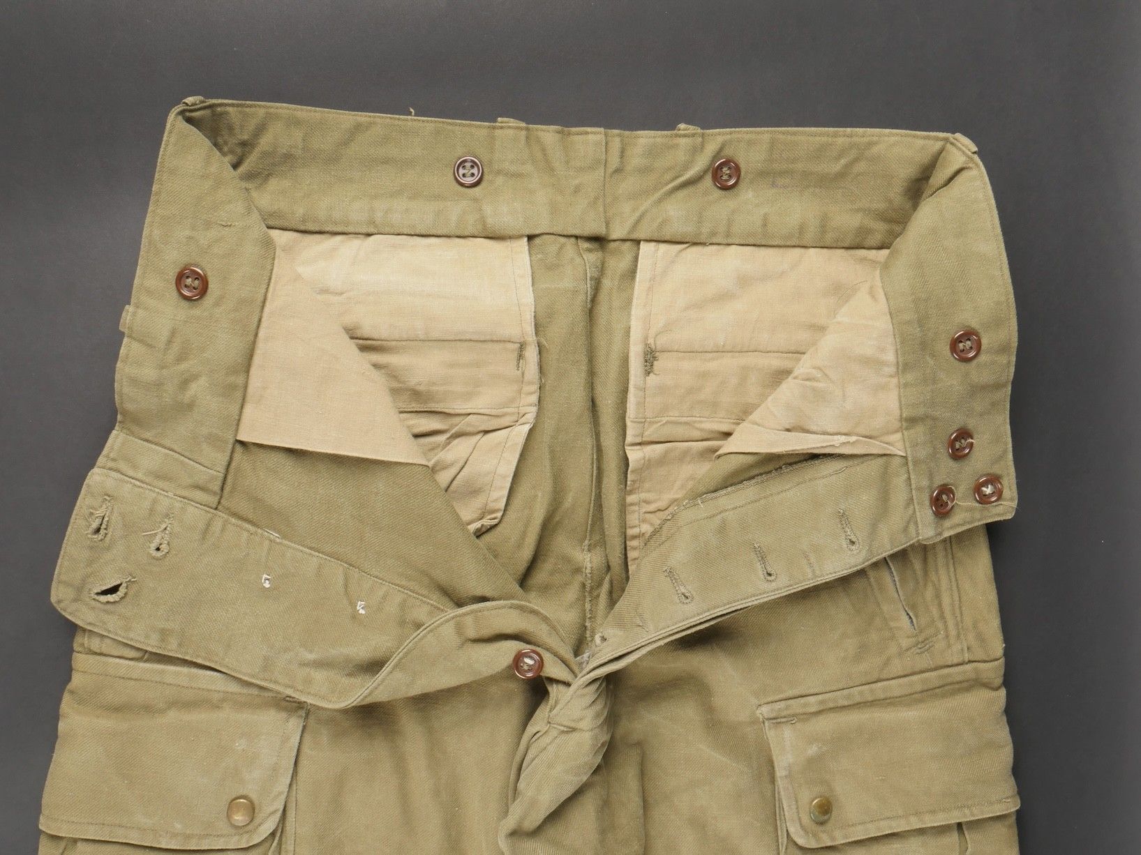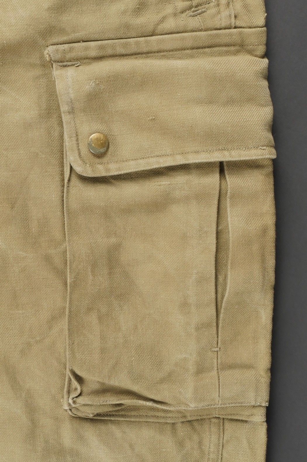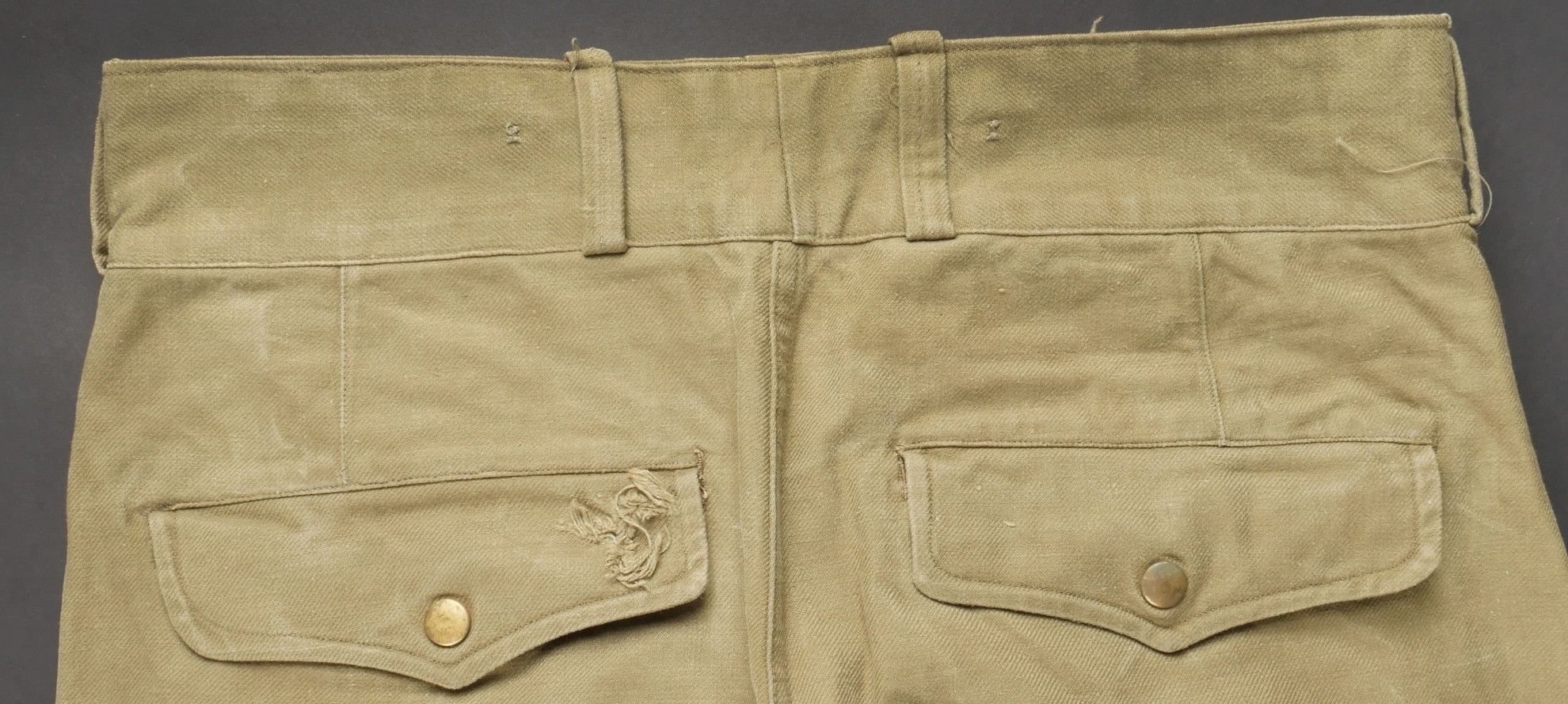 TAP 47 trousers made in khaki canvas, functional press studs on the small model, branded zip. Manufacturer's stamps and Army stamps present but illegible. One fly button missing and 2 sewn back. Legs tightened with elastic. One tear on back pocket flap. TAP 47 trousers in khaki canvas. Small model snaps functional. Eclair brand zipper. Maker stamps and Army marks present but illegible. One fly button missing and two re sewn. Ankles tightened with elastic. One snag on a rear pocket flap.