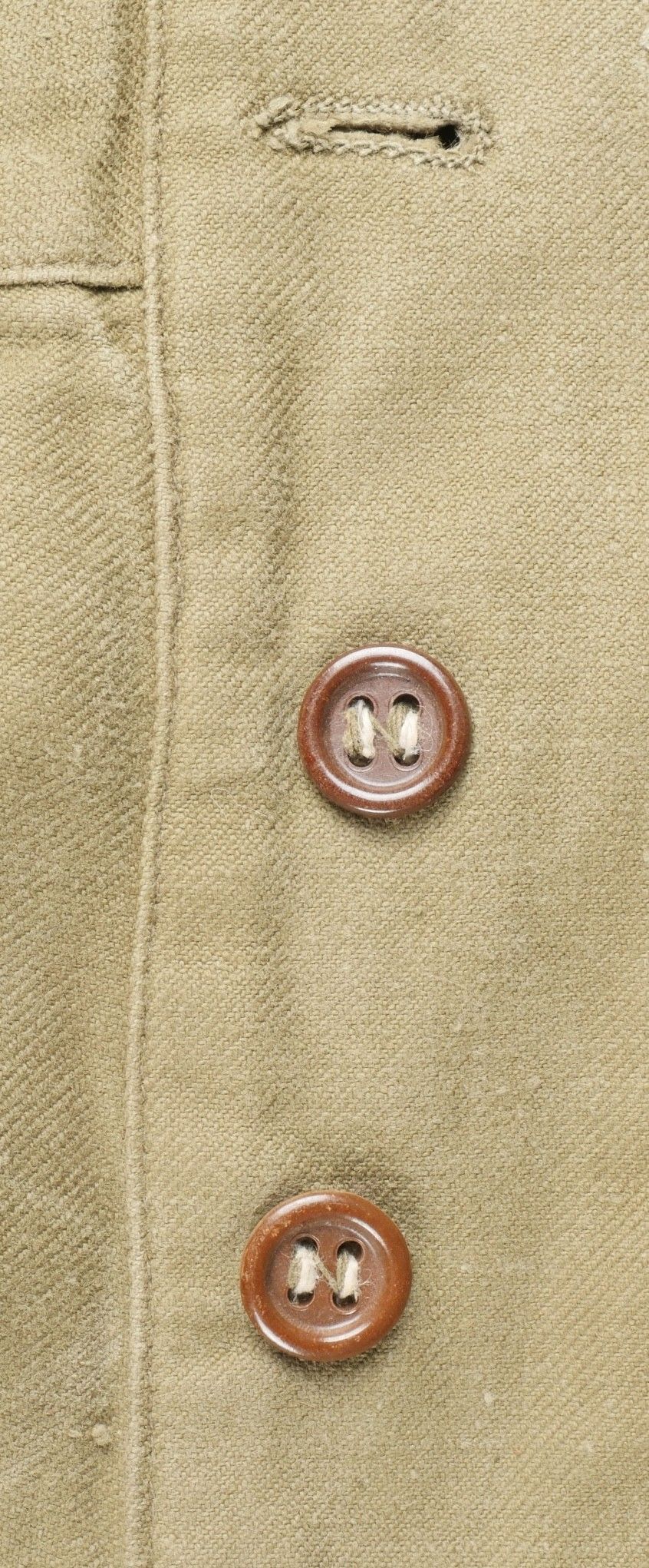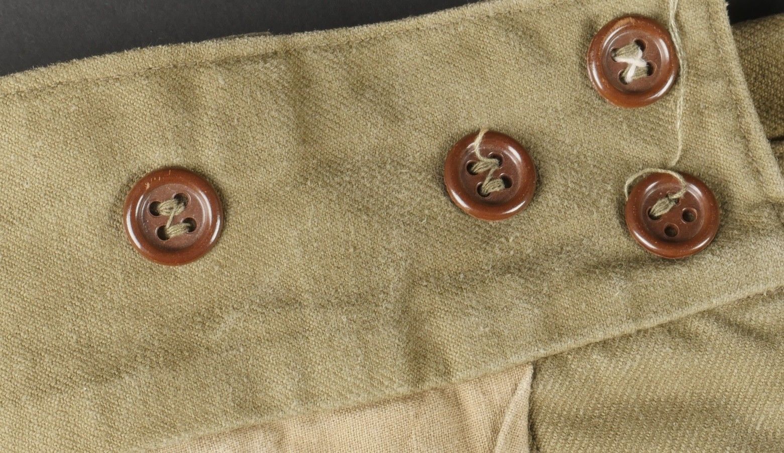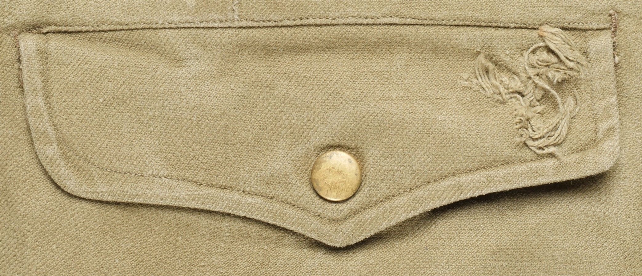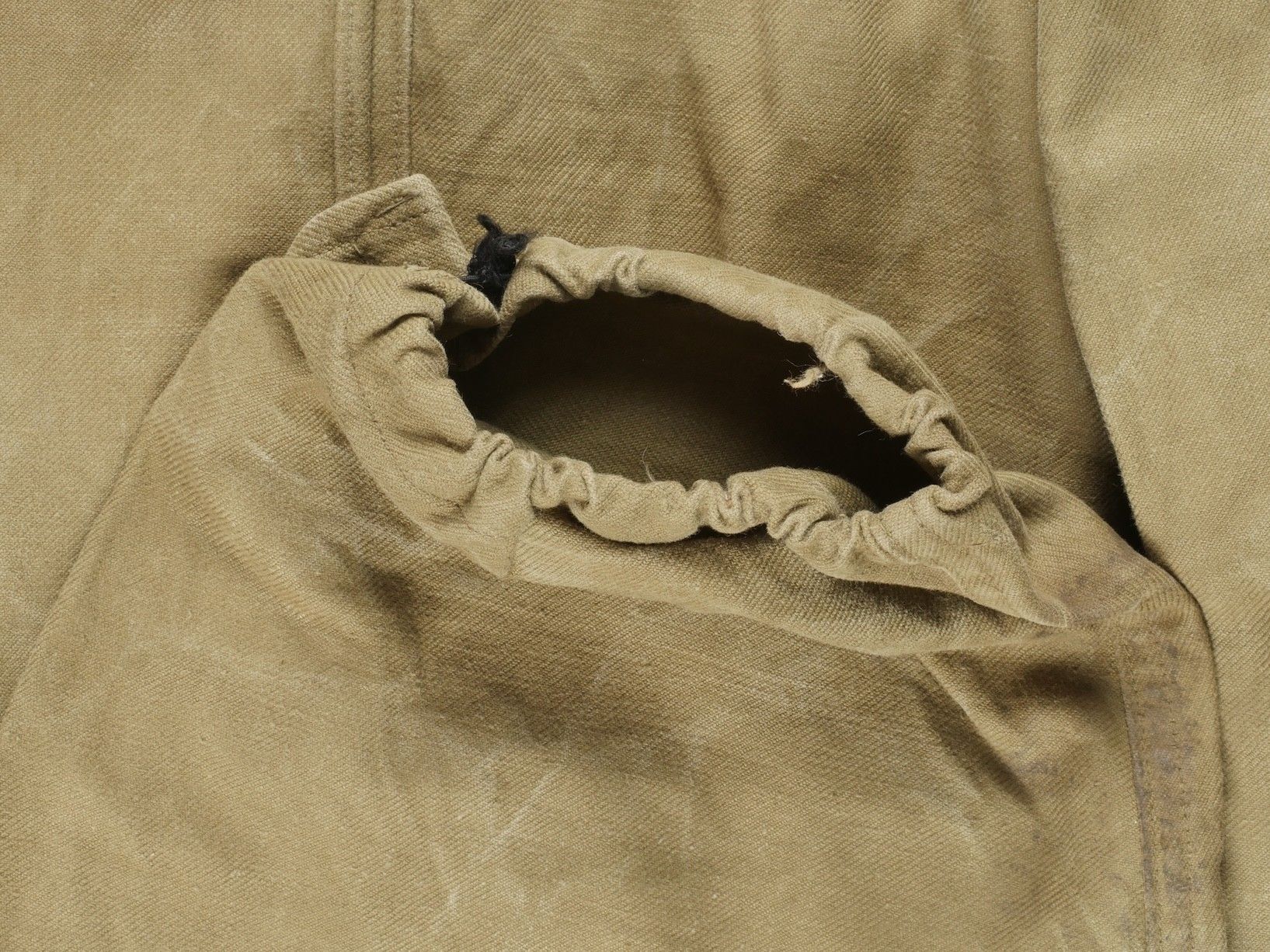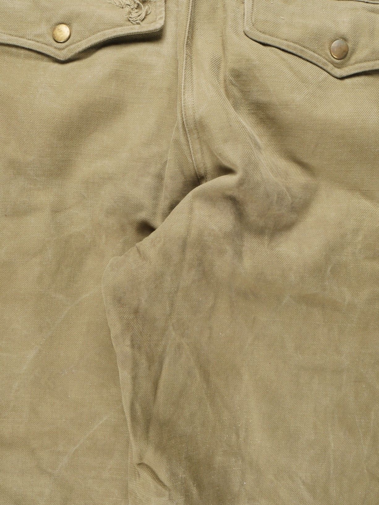 TAP 47 trousers made in khaki canvas, functional press studs on the small model, branded zip. Manufacturer's stamps and Army stamps present but illegible. One fly button missing and 2 sewn back. Legs tightened with elastic. One tear on back pocket flap. TAP 47 trousers in khaki canvas. Small model snaps functional. Eclair brand zipper. Maker stamps and Army marks present but illegible. One fly button missing and two re sewn. Ankles tightened with elastic. One snag on a rear pocket flap.
