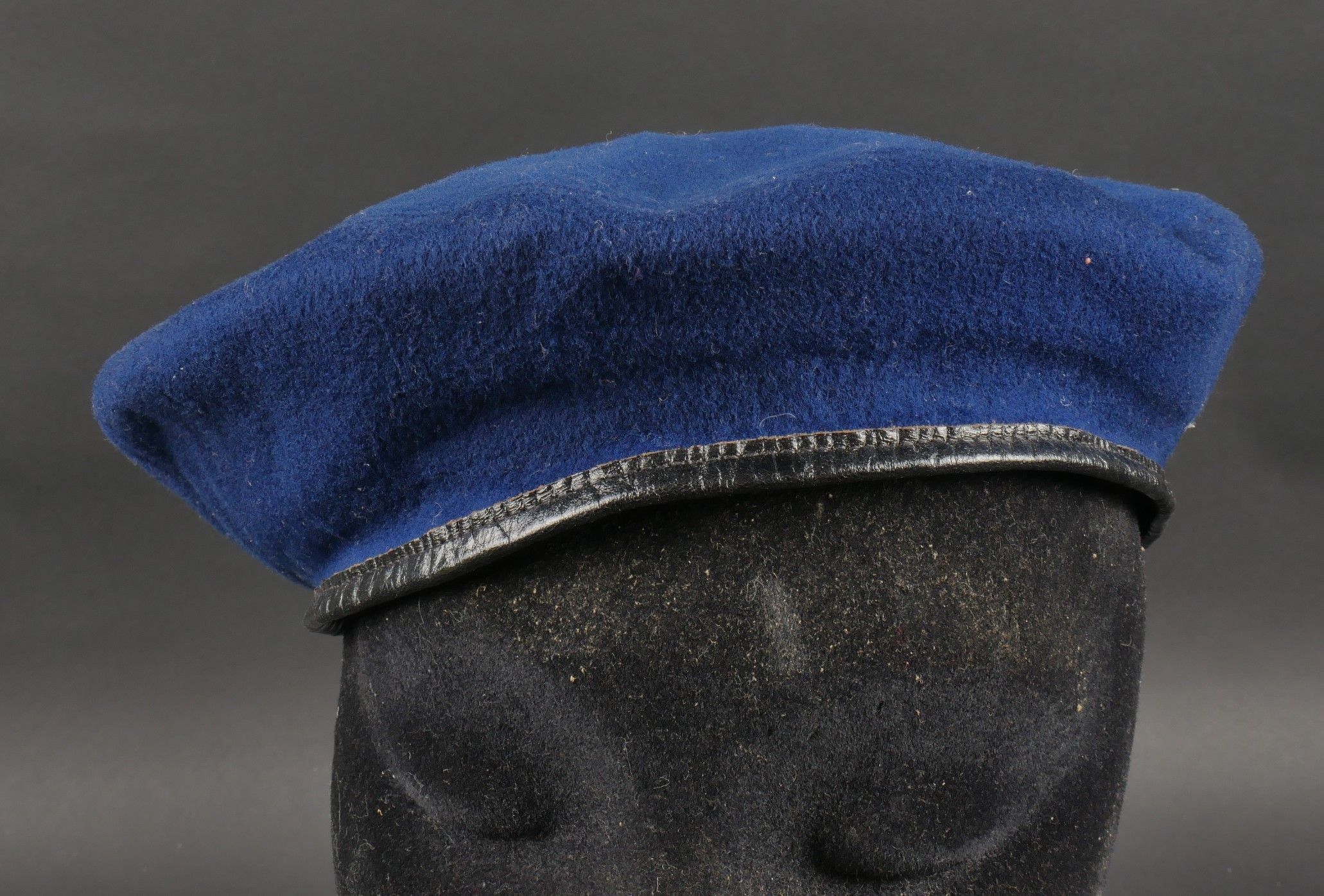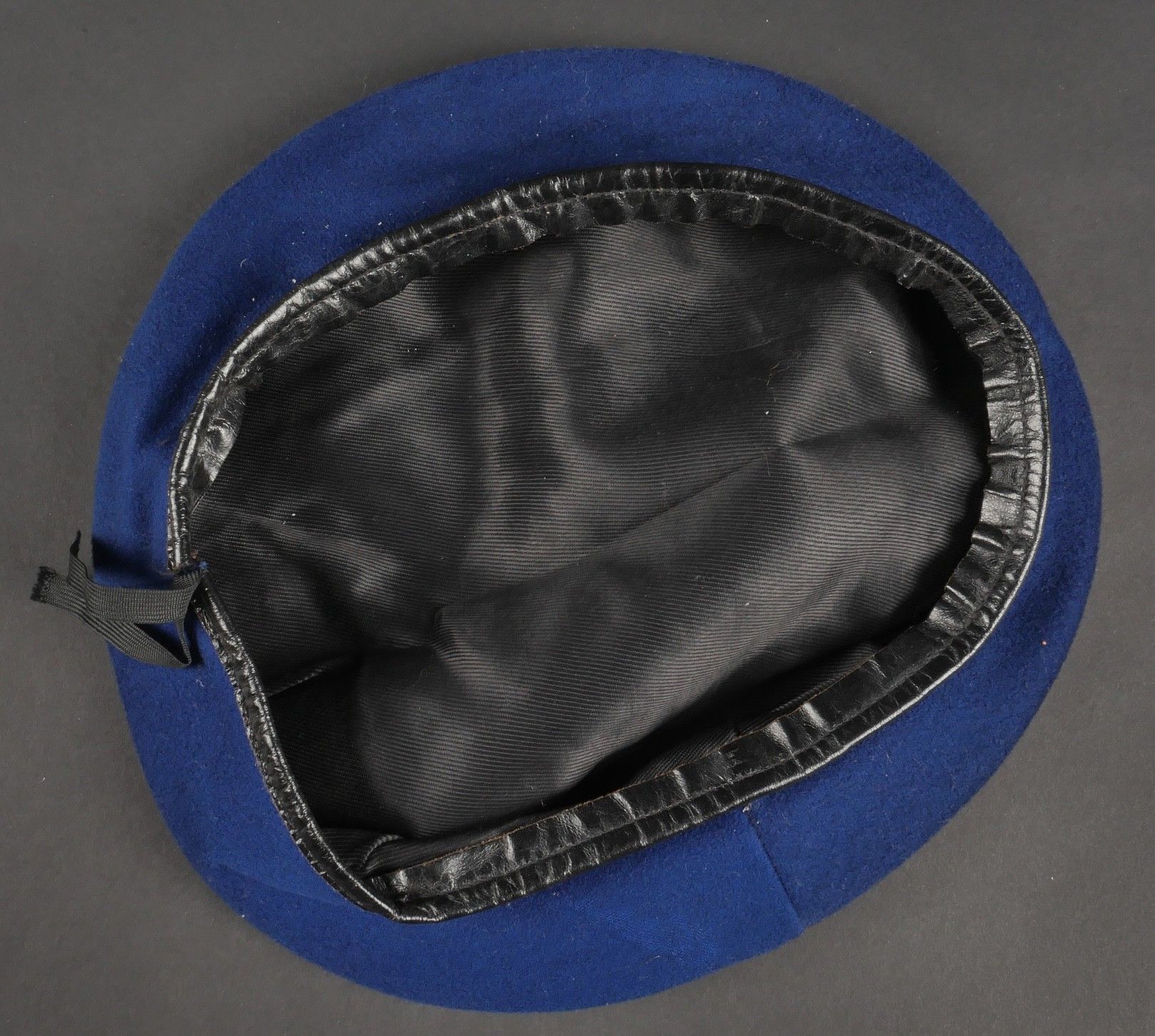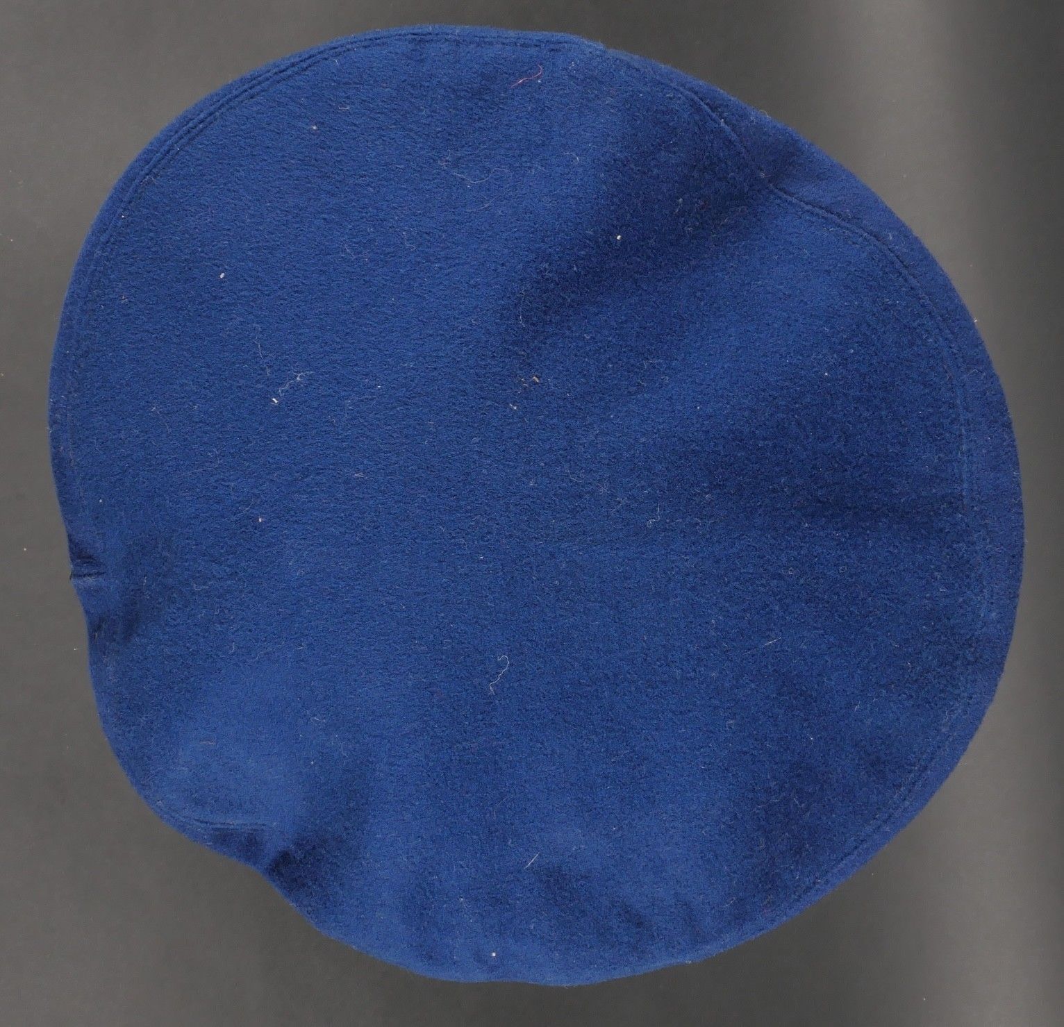 Blue Roy commando beret in three parts, made by a tailor, Model 46. Black cotton lining. Black leather trim. No ventilation eyelets, no badge holder. Royal blue beret commando type three piece tailor made Model 46. Black cotton lining. Black leather binding. No vent eyelets no badge mount.