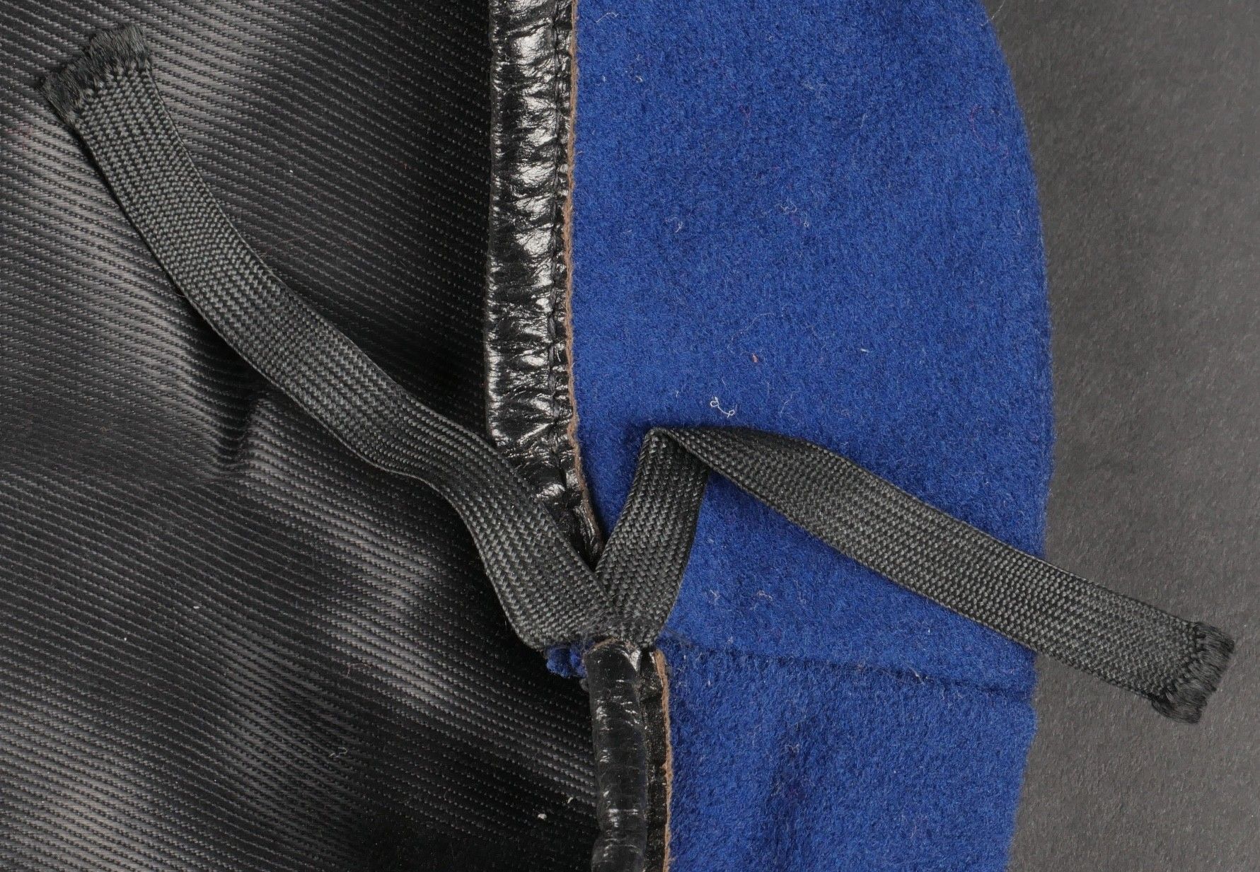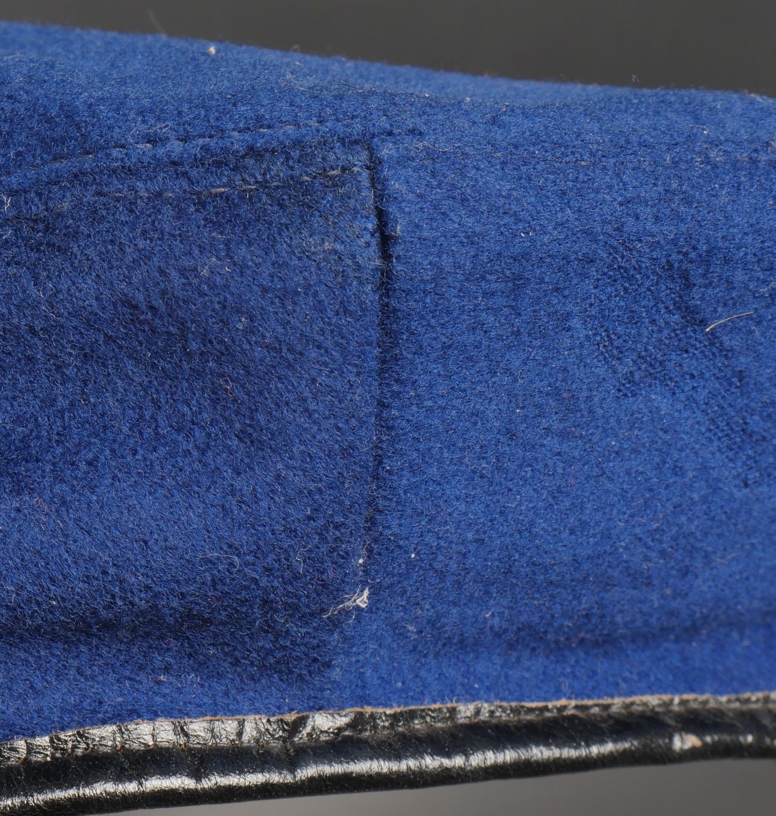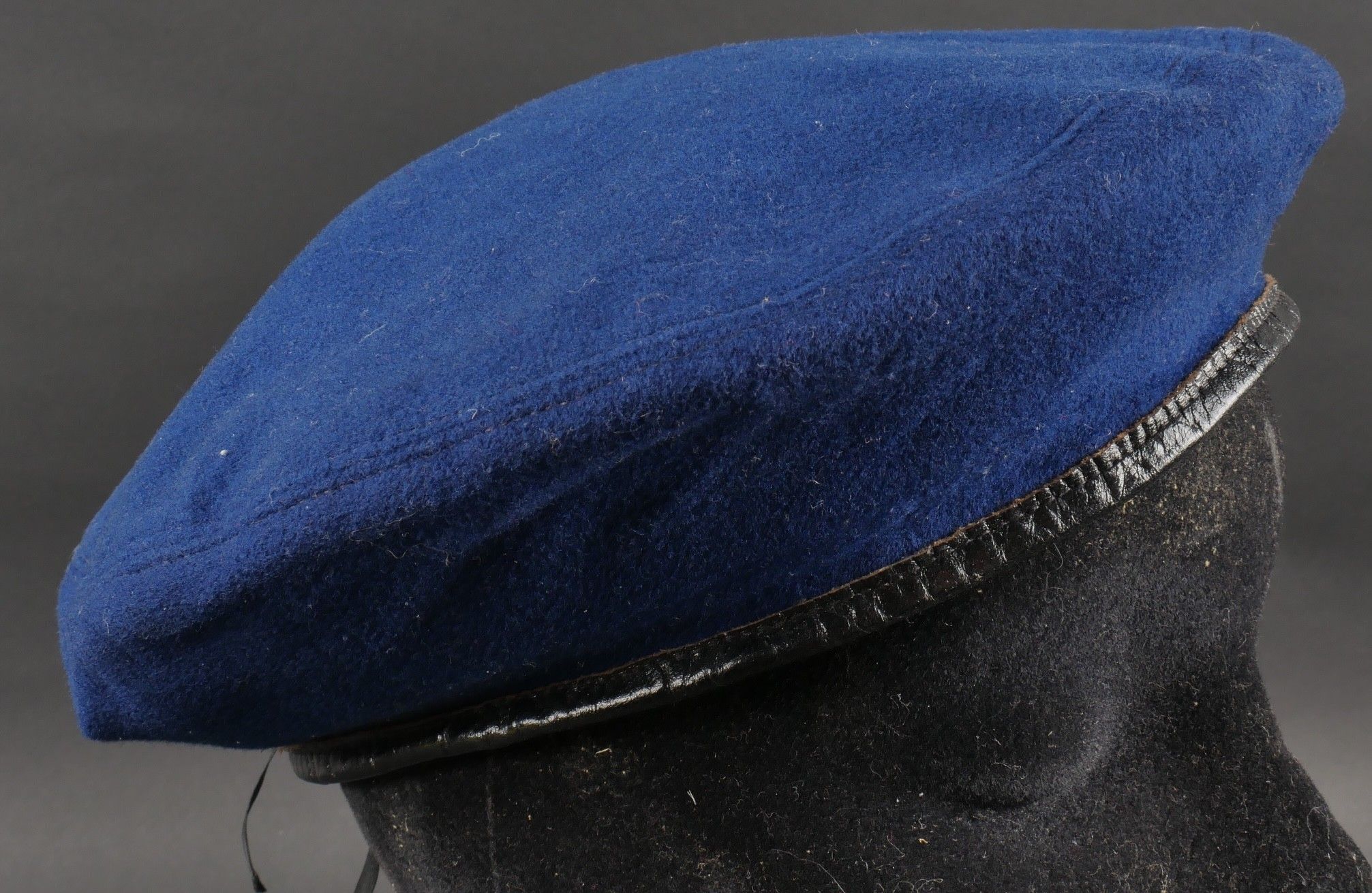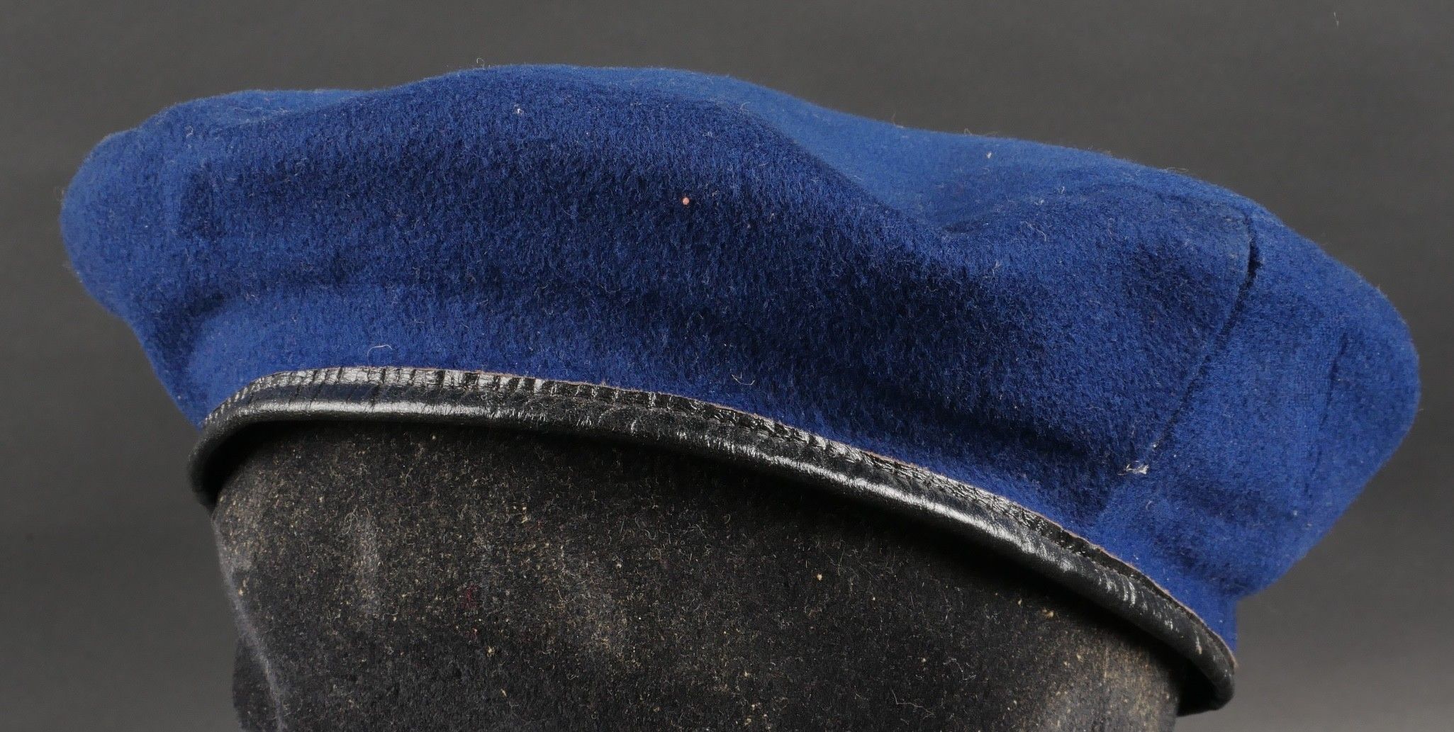 Blue Roy commando beret in three parts, made by a tailor, Model 46. Black cotton lining. Black leather trim. No ventilation eyelets, no badge holder. Royal blue beret commando type three piece tailor made Model 46. Black cotton lining. Black leather binding. No vent eyelets no badge mount.