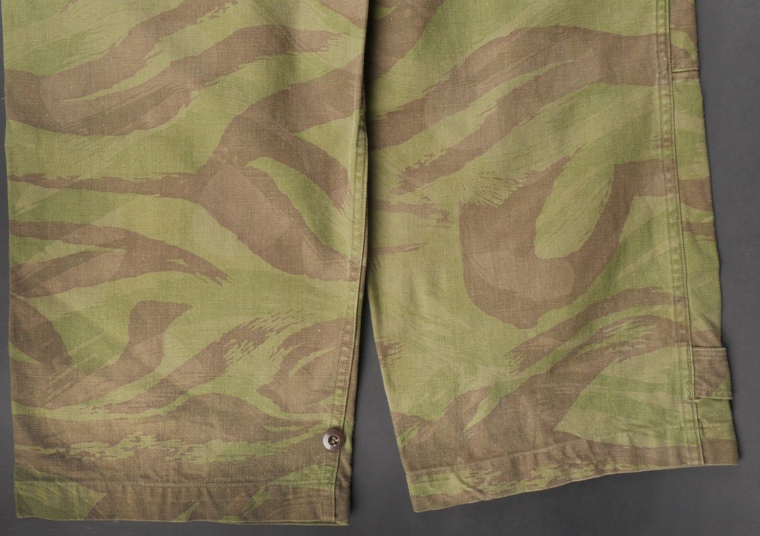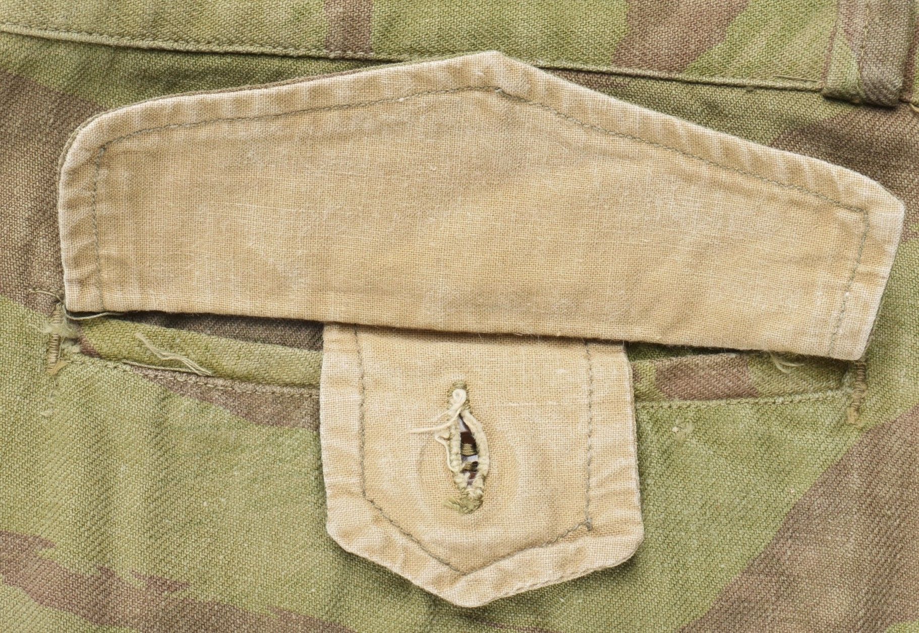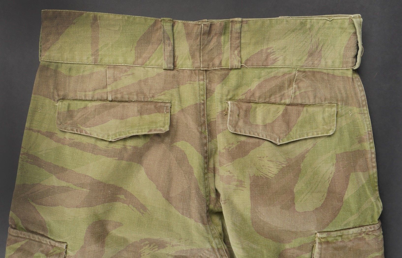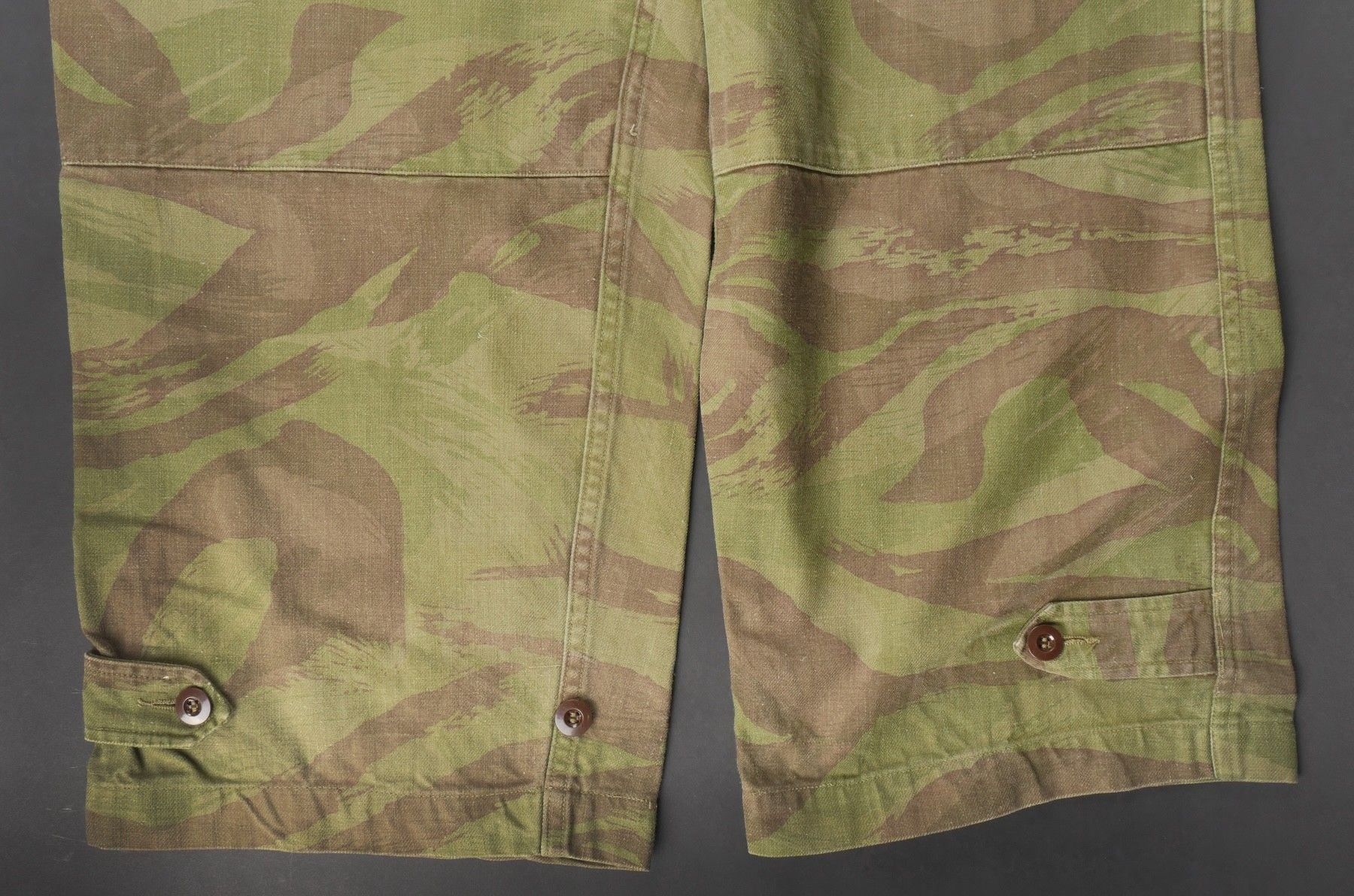 TTA 4753 trousers. Trousers fastened by a series of buttons, the last two of which are visible, fully camouflaged in type 53 canvas, unbleached cotton lining, manufacturer and size markings illegible. Original sewn leg straps. Trousers worn but colours still very bright. TTA 47 53 trousers. Button fly with the last two buttons exposed fully camouflaged in type 53 cloth with natural cotton lining maker and size marks illegible. Original ankle tightening tabs sewn on. Worn trousers but colours still bright.