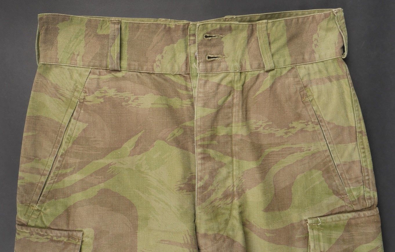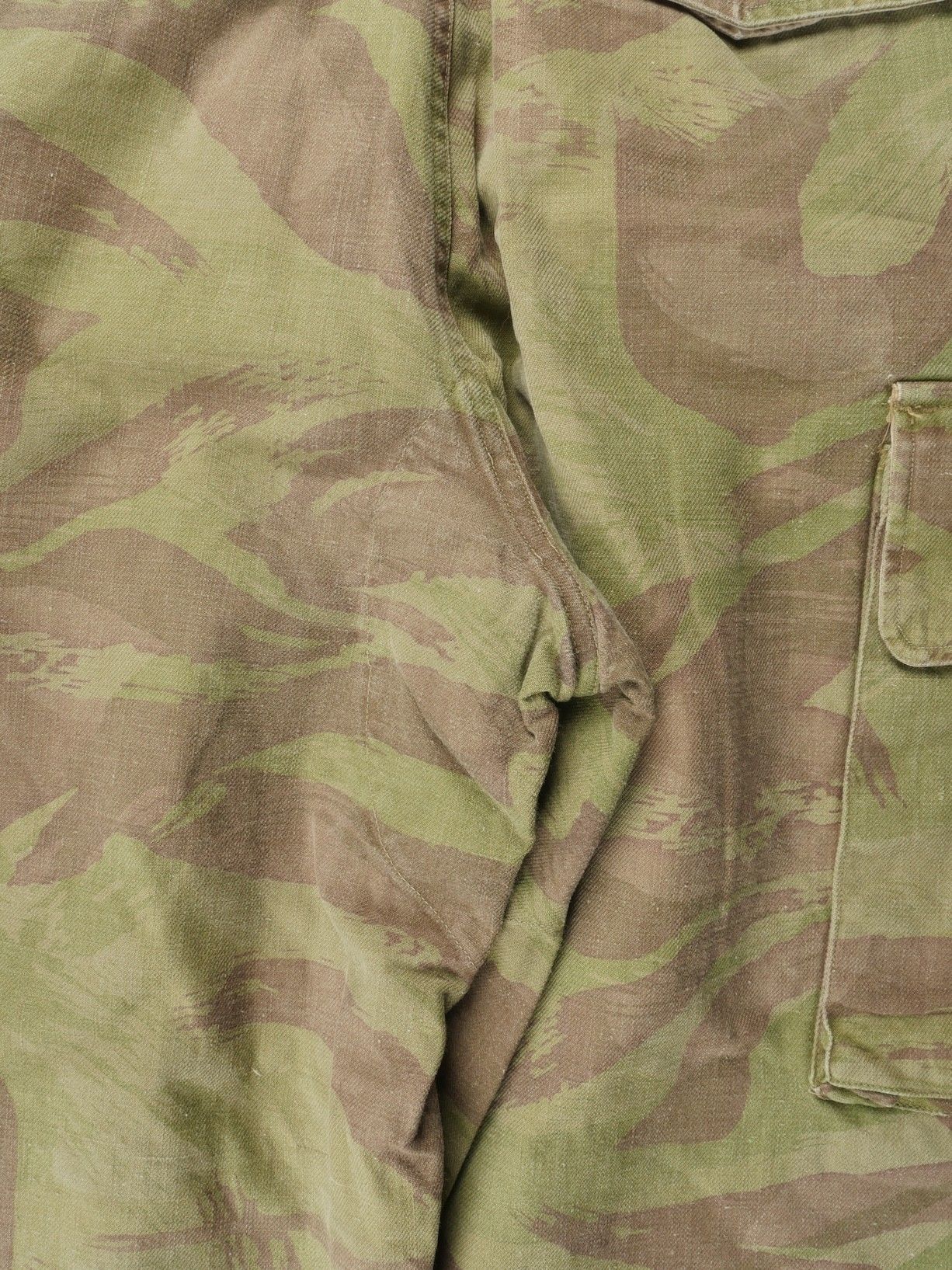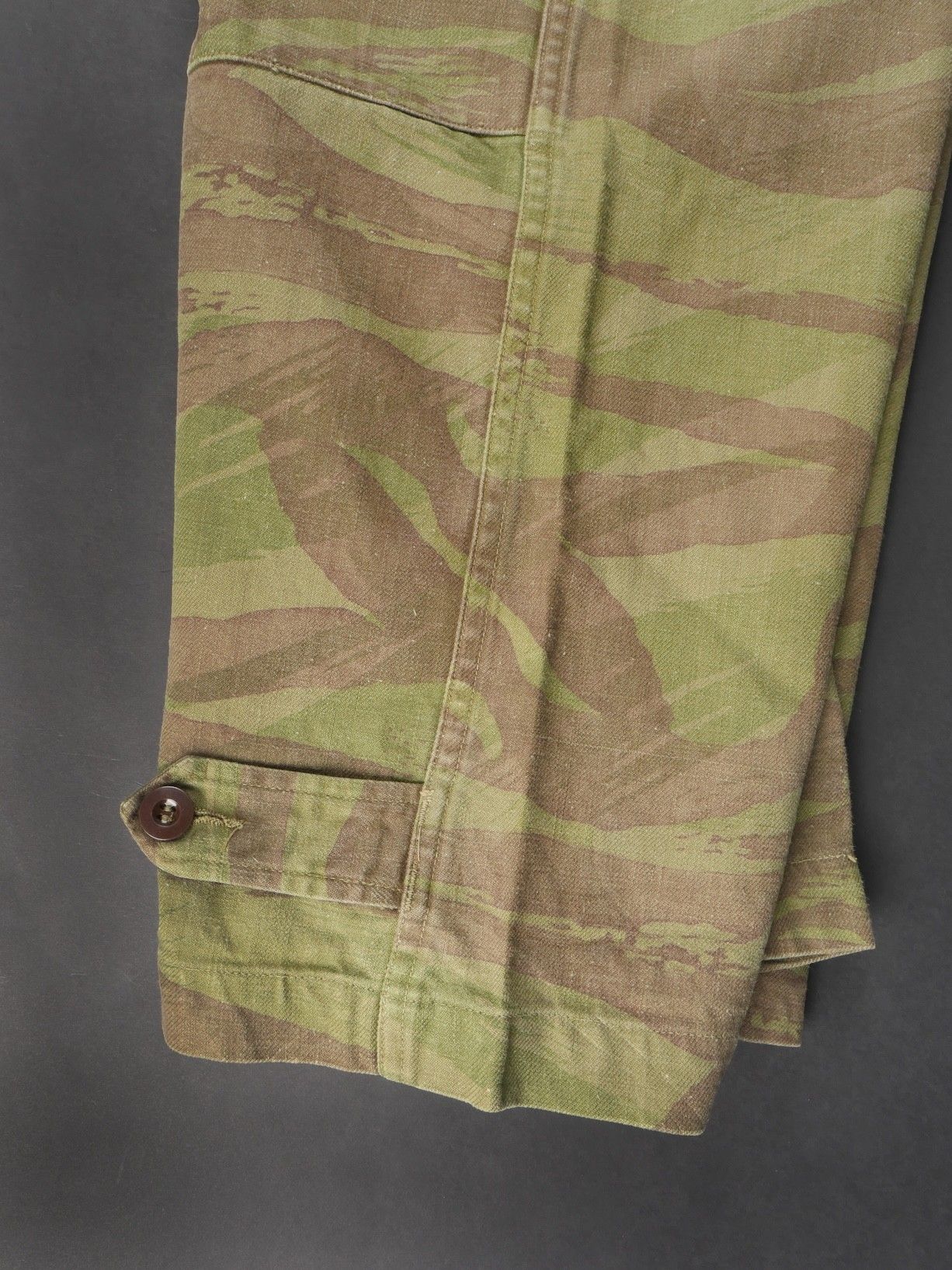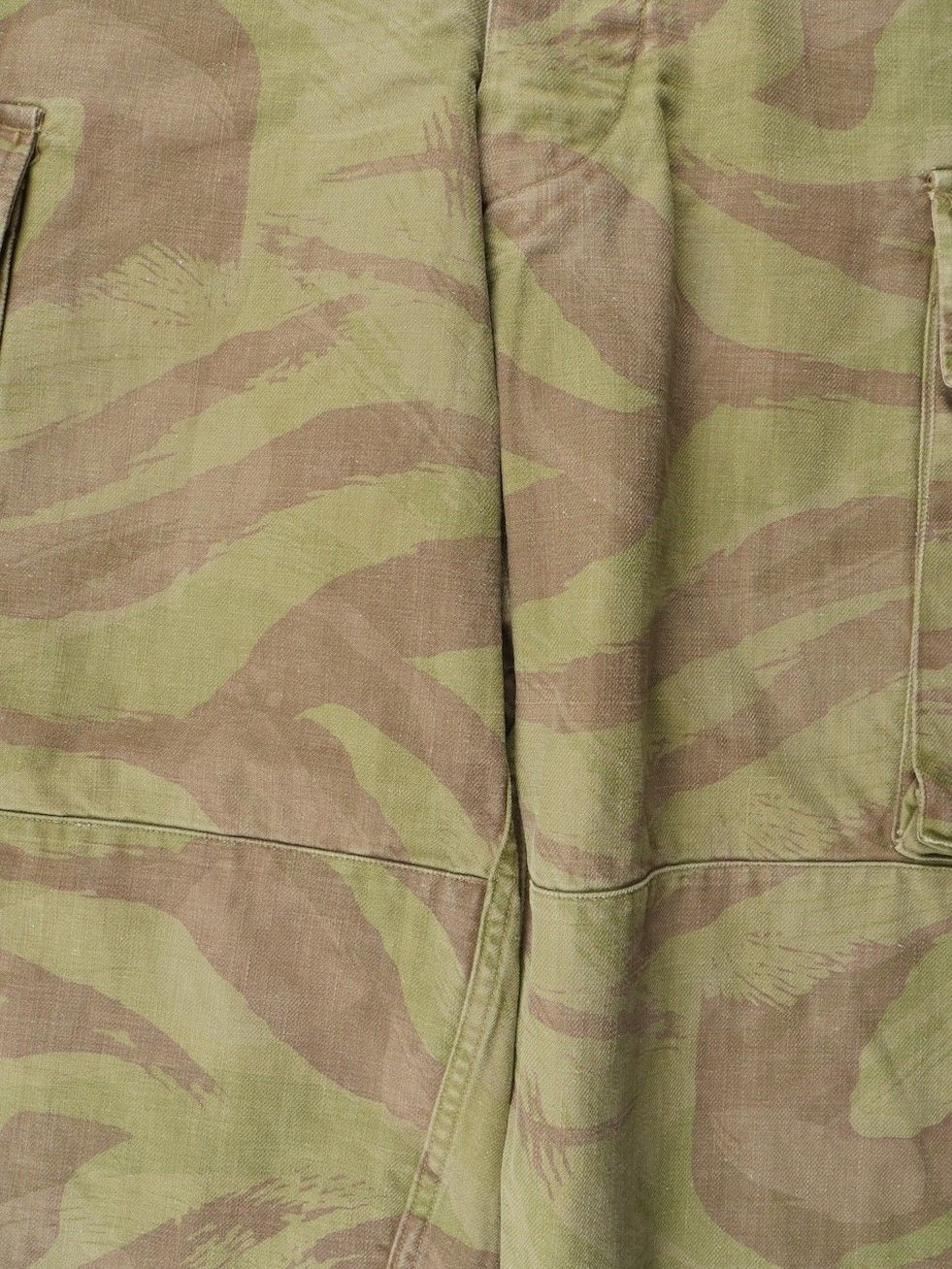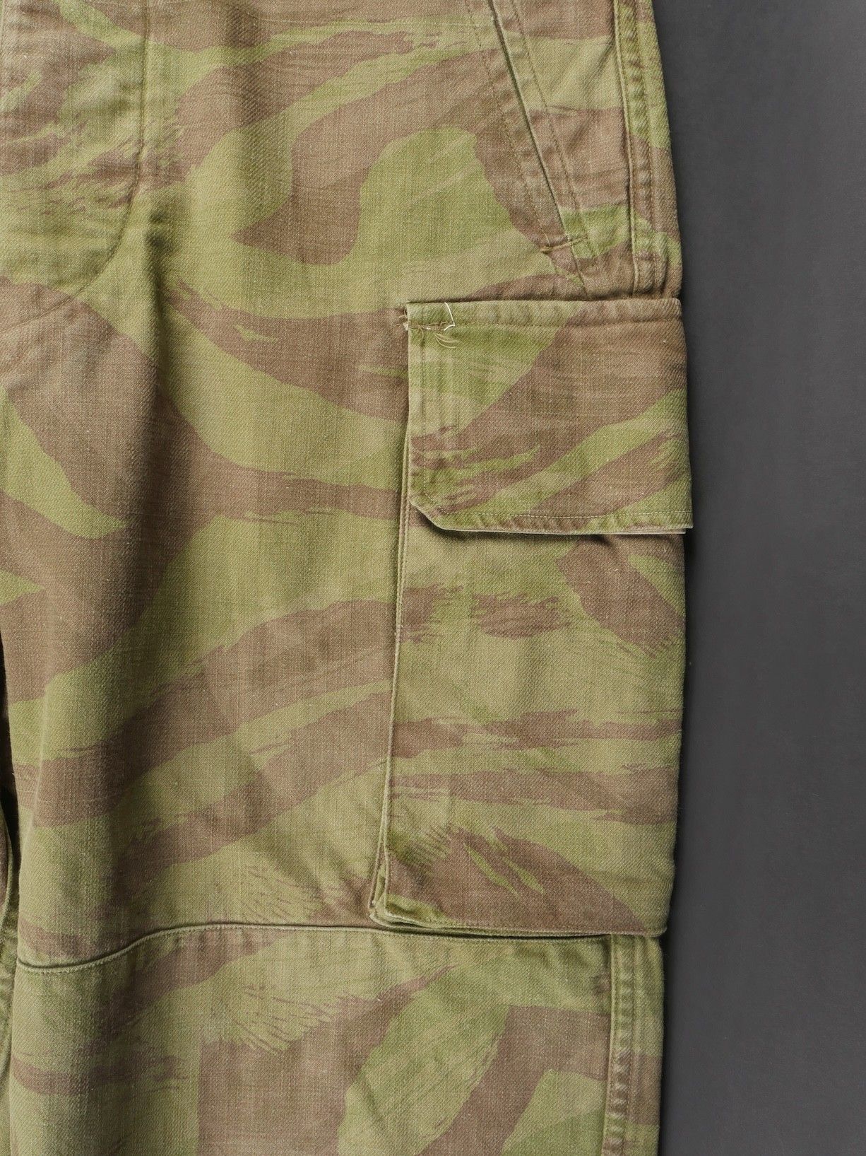 TTA 4753 trousers. Trousers fastened by a series of buttons, the last two of which are visible, fully camouflaged in type 53 canvas, unbleached cotton lining, manufacturer and size markings illegible. Original sewn leg straps. Trousers worn but colours still very bright. TTA 47 53 trousers. Button fly with the last two buttons exposed fully camouflaged in type 53 cloth with natural cotton lining maker and size marks illegible. Original ankle tightening tabs sewn on. Worn trousers but colours still bright.