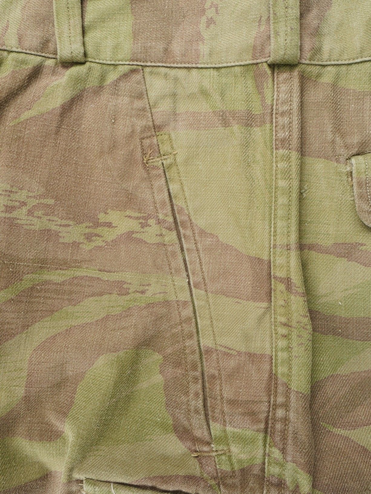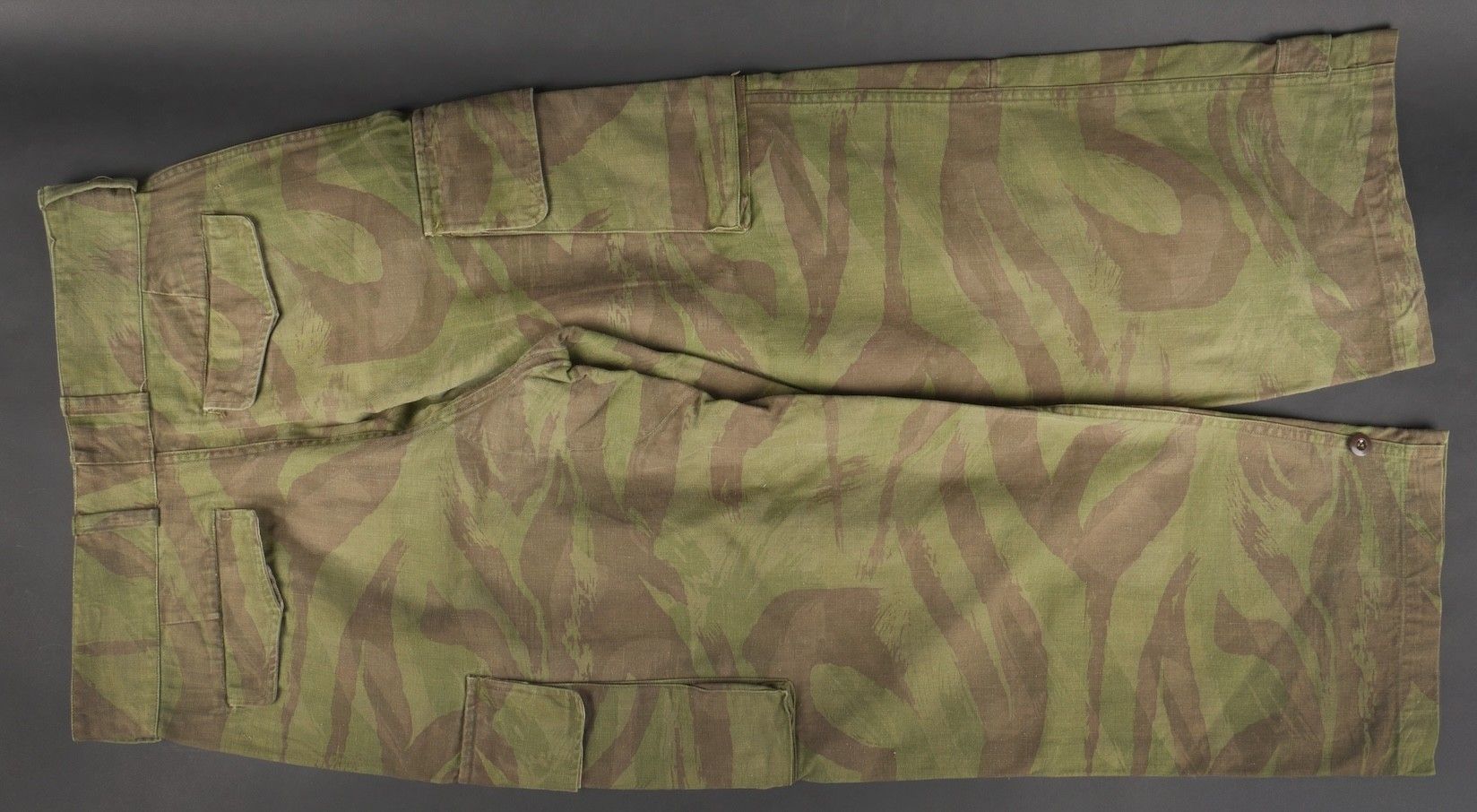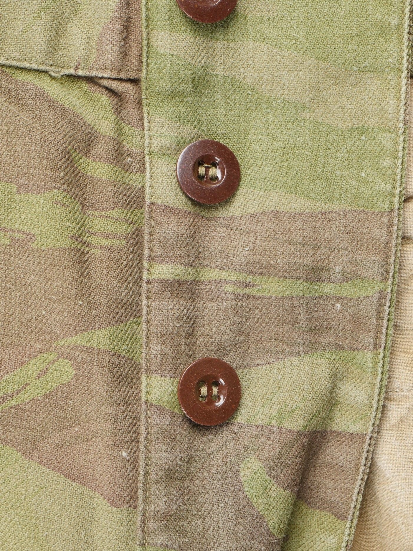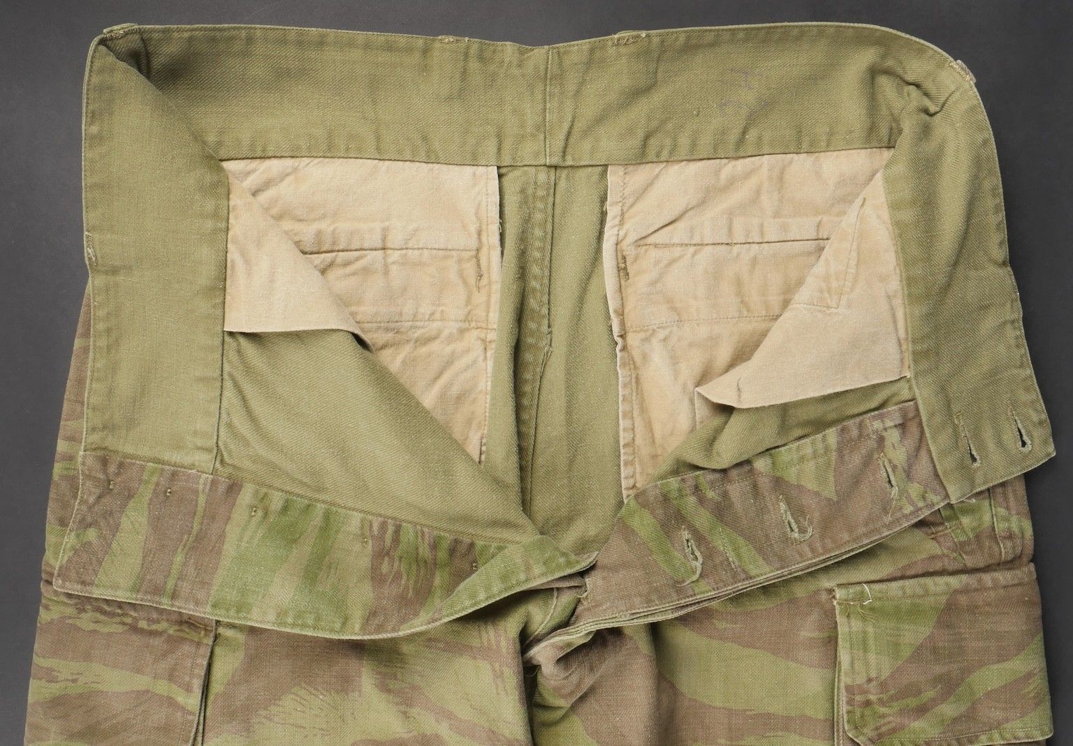 TTA 4753 trousers. Trousers fastened by a series of buttons, the last two of which are visible, fully camouflaged in type 53 canvas, unbleached cotton lining, manufacturer and size markings illegible. Original sewn leg straps. Trousers worn but colours still very bright. TTA 47 53 trousers. Button fly with the last two buttons exposed fully camouflaged in type 53 cloth with natural cotton lining maker and size marks illegible. Original ankle tightening tabs sewn on. Worn trousers but colours still bright.