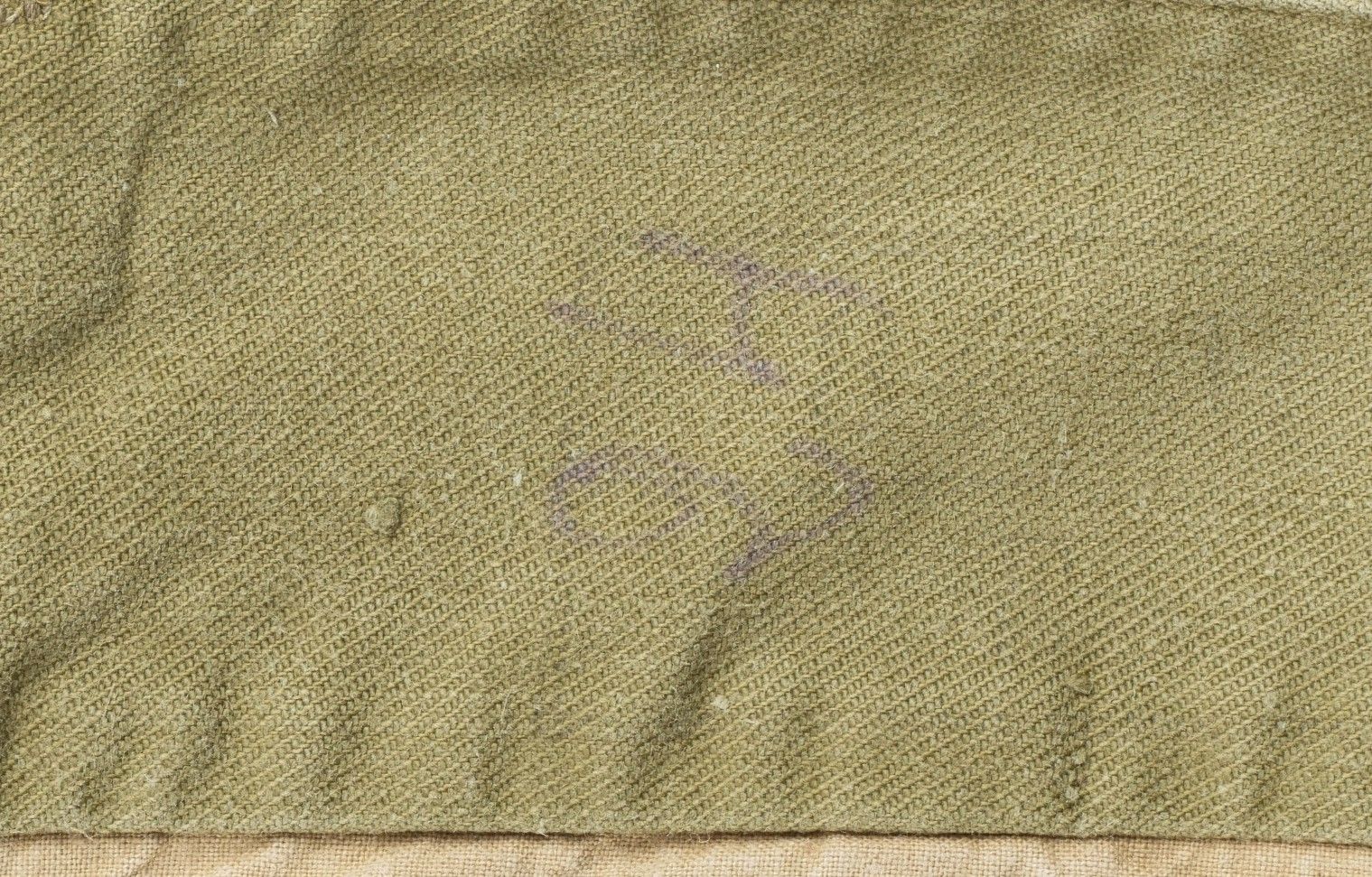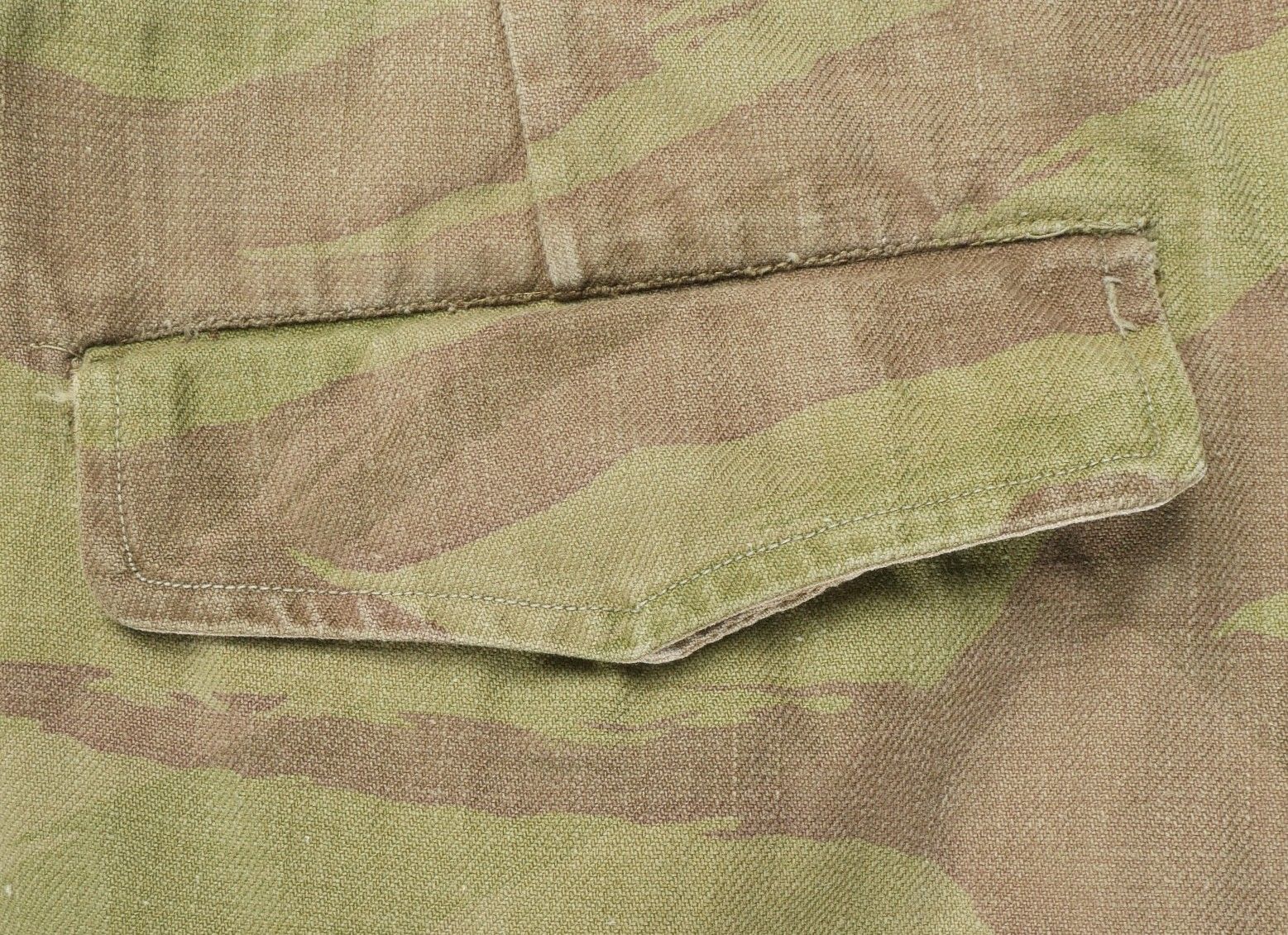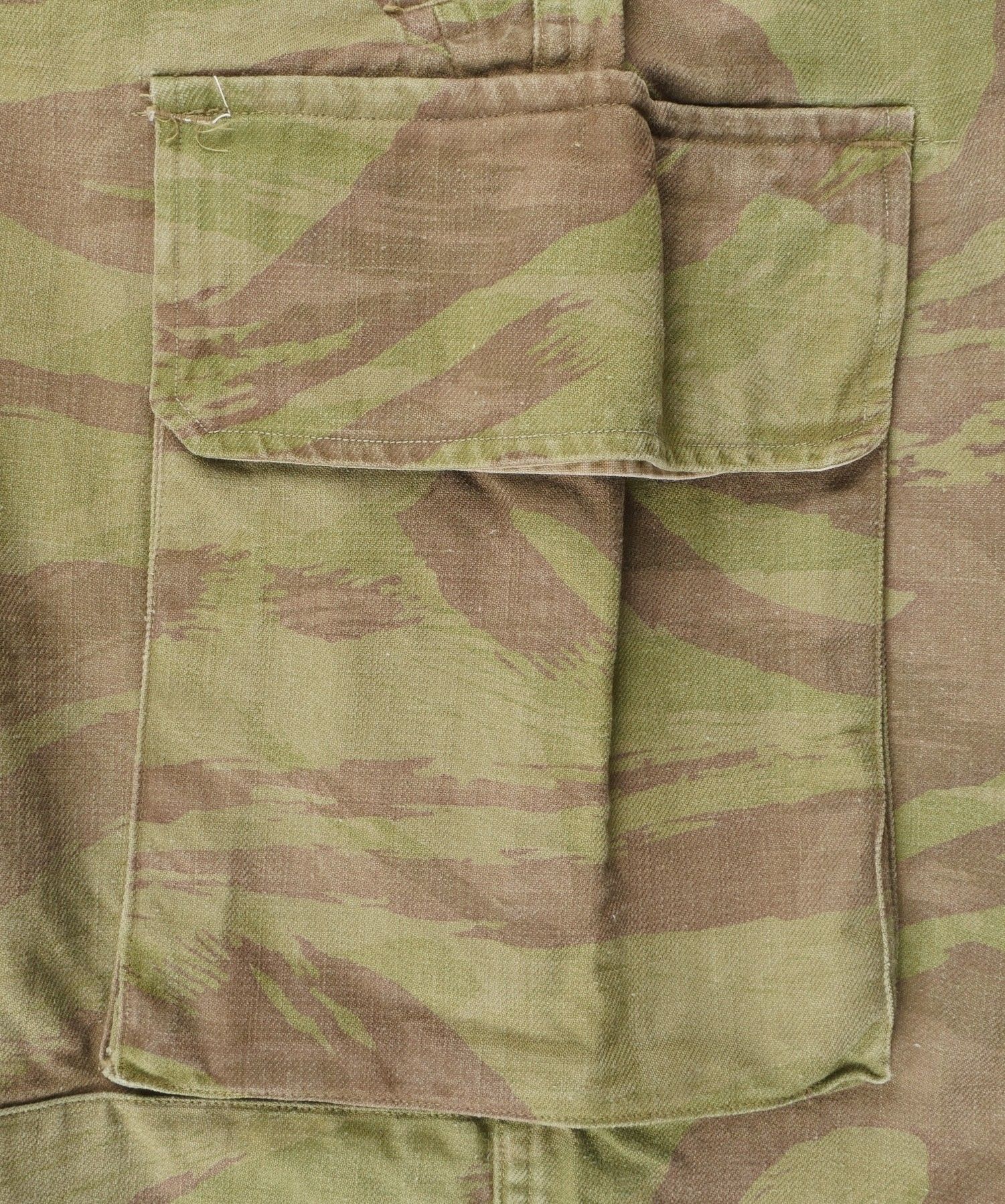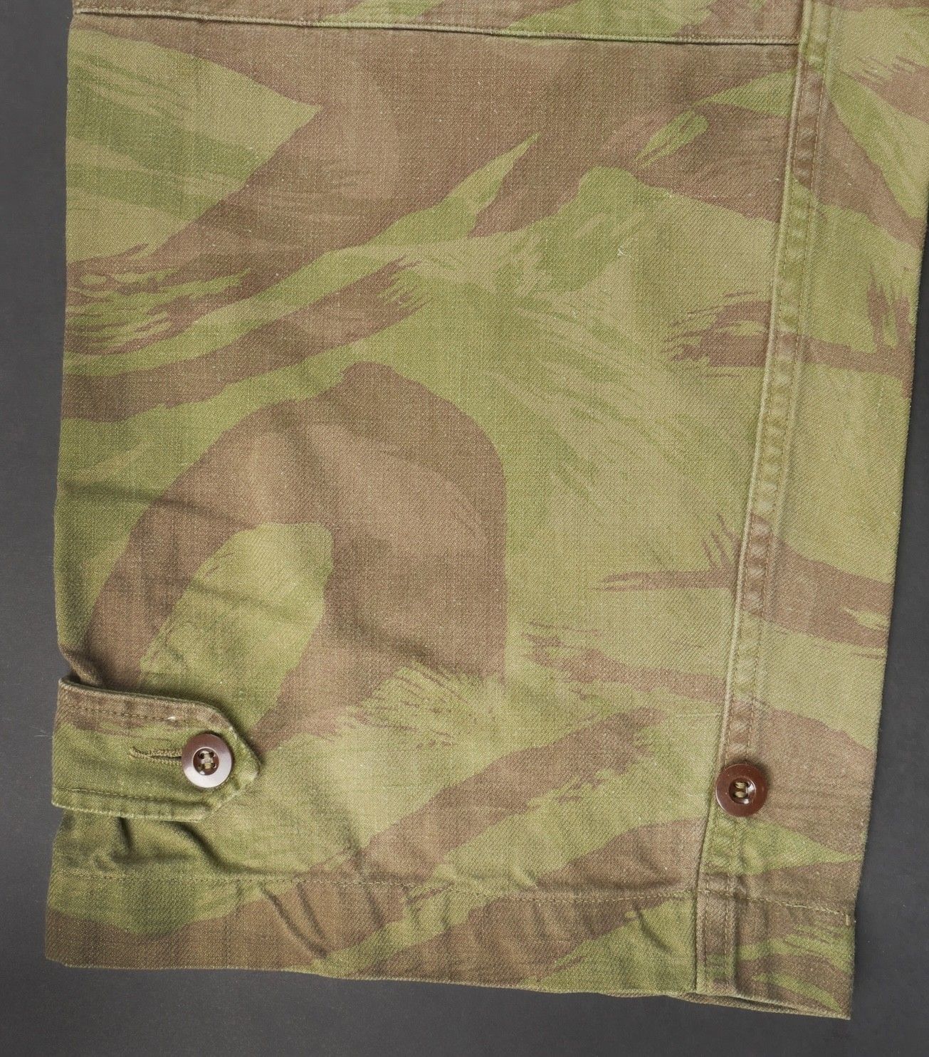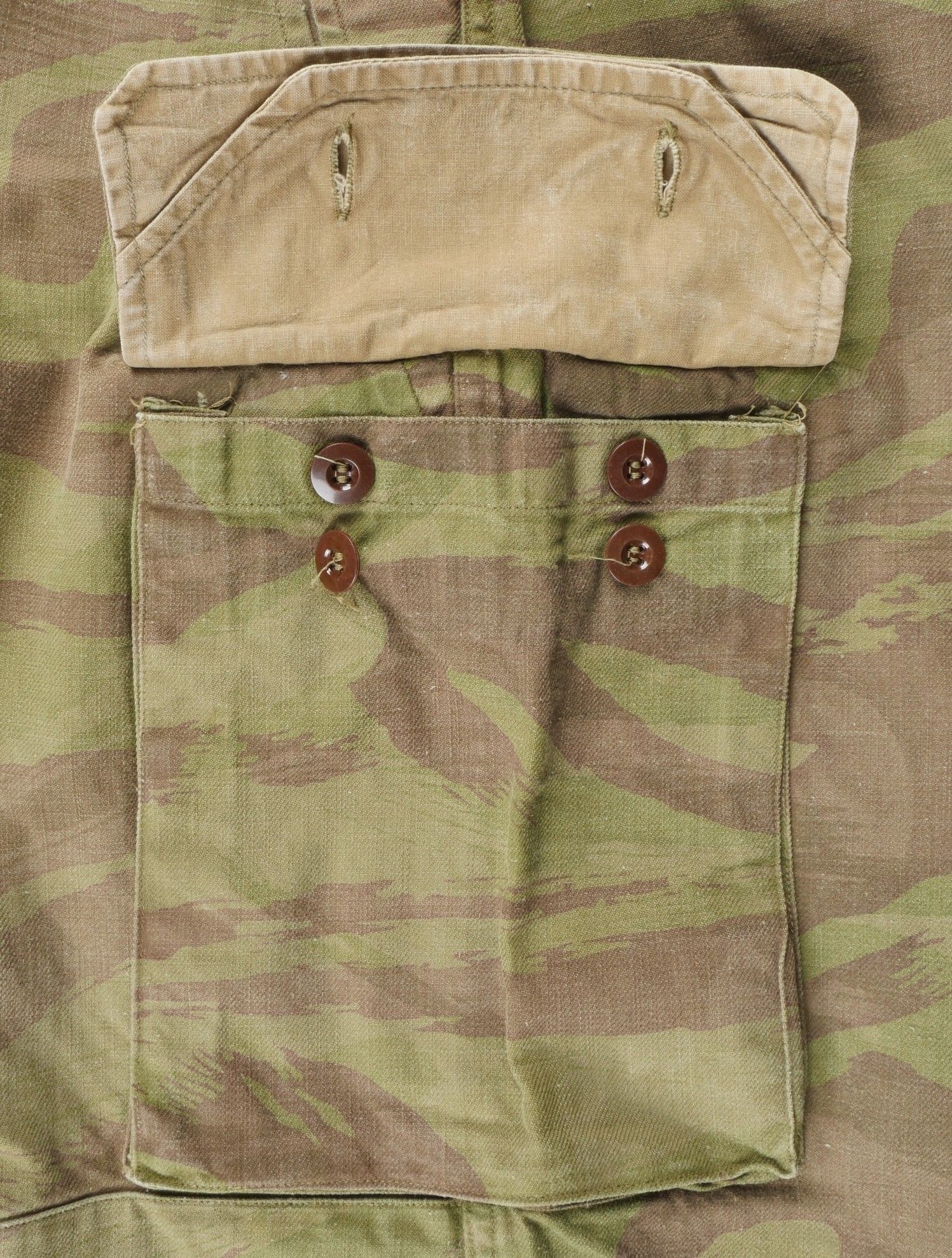 TTA 4753 trousers. Trousers fastened by a series of buttons, the last two of which are visible, fully camouflaged in type 53 canvas, unbleached cotton lining, manufacturer and size markings illegible. Original sewn leg straps. Trousers worn but colours still very bright. TTA 47 53 trousers. Button fly with the last two buttons exposed fully camouflaged in type 53 cloth with natural cotton lining maker and size marks illegible. Original ankle tightening tabs sewn on. Worn trousers but colours still bright.