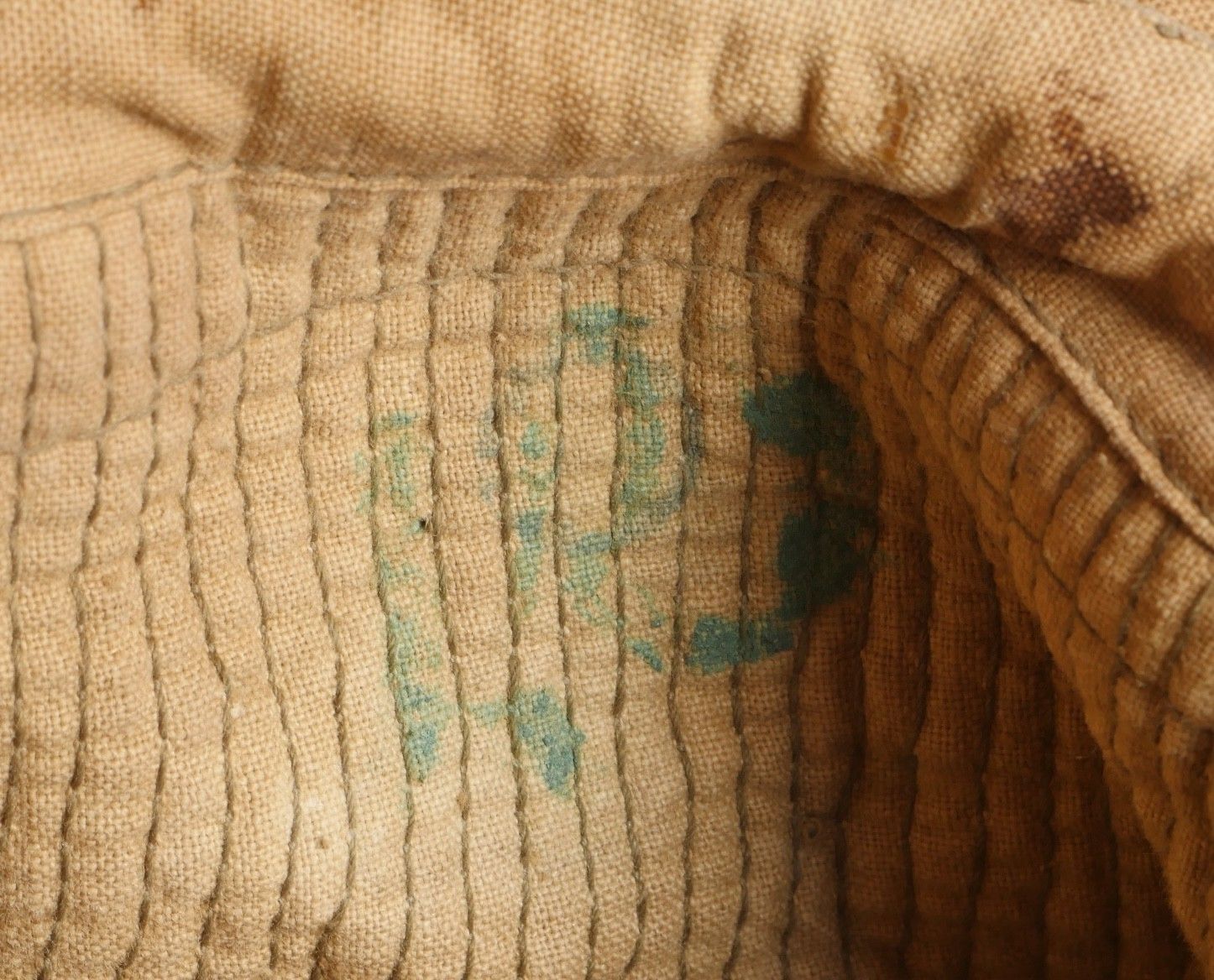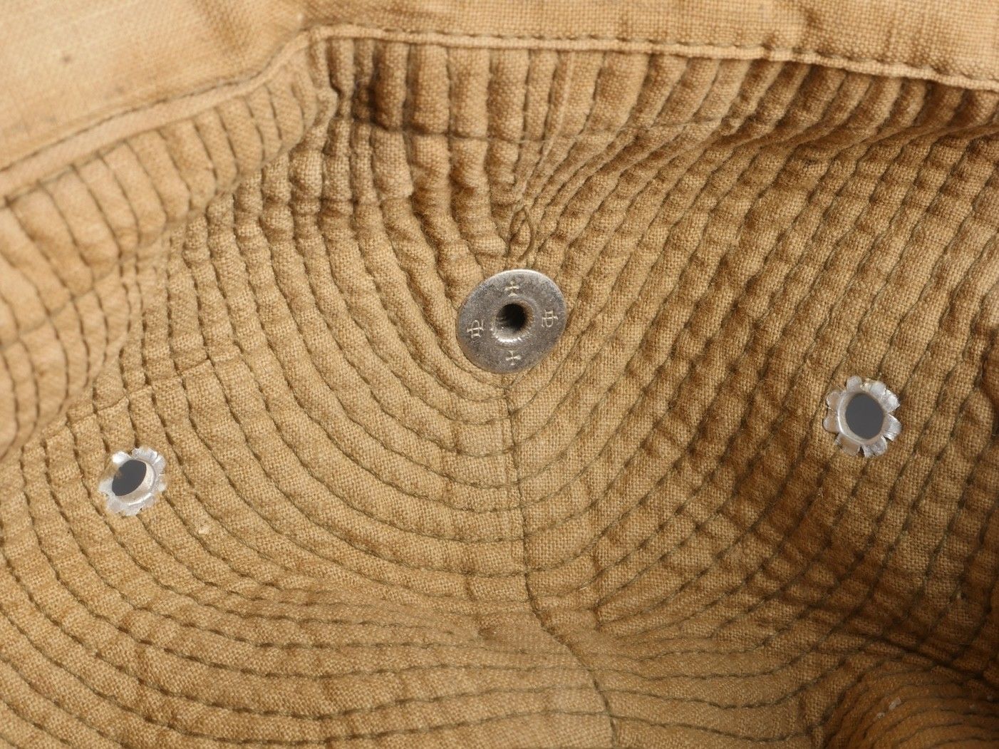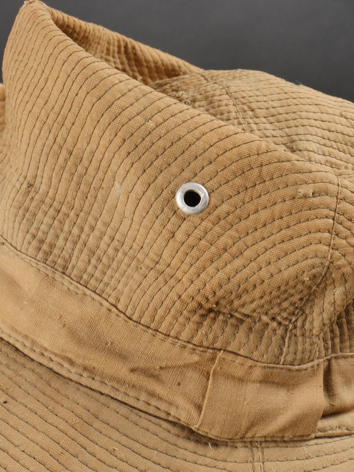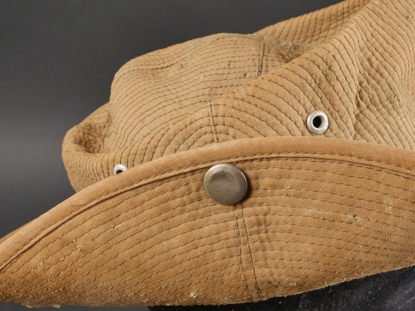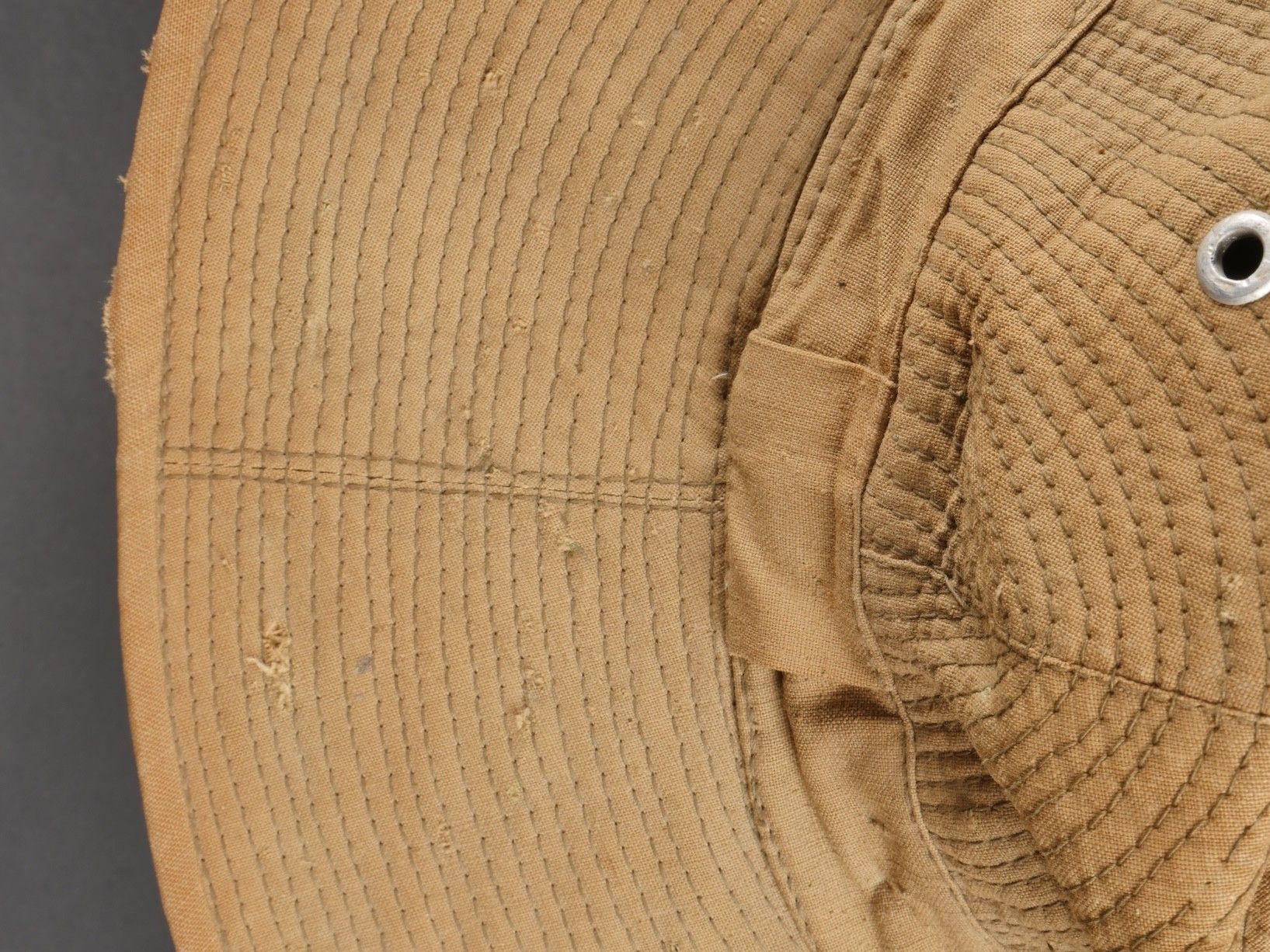 Regulation bush hat model 1949, made in the Far East. For once, this hat bears the markings of the Indochinese manufacturer COMPTOIR DO MINH, size 57. The large oxidised functional snap is characteristic of local Indochinese manufacture. Chinstrap present but damaged. TAP 50 equipment set. Includes a regulation TAP 50 belt in woven khaki cotton with two rounded metal keepers. A TAP 50 harness maker SIA hollow rivets. A first type TAP magazine pouch single snap with large bar. Regulation 1949 bush hat made in the Far East. This example bears an Indochinese maker mark COMPTOIR DO MINH size 57. The large snap fastener functional but oxidized is typical of local Indochinese manufacture. Chinstrap present but damaged.