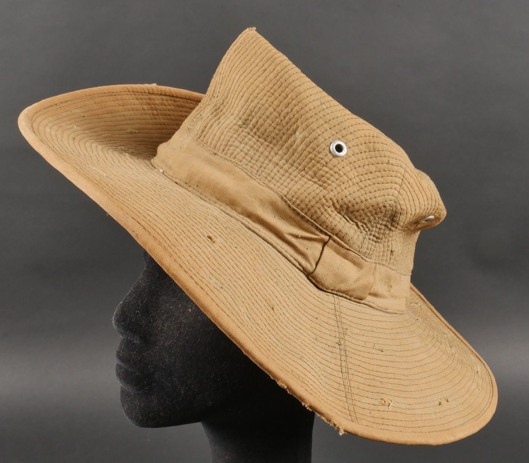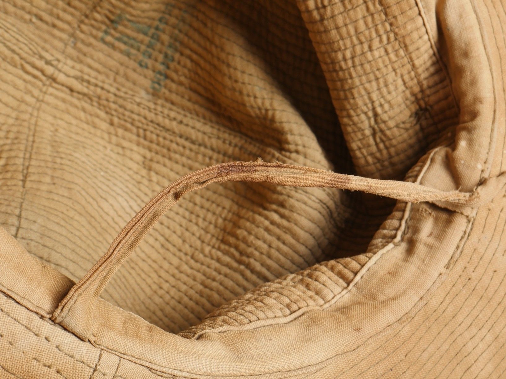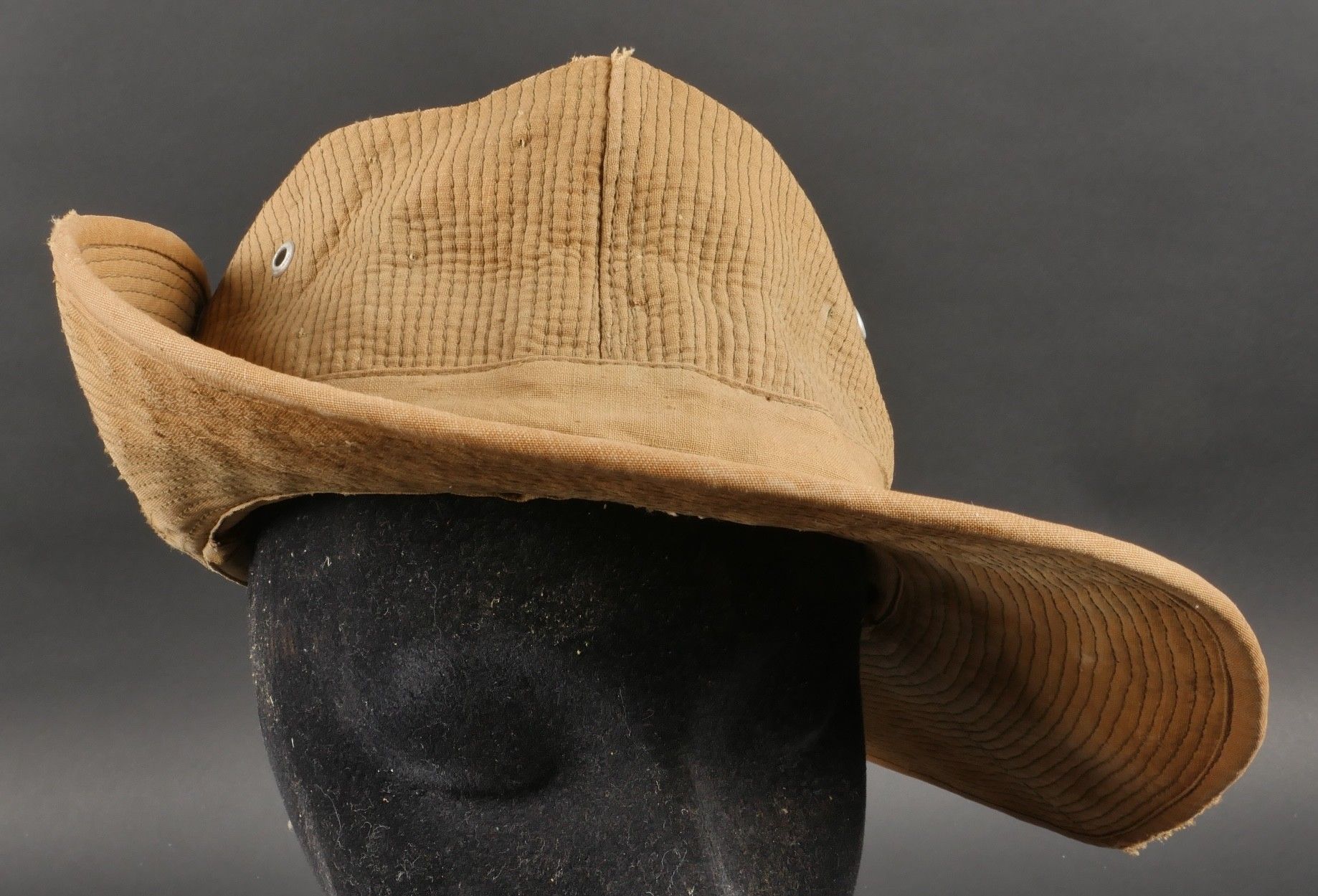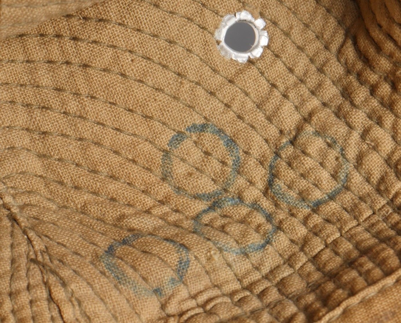 Regulation bush hat model 1949, made in the Far East. For once, this hat bears the markings of the Indochinese manufacturer COMPTOIR DO MINH, size 57. The large oxidised functional snap is characteristic of local Indochinese manufacture. Chinstrap present but damaged. TAP 50 equipment set. Includes a regulation TAP 50 belt in woven khaki cotton with two rounded metal keepers. A TAP 50 harness maker SIA hollow rivets. A first type TAP magazine pouch single snap with large bar. Regulation 1949 bush hat made in the Far East. This example bears an Indochinese maker mark COMPTOIR DO MINH size 57. The large snap fastener functional but oxidized is typical of local Indochinese manufacture. Chinstrap present but damaged.