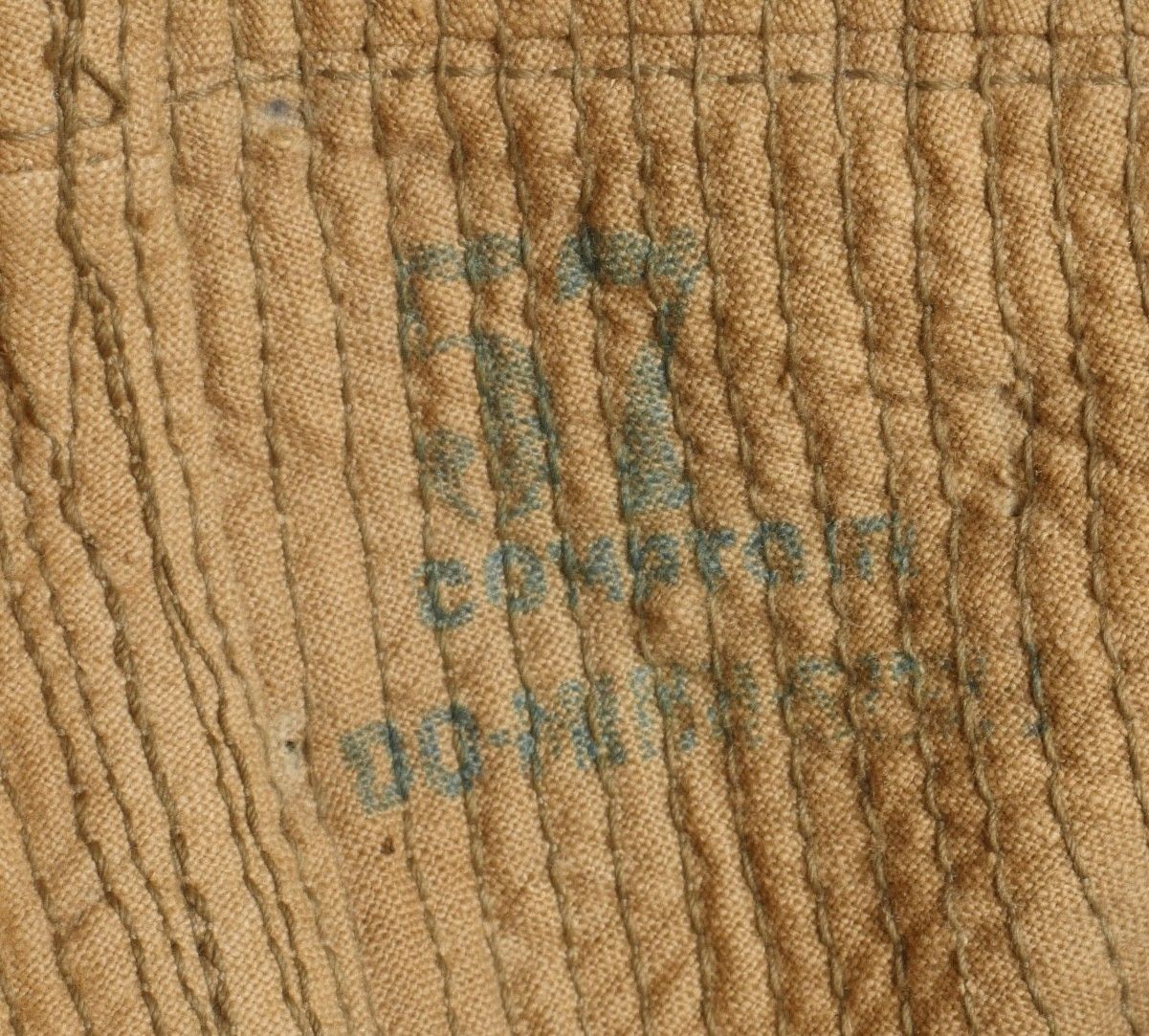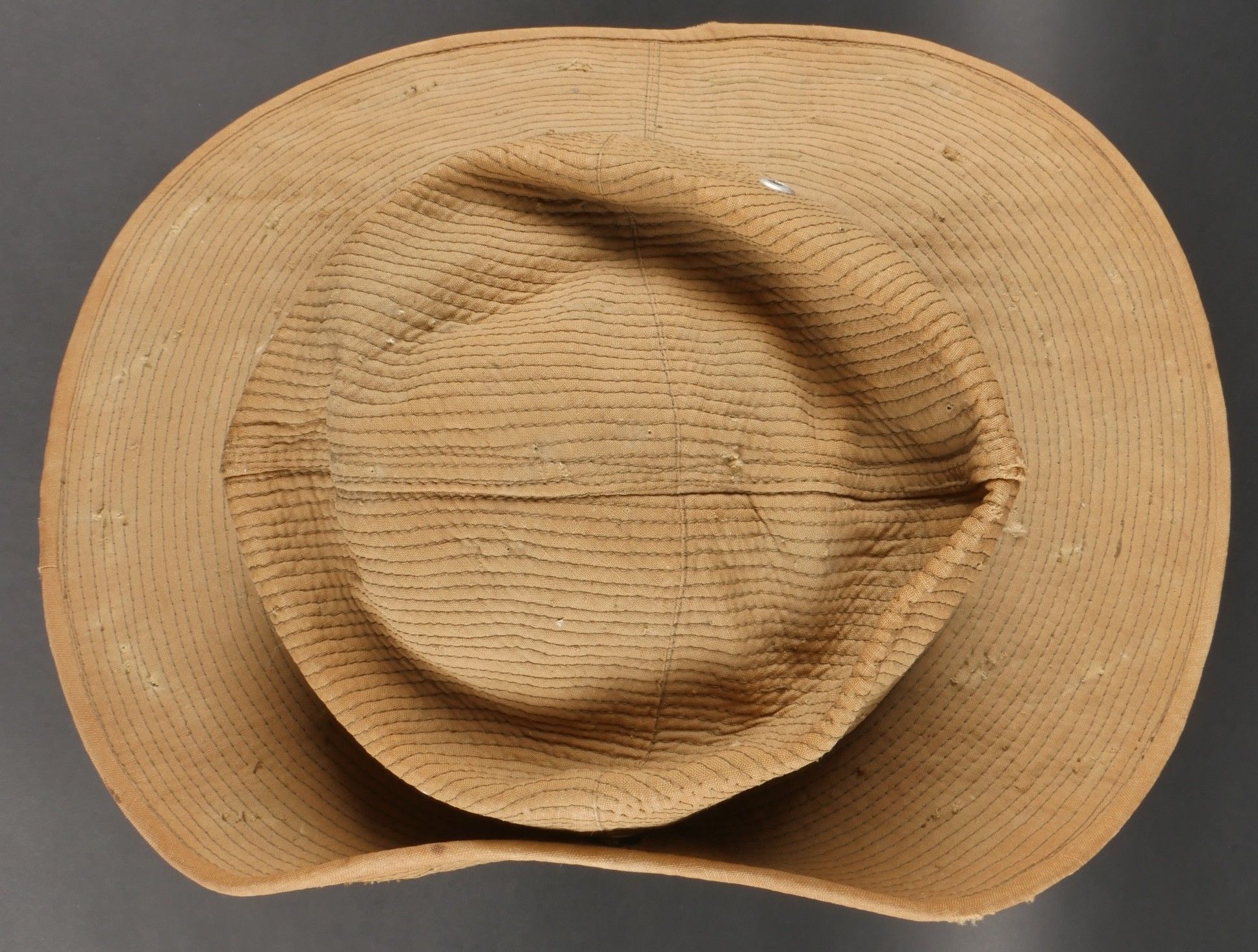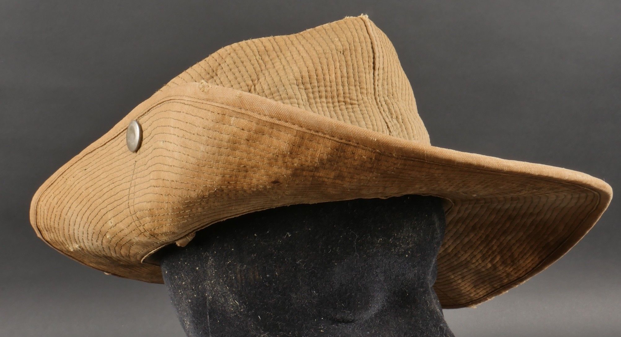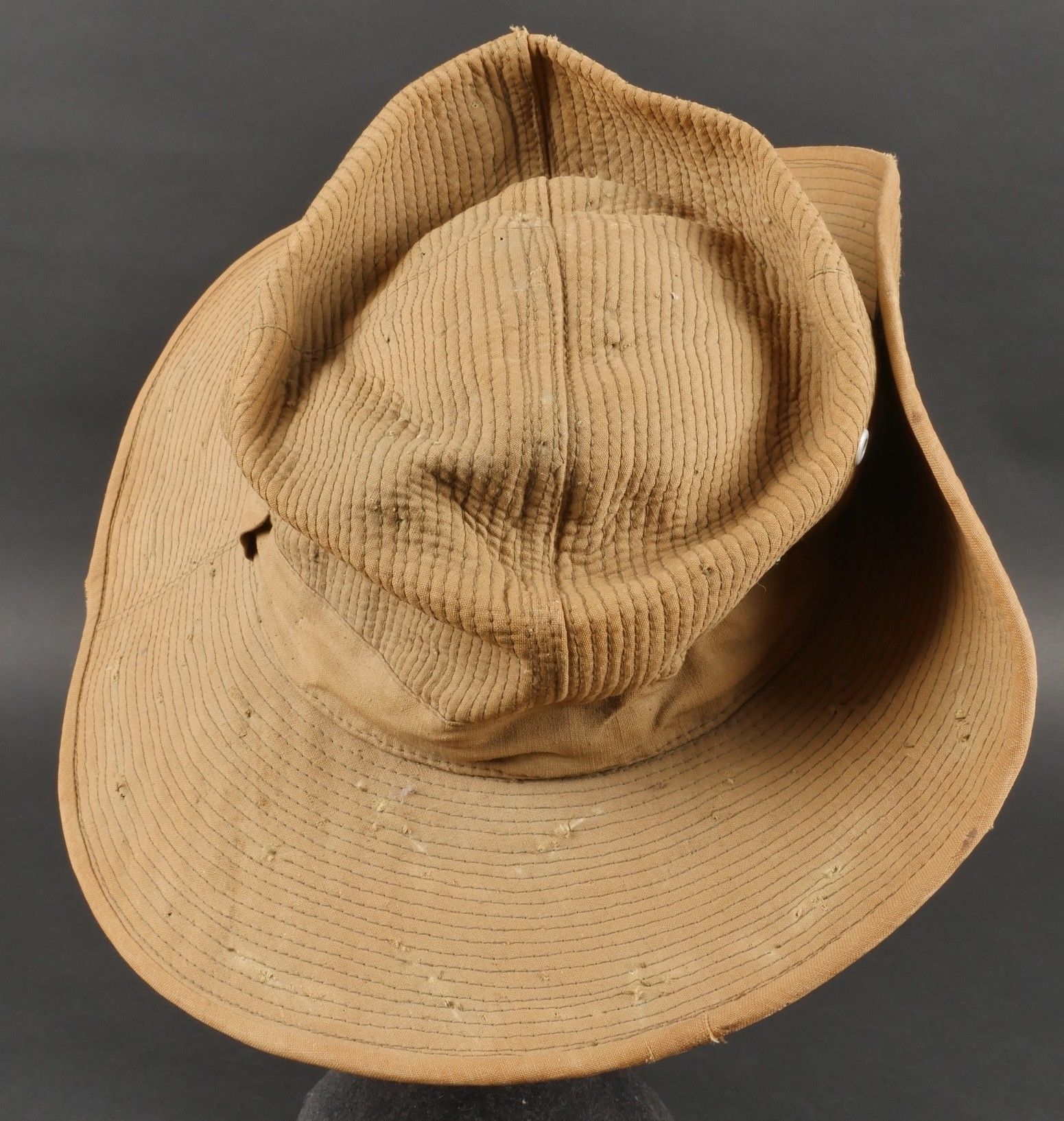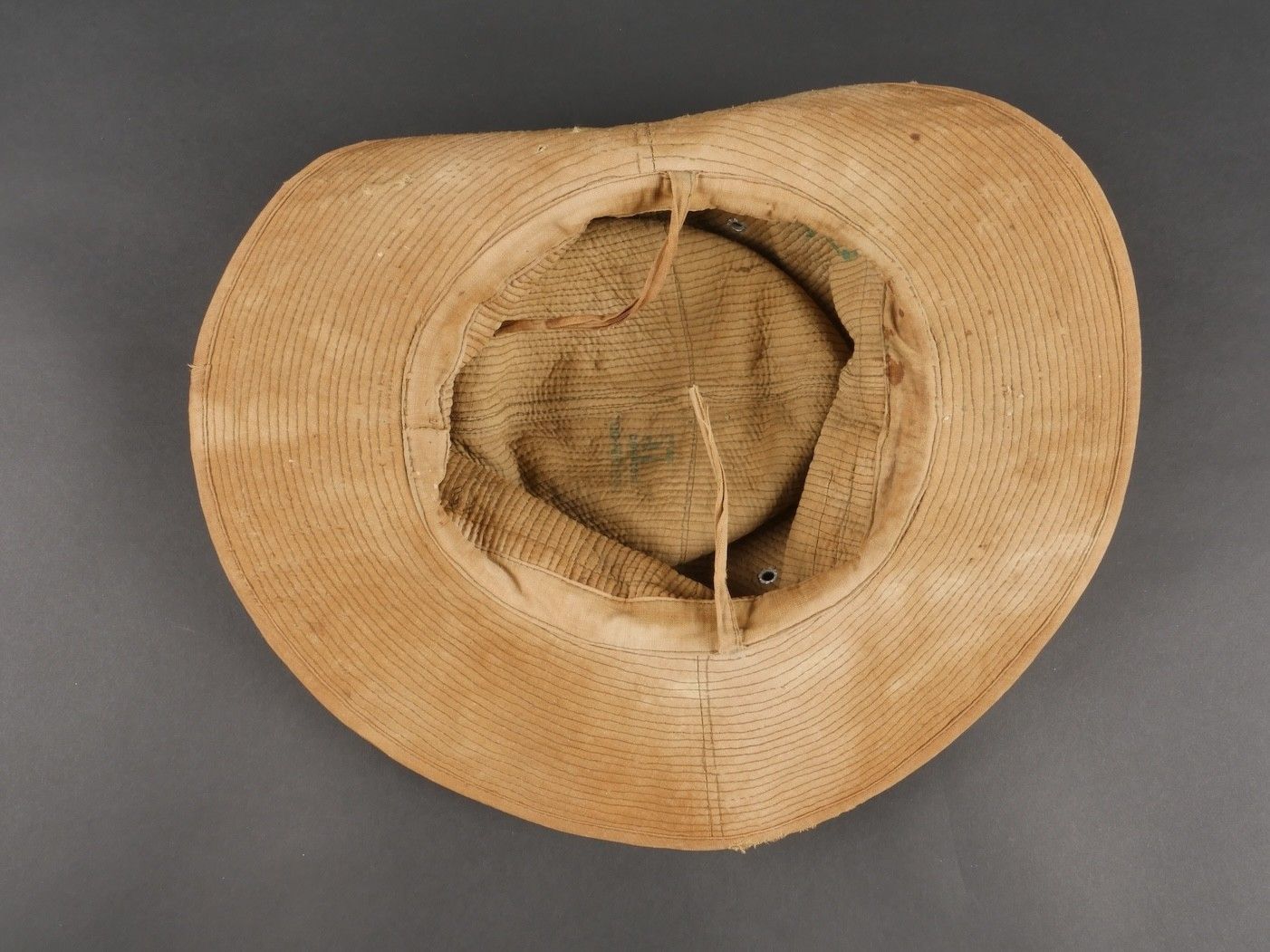 Regulation bush hat model 1949, made in the Far East. For once, this hat bears the markings of the Indochinese manufacturer COMPTOIR DO MINH, size 57. The large oxidised functional snap is characteristic of local Indochinese manufacture. Chinstrap present but damaged. TAP 50 equipment set. Includes a regulation TAP 50 belt in woven khaki cotton with two rounded metal keepers. A TAP 50 harness maker SIA hollow rivets. A first type TAP magazine pouch single snap with large bar. Regulation 1949 bush hat made in the Far East. This example bears an Indochinese maker mark COMPTOIR DO MINH size 57. The large snap fastener functional but oxidized is typical of local Indochinese manufacture. Chinstrap present but damaged.