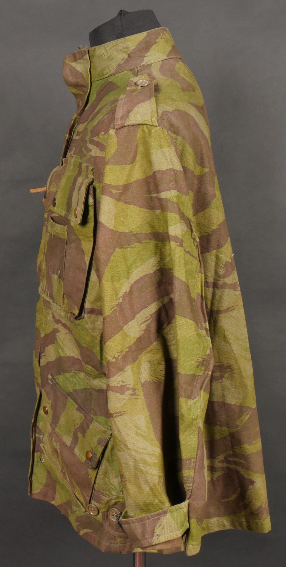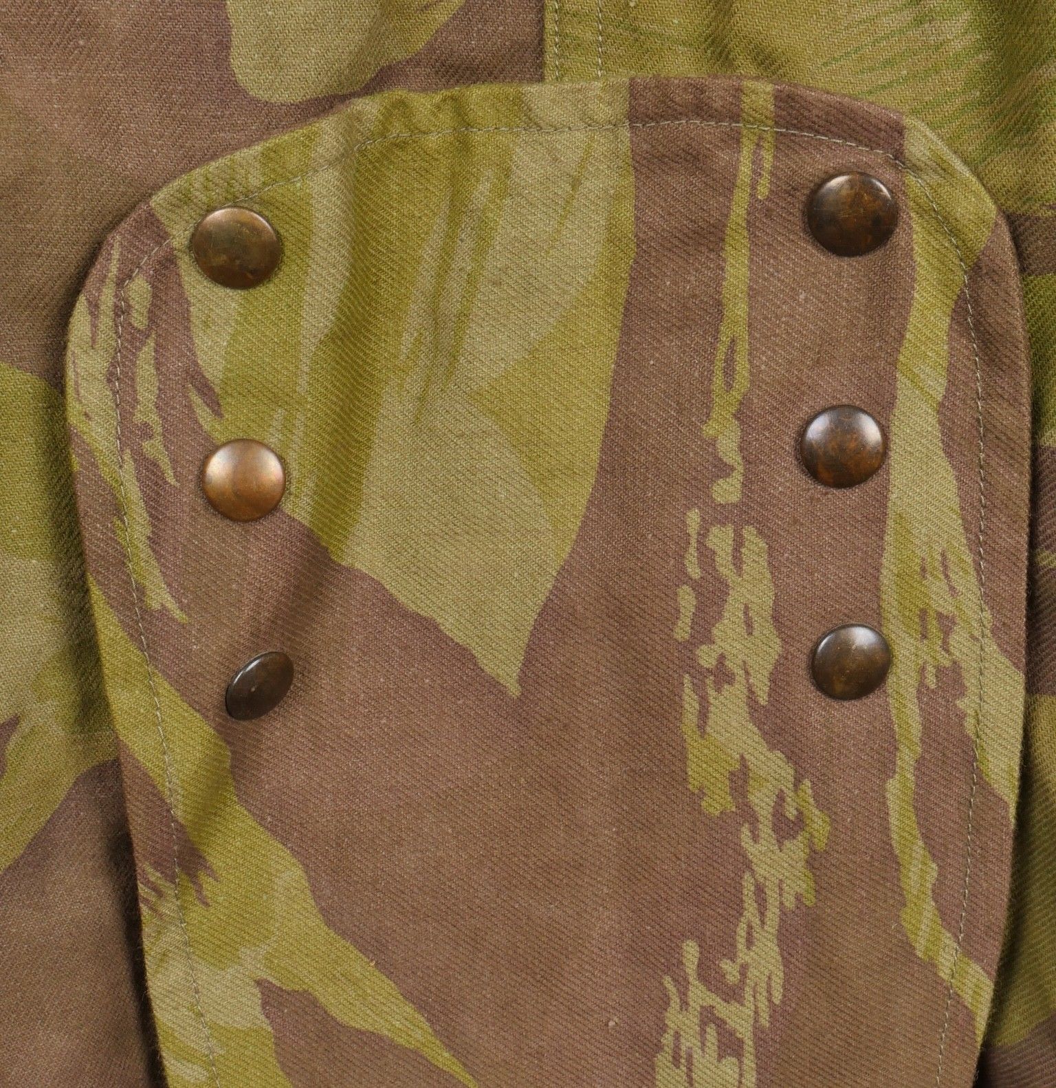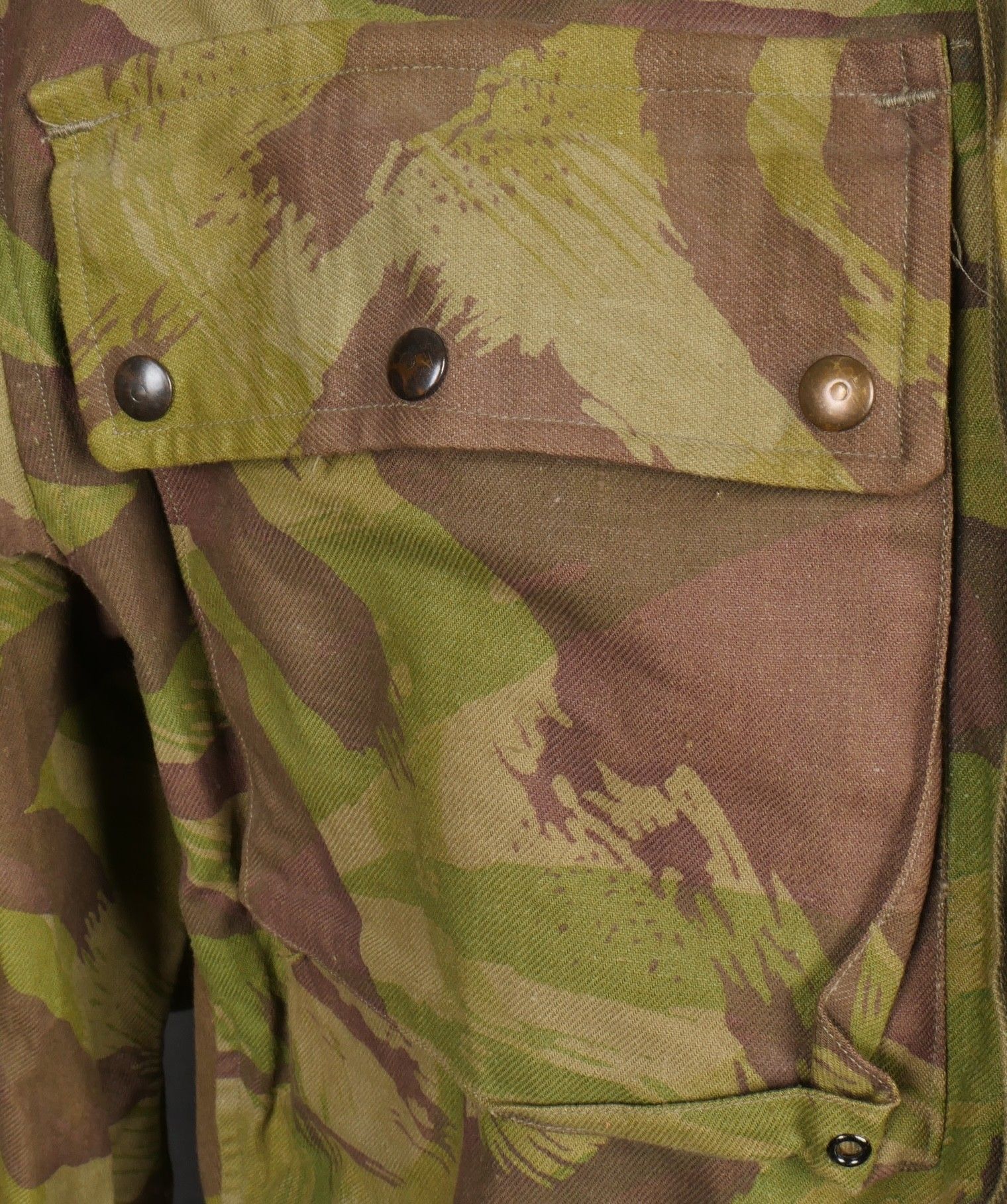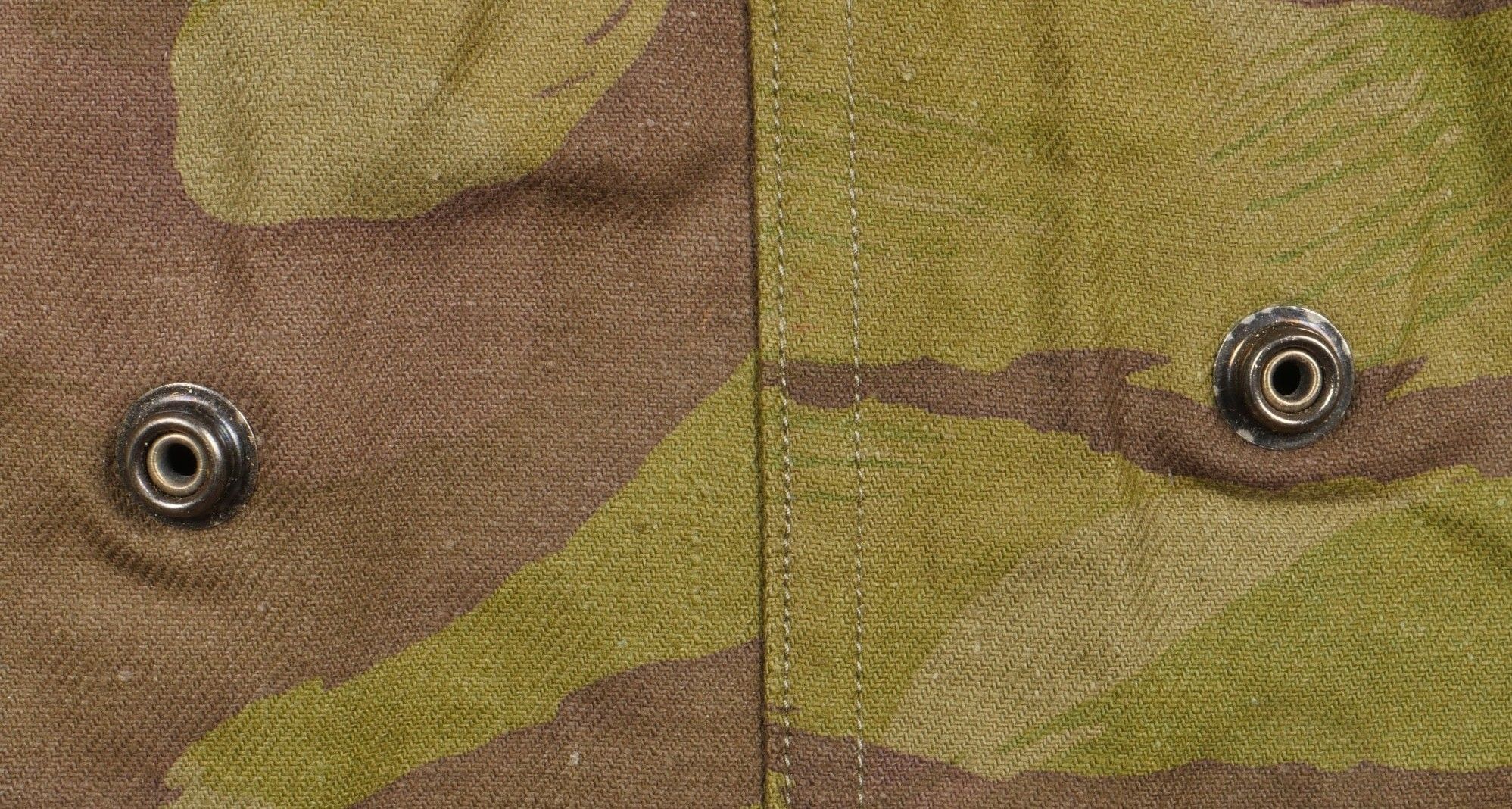 TAP 4752 camouflage jacket. Jacket made entirely from 4752 camouflage fabric, functional press studs, functional zips, underarm eyelets, original stitched beavertail. Original bronzed buckles at the bottom of each sleeve. Manufacturer's stamp Davenière Paris Calais, as well as size stamp E 1M. Jacket in mint condition, never worn, superb colours. Camouflage TAP 47 52 jacket. Made entirely in 47 52 camouflage cloth. Snaps working. Zippers working. Underarm ventilation eyelets. Beaver tail sewn on at the factory. Tightening buckles at the ends of both sleeves with original bluing. Maker stamp Davenière Paris Calais and size stamp E 1M. Mint unissued jacket with superb colours.
