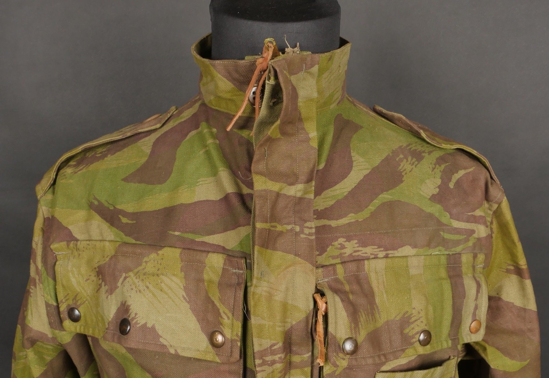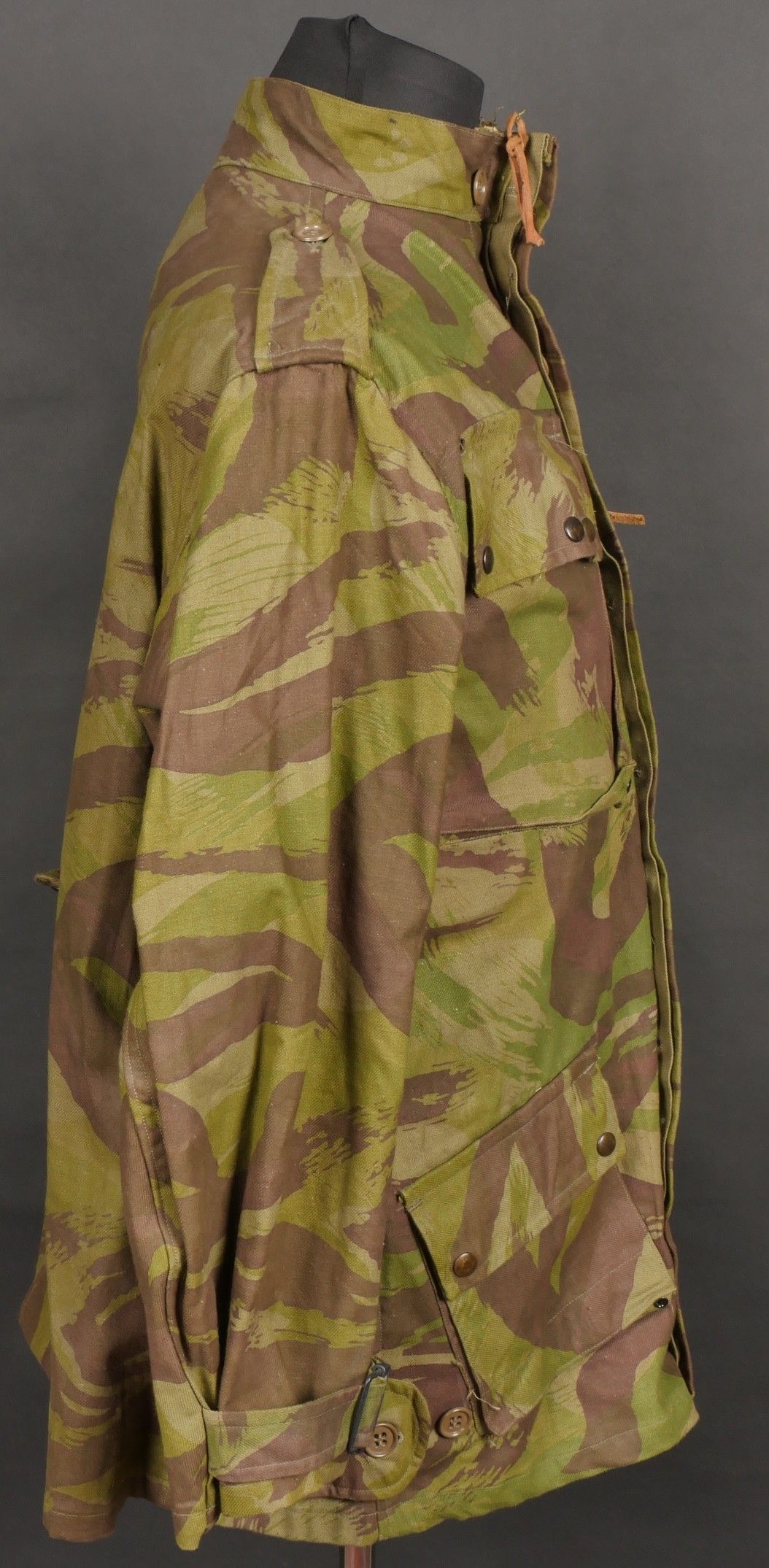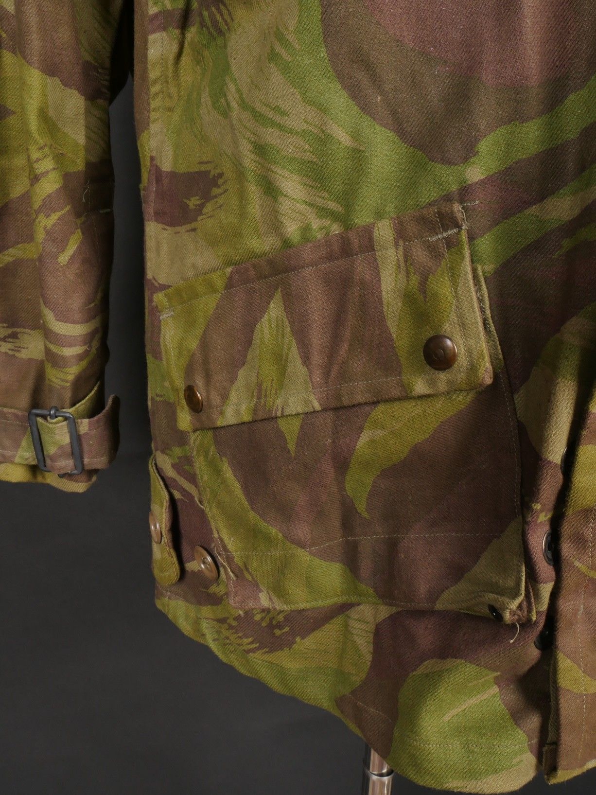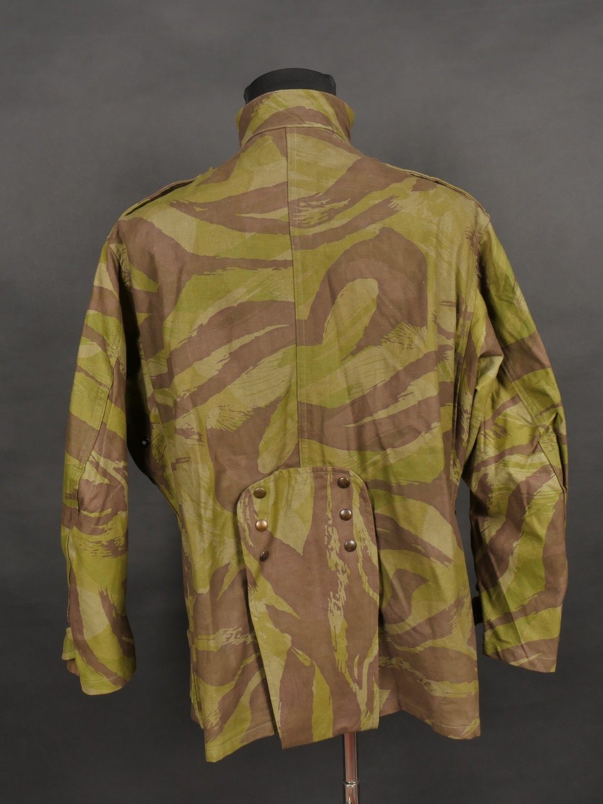 TAP 4752 camouflage jacket. Jacket made entirely from 4752 camouflage fabric, functional press studs, functional zips, underarm eyelets, original stitched beavertail. Original bronzed buckles at the bottom of each sleeve. Manufacturer's stamp Davenière Paris Calais, as well as size stamp E 1M. Jacket in mint condition, never worn, superb colours. Camouflage TAP 47 52 jacket. Made entirely in 47 52 camouflage cloth. Snaps working. Zippers working. Underarm ventilation eyelets. Beaver tail sewn on at the factory. Tightening buckles at the ends of both sleeves with original bluing. Maker stamp Davenière Paris Calais and size stamp E 1M. Mint unissued jacket with superb colours.